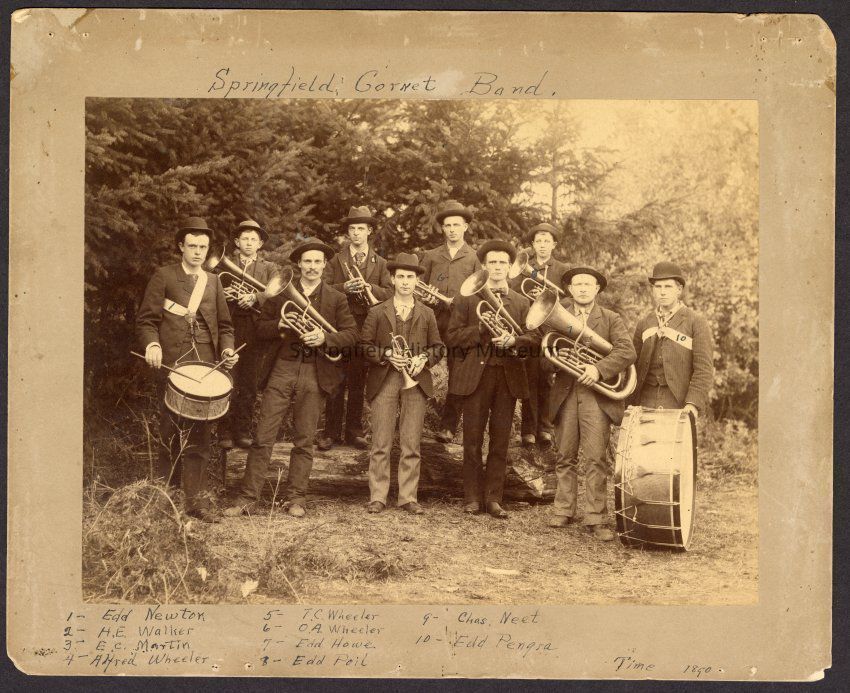 Springfield's Cornet Band; March 1890. Band members. Identification of band members was provided by Mrs. Victor Fogle. (1) Edd Newton,(2) H.E. Walker, (3) E.C. Martin, (4) Alfred Wheeler, (5) T.C. Wheeler, (6) O.A. Wheeler, (7) Edd Howe, (8) Edd Poil, (9) Charles Neet, (10) Edd Pengra.