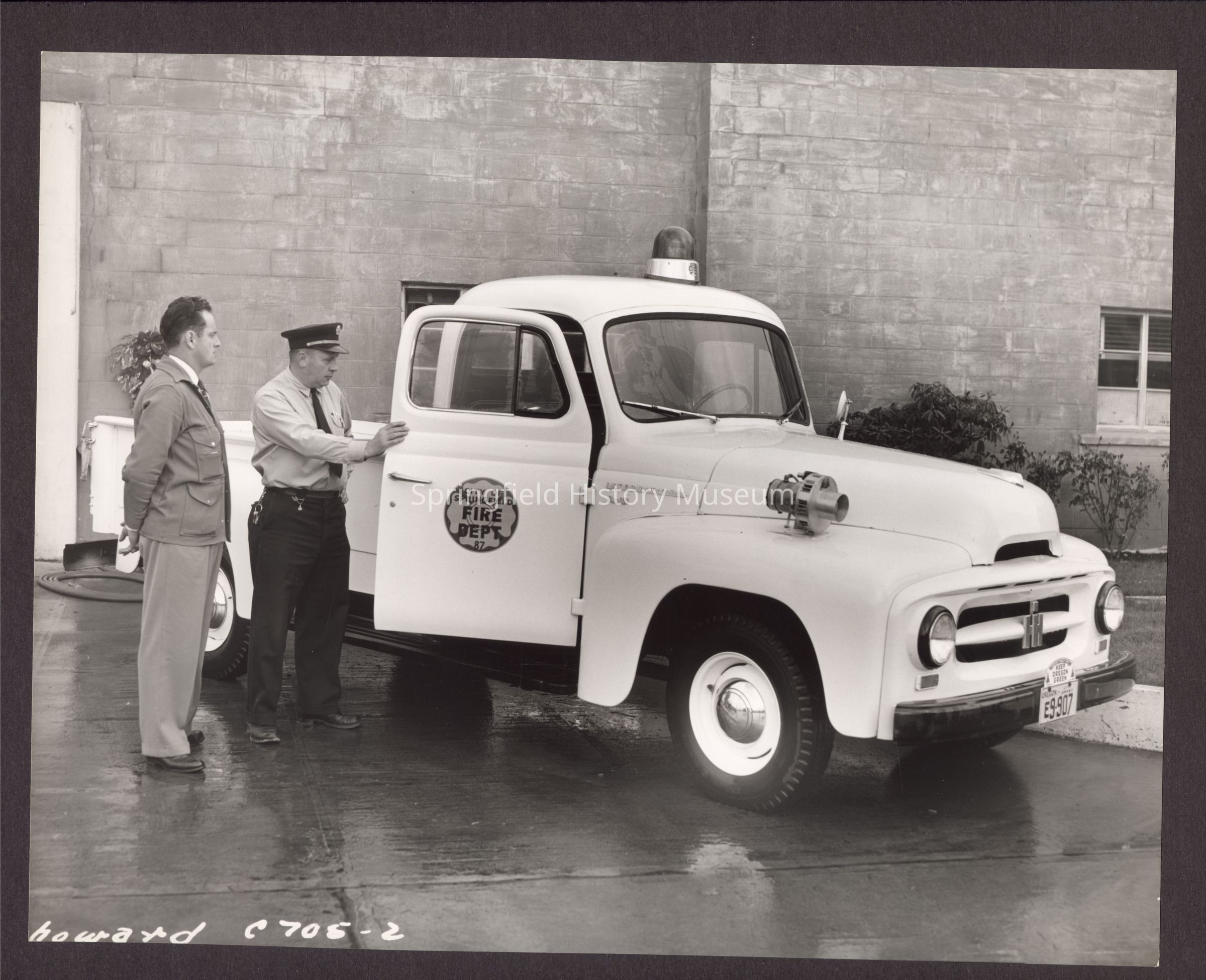 Black and white photograph of two men standing beside a white fire truck. One man wears a hat. The truck says "City of Springfield Fire Dept 87" on the side. Front left is marked with "howard C705-2." Undated.Collection