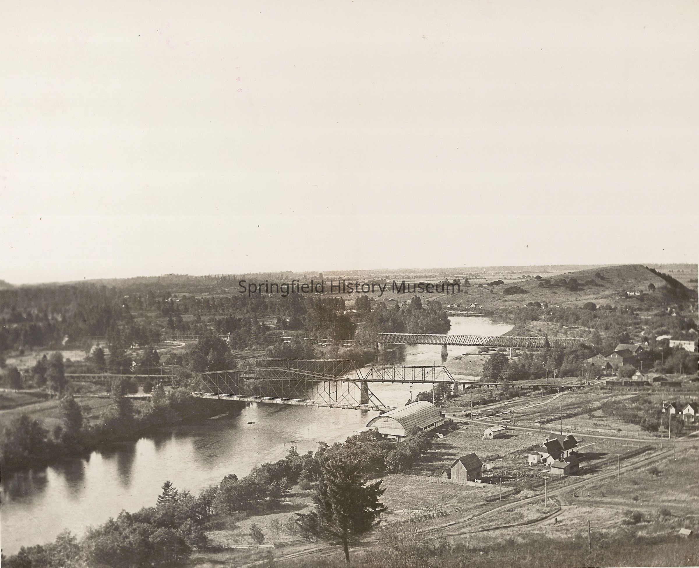 The Springfield - Glenwood bridges across the Willamette River. Skating rink in the center of photo. Mounted on white board, no date.Collection