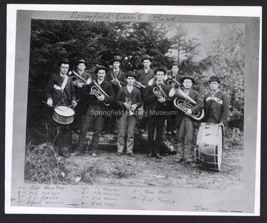 Springfield's Cornet Band; March 1890. Band members. Identification of band members was provided by Mrs. Victor Fogle. (1) Ed Newton,(2) H.E. Walker, (3) E.C. Martin, (4) Alfred Wheeler,(5) T.C. Wheeler, (6) O.A. Wheeler, (7) Ed Howe, (8) Ed Poil, (9) Charles Neet, (10) Ed Pengra.