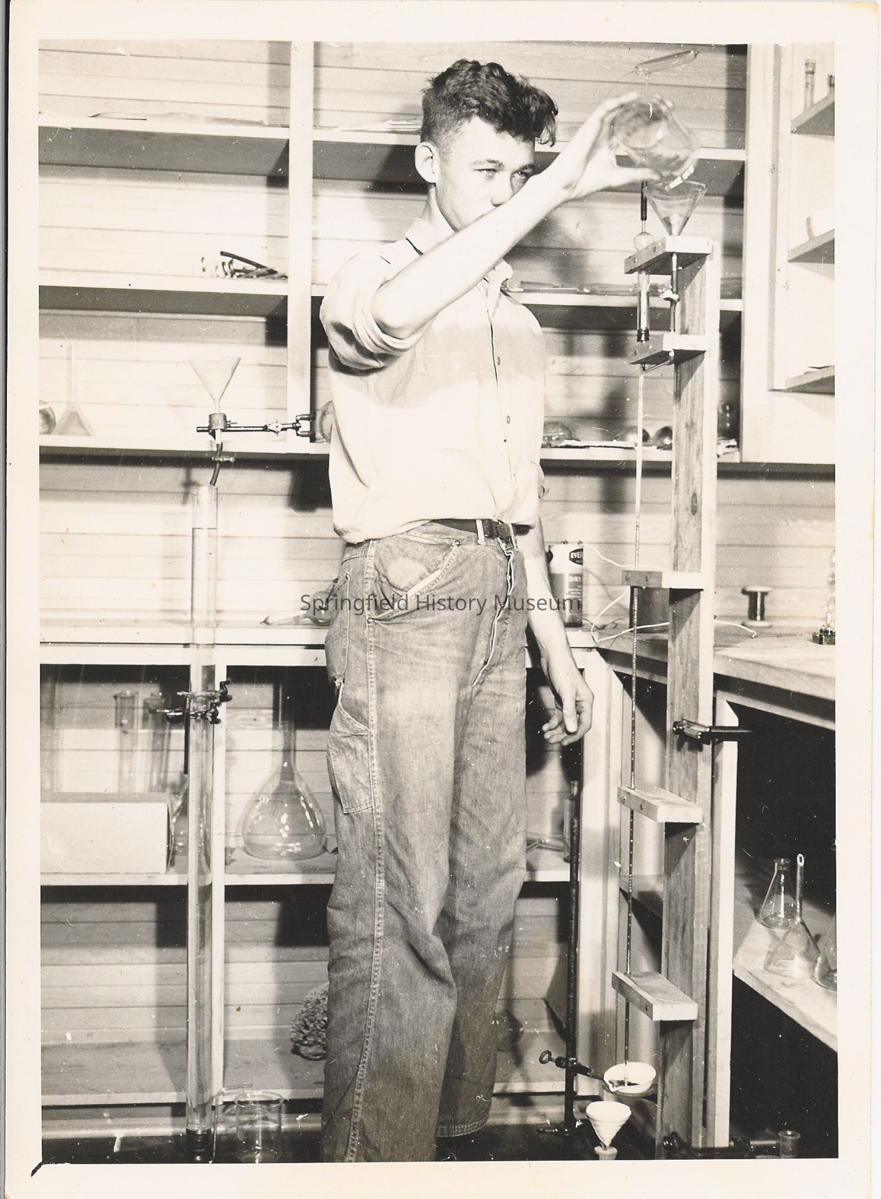 Student of Springfield High School (Norman Peacock) in science lab during an experiment. Shelves and beakers in background of photo.1940s