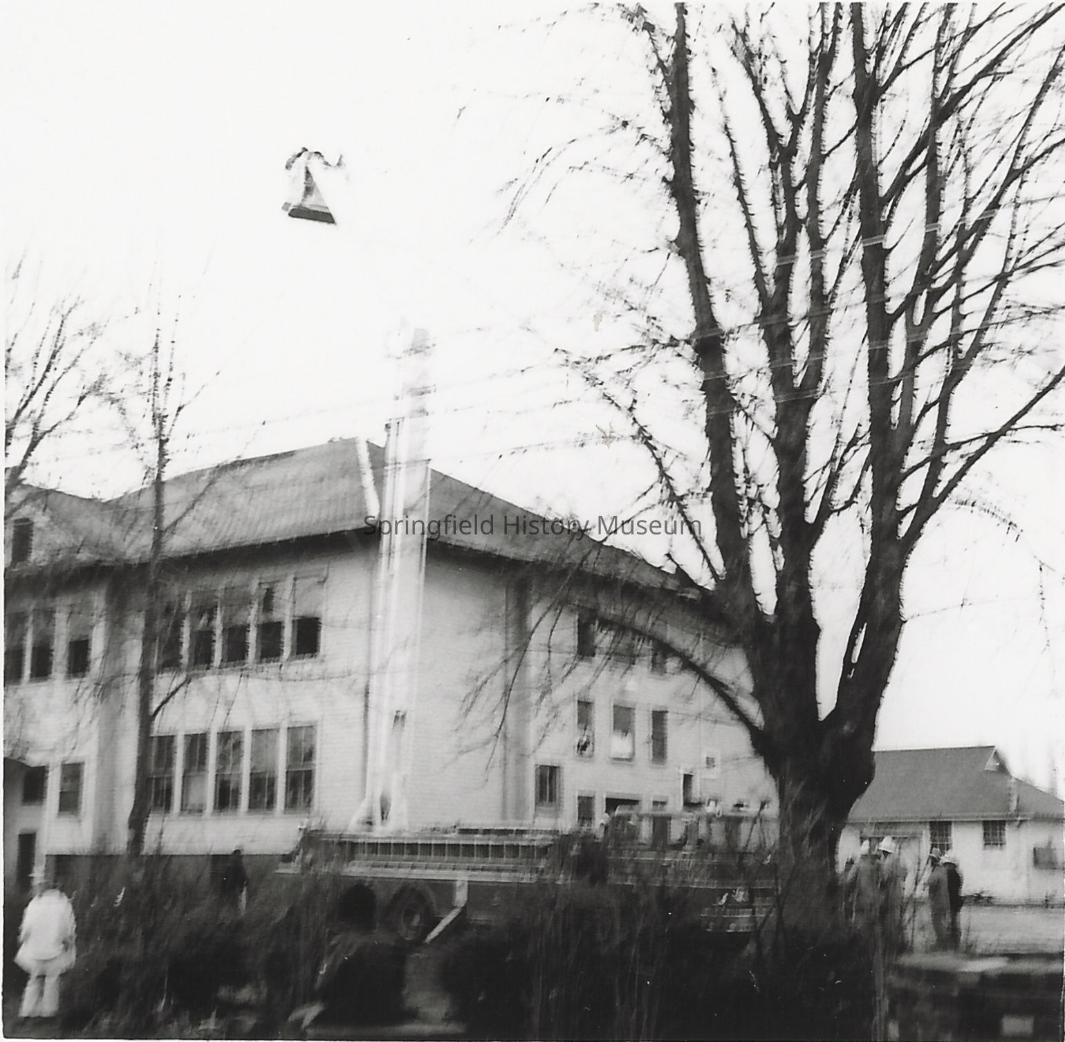 Lincoln School before razed by burning - with crane out front with people watching