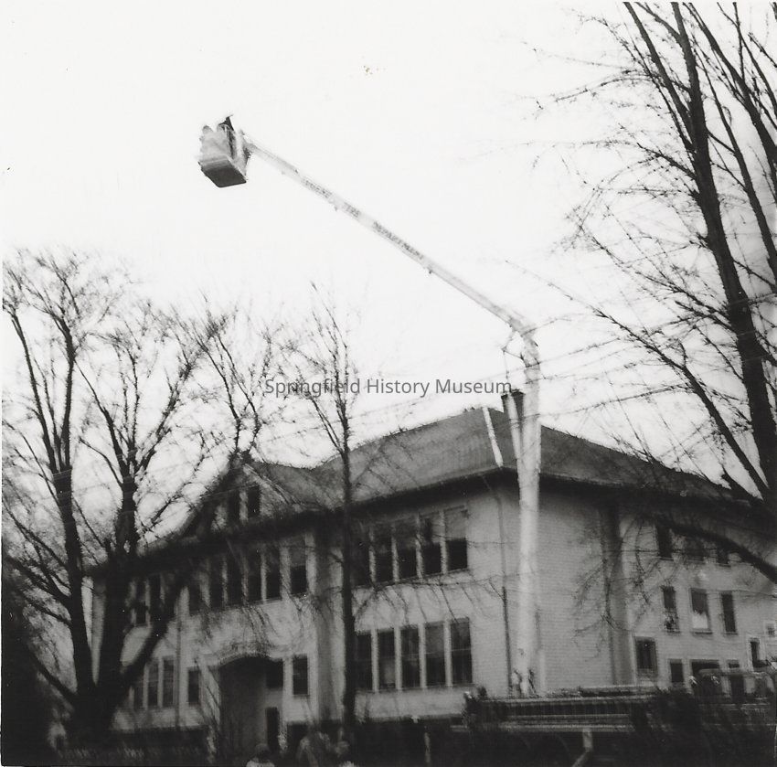 Lincoln School before razed by burning - with crane out front