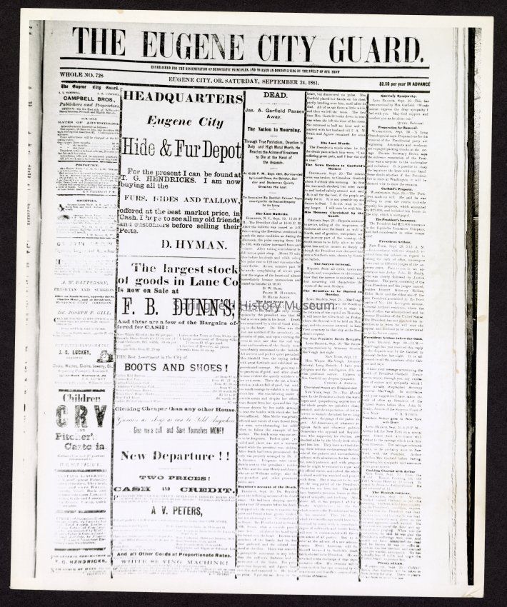 B&W Photo of front page of The Eugene City Guard, Whole No. 728 Eugene City, Oregon Saturday September 24, 1881.Collection
