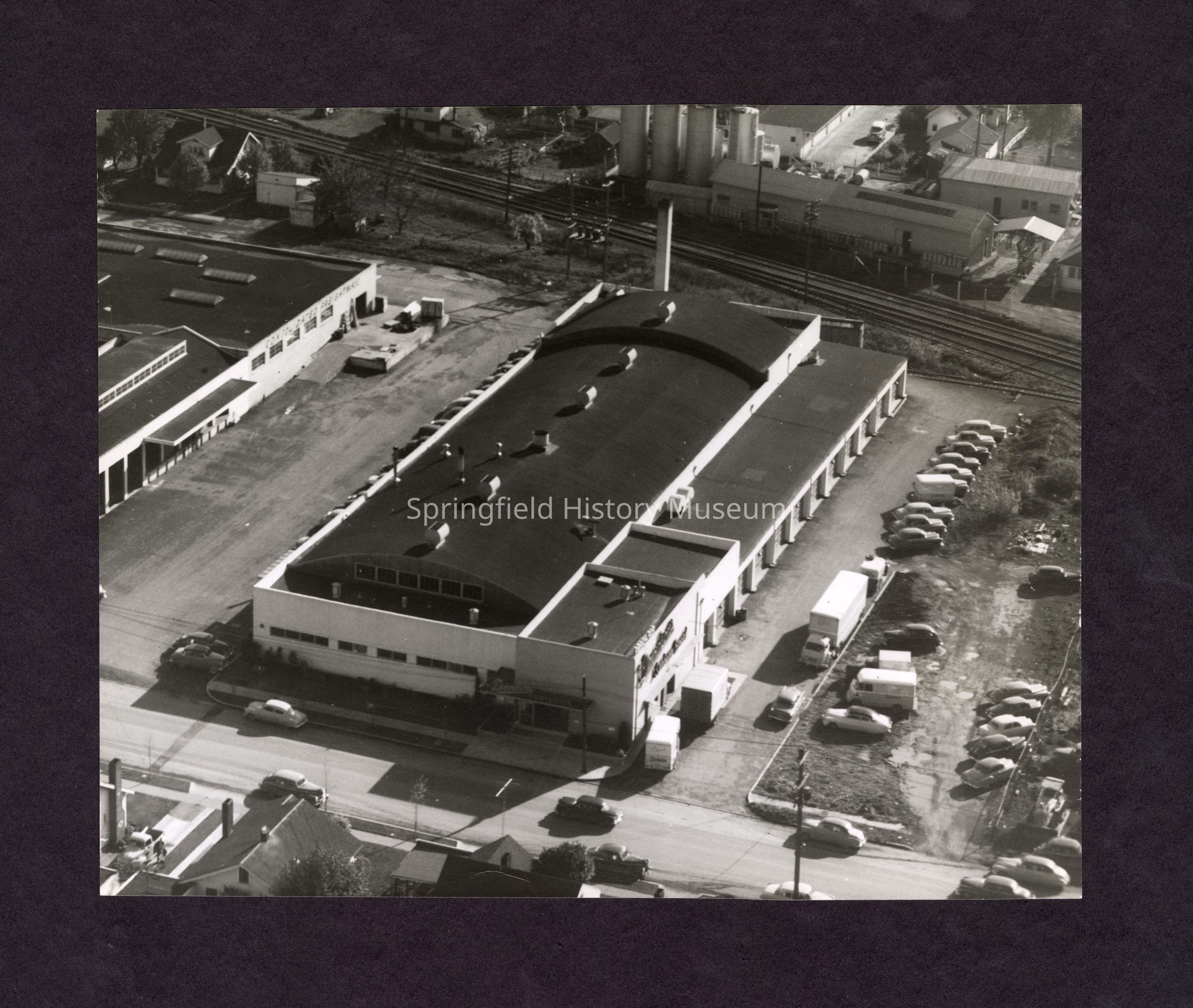 Black and white aerial photograph of a building and parking lot. There are houses and cars driving down the street in the foreground and railroad tracks and industrial buildings in background. The building on the left says "Consolodated Freight." There are a few trucks pulled up in front of the main building. Undated.Collection
