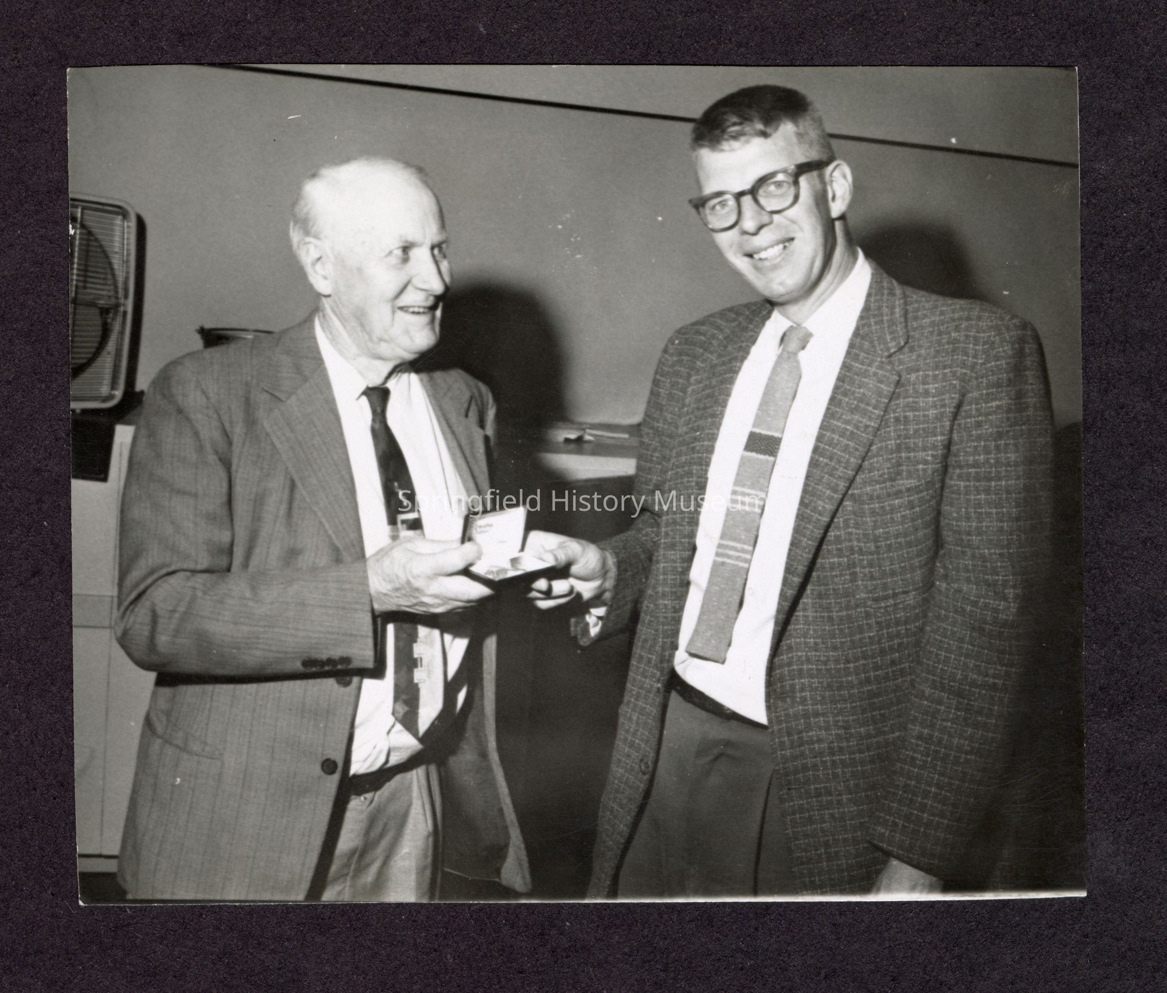 Phtotgraph, Man presenting small box to another man, date and location unknown.Entry/Object ID