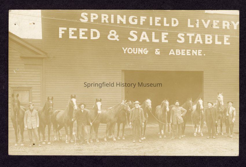 B&W Postcard of Springfield Livery Feed & Sale Stable Young & Abeene. With 6 men and 9 horses standing out front.Collection