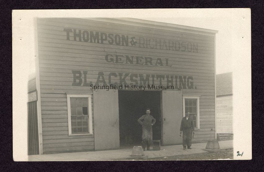 B&W Postcard of 2 men standing outside Thompson & Richardson General Blacksmithing.Collection