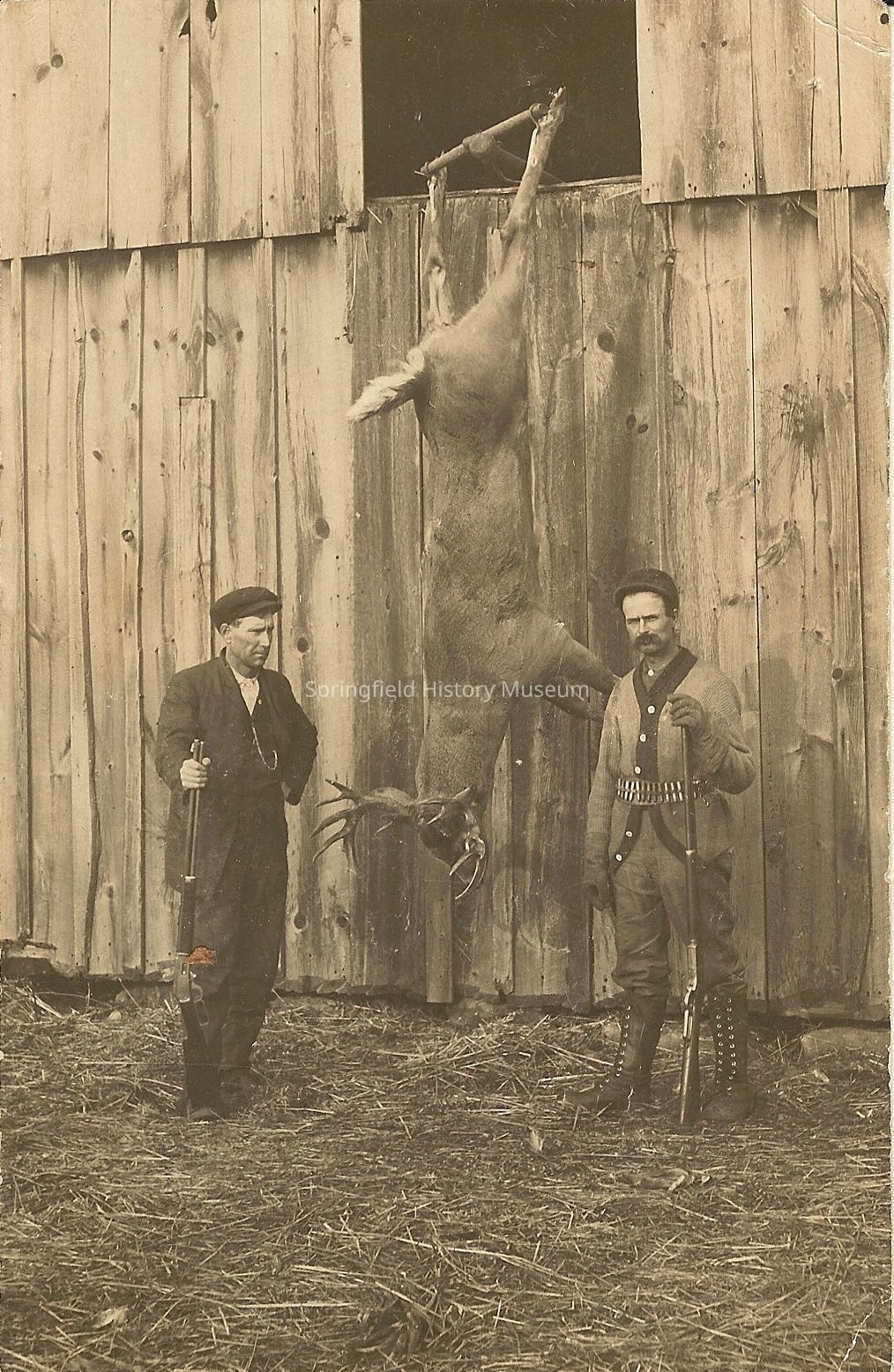 Sepia postcard of deer hung on barn between two hunters holding rifles. The man on the right is wearing a shell belt. Written on back, "#3 - T18N..." Undated.
