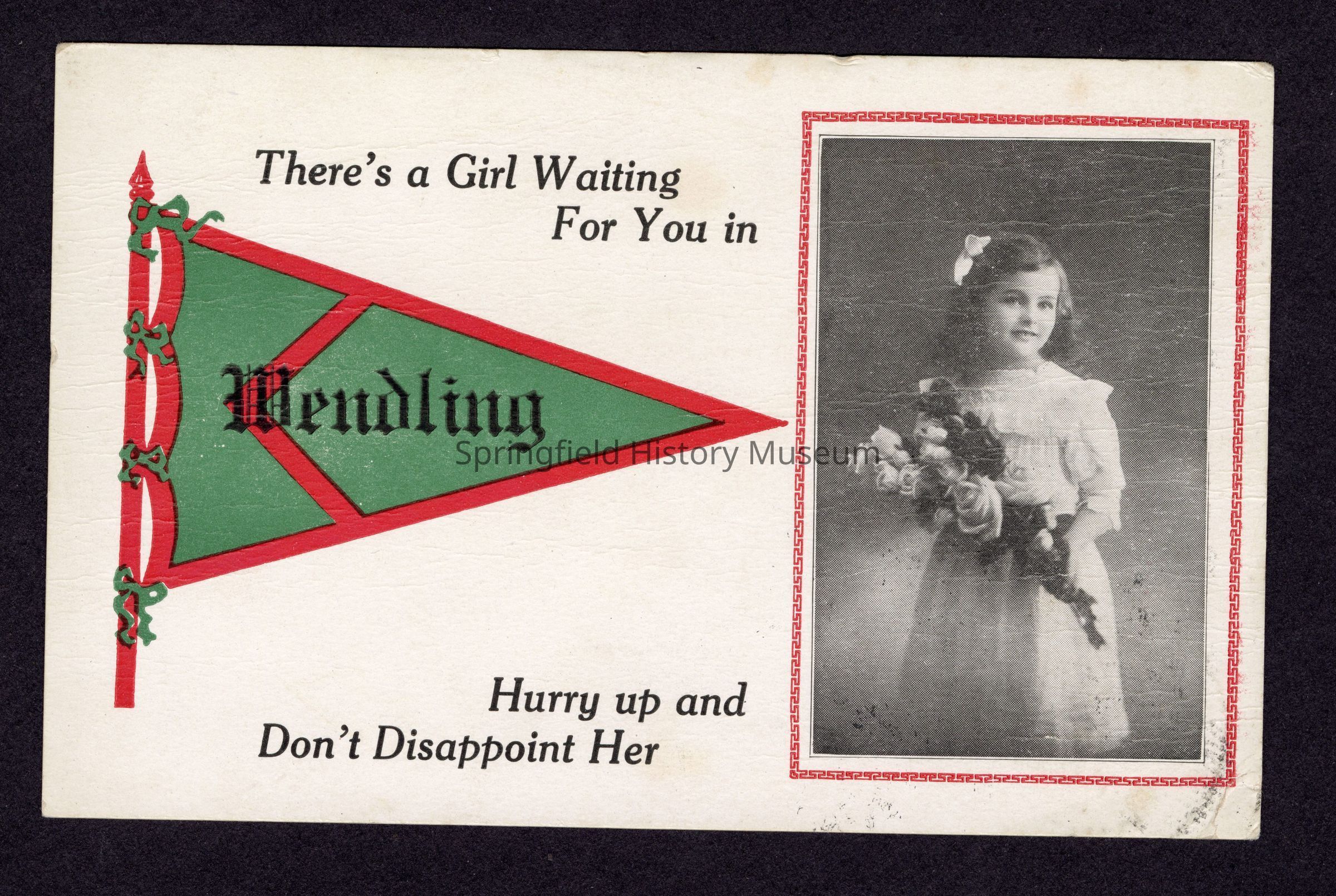 Post Card: with photo of girl beside text, "There's a Girl Waiting for You in Wendling Hurry up and Don't Disappoint Her."
