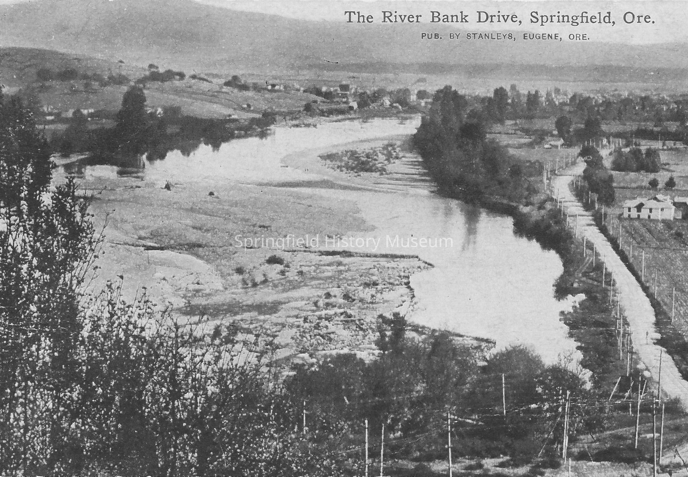 Scenic post card titled, "The River Bank Drive, Springfield, Ore." Published by Stanleys, Eugene, Ore. Letter written on back is postmarked Aug. 24, 1911.