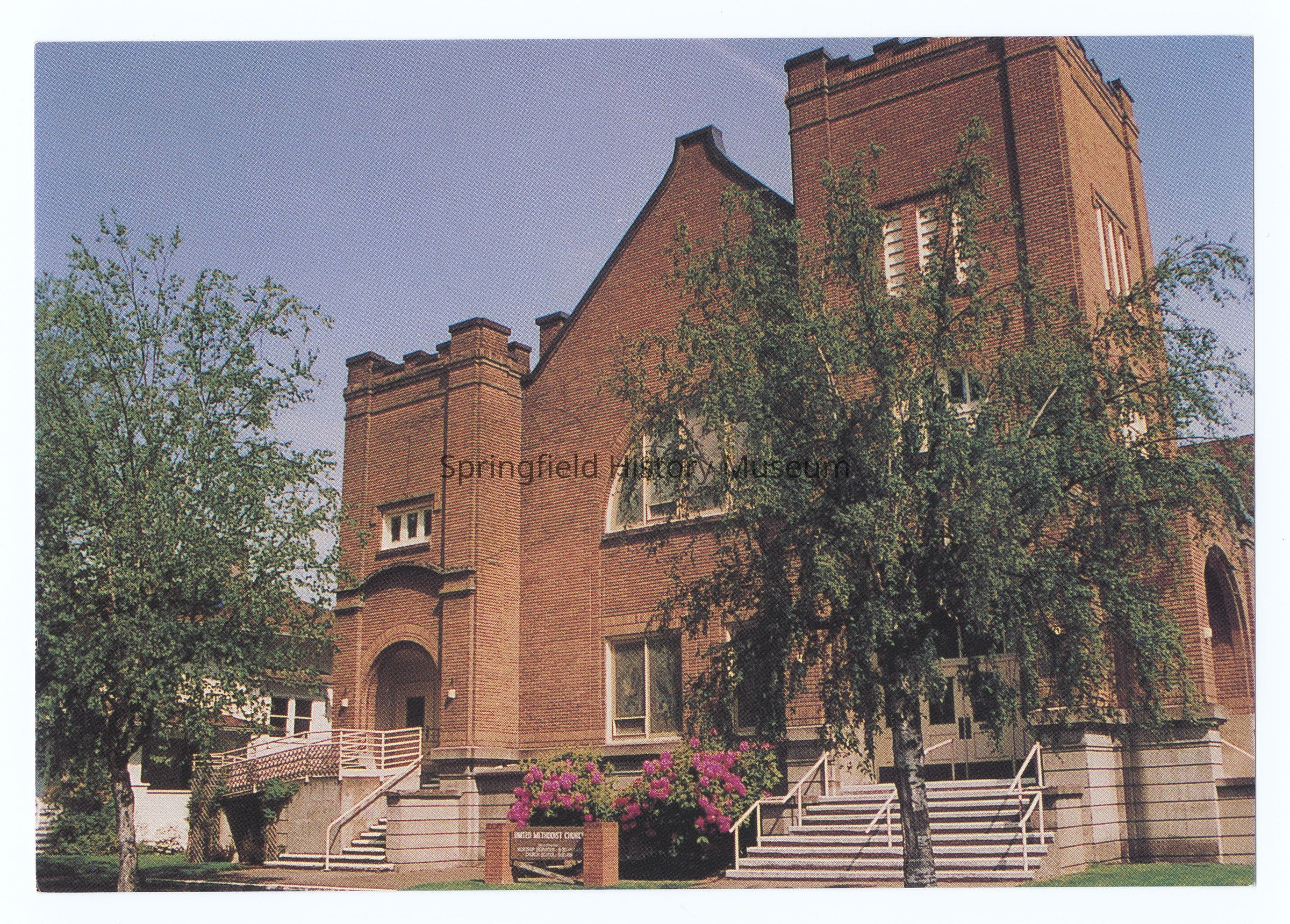 Postcard of the Ebbert Memorial Methodist Church, 532 C Street, Springfield, undated, circa 1990. Number 7 of a postcard series by the Springfield Chamber of Commerce.Photograph Details