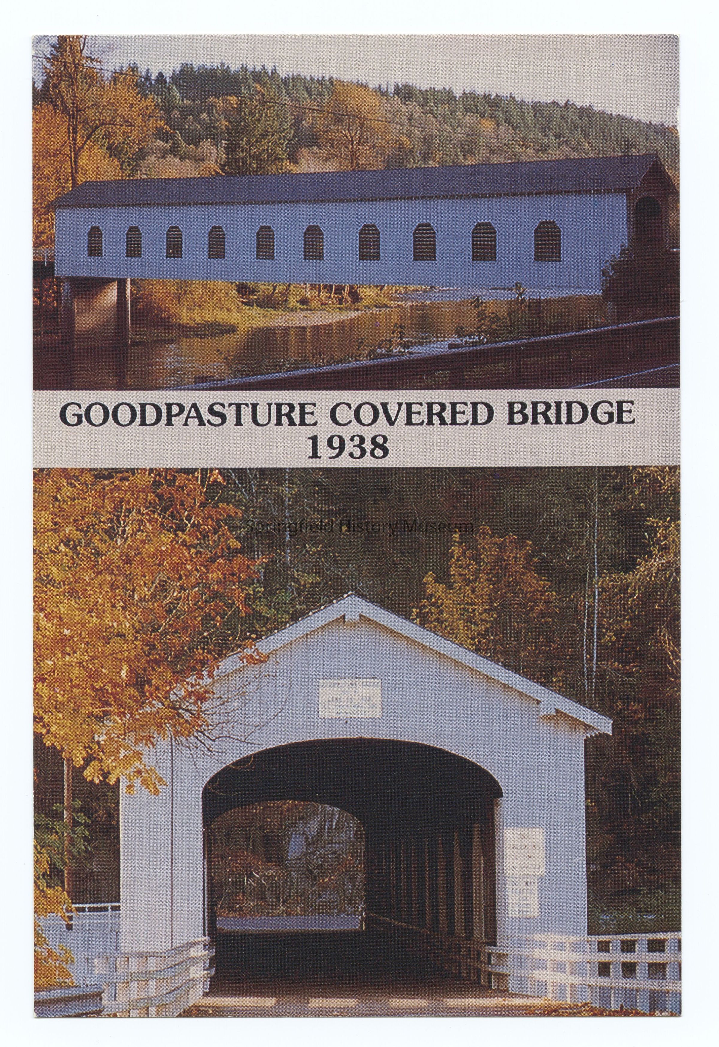 Postcard of the Goodpasture Covered Bridge in the fall, built in 1938, Highway 126, west of Vida, Oregon, undated postcard.Photograph Details