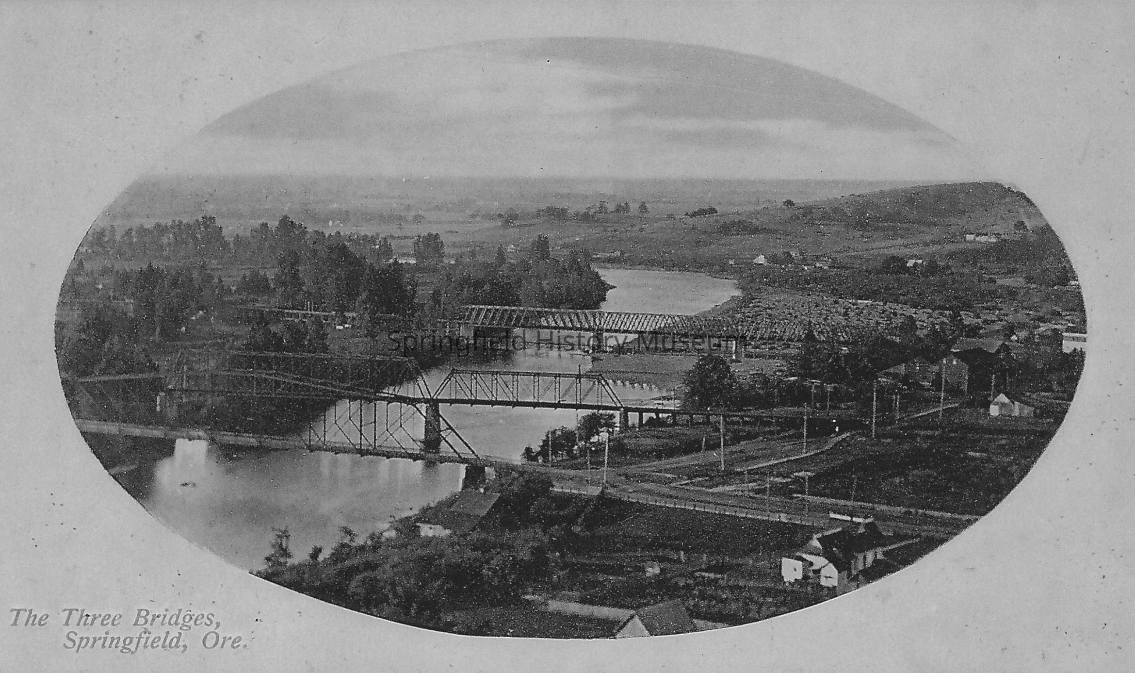 Postcard photo titled, "The Three Bridges, Springfield, Ore." No. 1171 Published by Pacific Novelty Co. of San Francisco, Cal. Letter written on back is postmarked Apr. 13, 1912.