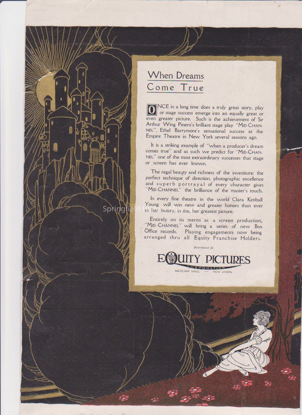 Poster of "Mid Channel" by Sir Arthur Wing Pinero. Photo / Advertisement for "Harry Garson presents Clara Kimball Young in Ethel Barrymore's Sensational stage success. "Mid Channel" by Sir Arthur Wing Pinero. Distributed by Equity Pictures Inc." Back: Advertisement "Mid Channel".