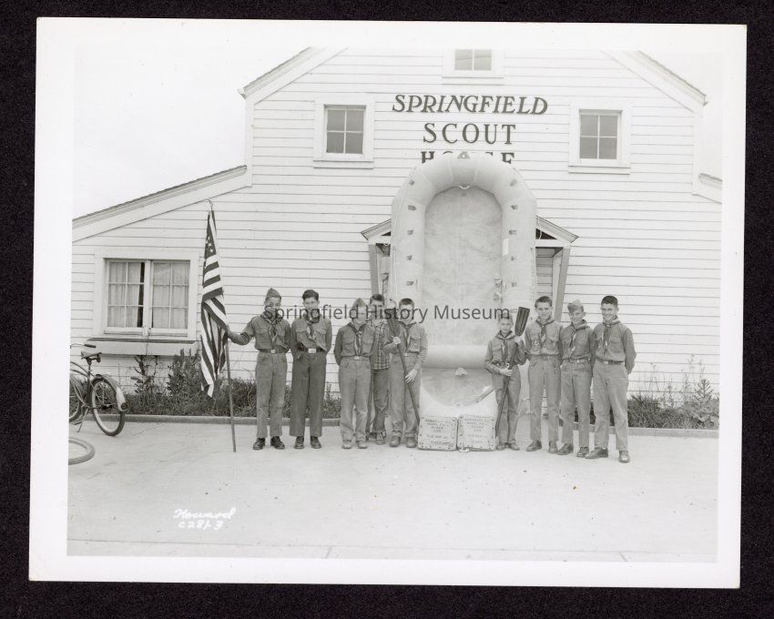 B&W Photo of a troop of Boy Scouts standing outside of the Springfield Scout House with Raft. June 16, 1949. House was located on B Street between Mill and Second. The house was built by the Springfield Scout House, Inc. LLC after funding from WPA fell through.Collection