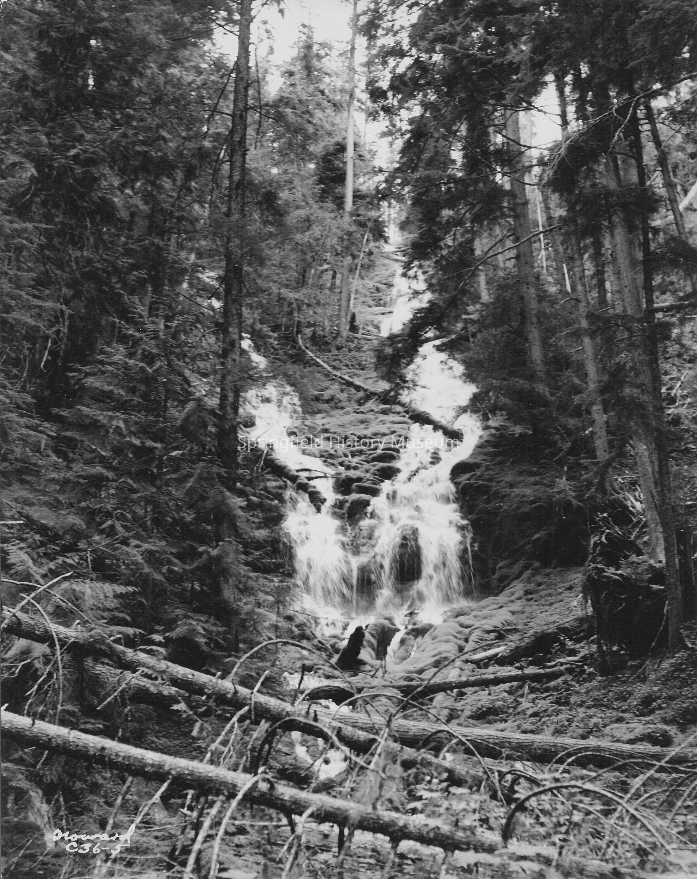 Proxy Falls on Upper McKenzie River, 1947. Marked Howard C36-5. Two streams of water converging at center of photo.