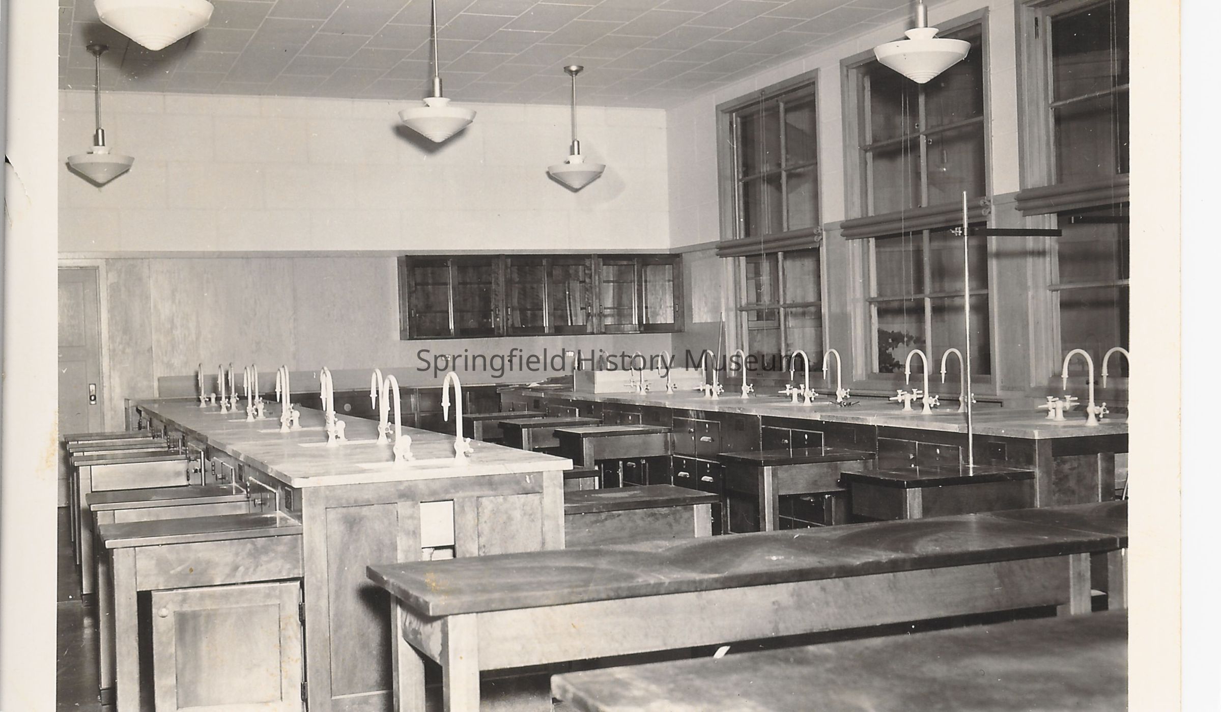 Springfield High School Science Lab, sinks, cupboards and tables, with hanging lights above.