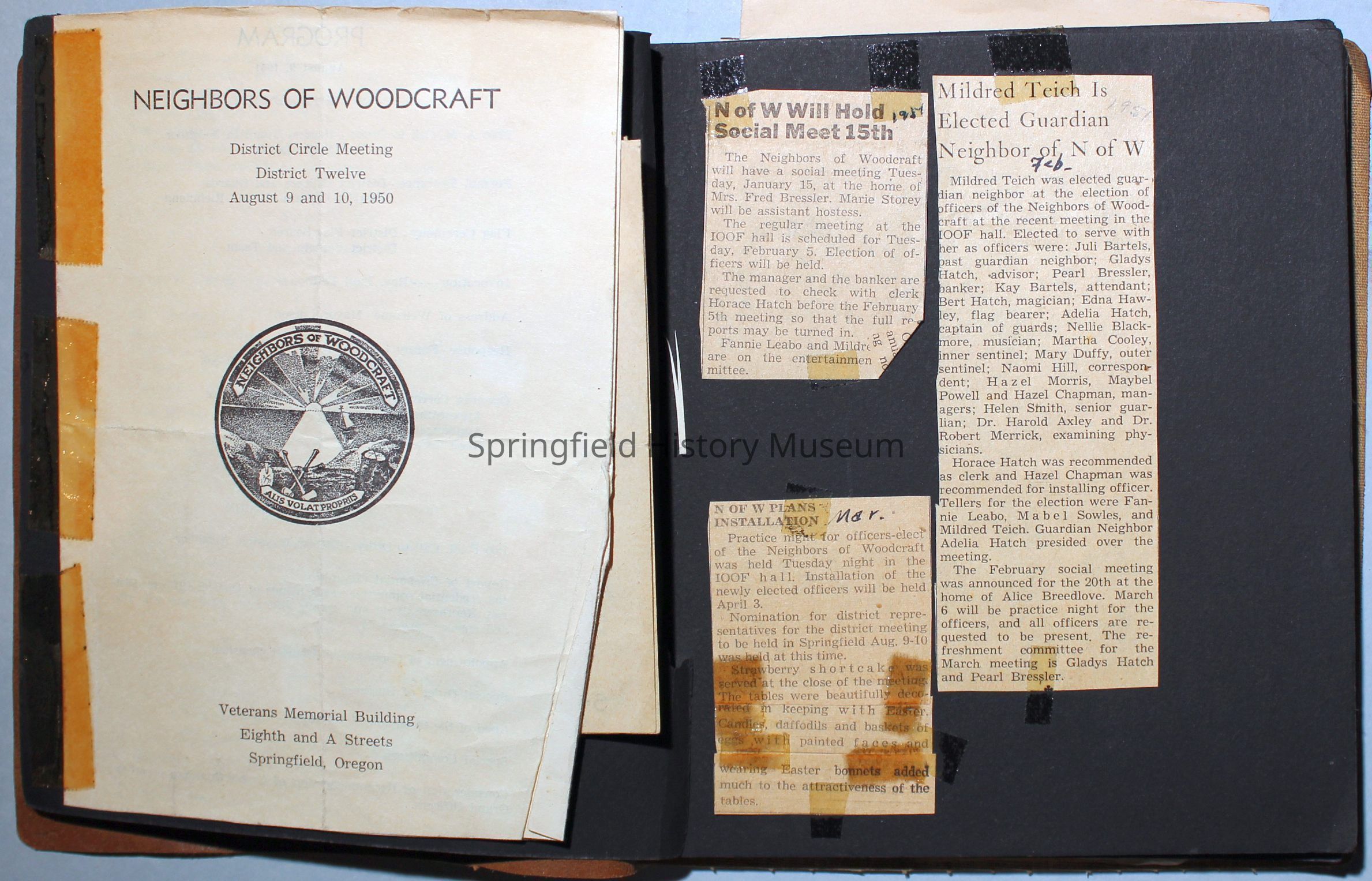 Scrapbook with leather cover. Contains donor's collection of clippings and mementos of Neighbors of Woodcraft activities.Acquisition