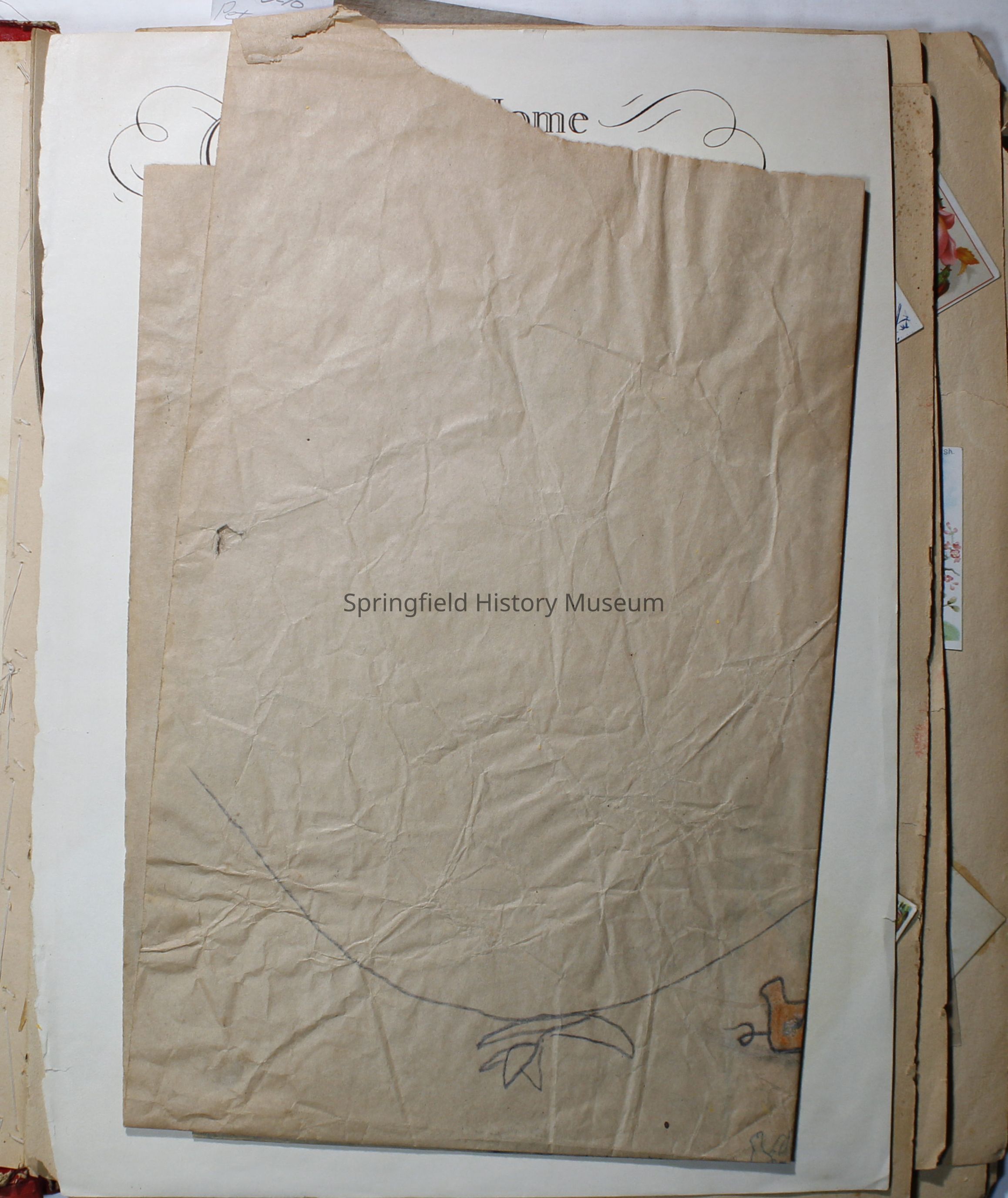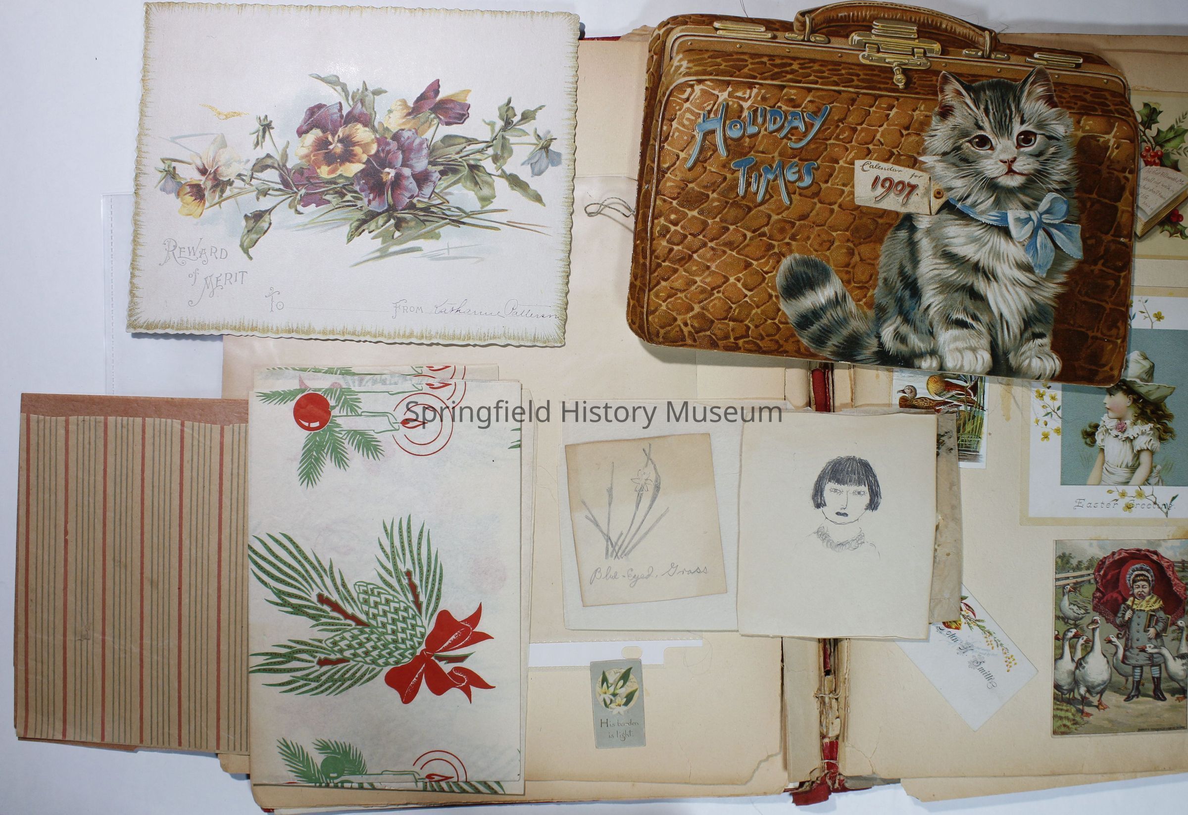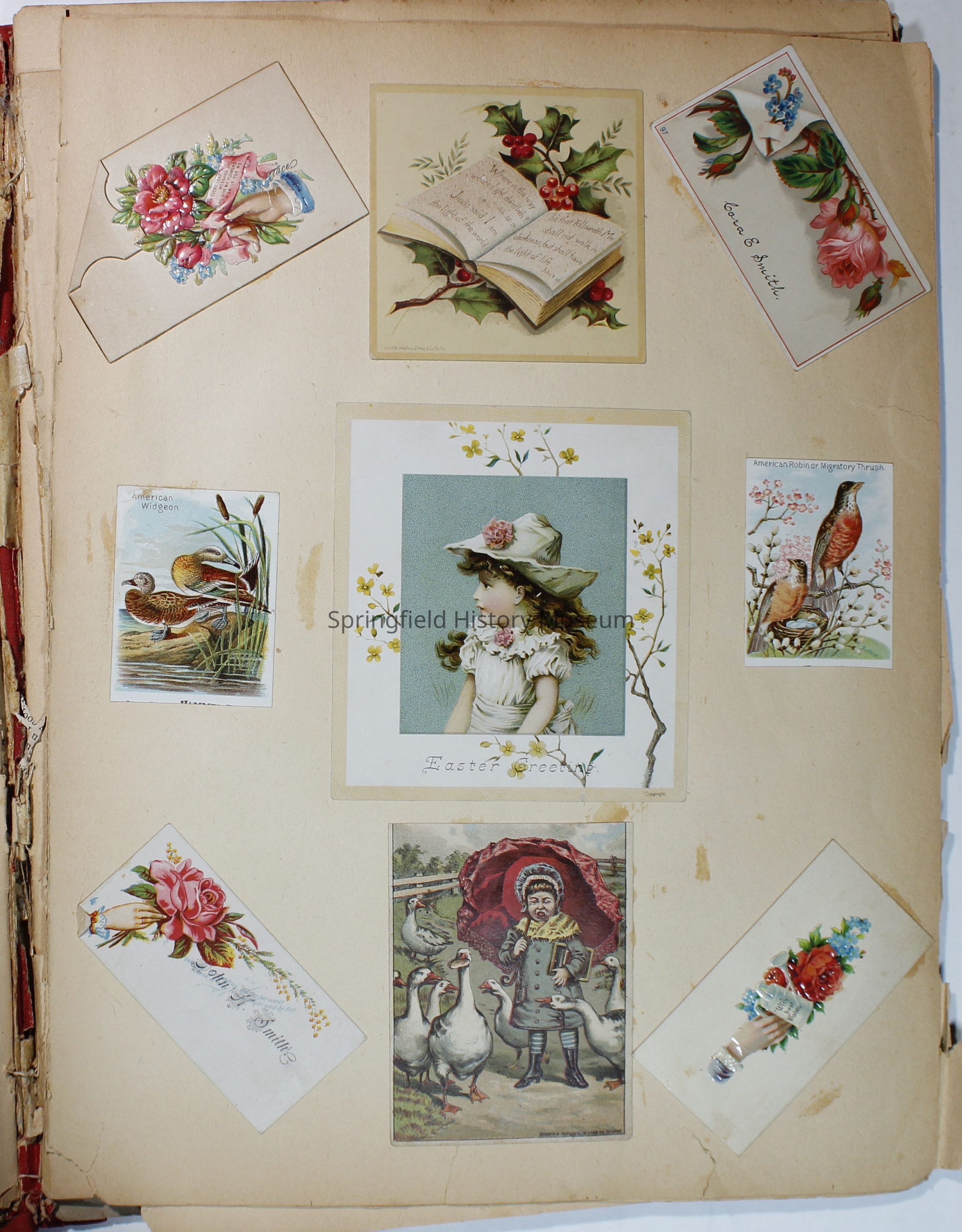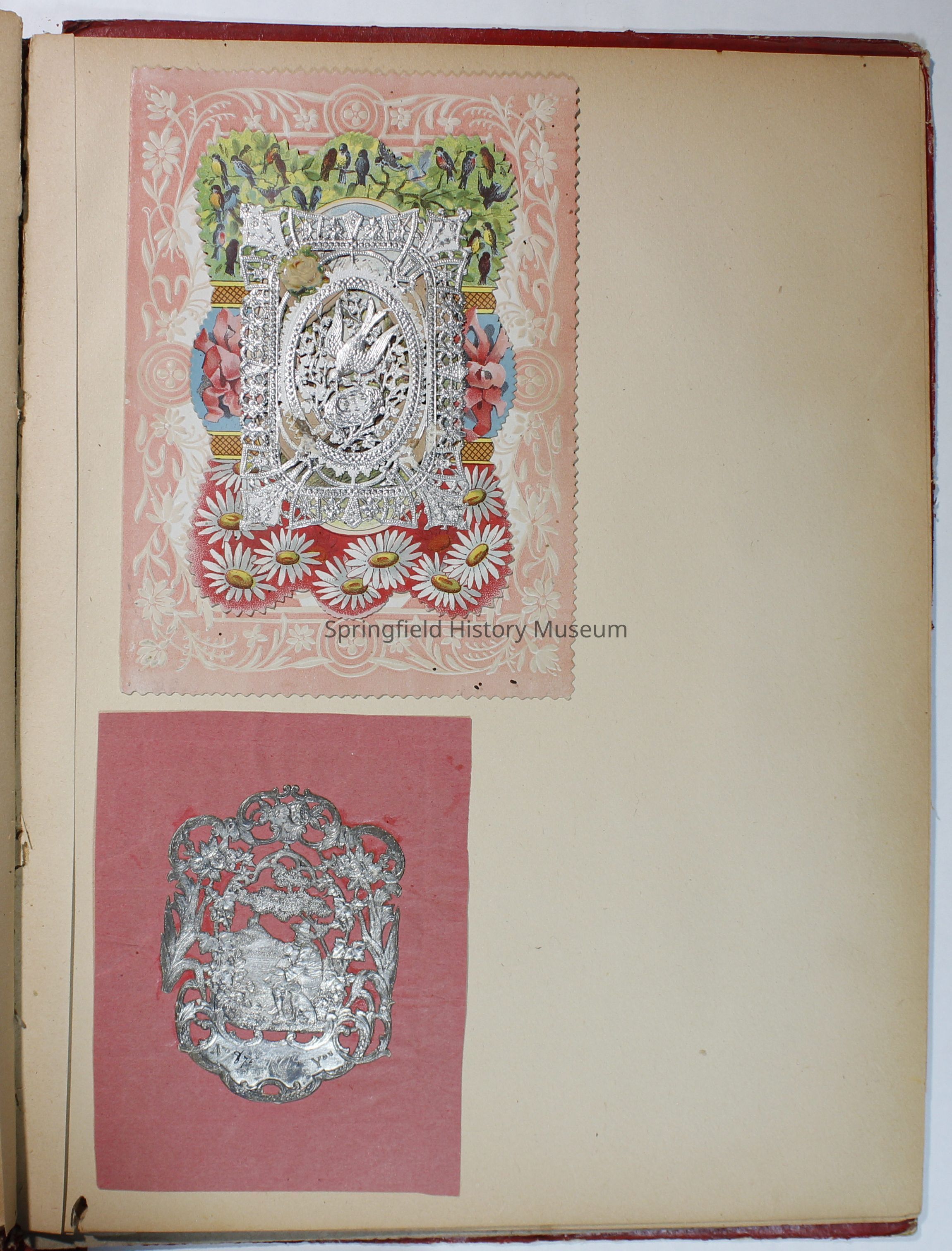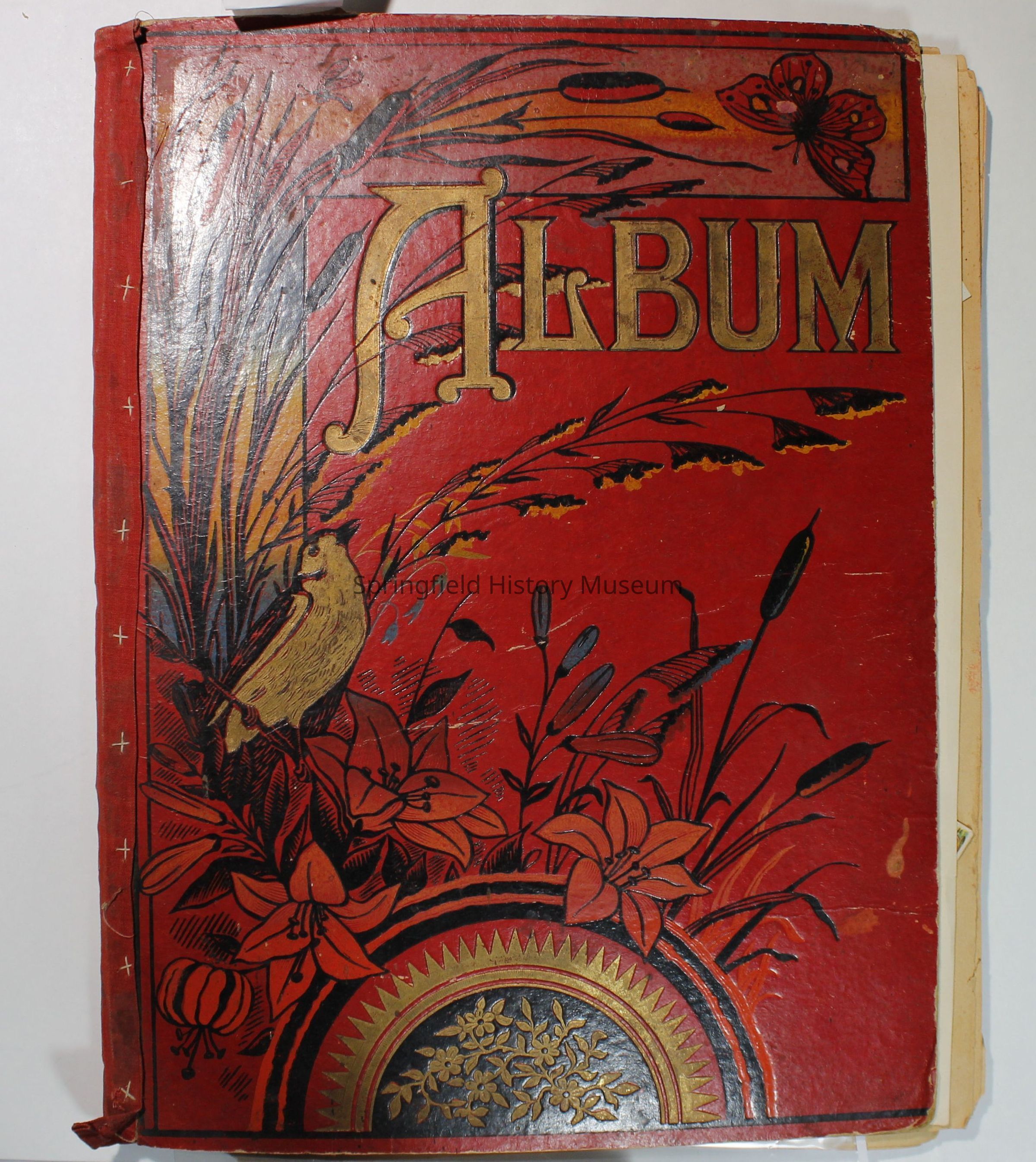 Scrapbook with red cover, floral pattern with bird and gold lettering. Contains cards and drawings. The scrapbook belonged to Nellie Wallace Sanders (donor's mother).