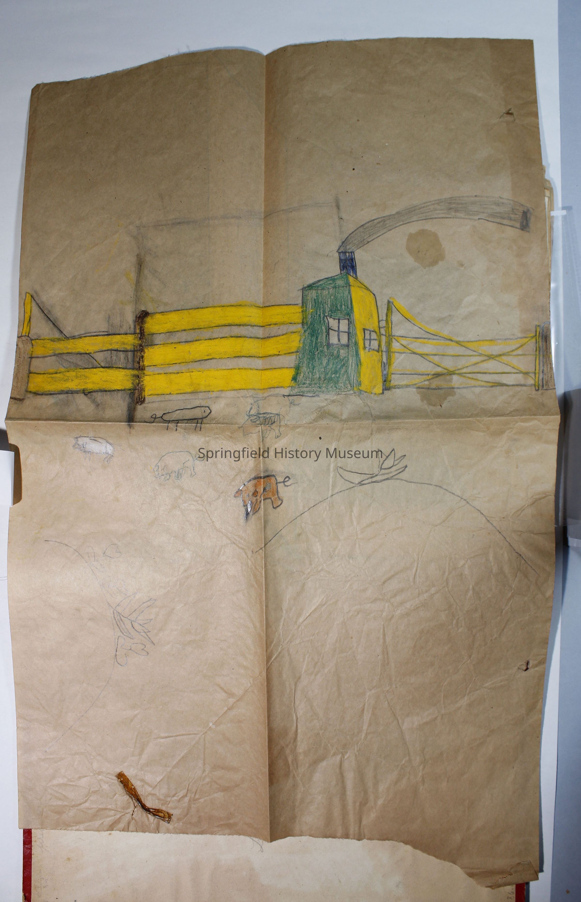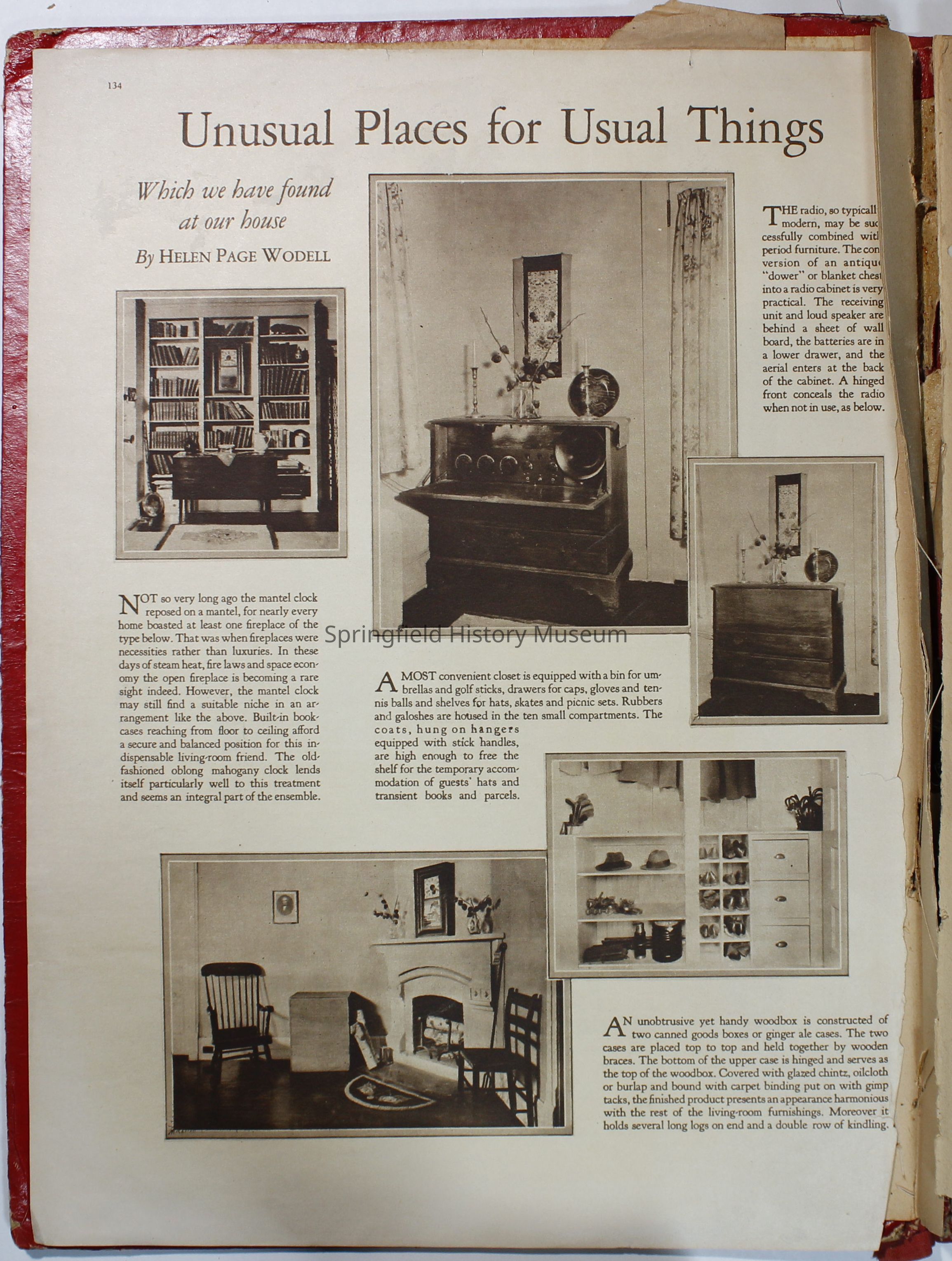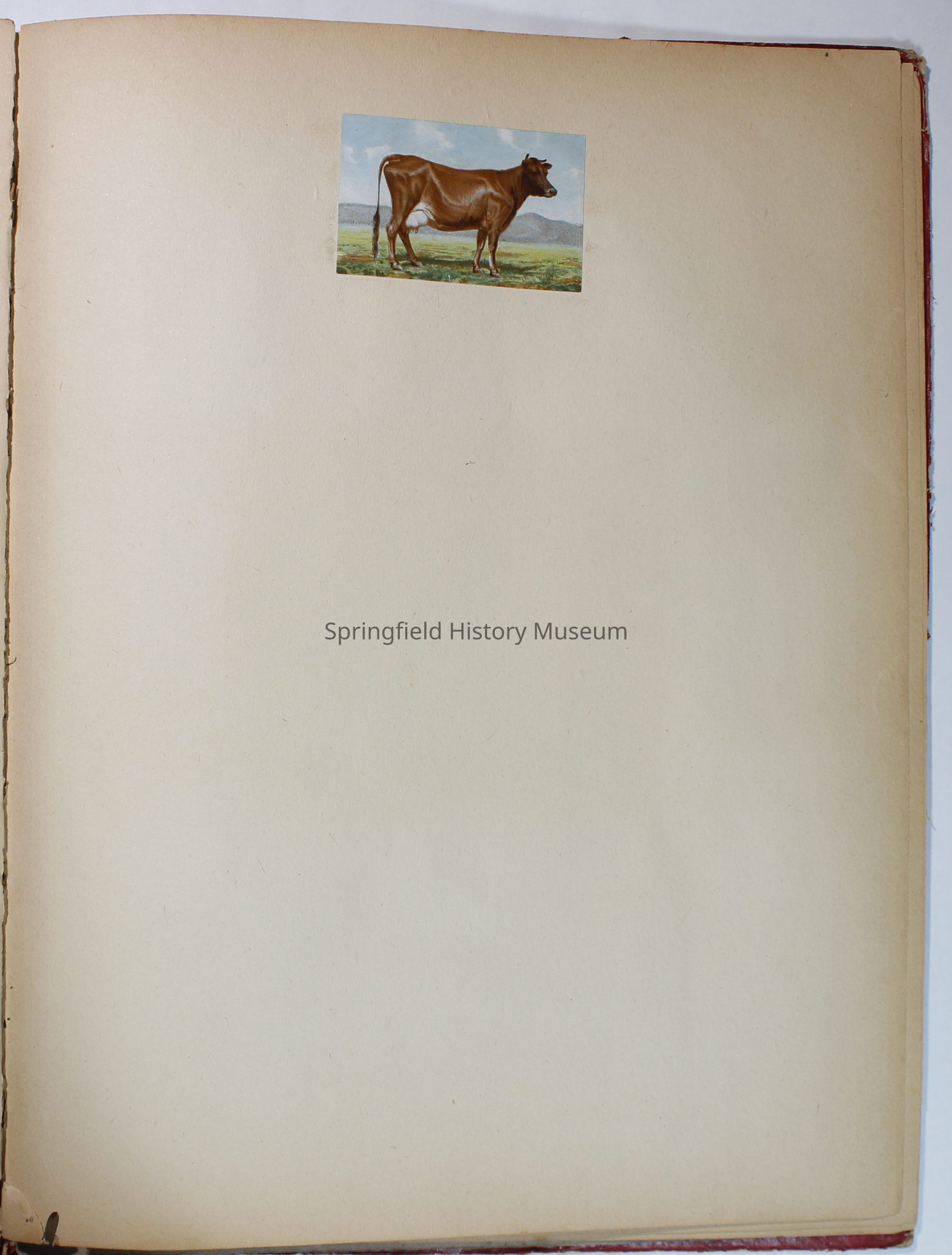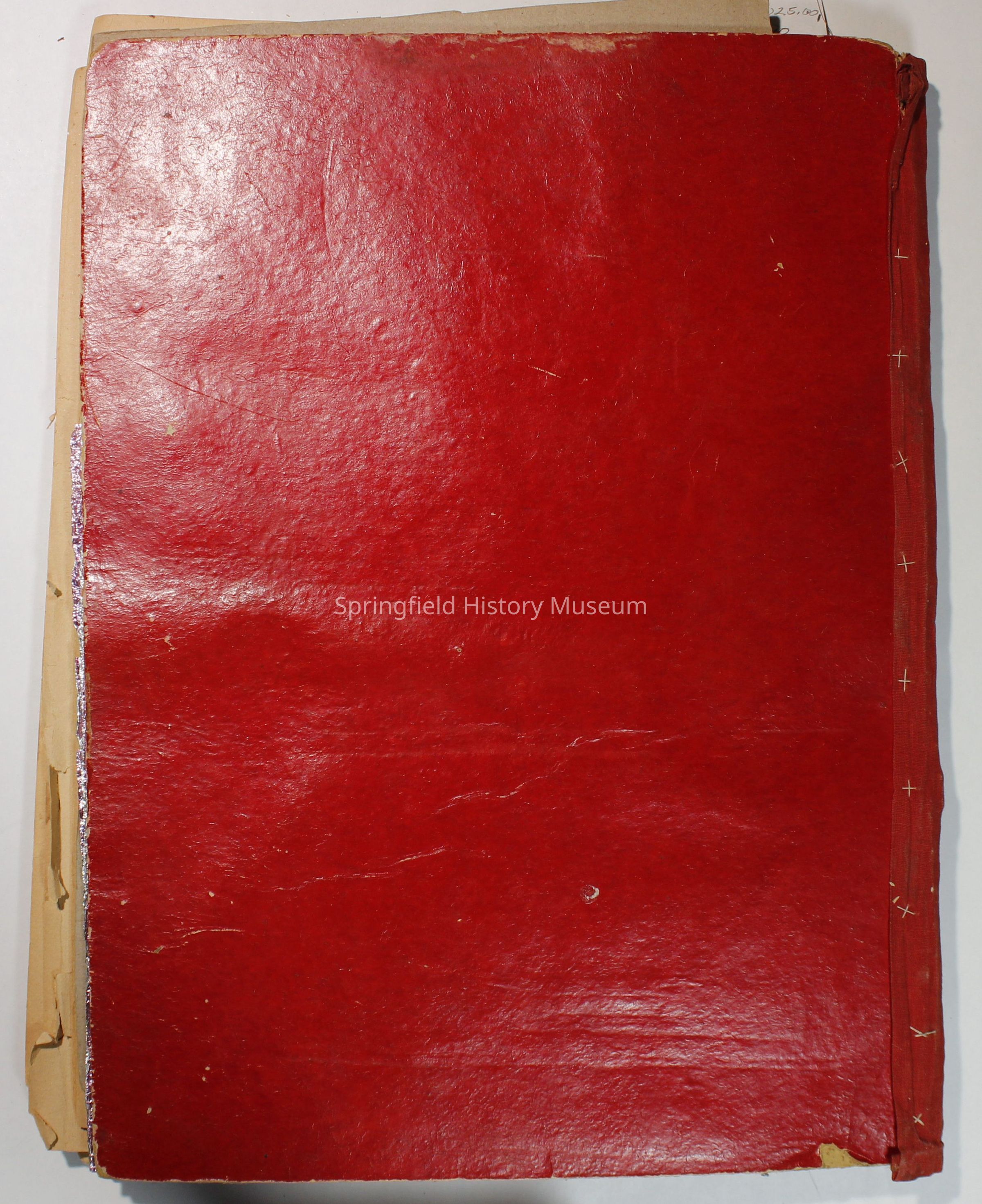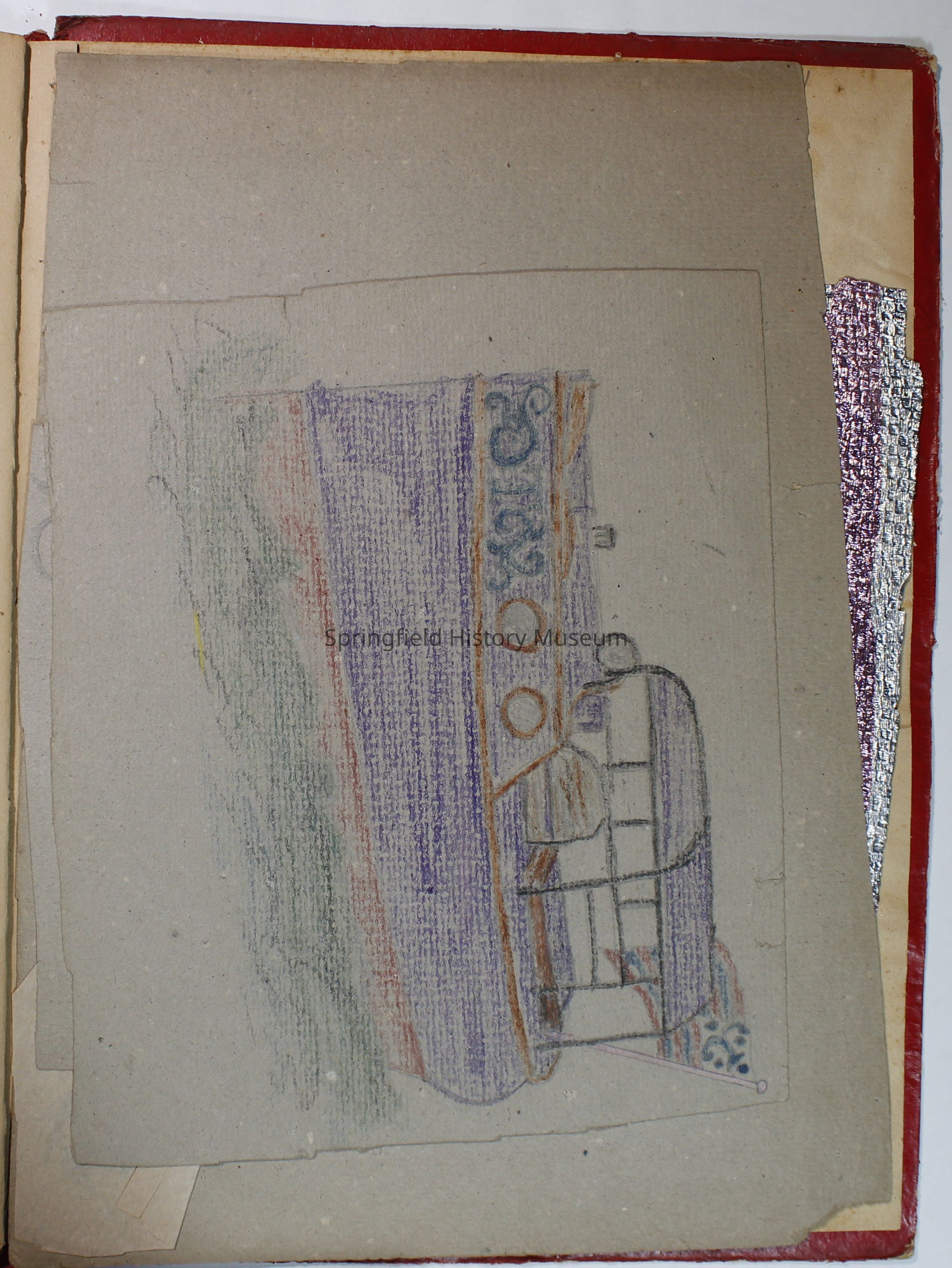 Scrapbook with red cover, floral pattern with bird and gold lettering. Contains cards and drawings. The scrapbook belonged to Nellie Wallace Sanders (donor's mother).