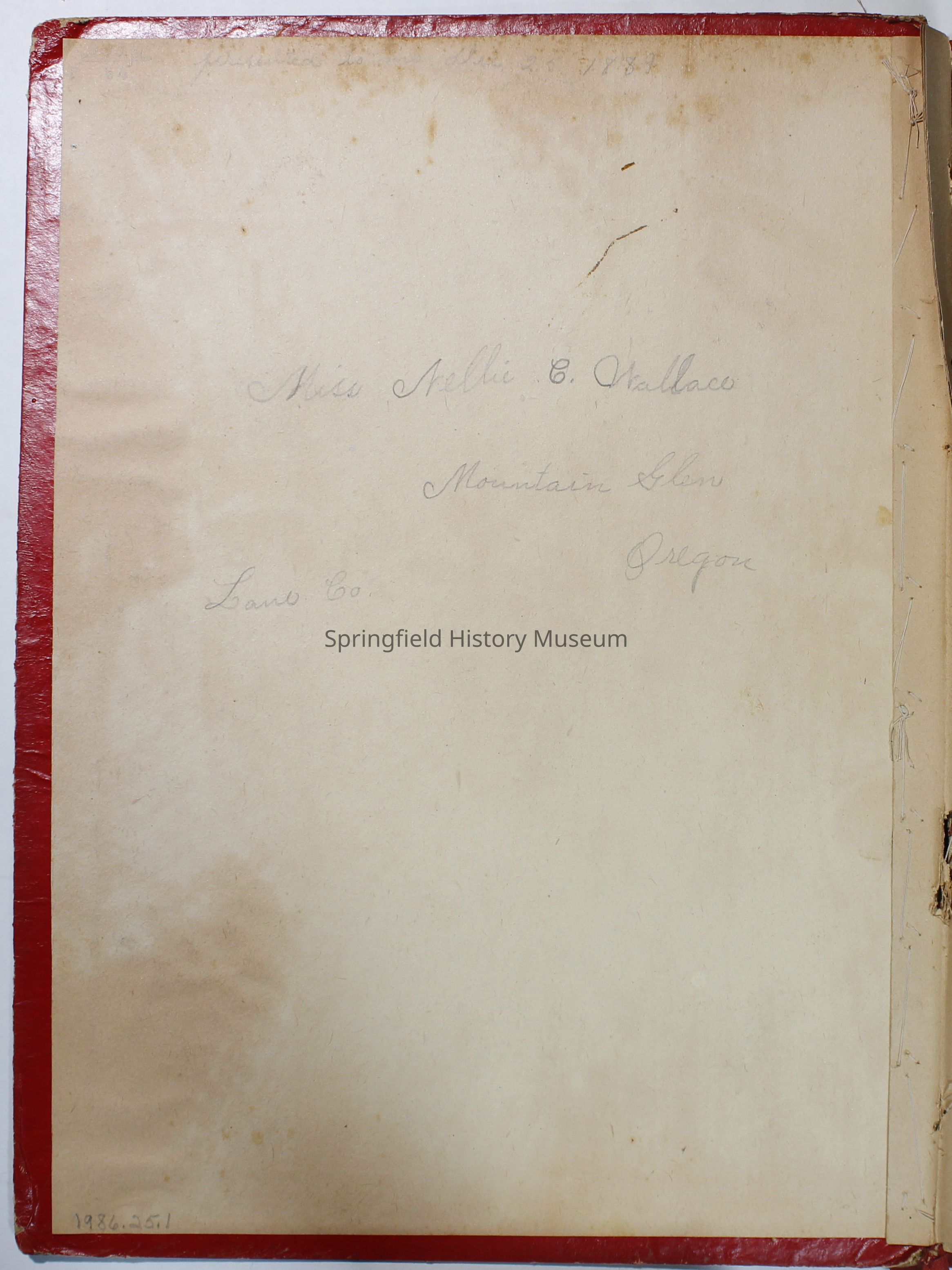 In pencil in front cover: "presented to me Dec 25 1889, Miss Nellie C Wallace, Mountain Glen, Oregon".Collection
