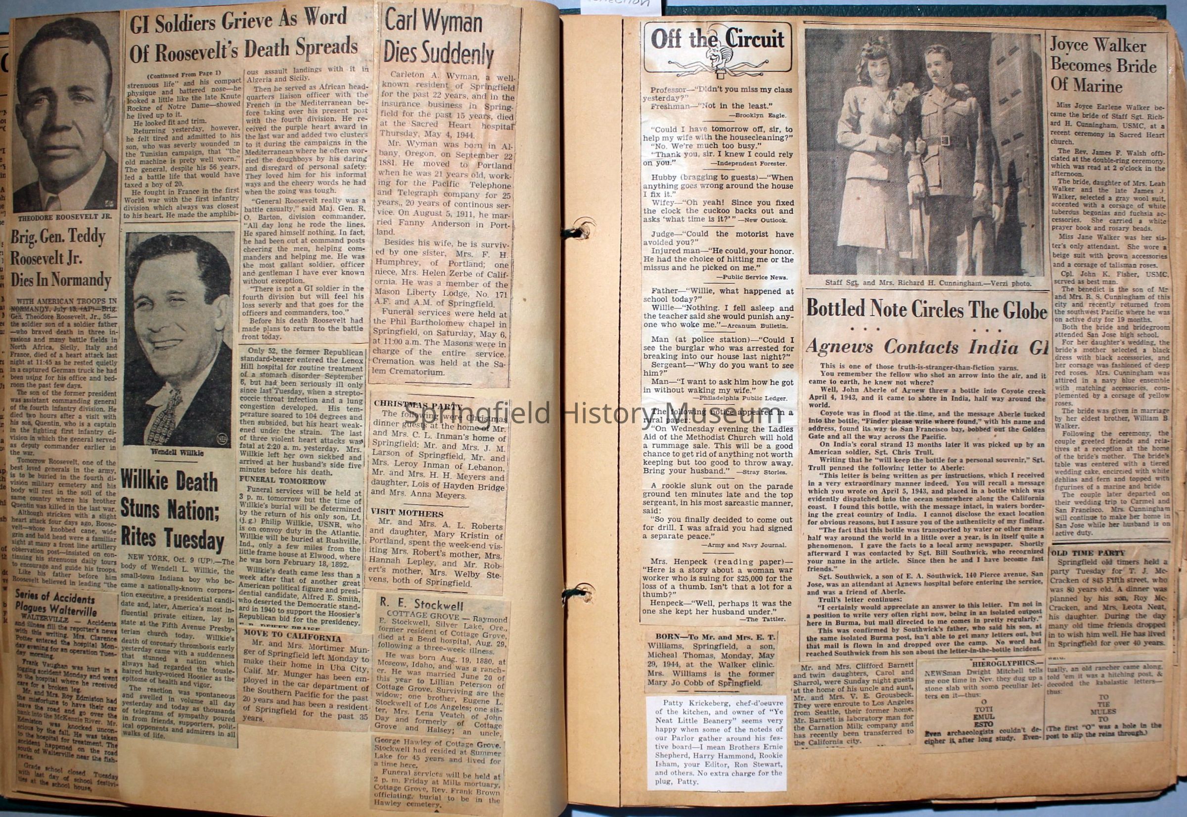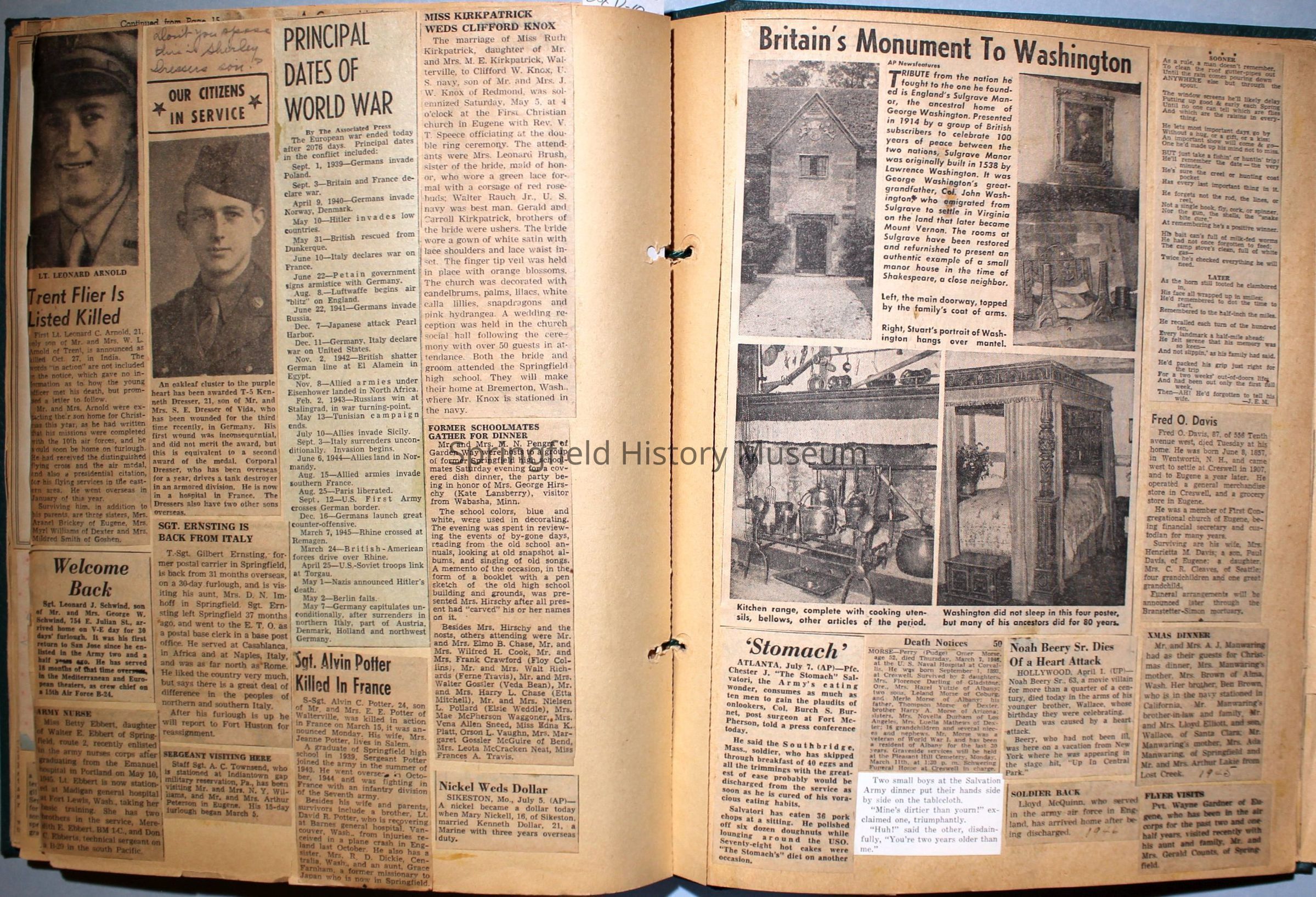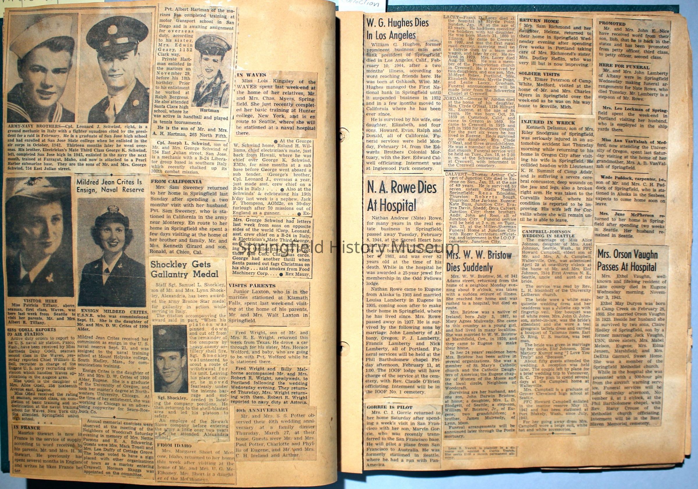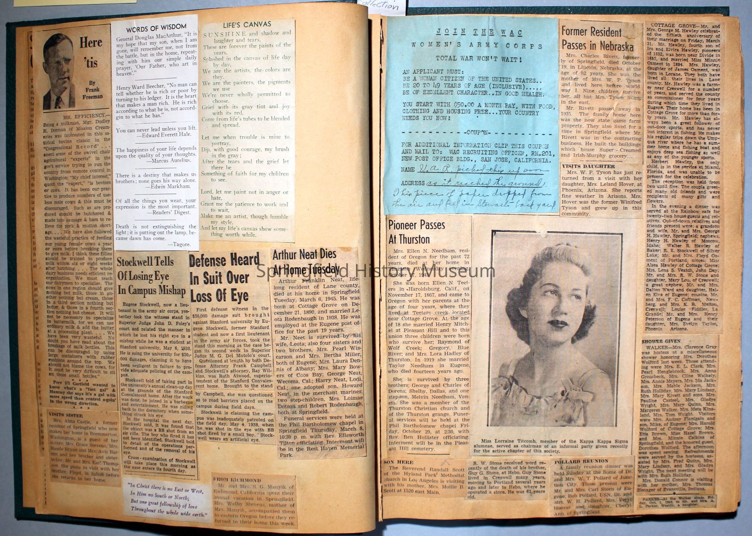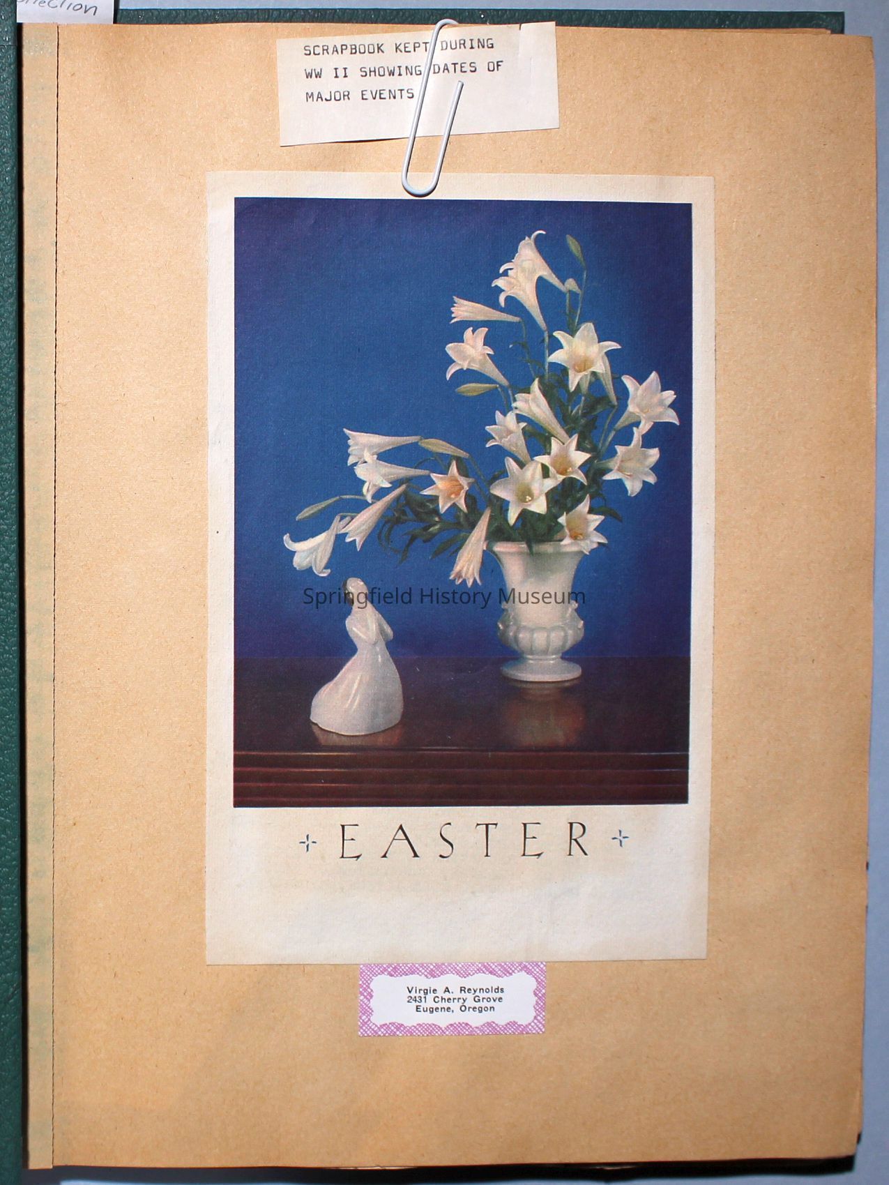 Green covered scrapbook with tied cord; address sticker on first page: Virgie A Reynolds. Back, inside cover displays an illustrated clipping of Jesus Christ. A few pictures from magazines, the bulk is newspaper clippings about World War II and the happenings of local families in the 1940s. Scrapbook contains personal relics from World War II, such as a "Join the WAC" slip that Virginia collected and wrote on.Collection