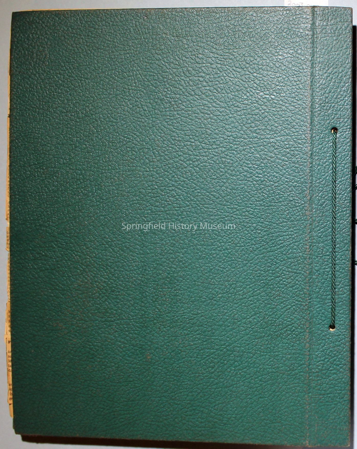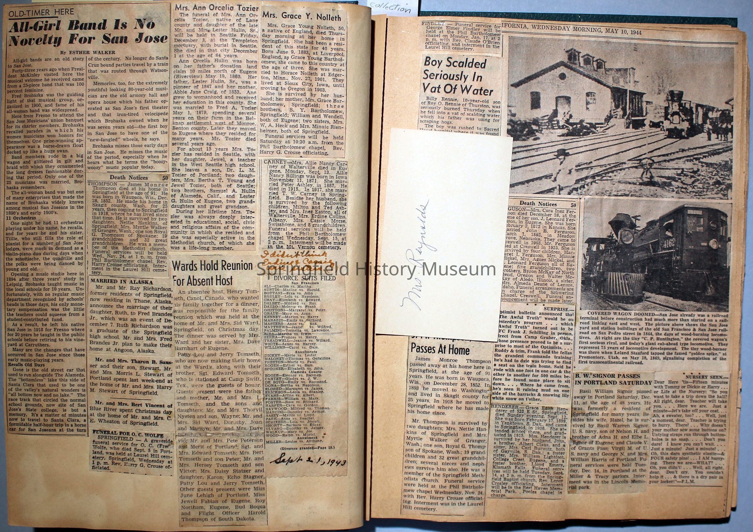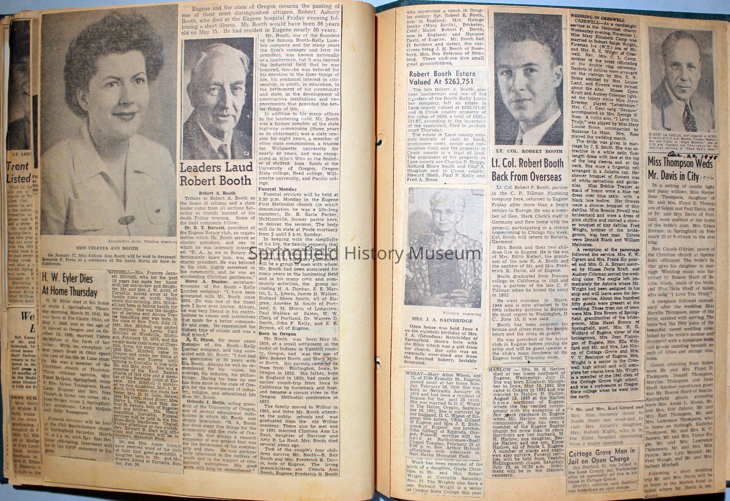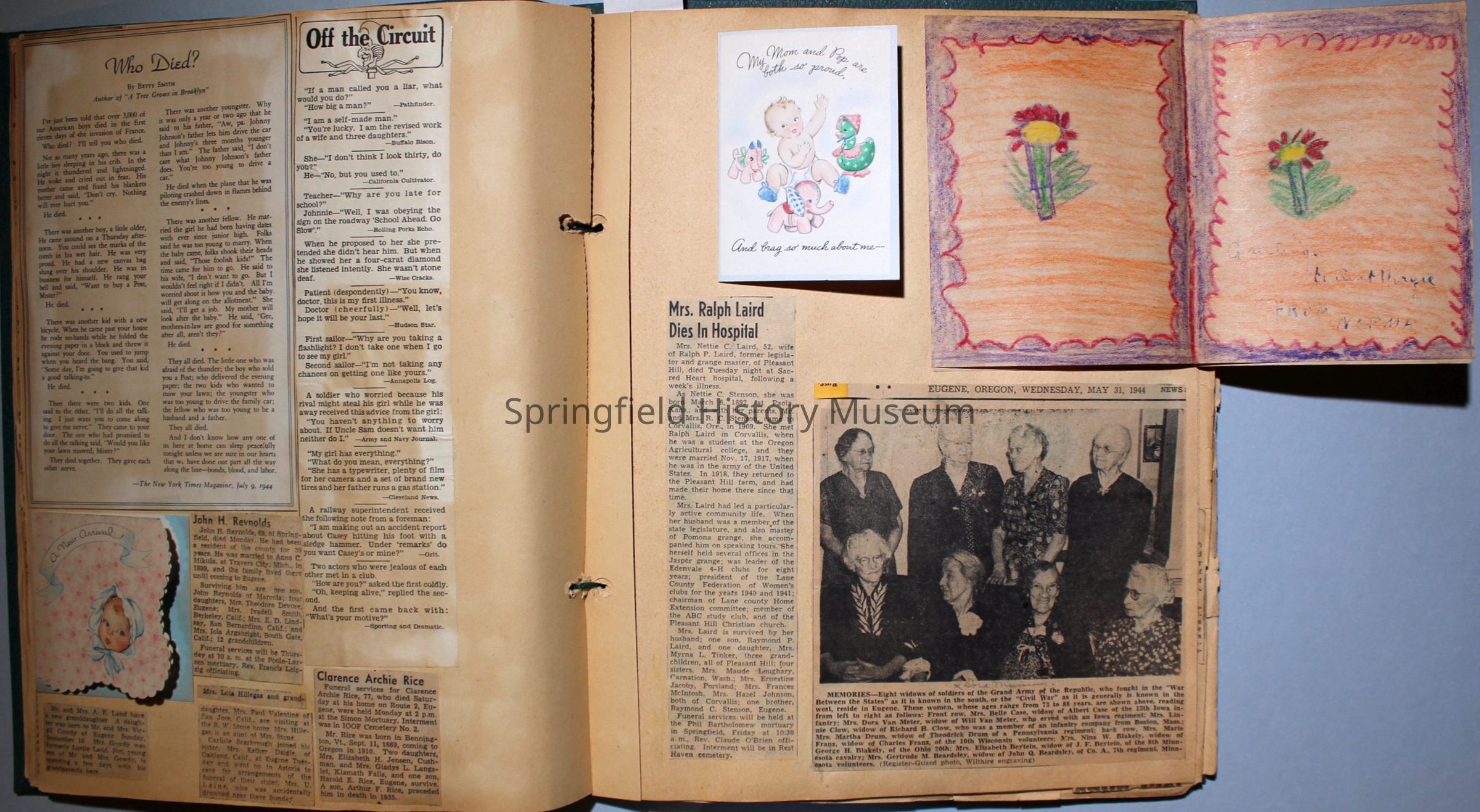 Green covered scrapbook with tied cord; address sticker on first page: Virgie A Reynolds. Back, inside cover displays an illustrated clipping of Jesus Christ. A few pictures from magazines, the bulk is newspaper clippings about World War II and the happenings of local families in the 1940s. Scrapbook contains personal relics from World War II, such as a "Join the WAC" slip that Virginia collected and wrote on.Collection