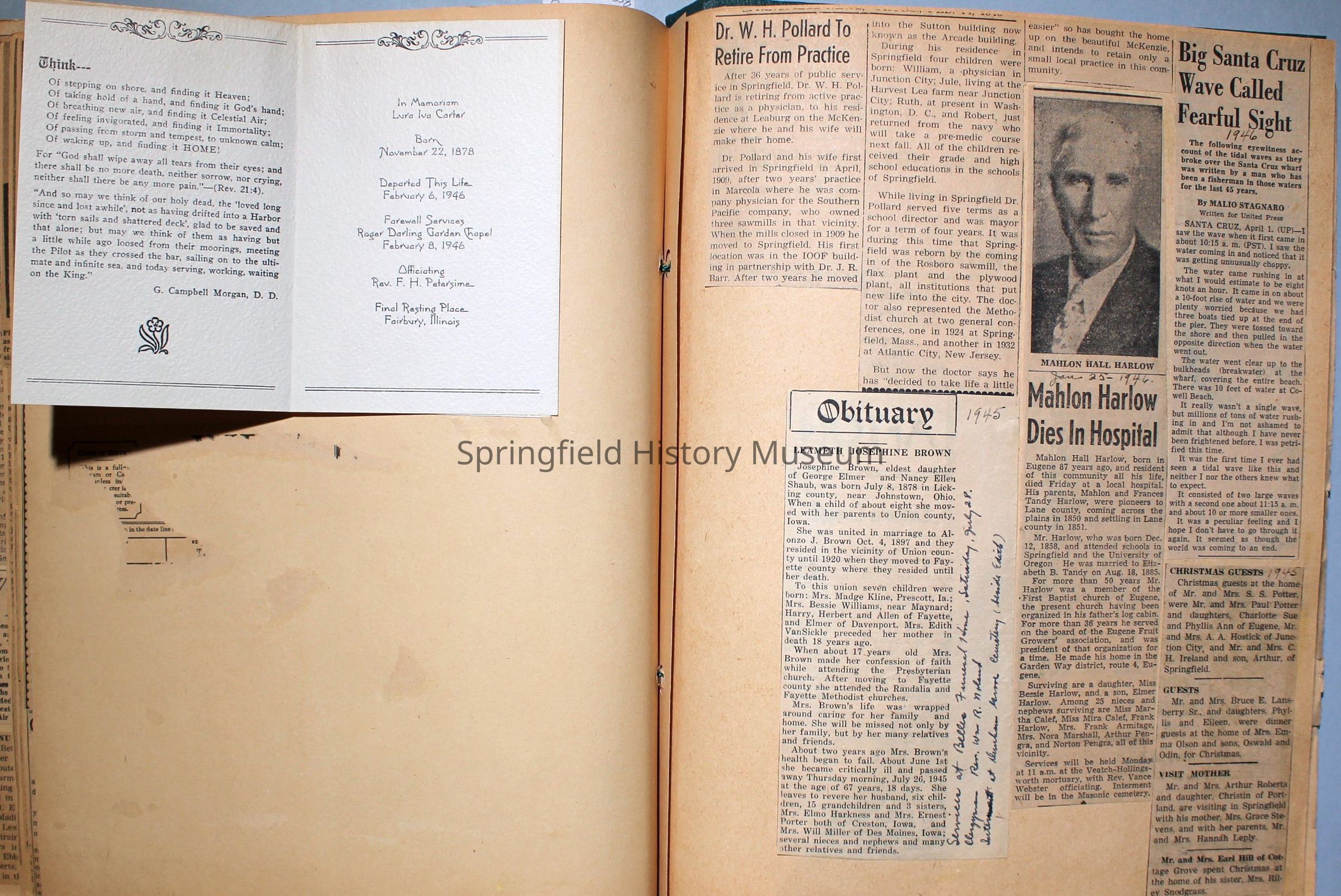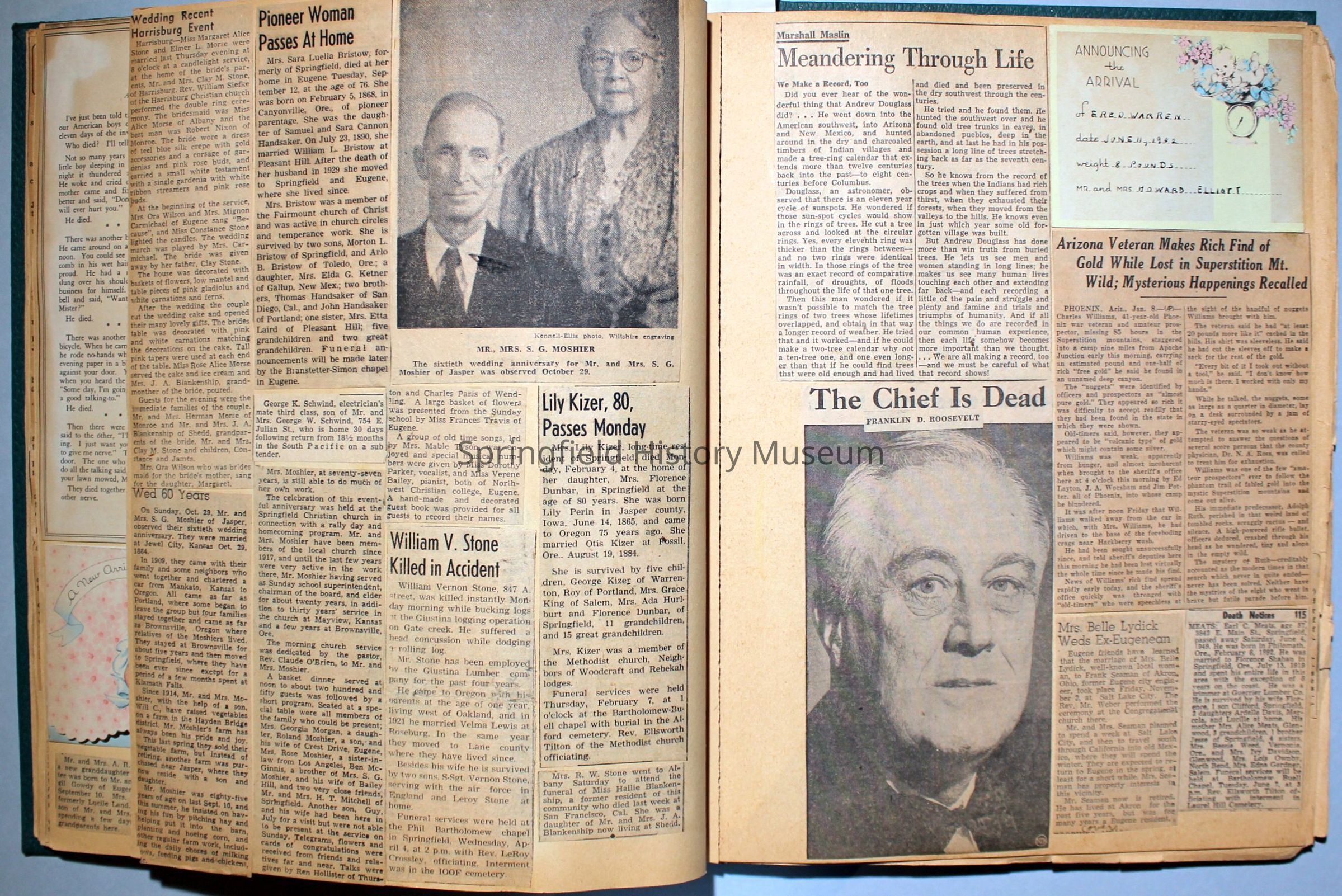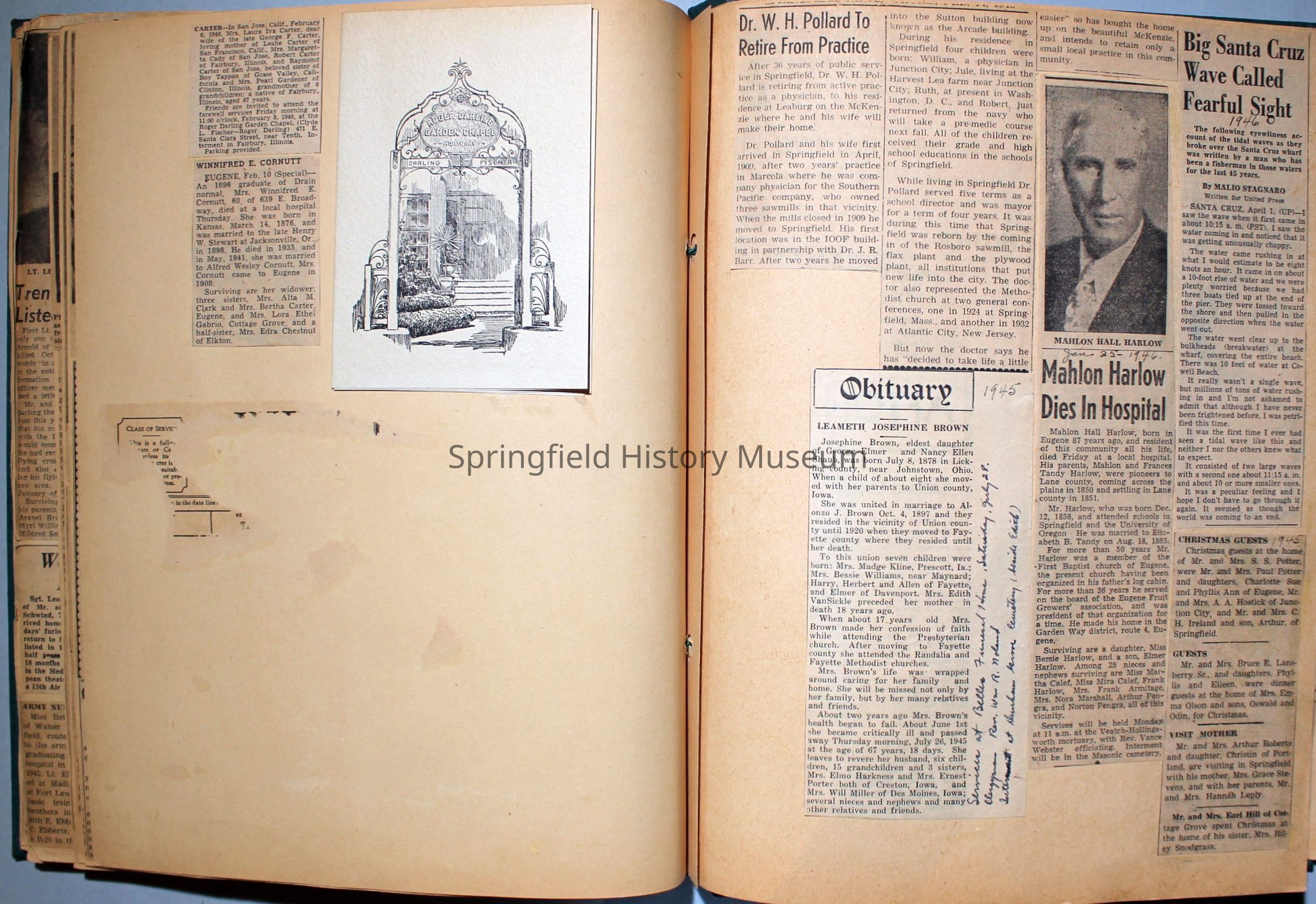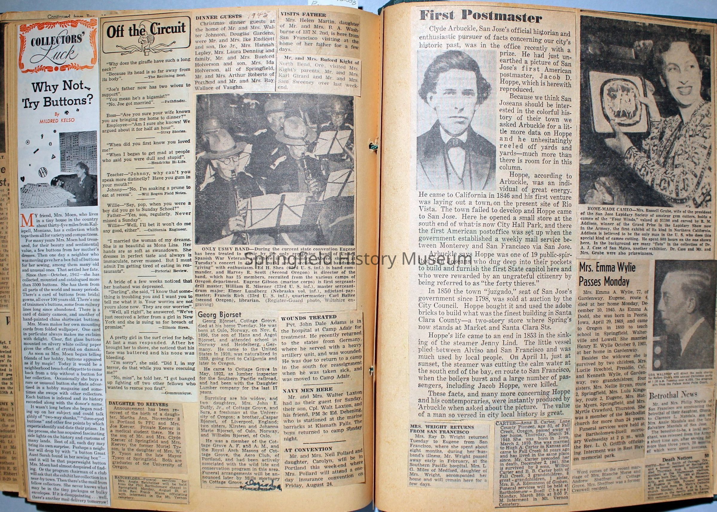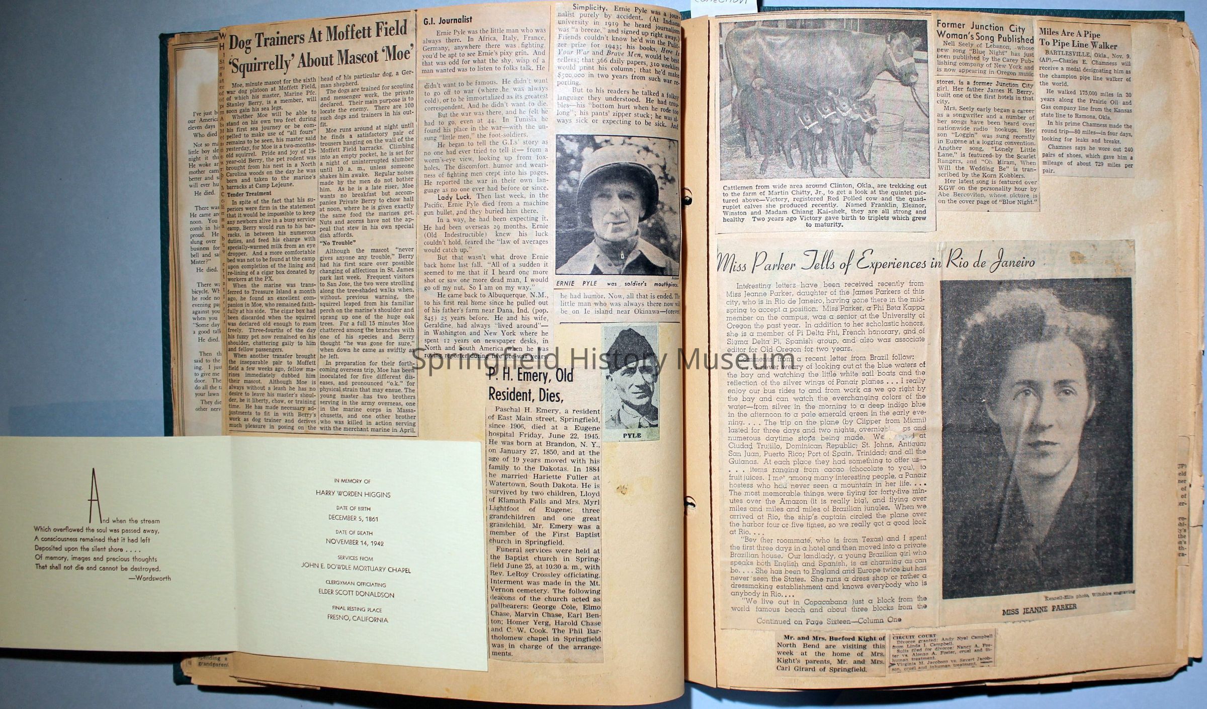 Green covered scrapbook with tied cord; address sticker on first page: Virgie A Reynolds. Back, inside cover displays an illustrated clipping of Jesus Christ. A few pictures from magazines, the bulk is newspaper clippings about World War II and the happenings of local families in the 1940s. Scrapbook contains personal relics from World War II, such as a "Join the WAC" slip that Virginia collected and wrote on.Collection