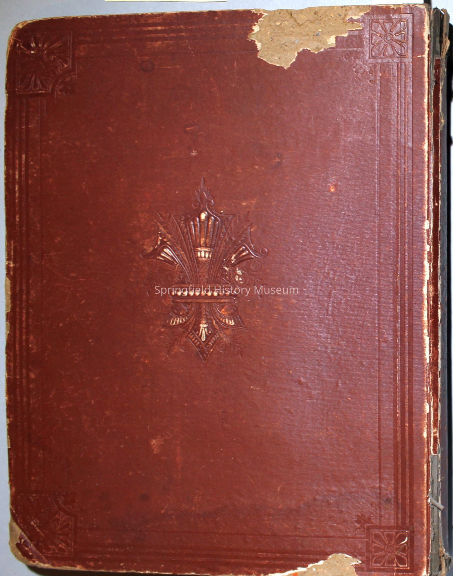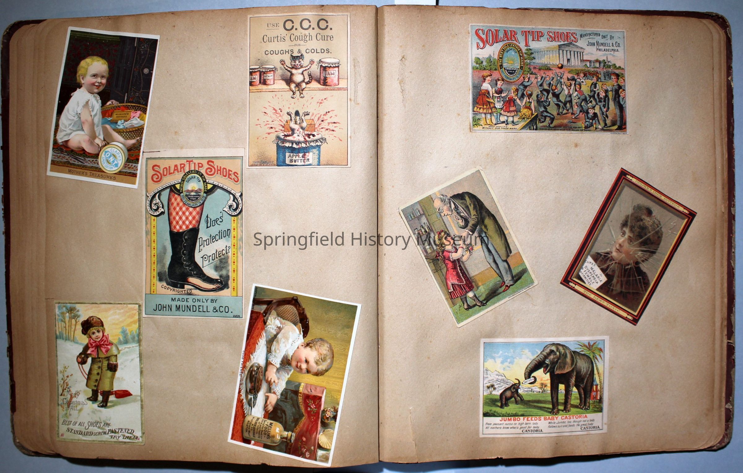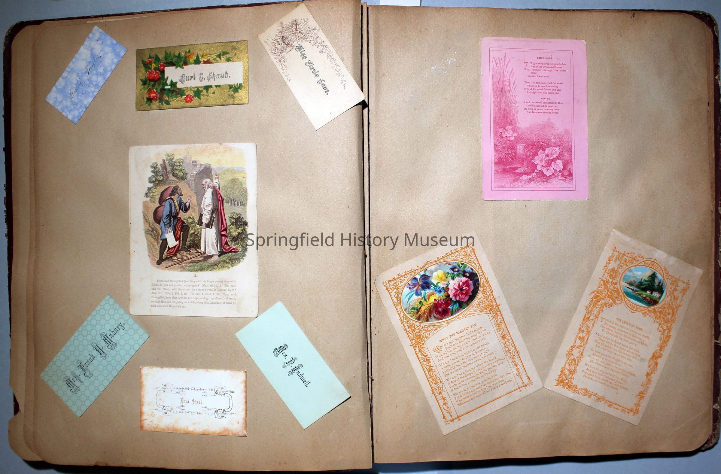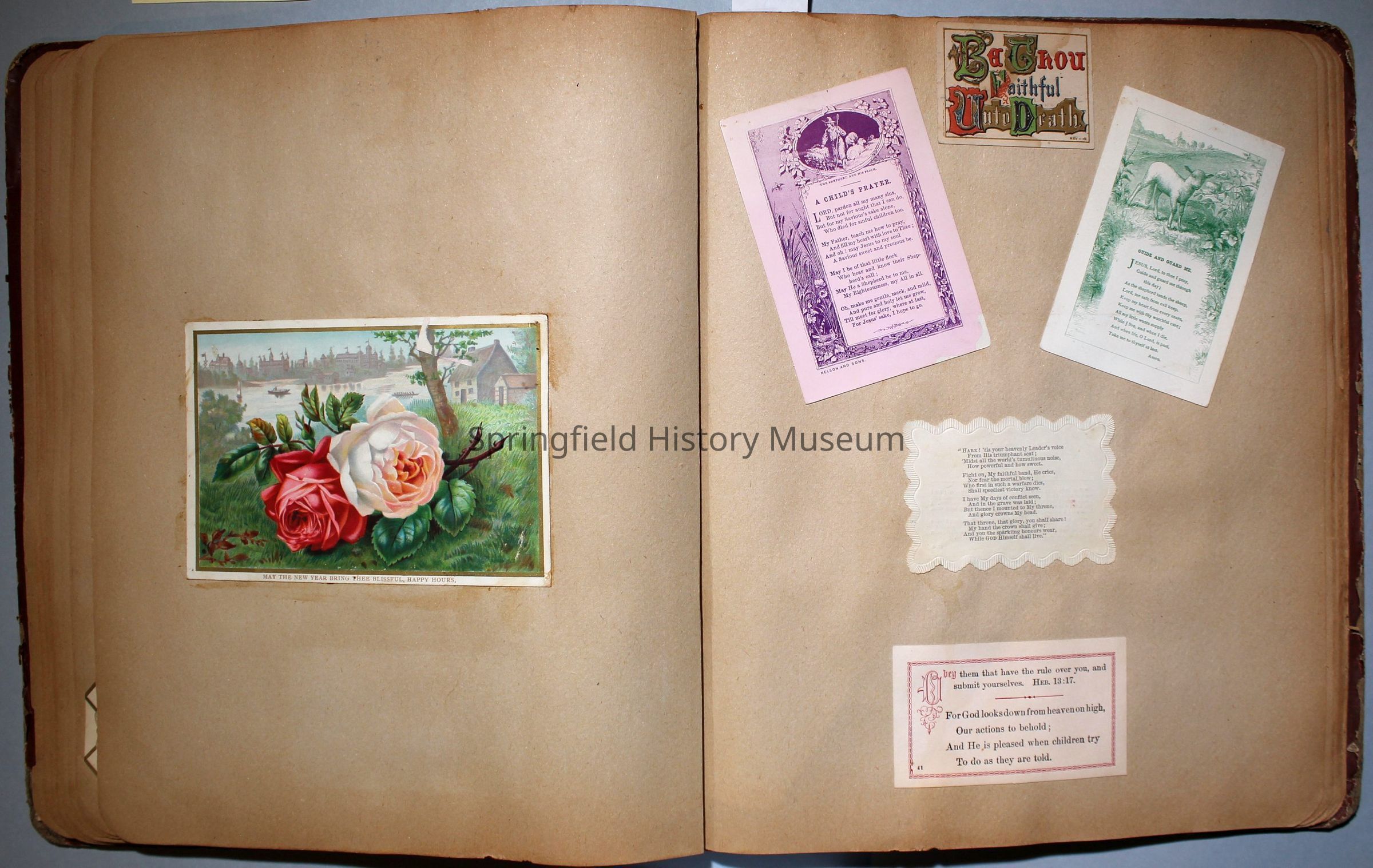 Red/brown scrapbook with intricate floral designs on the cover. Many clippings are dated before Virginia was born or when she was very young, indicating many of the clippings are family momentos. Scrapbook consists of Christian religious clippings, holiday cards, illustrations with lace overlays and fabric fringe, wedding invites, birthday cards, stickers, and advertisements (ex. Jam Cold Medicine, Solar Tipped Shoes, etc.).Collection