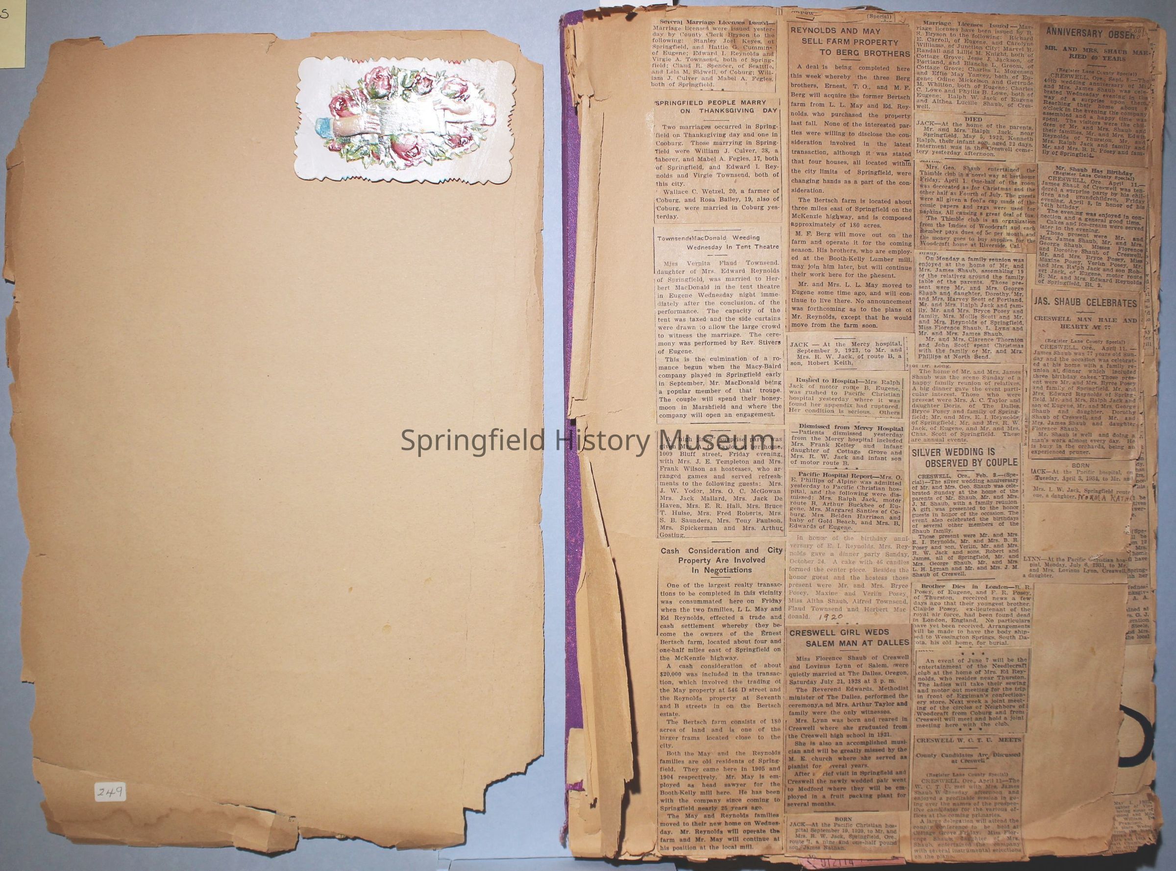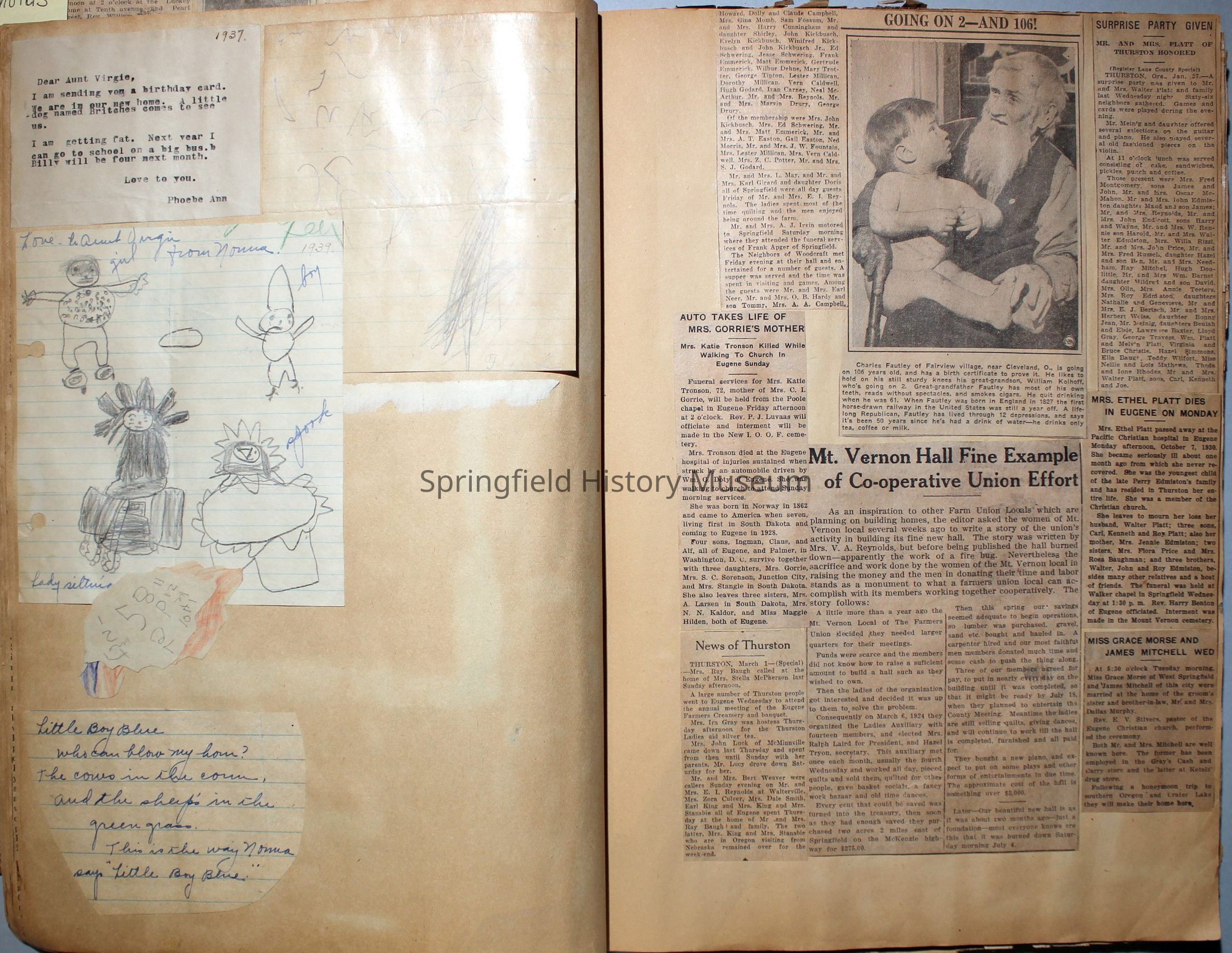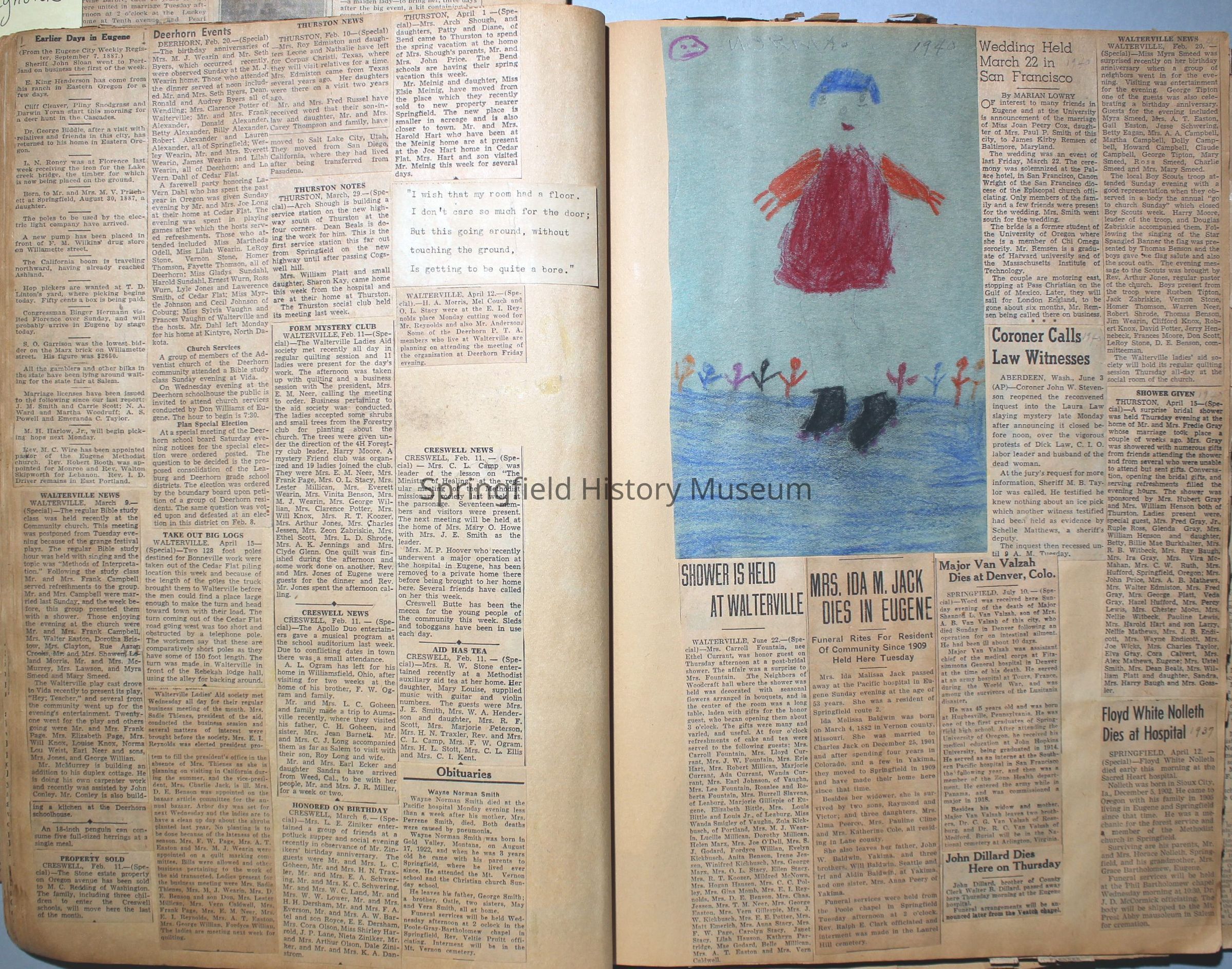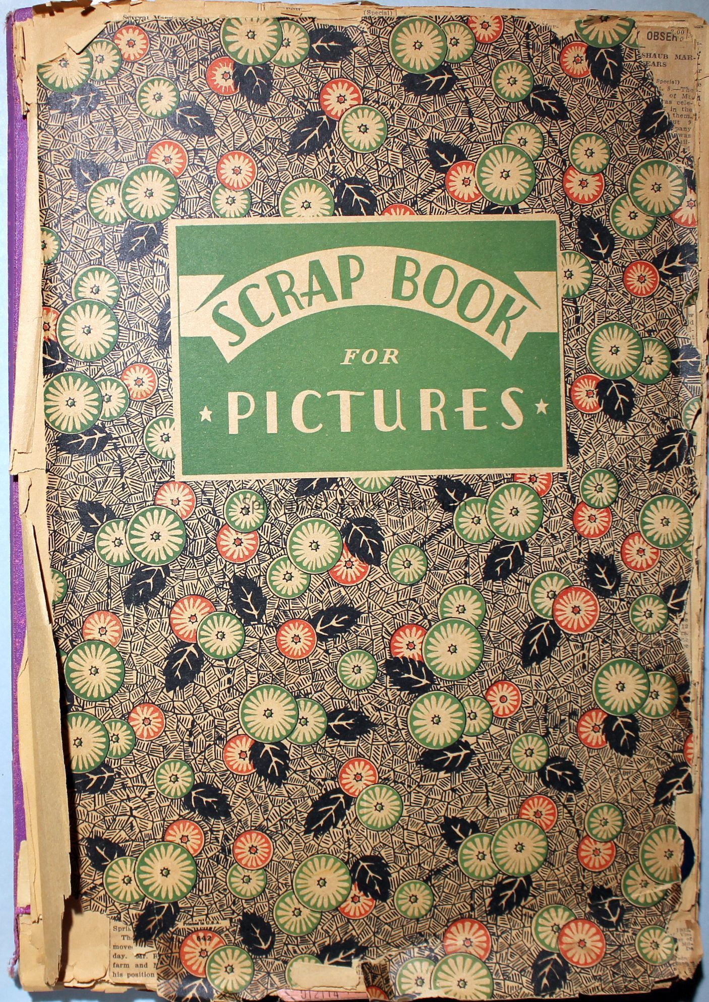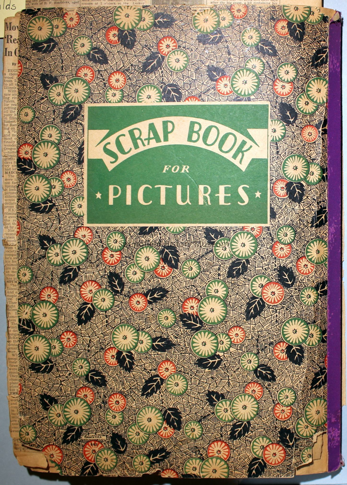 Cover reads: "Scrapbook for Pictures." Paperback scrapbook; newspaper clippings about local news, families and friends, advertisements, as well as letters and drawings from children and other relatives; dates from 1920 through 1940.Collection