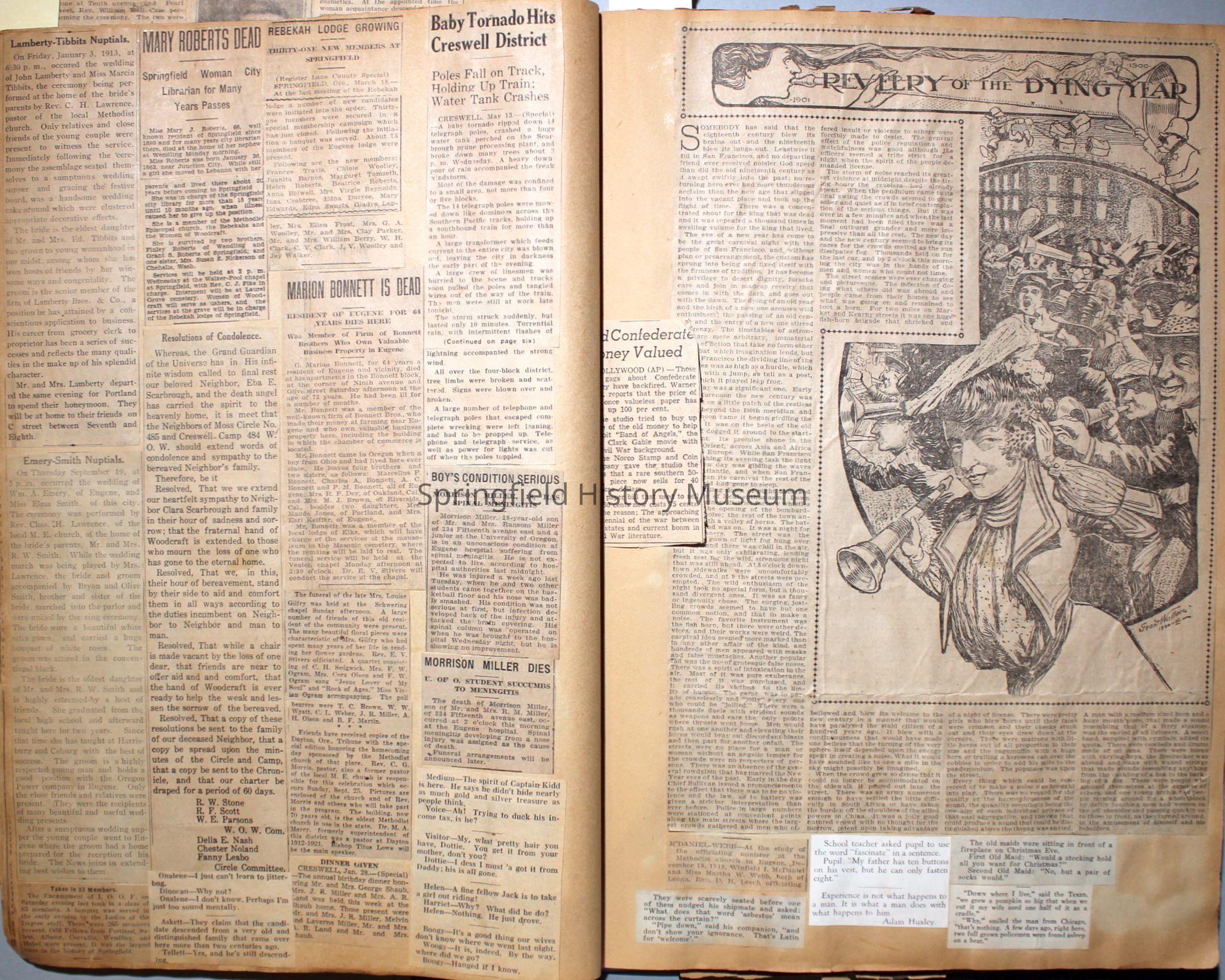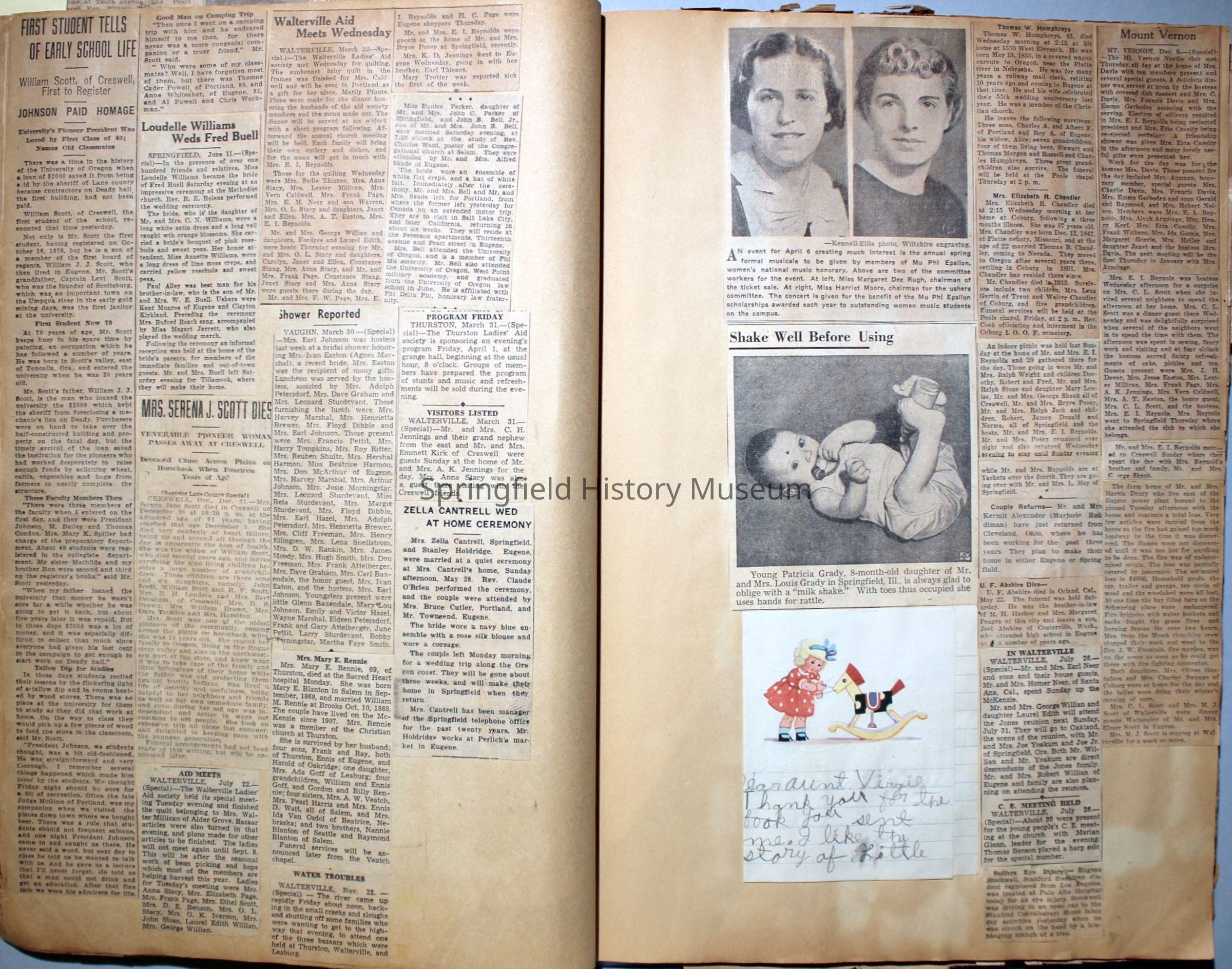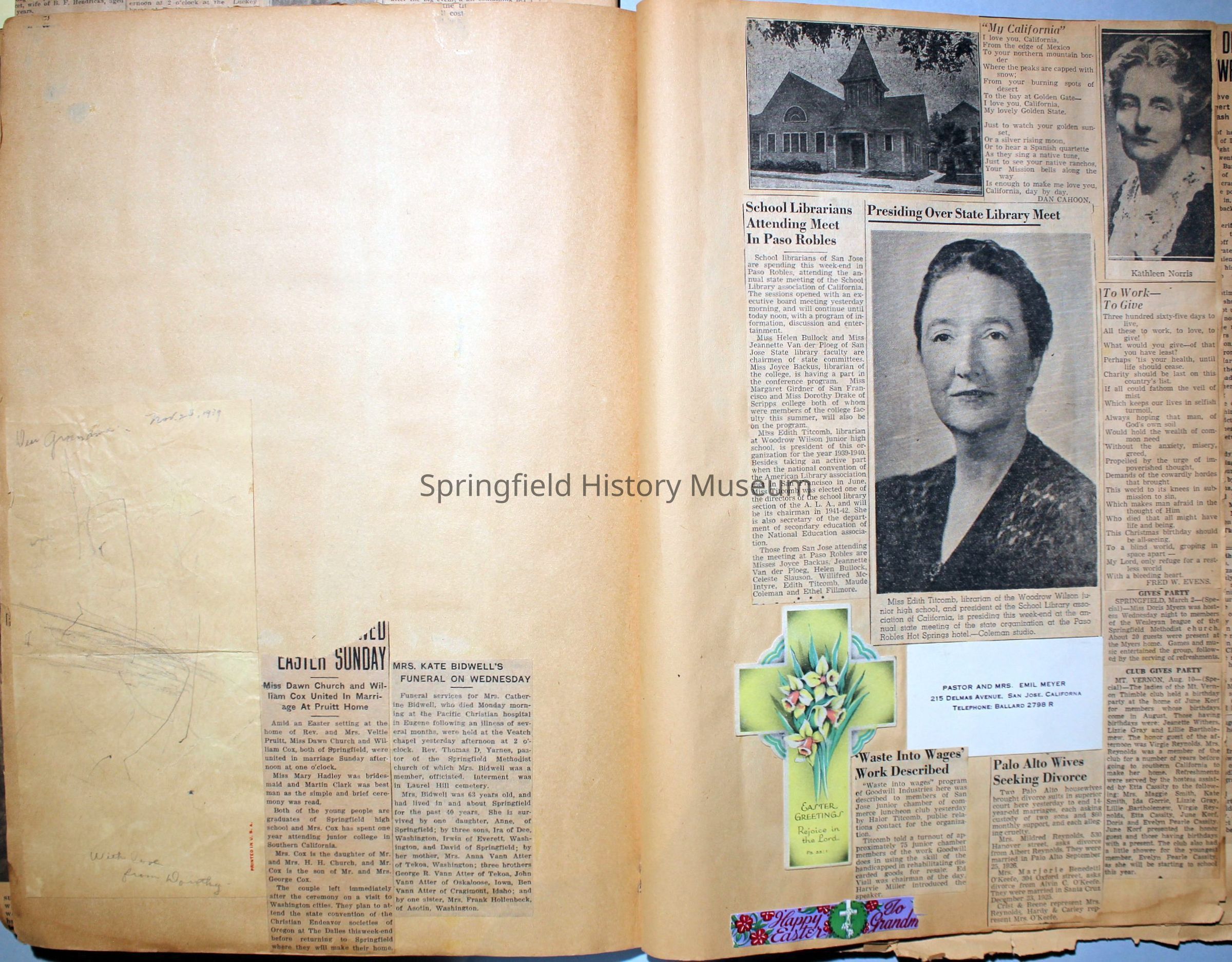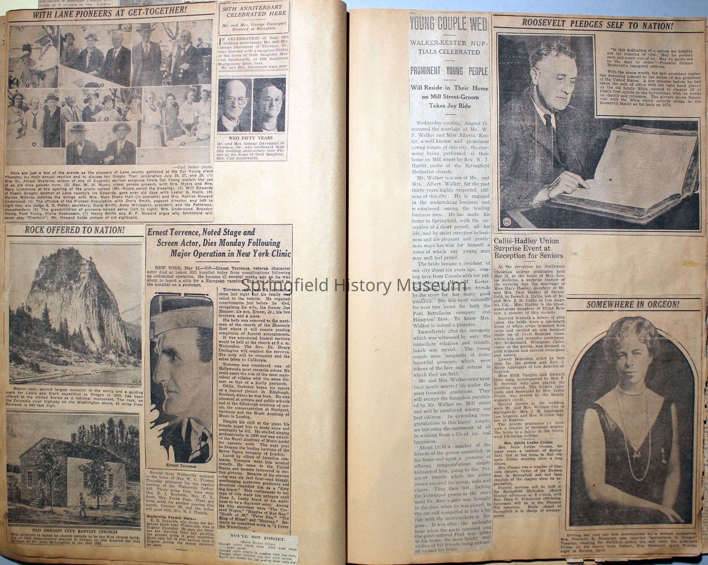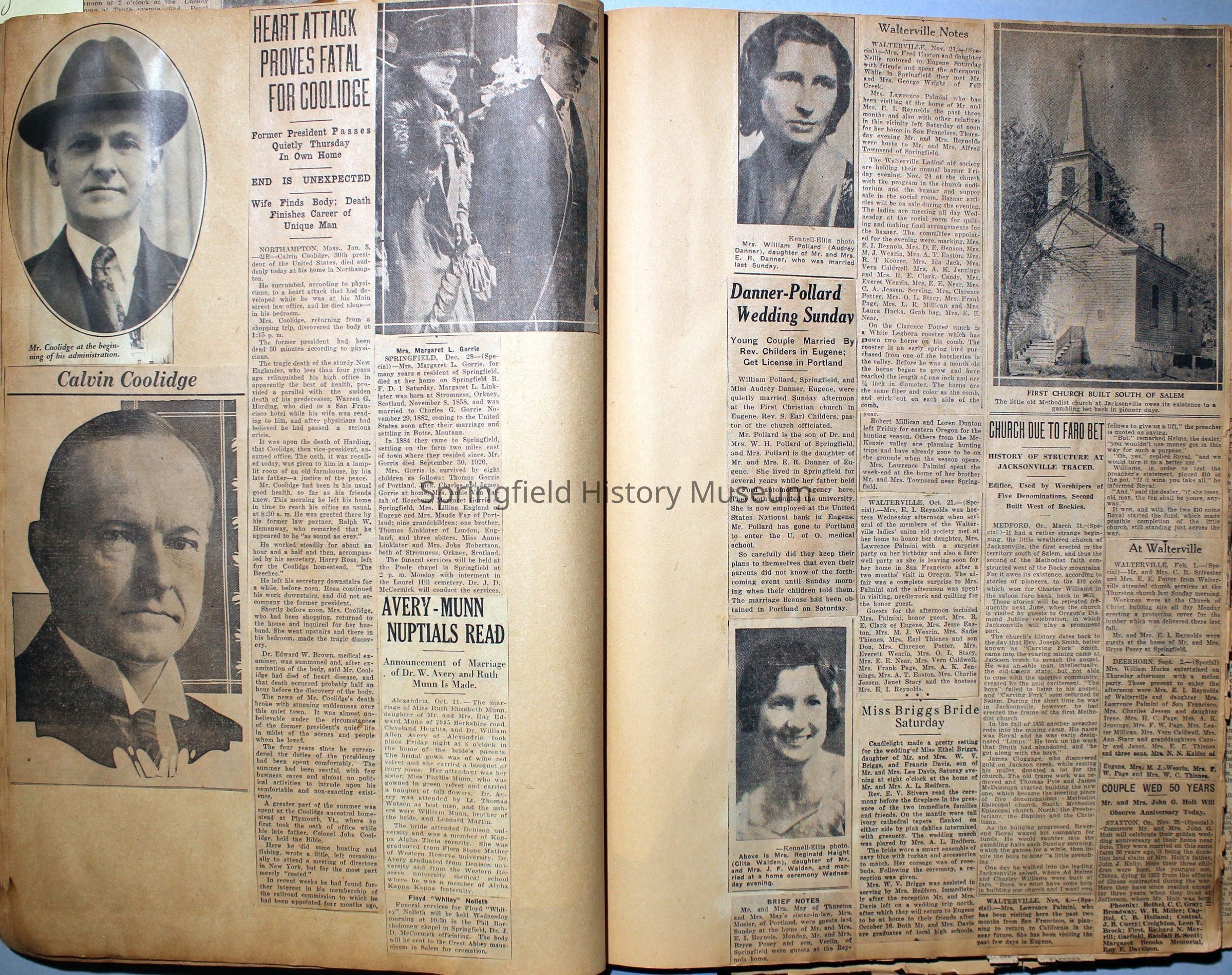 Cover reads: "Scrapbook for Pictures." Paperback scrapbook; newspaper clippings about local news, families and friends, advertisements, as well as letters and drawings from children and other relatives; dates from 1920 through 1940.Collection