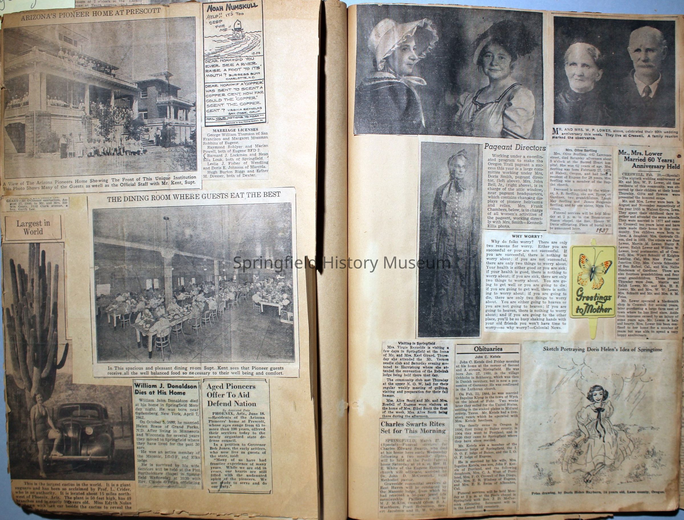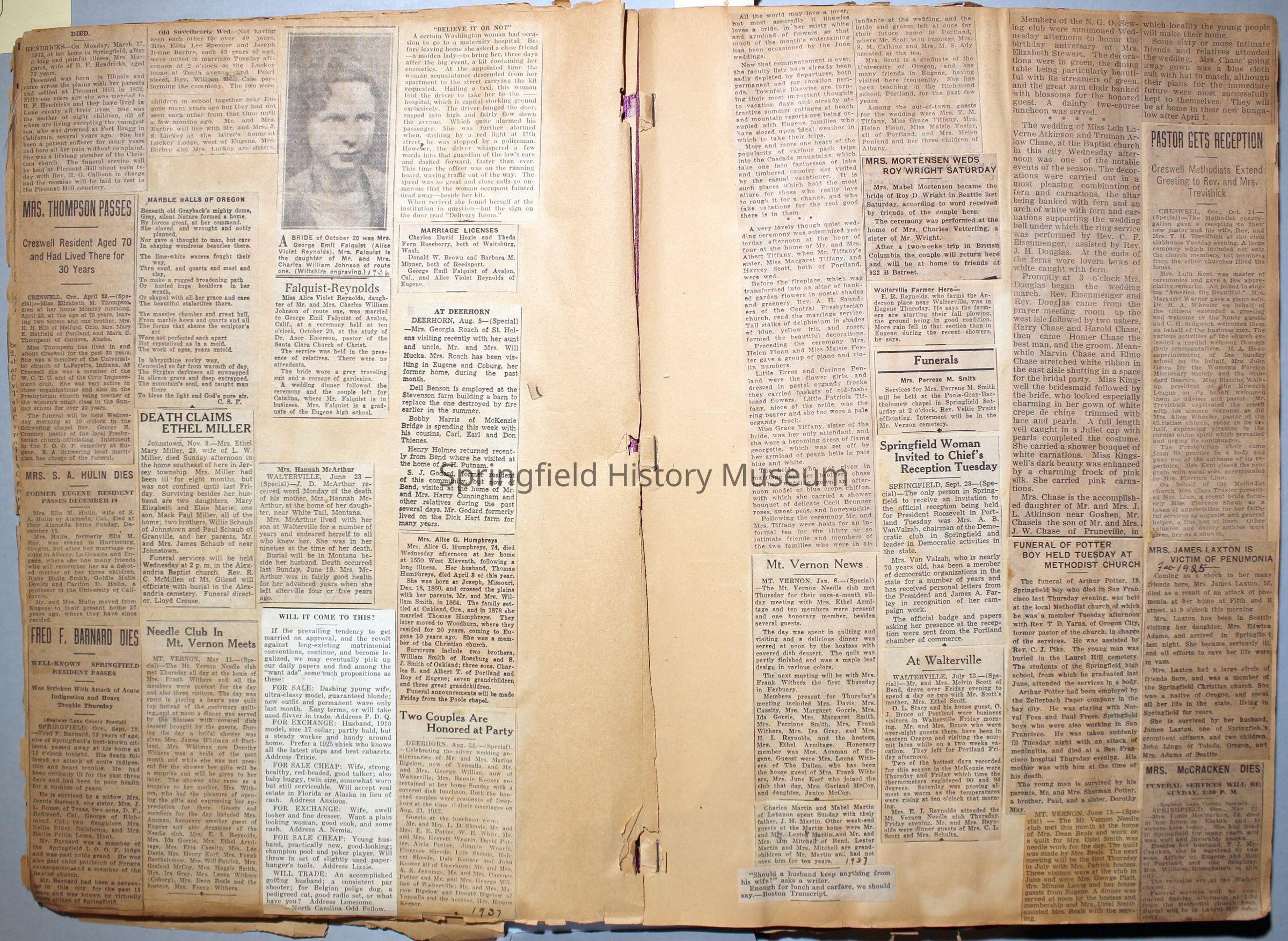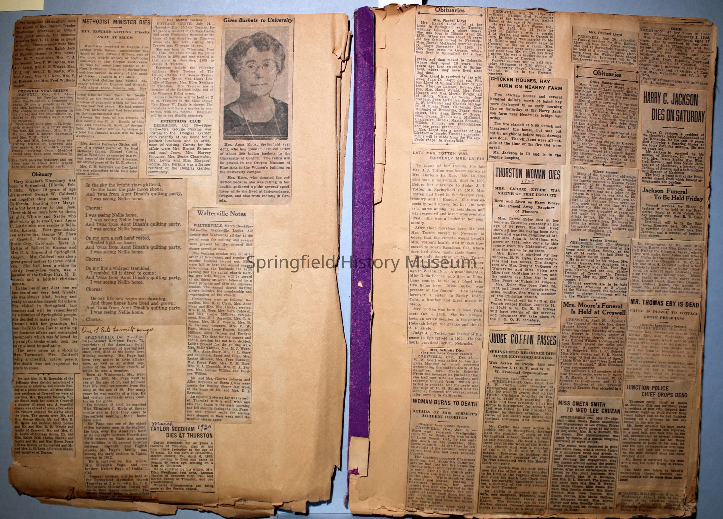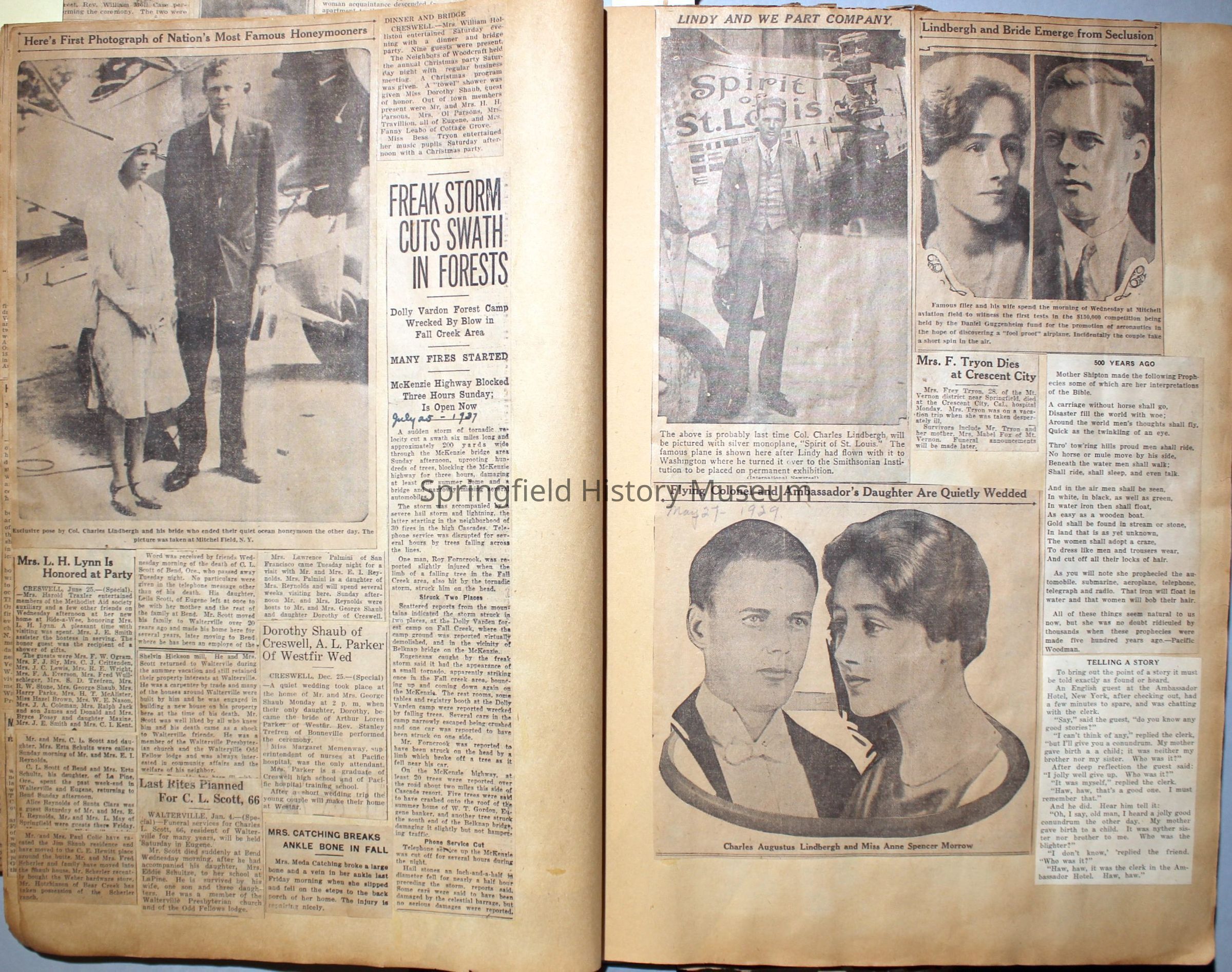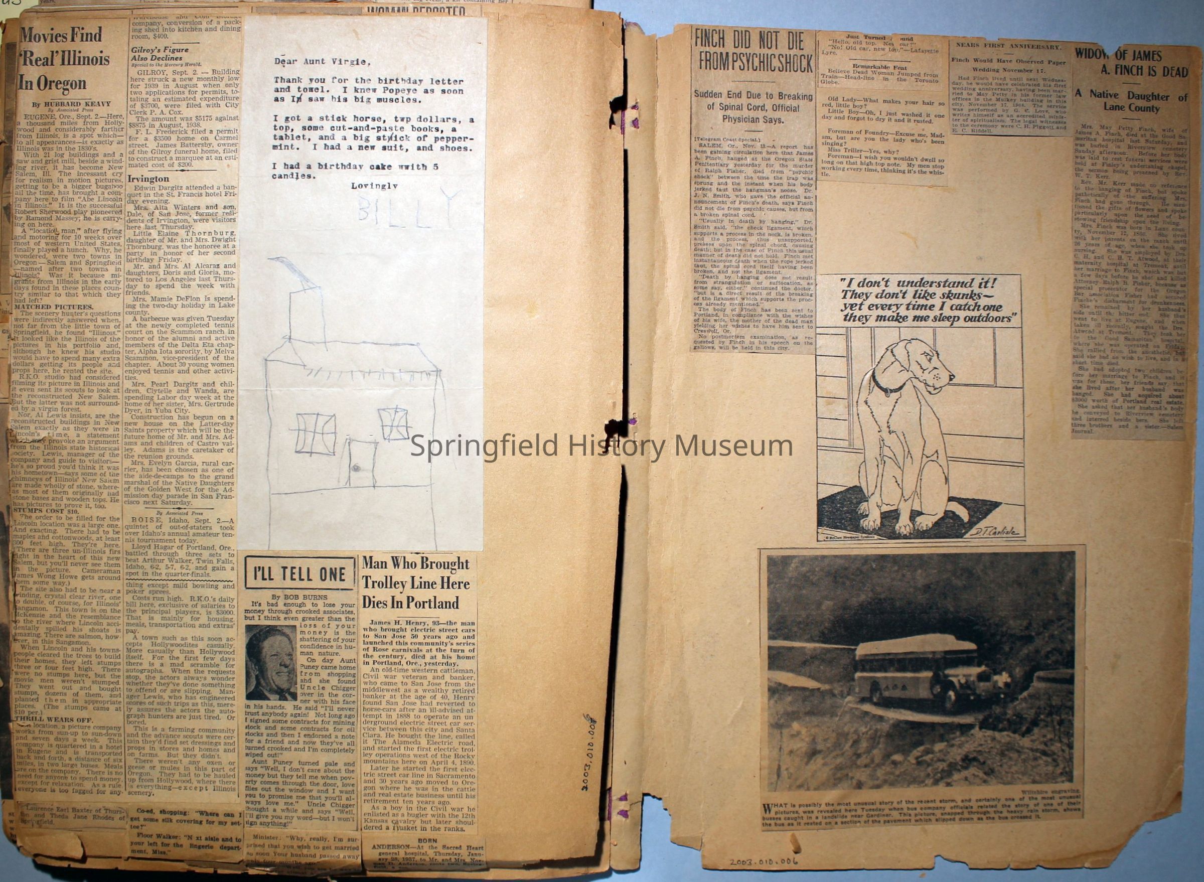 Cover reads: "Scrapbook for Pictures." Paperback scrapbook; newspaper clippings about local news, families and friends, advertisements, as well as letters and drawings from children and other relatives; dates from 1920 through 1940.Collection