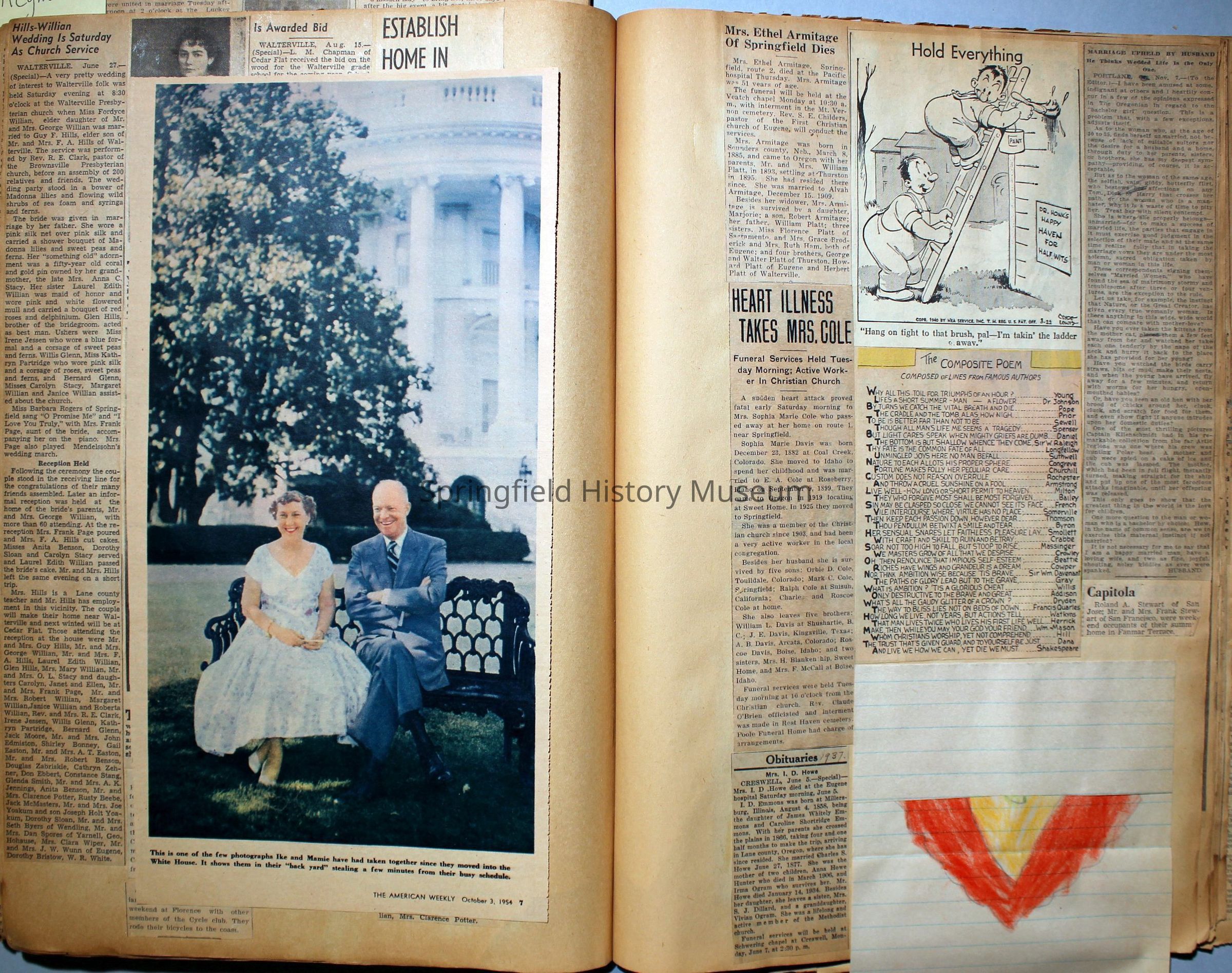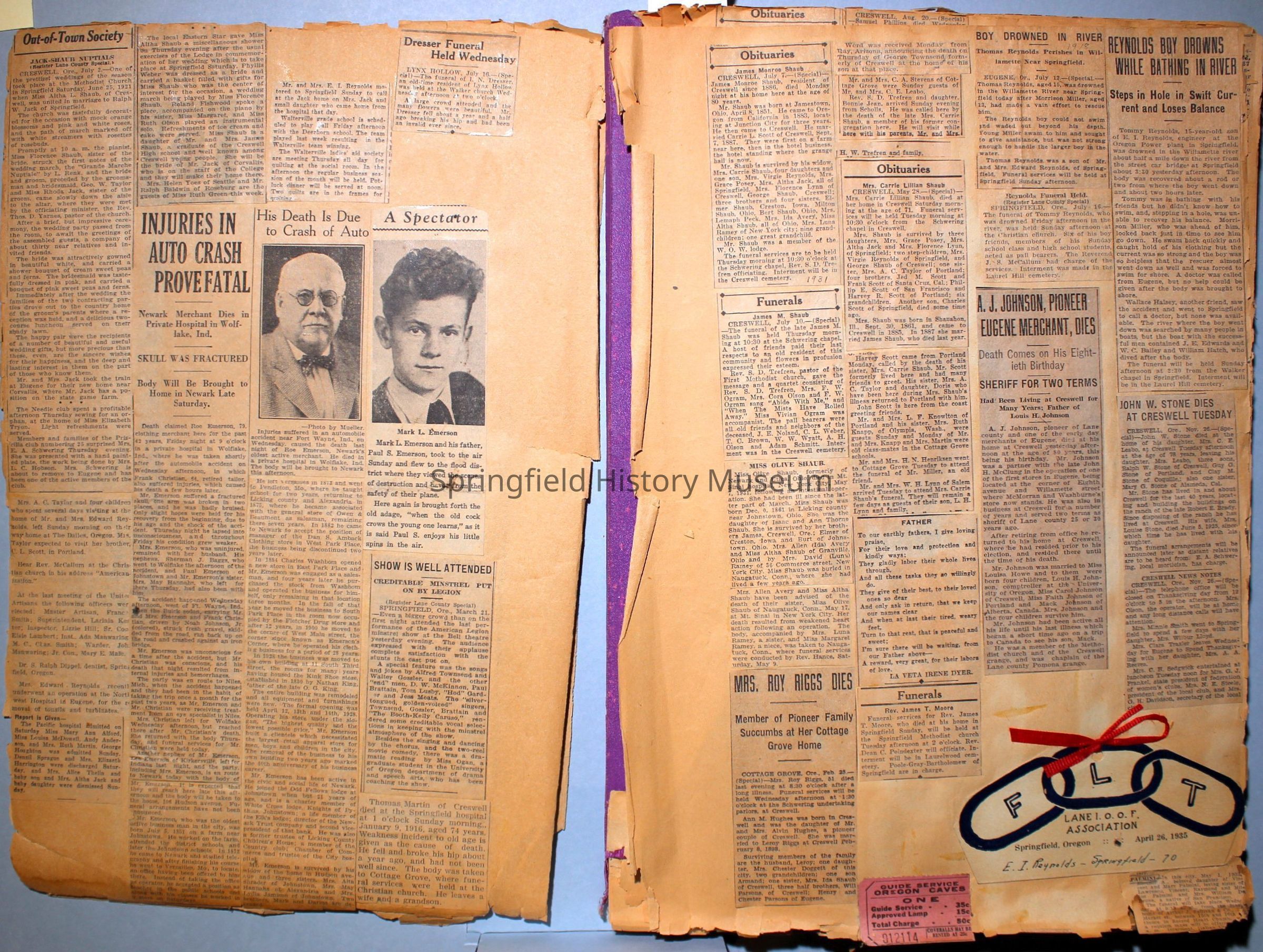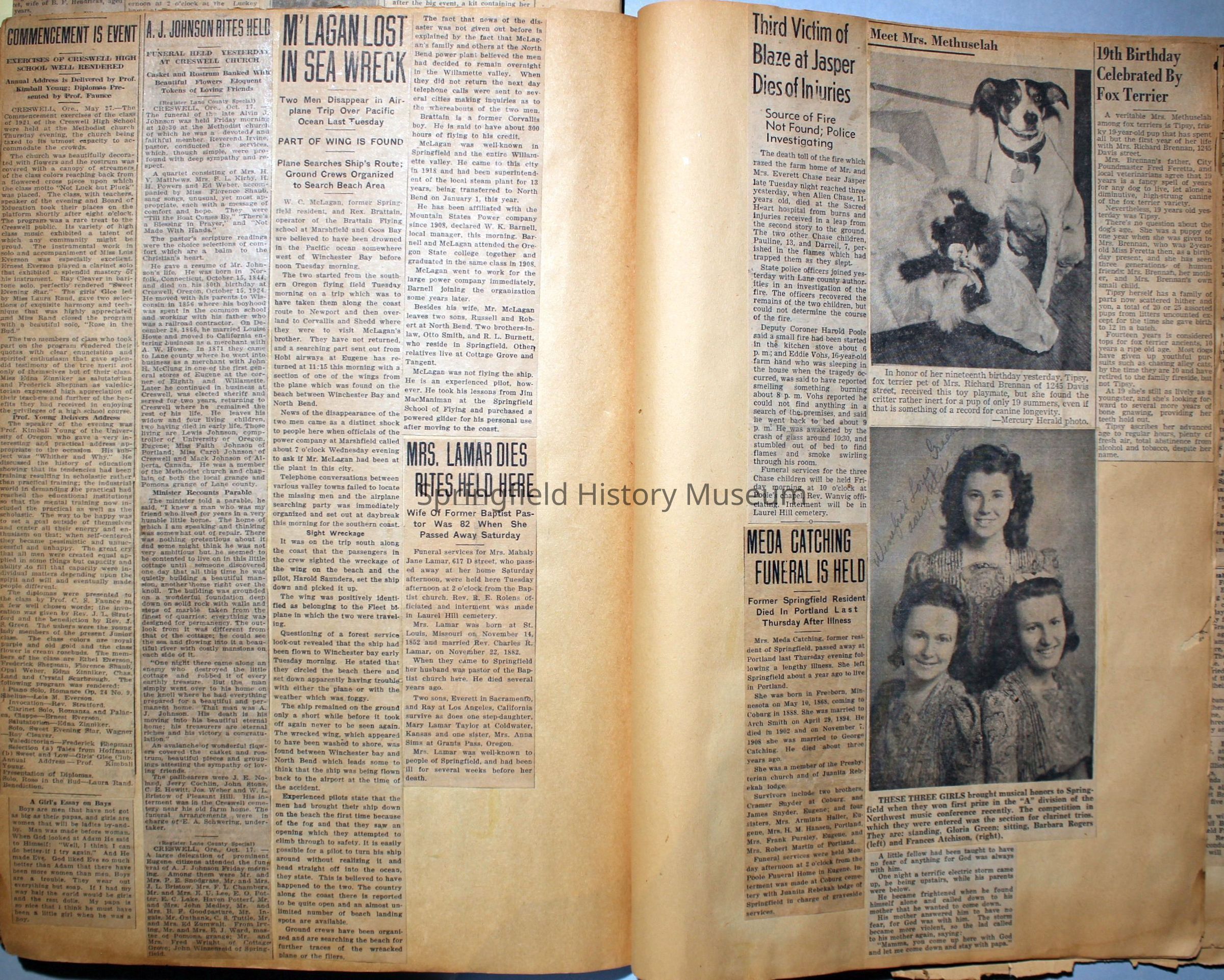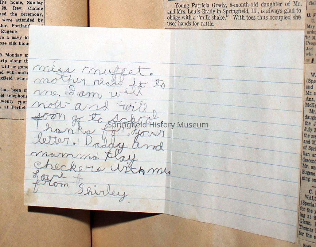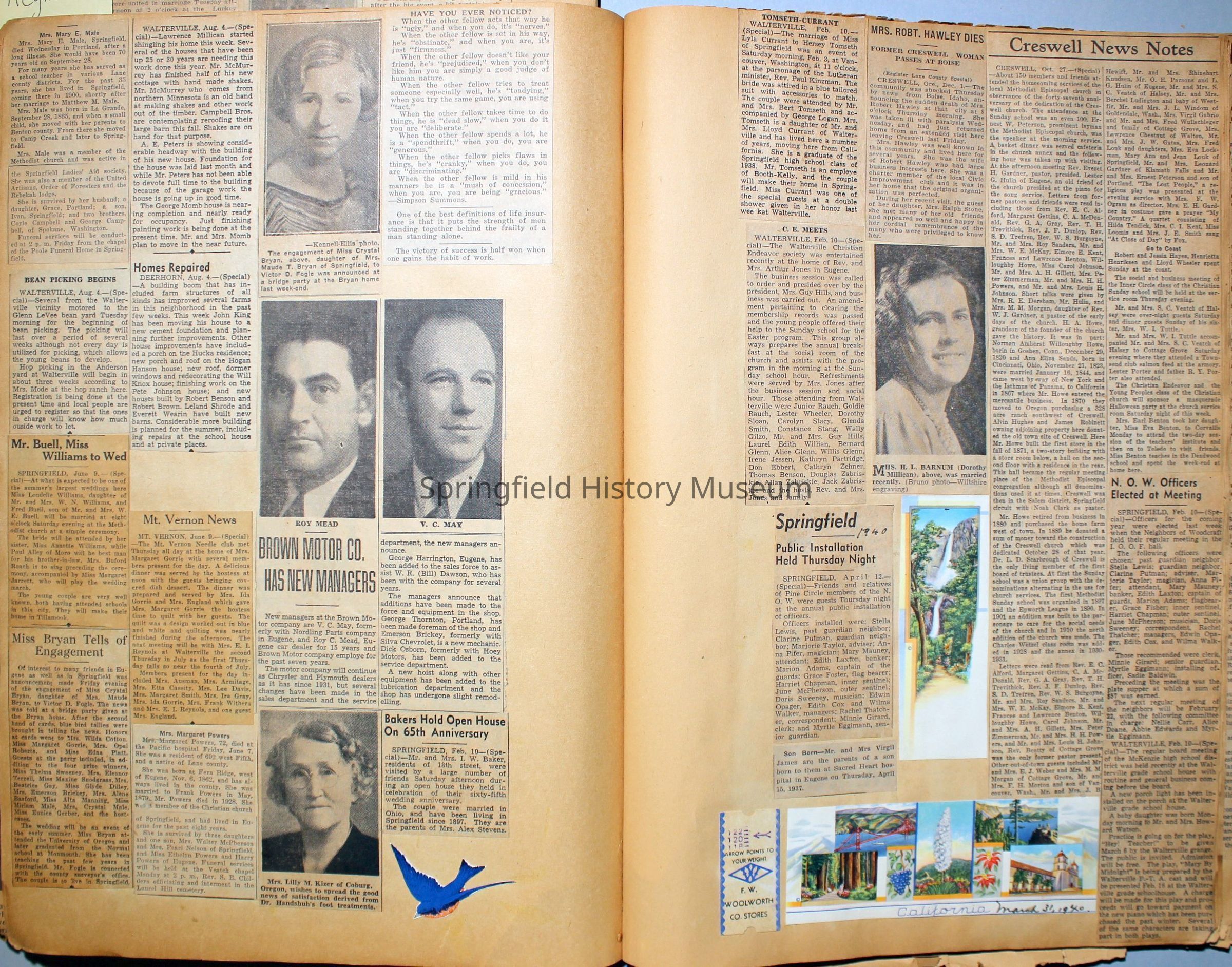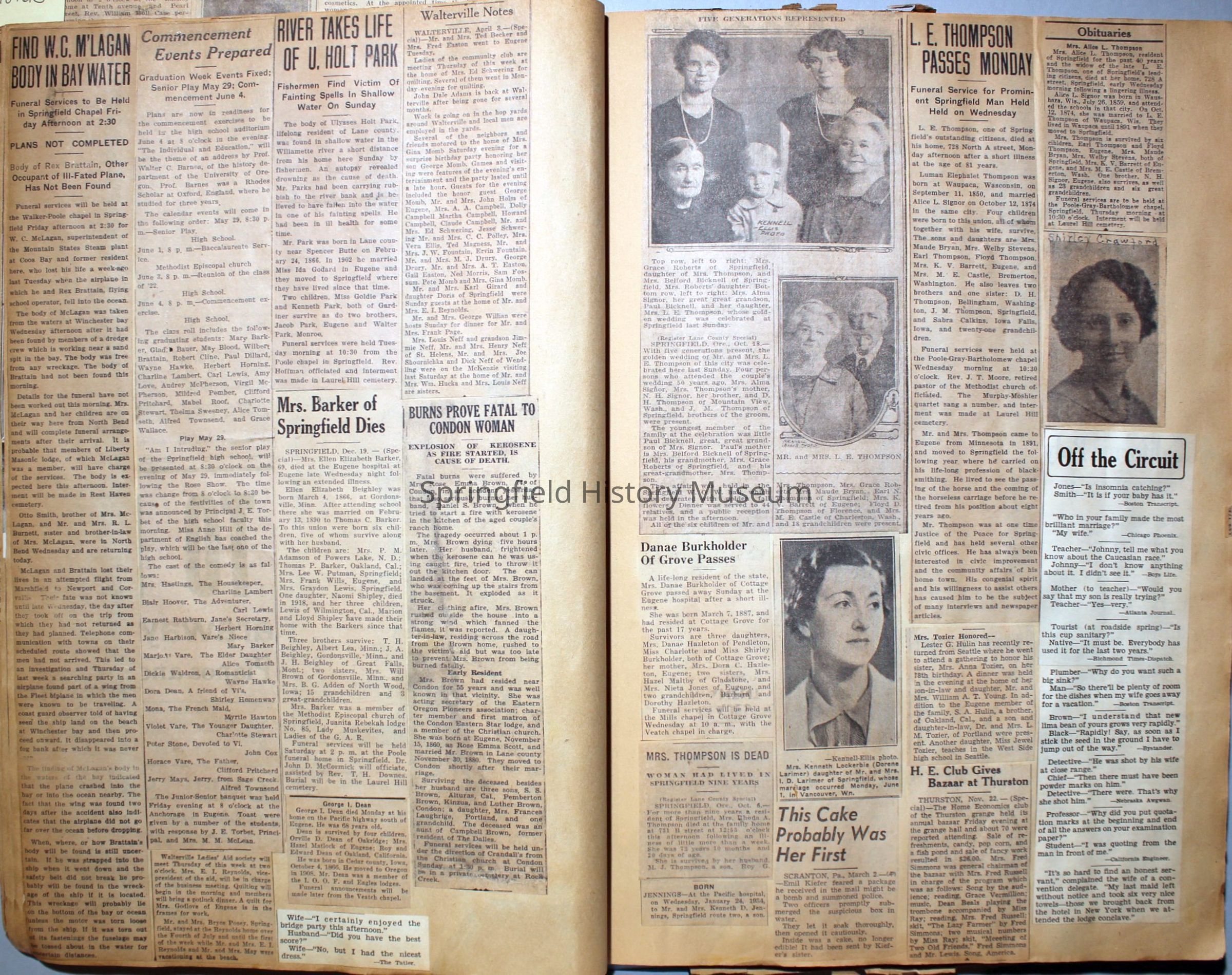 Cover reads: "Scrapbook for Pictures." Paperback scrapbook; newspaper clippings about local news, families and friends, advertisements, as well as letters and drawings from children and other relatives; dates from 1920 through 1940.Collection