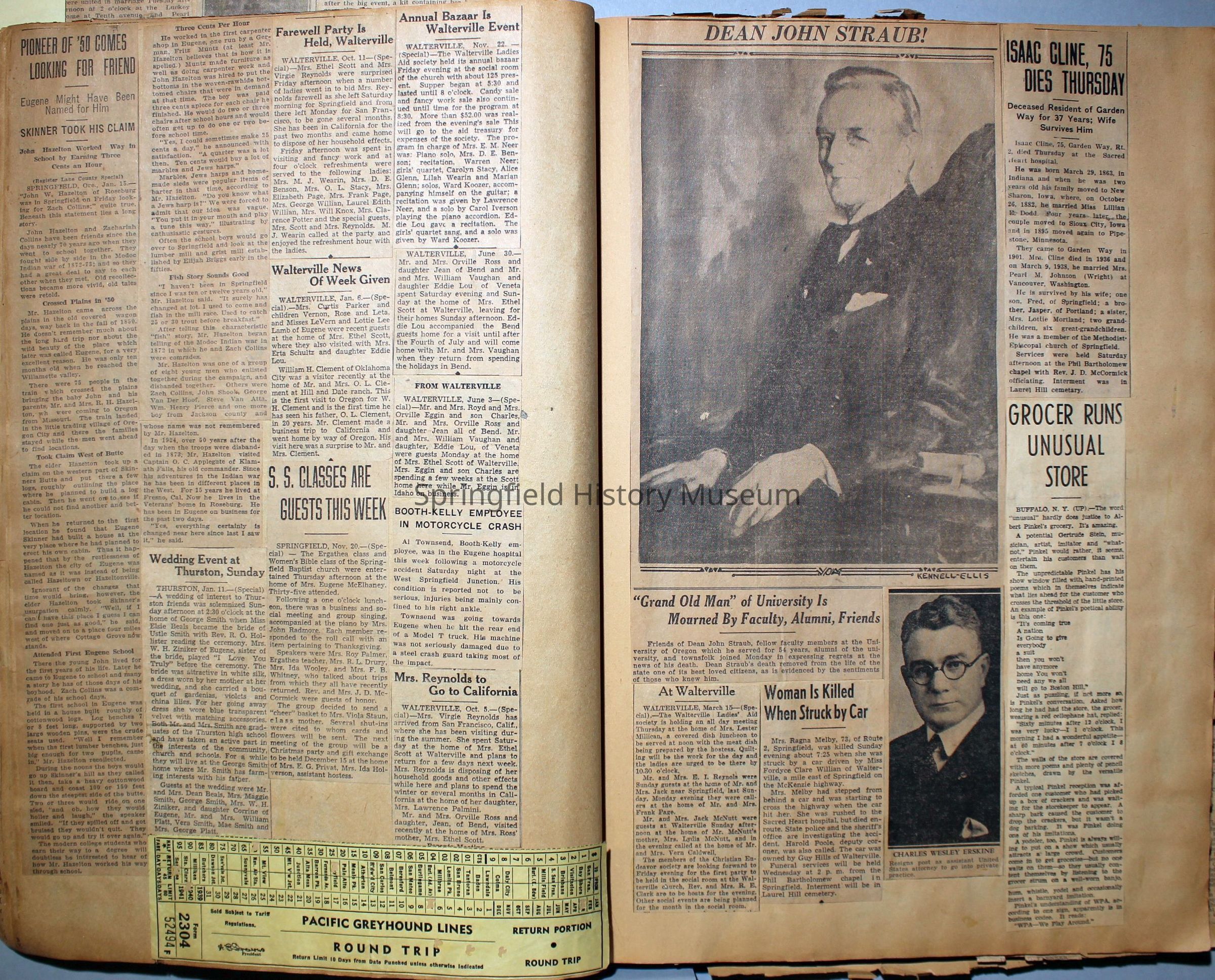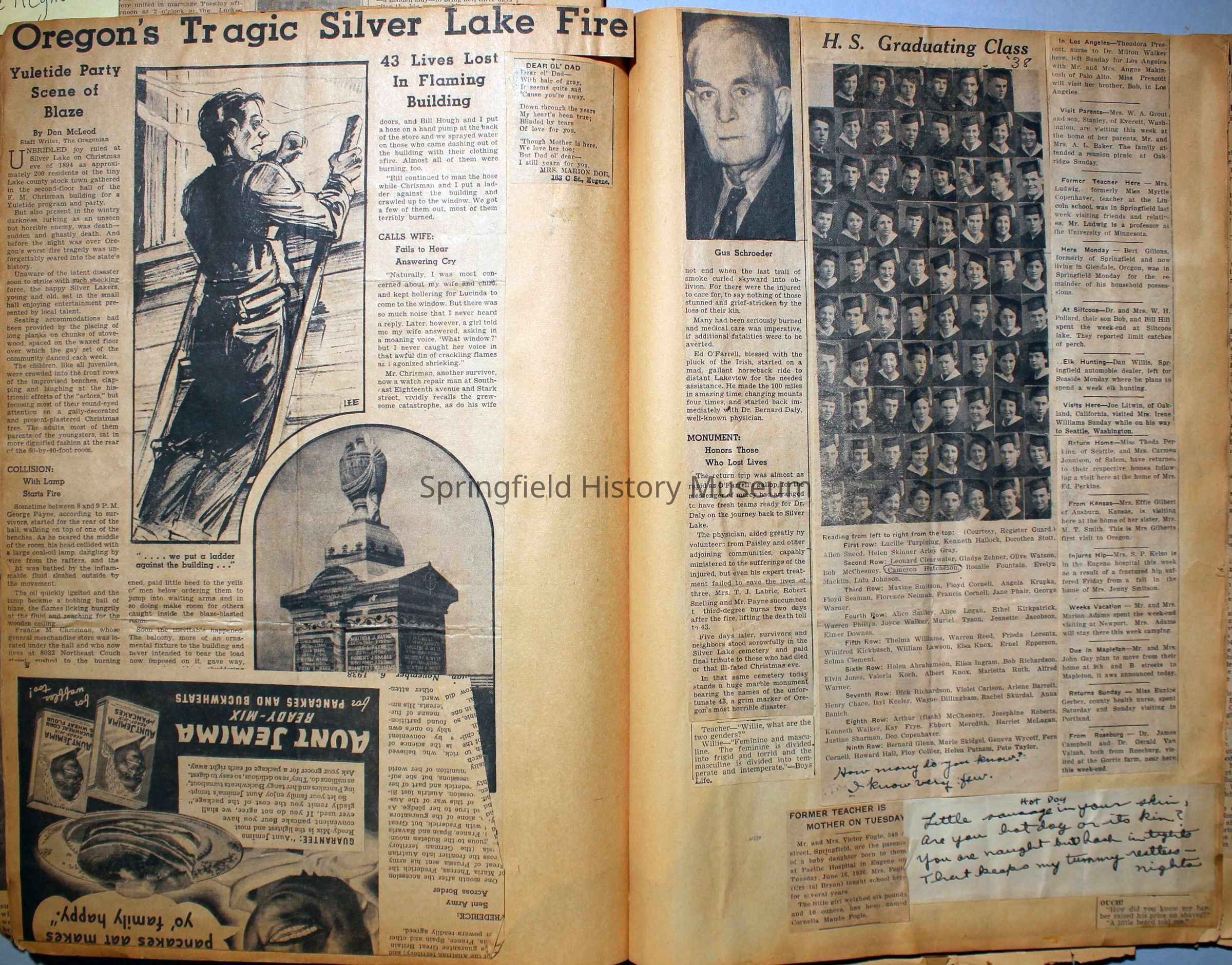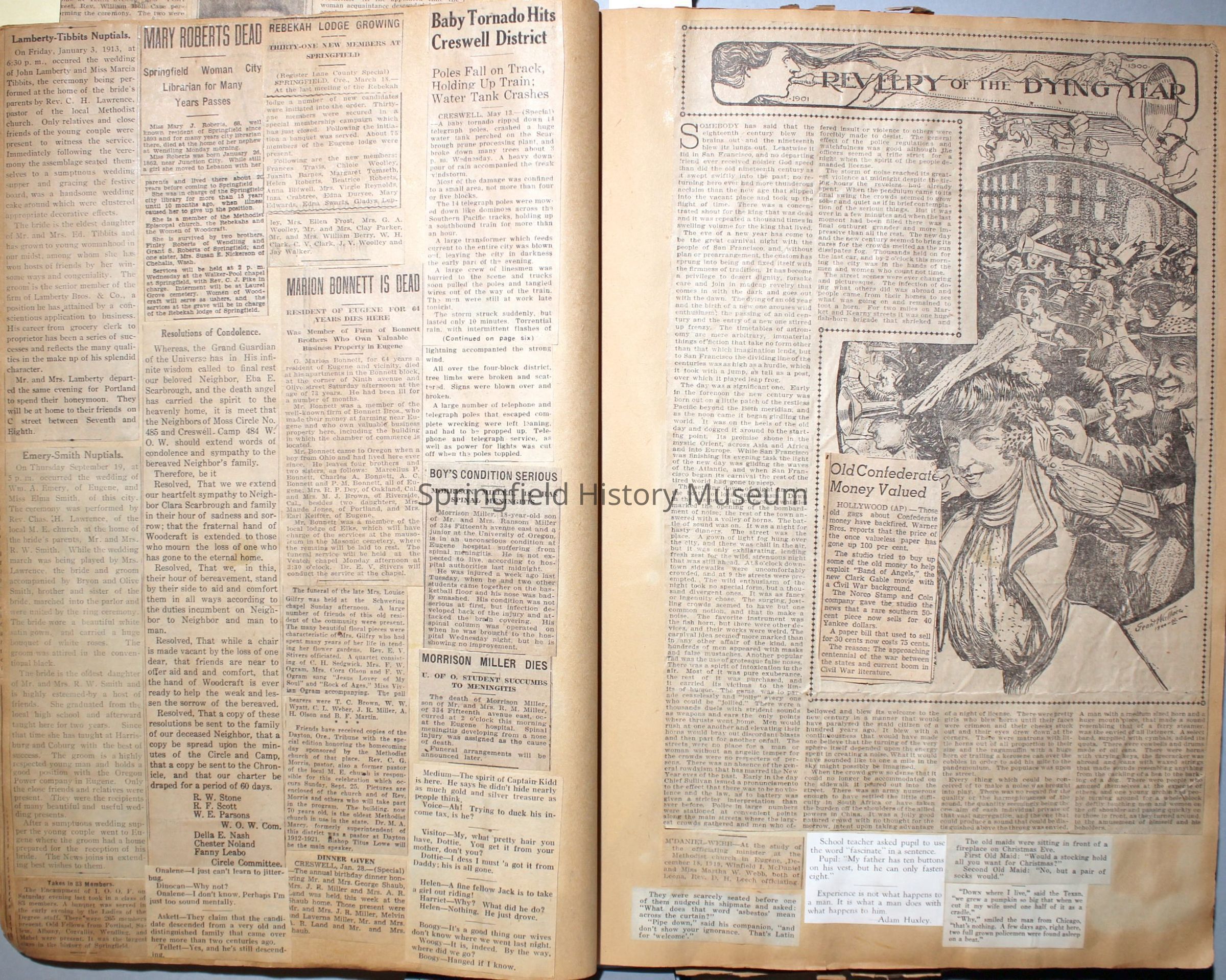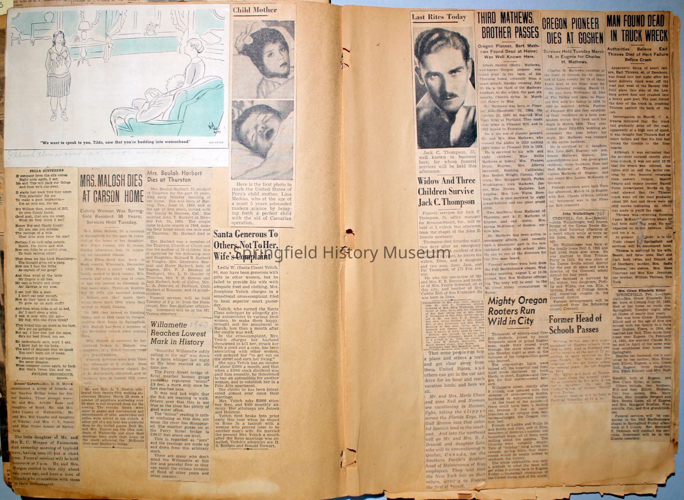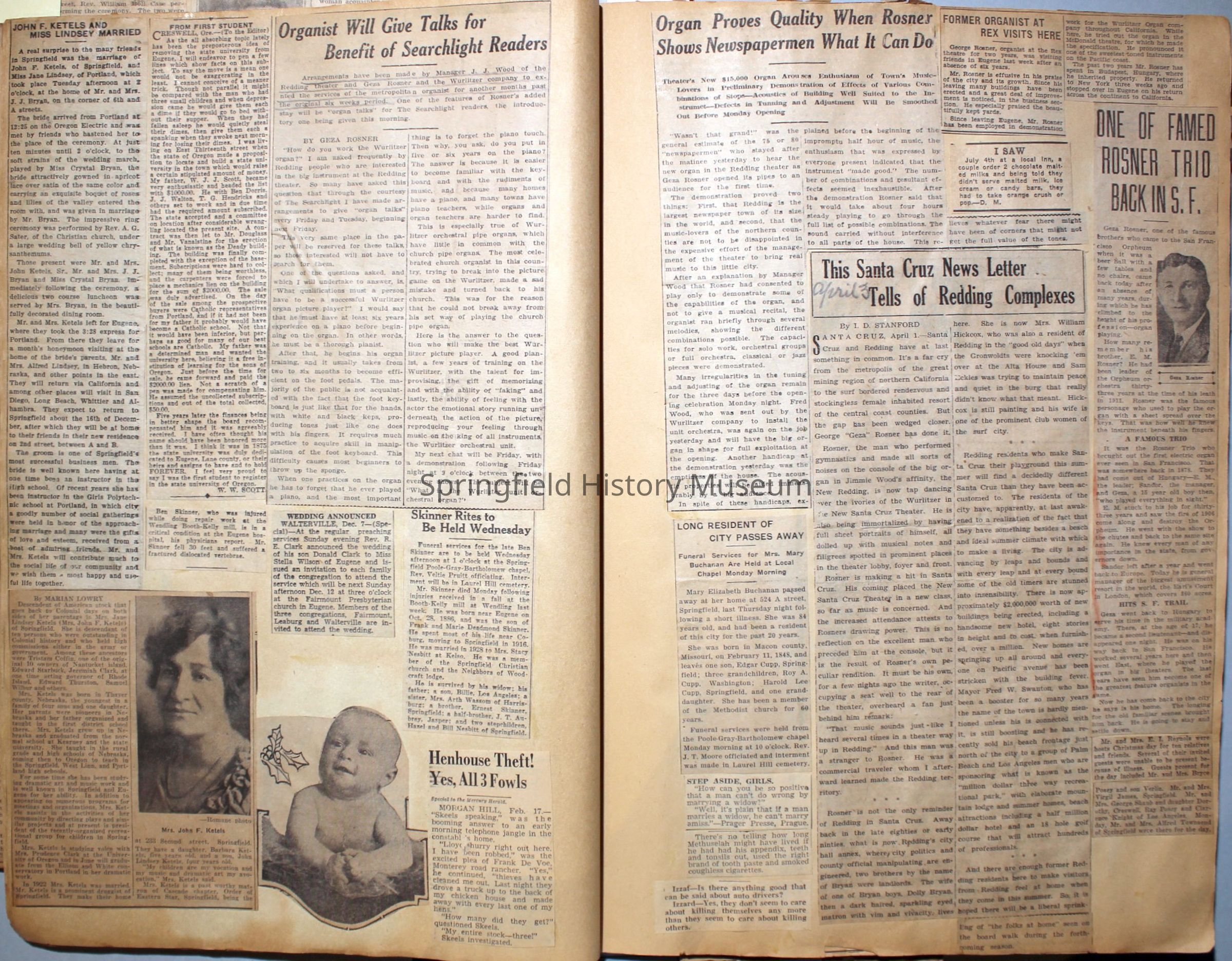 Cover reads: "Scrapbook for Pictures." Paperback scrapbook; newspaper clippings about local news, families and friends, advertisements, as well as letters and drawings from children and other relatives; dates from 1920 through 1940.Collection