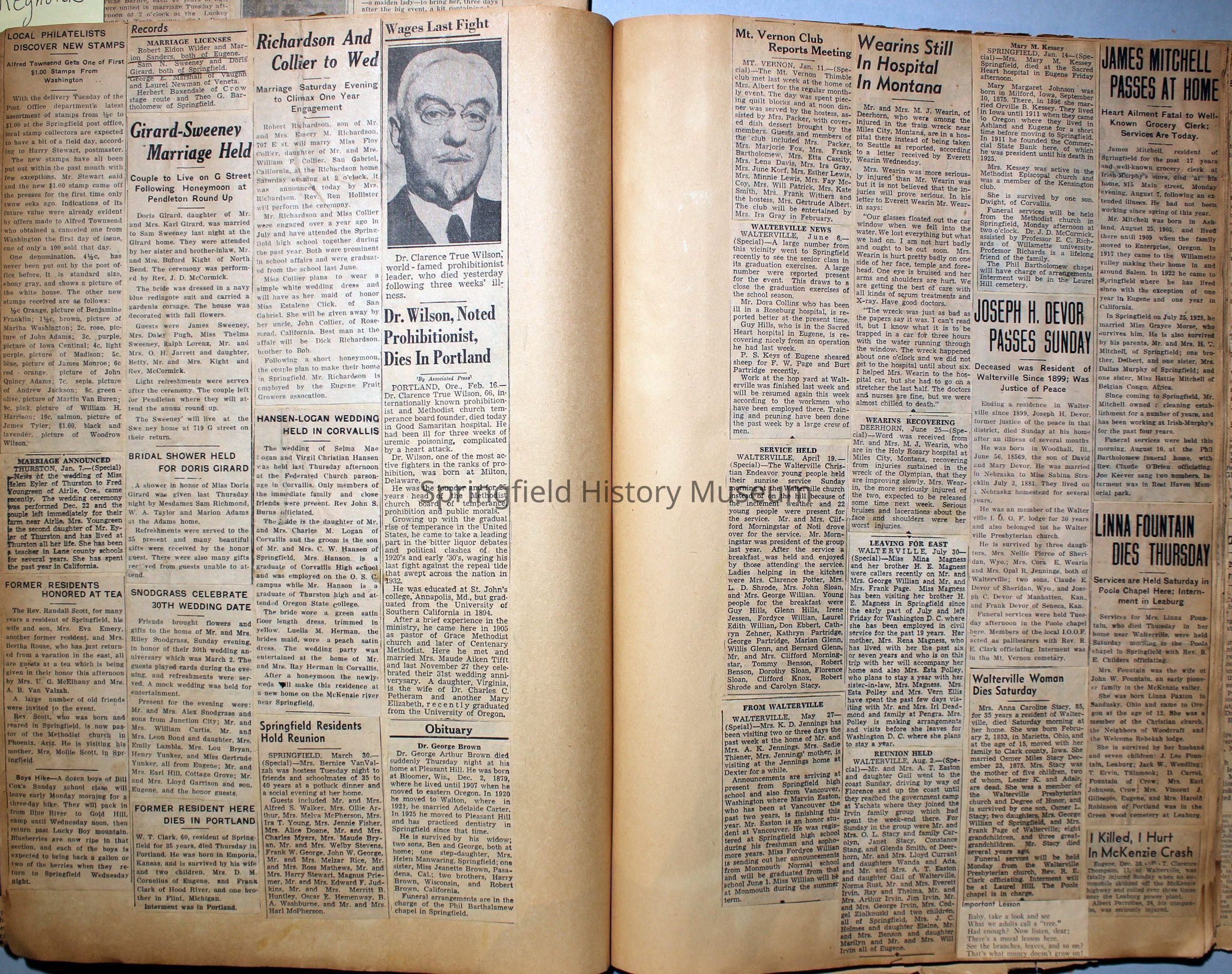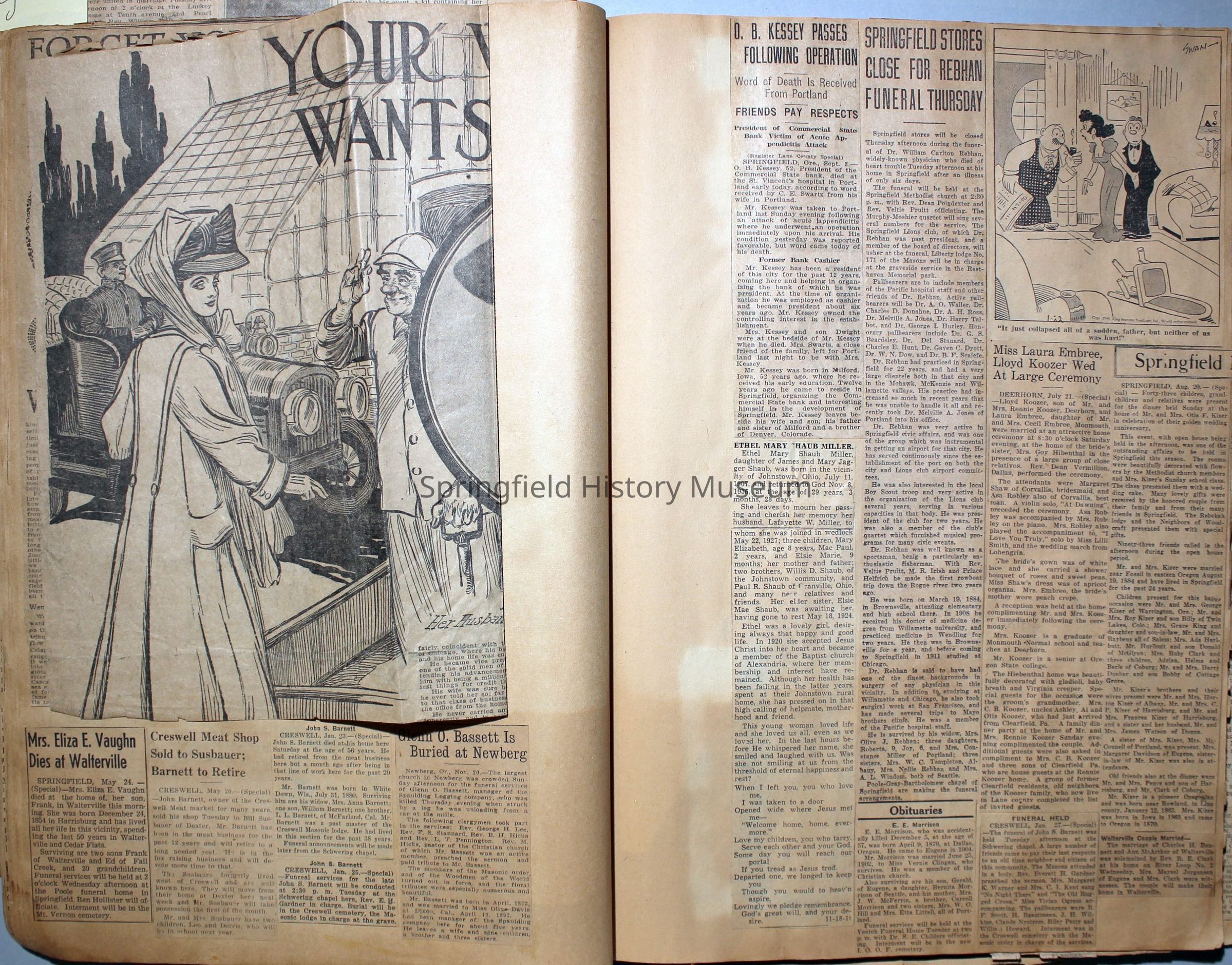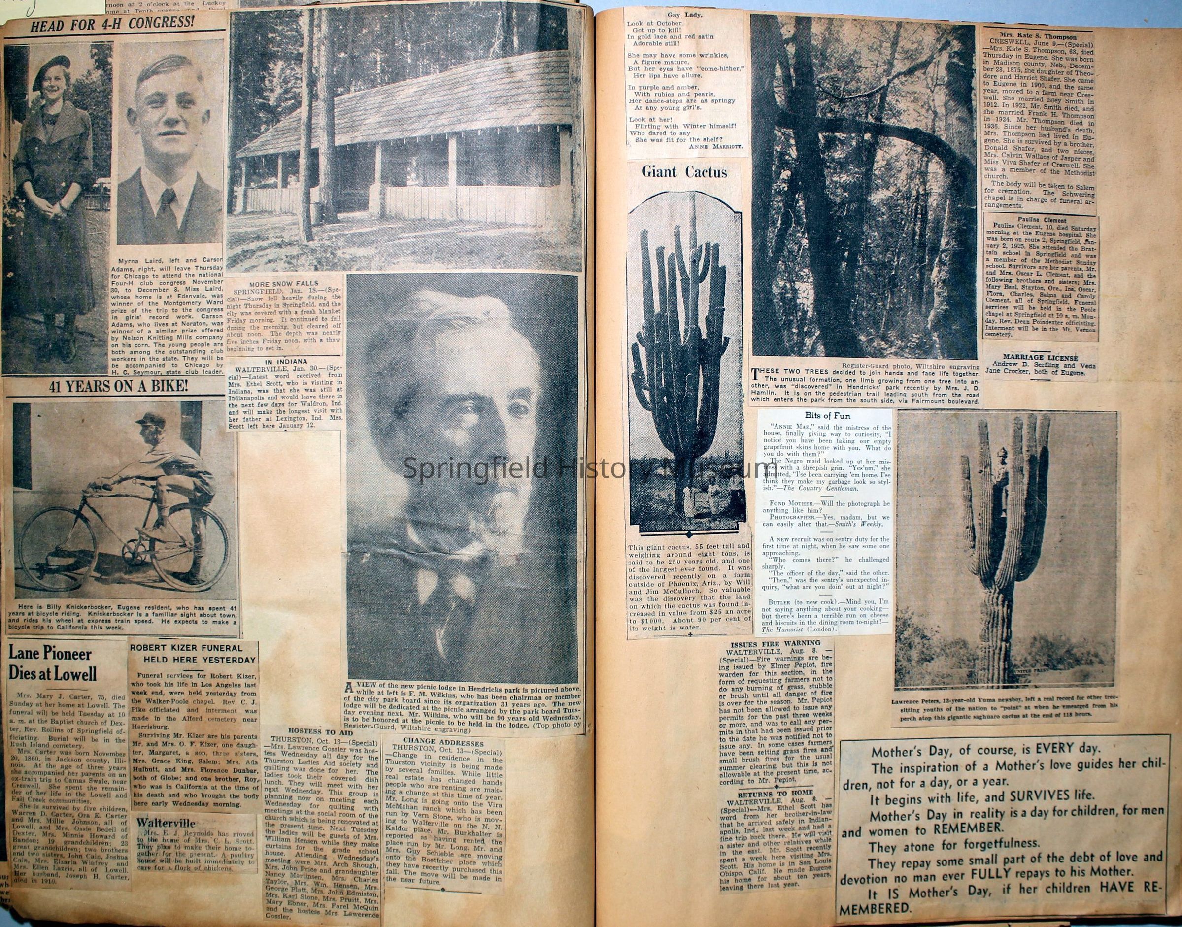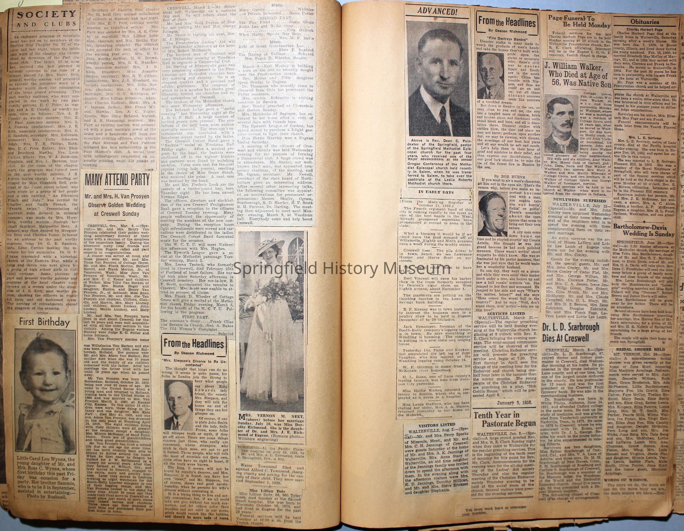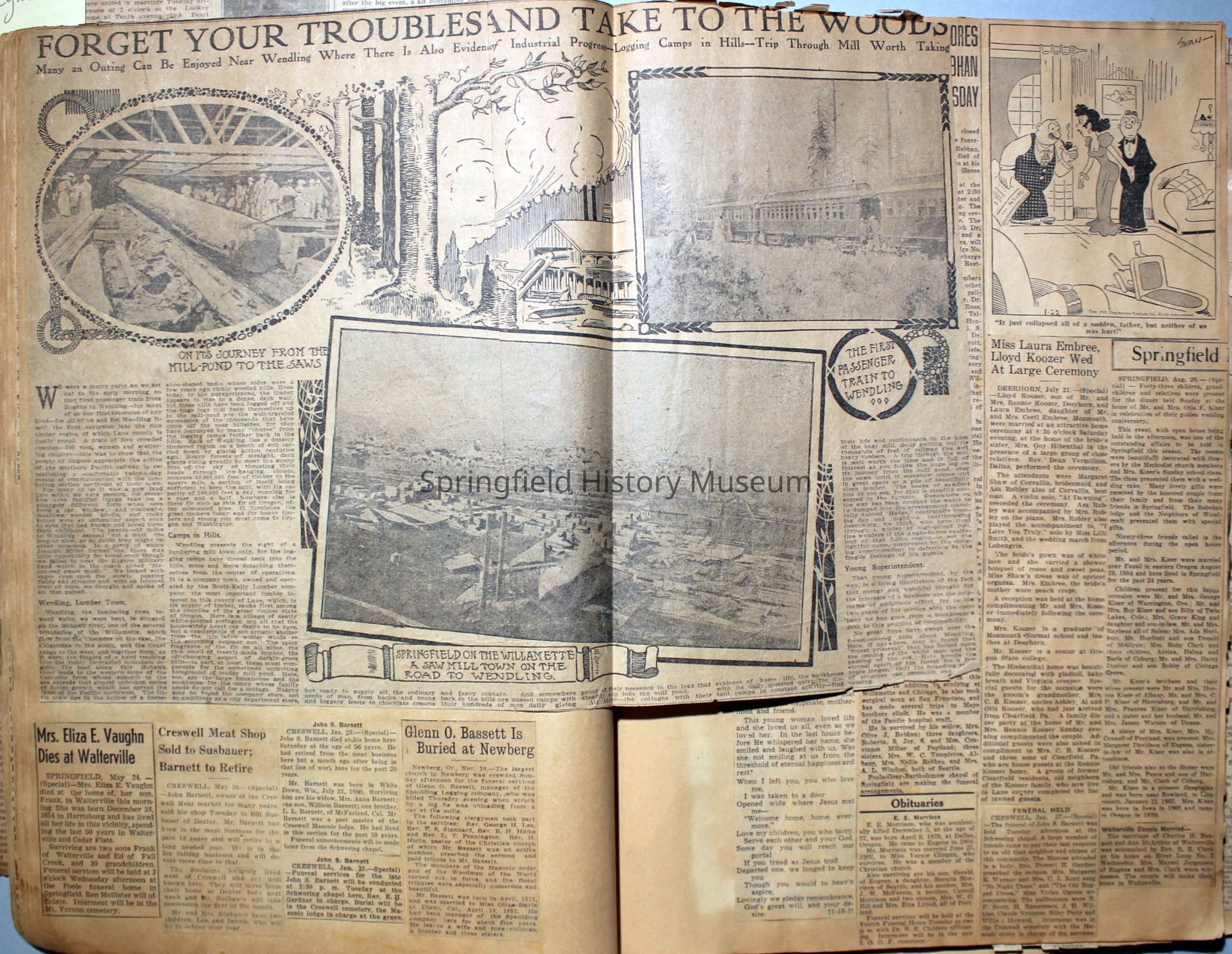 Cover reads: "Scrapbook for Pictures." Paperback scrapbook; newspaper clippings about local news, families and friends, advertisements, as well as letters and drawings from children and other relatives; dates from 1920 through 1940.Collection