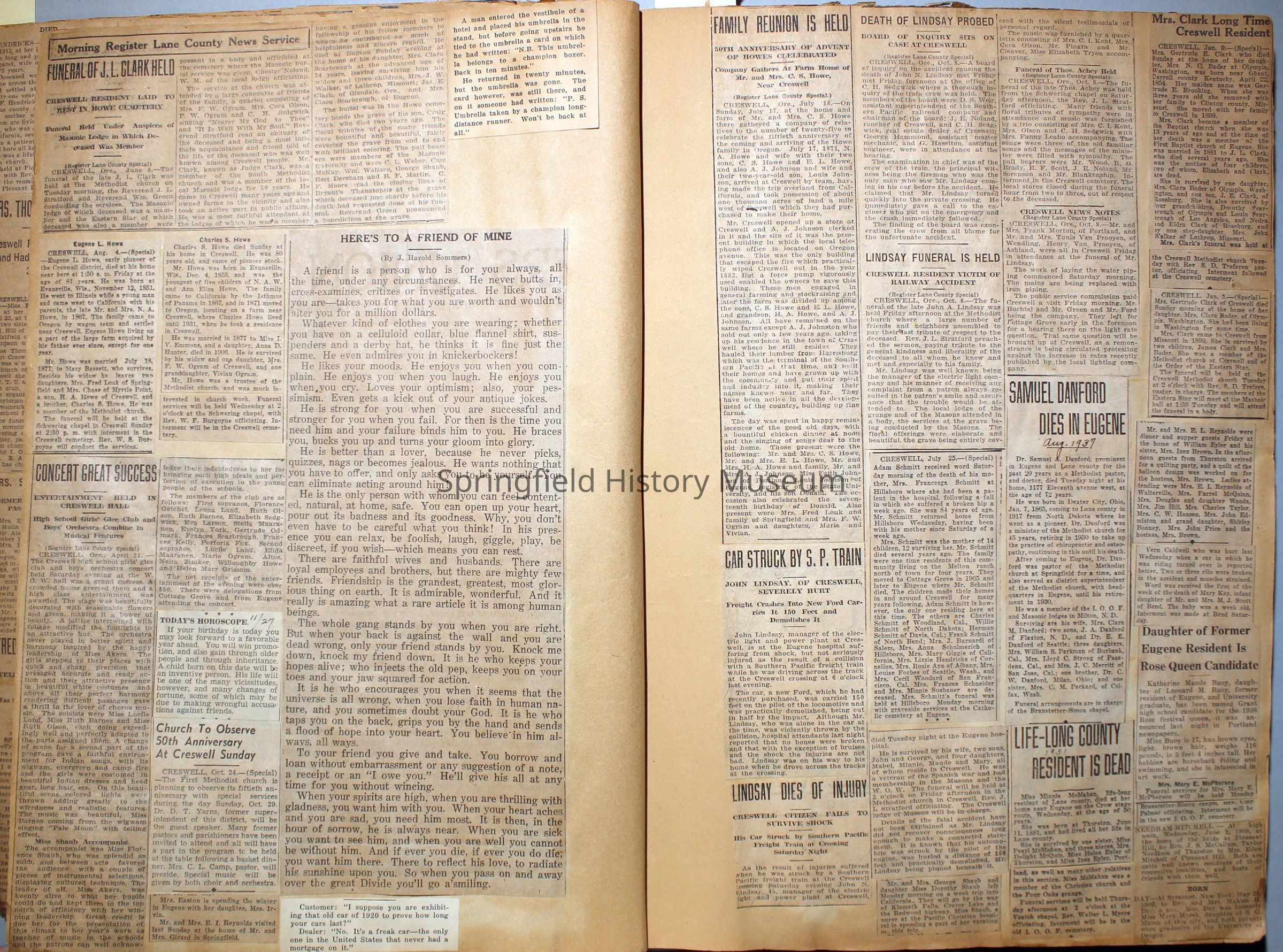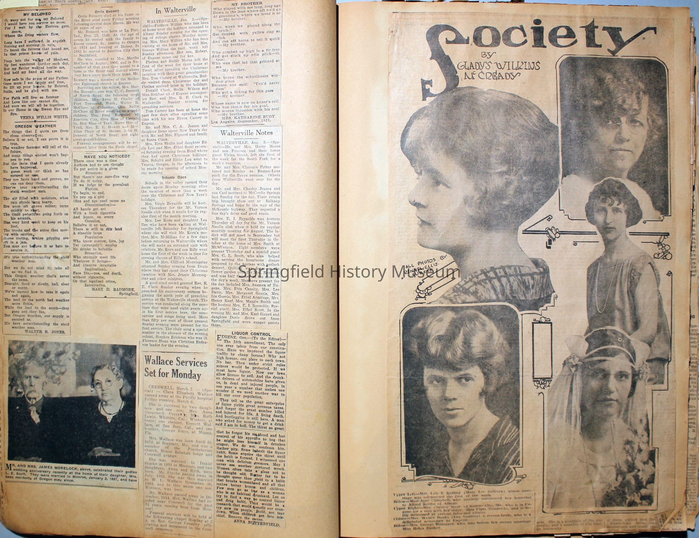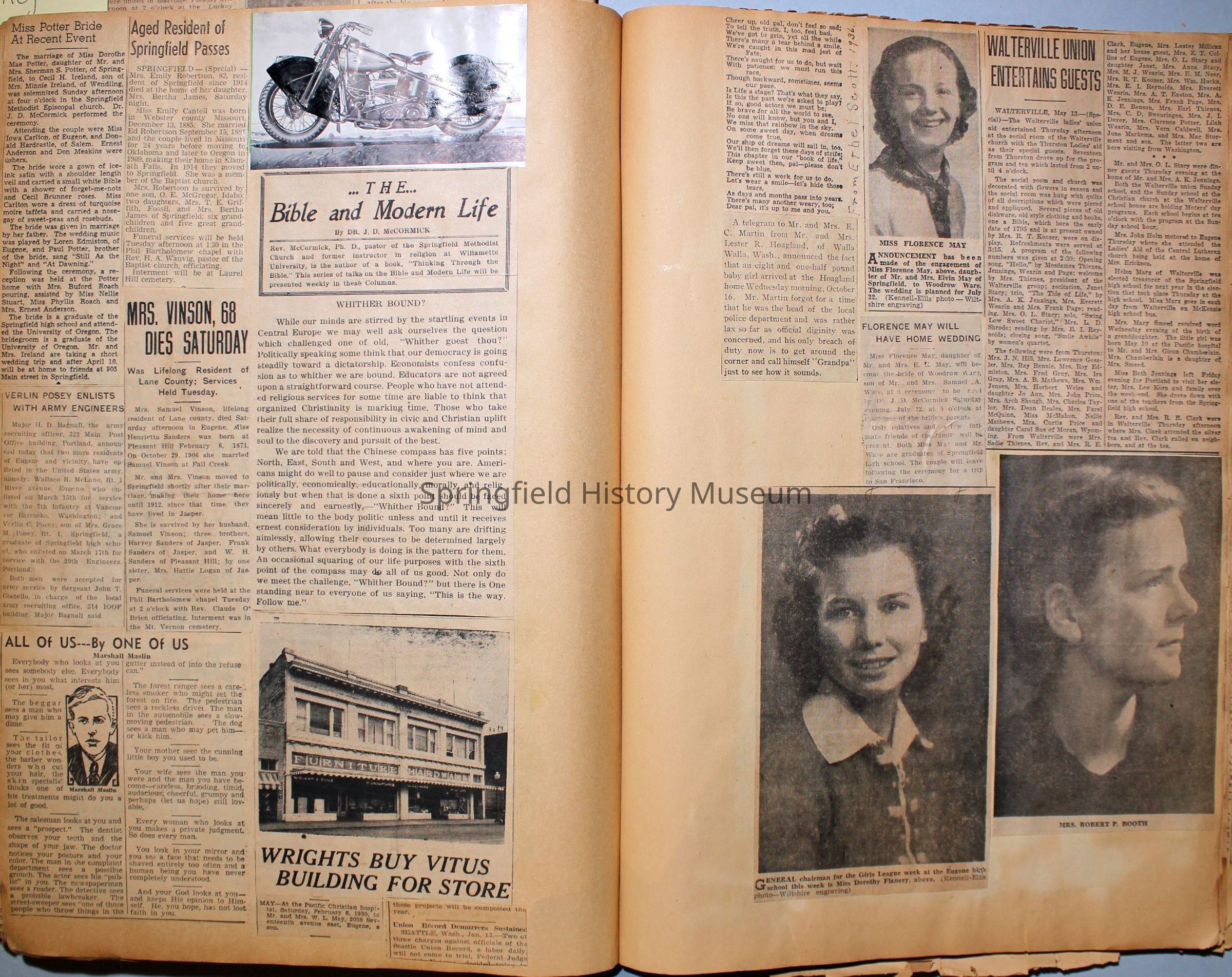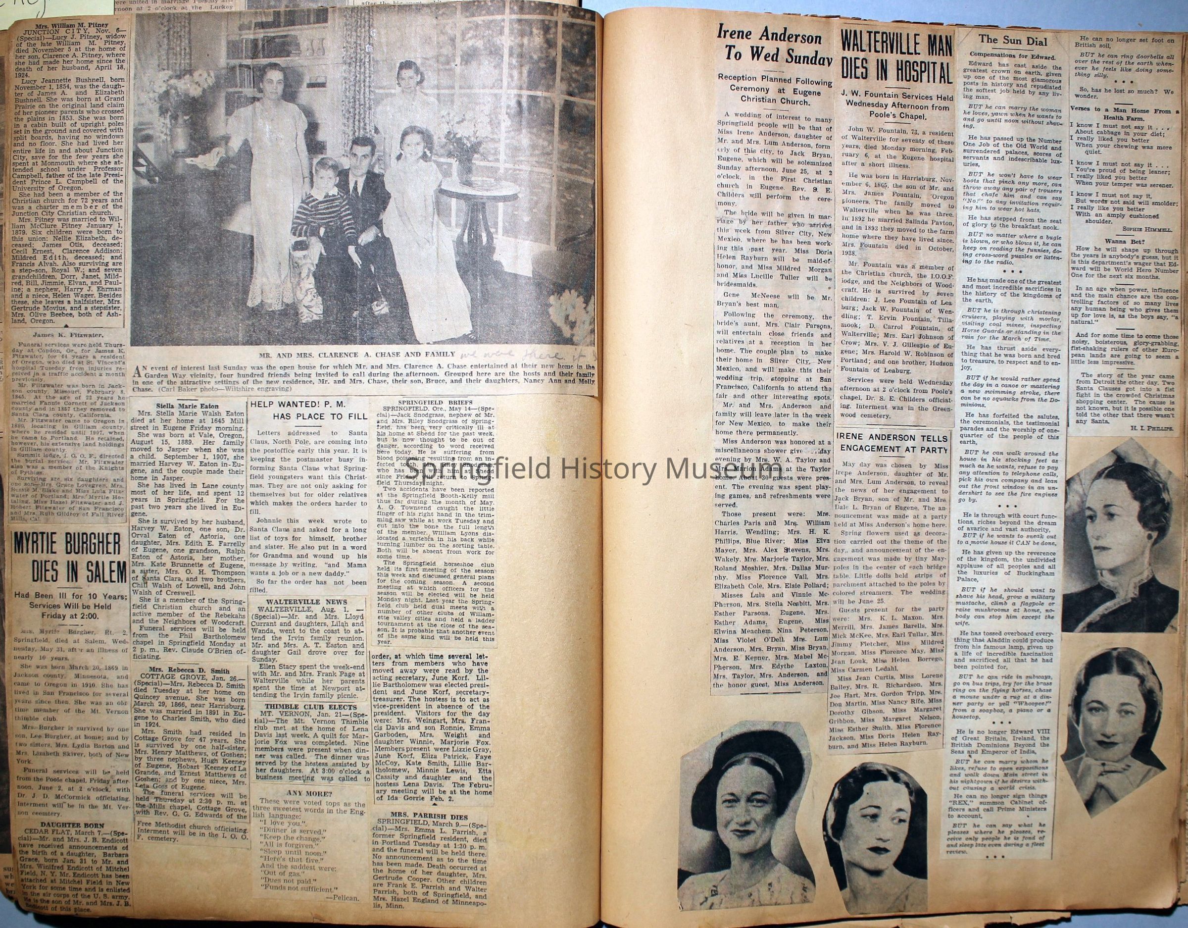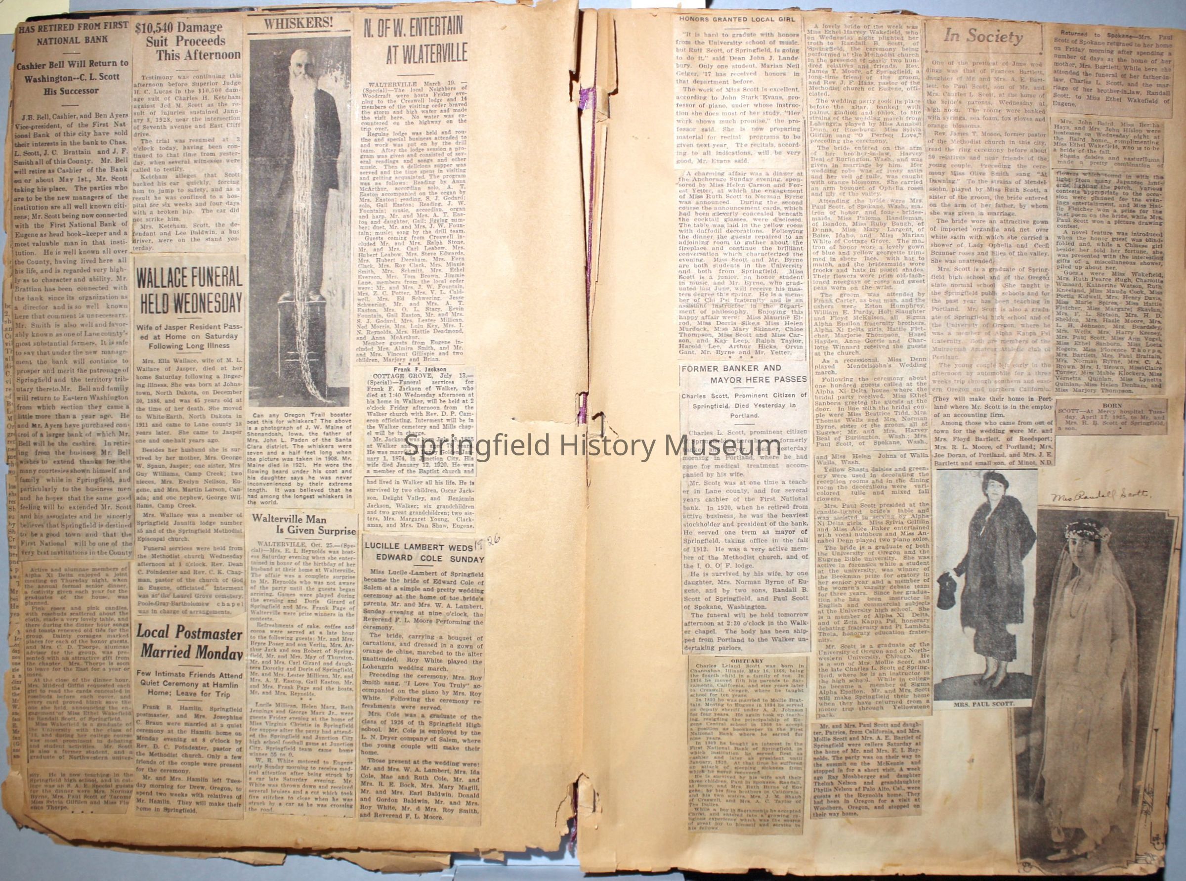 Cover reads: "Scrapbook for Pictures." Paperback scrapbook; newspaper clippings about local news, families and friends, advertisements, as well as letters and drawings from children and other relatives; dates from 1920 through 1940.Collection
