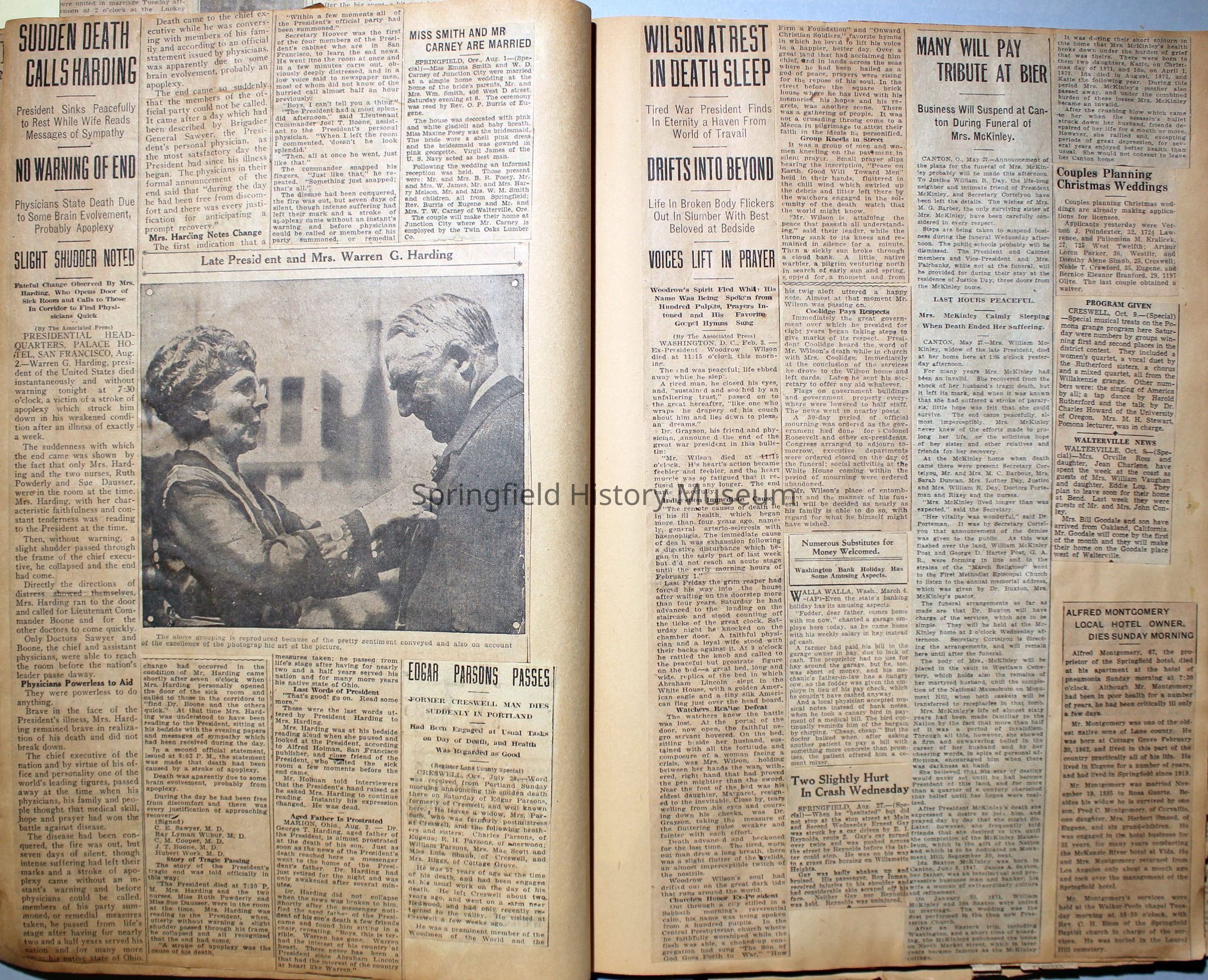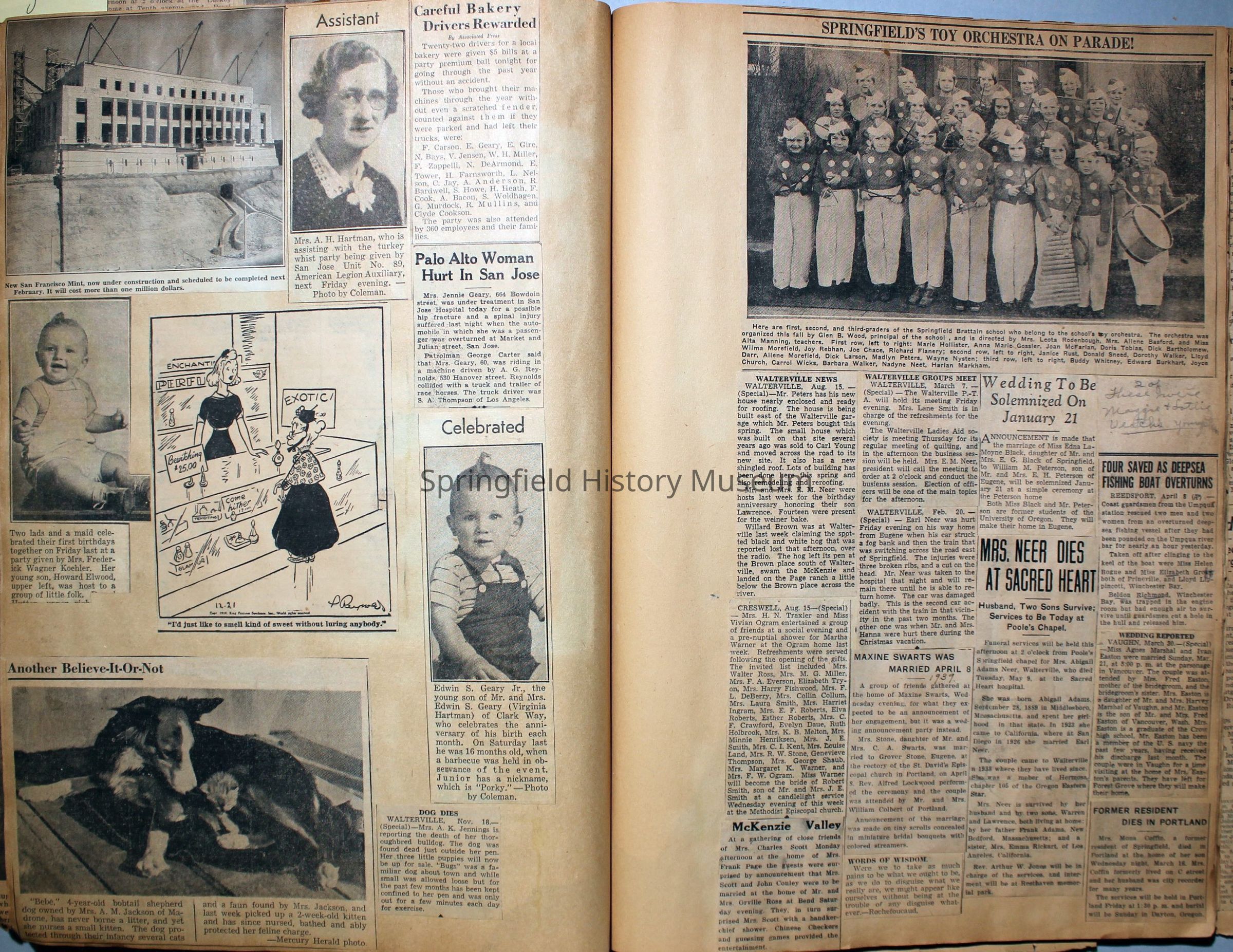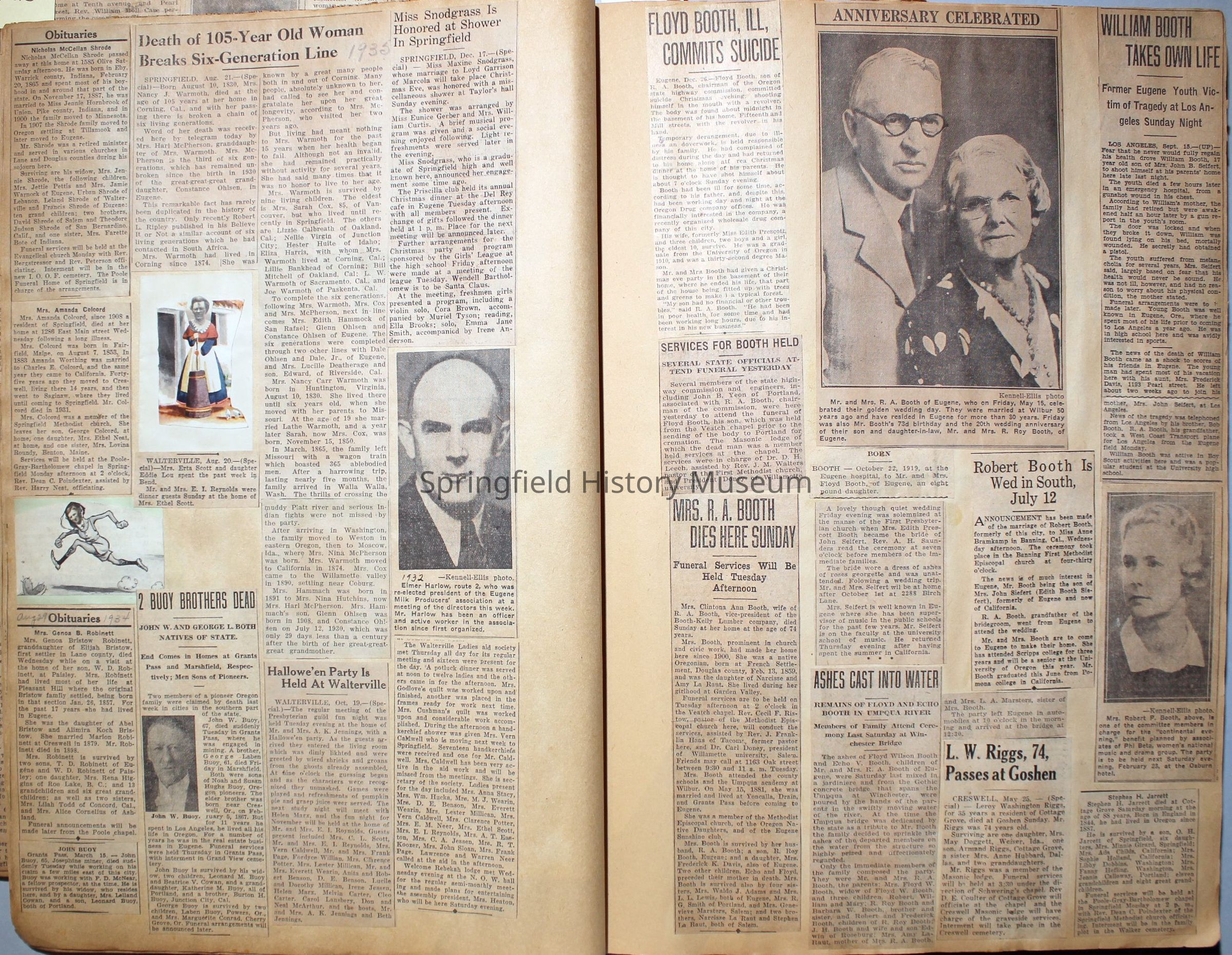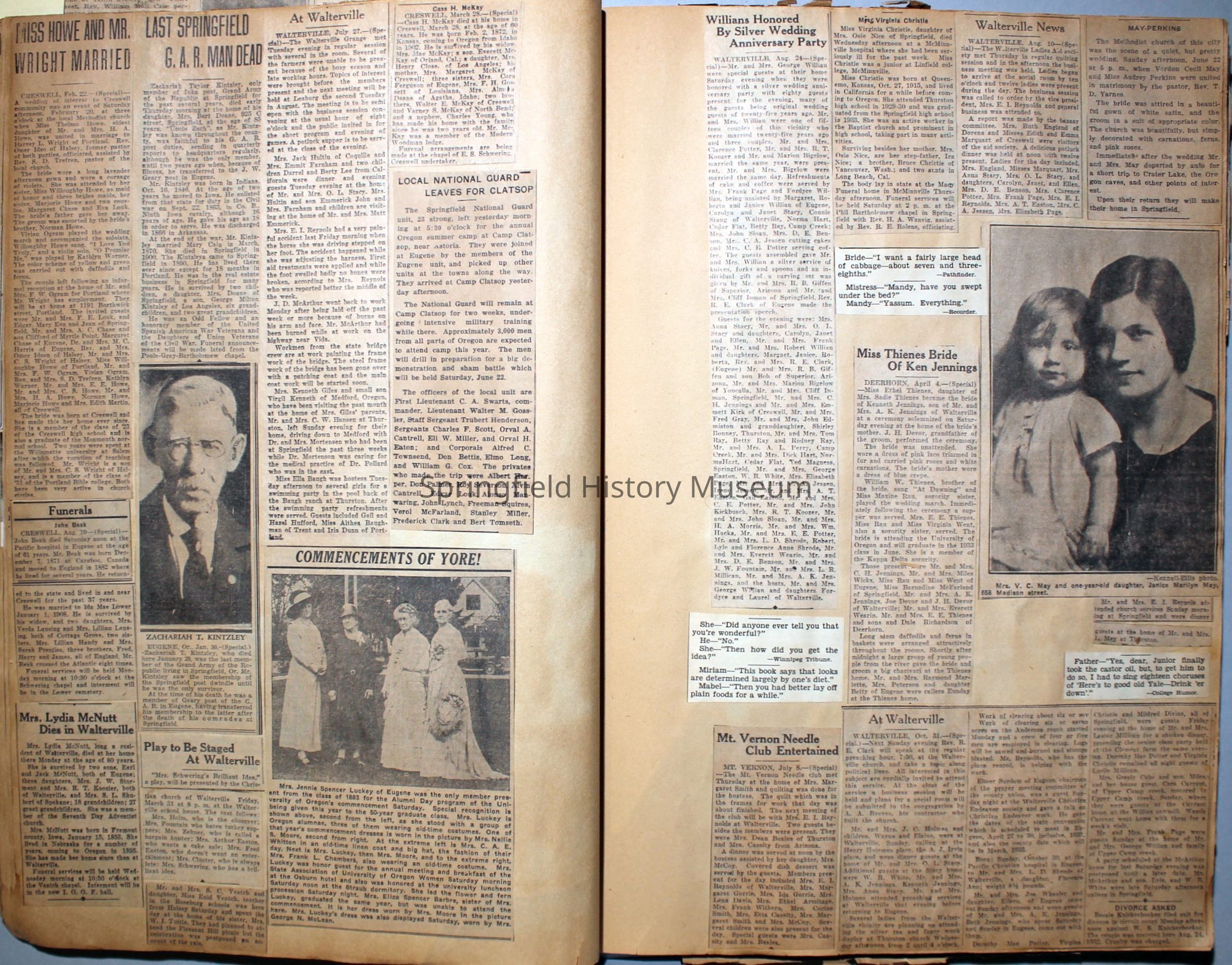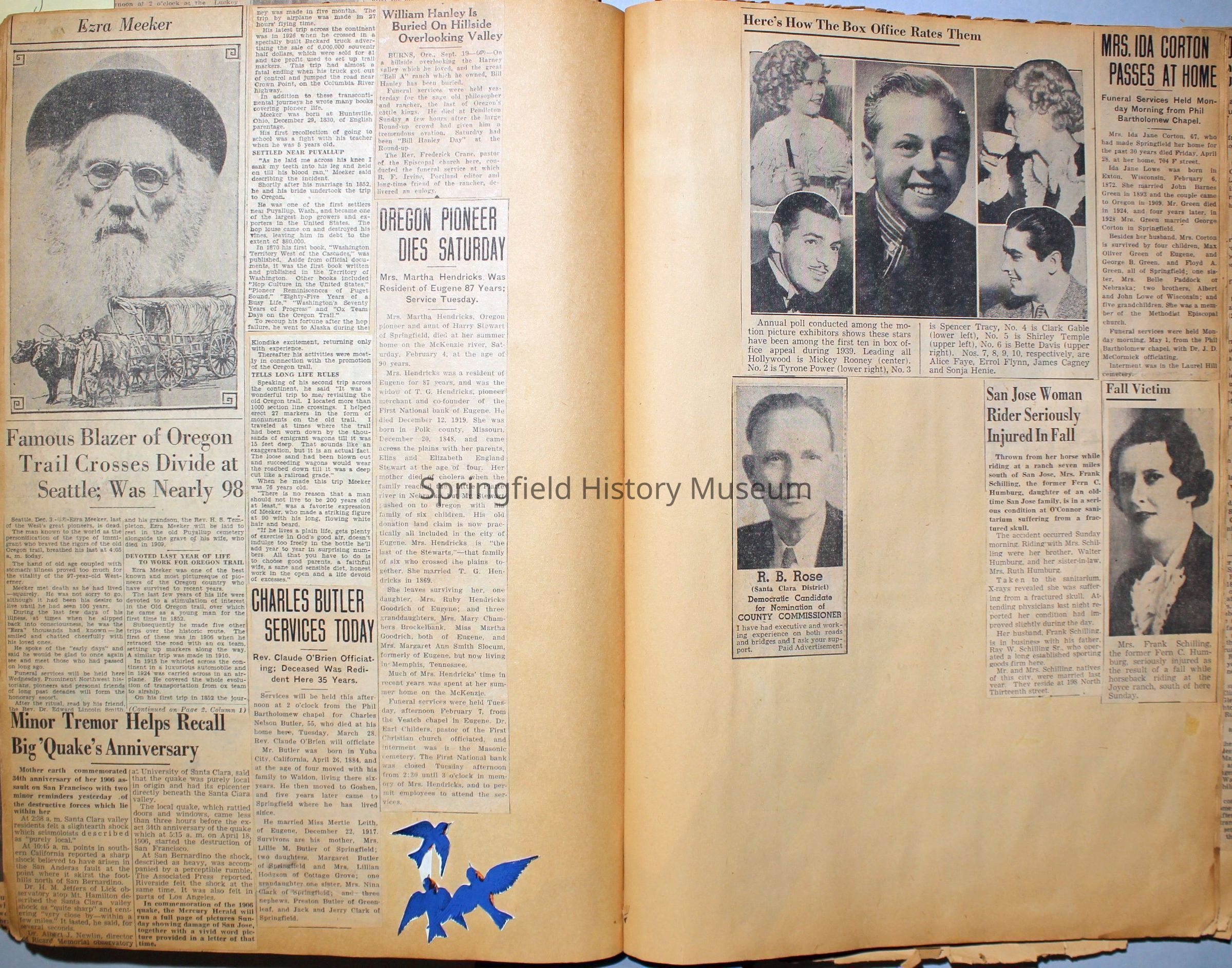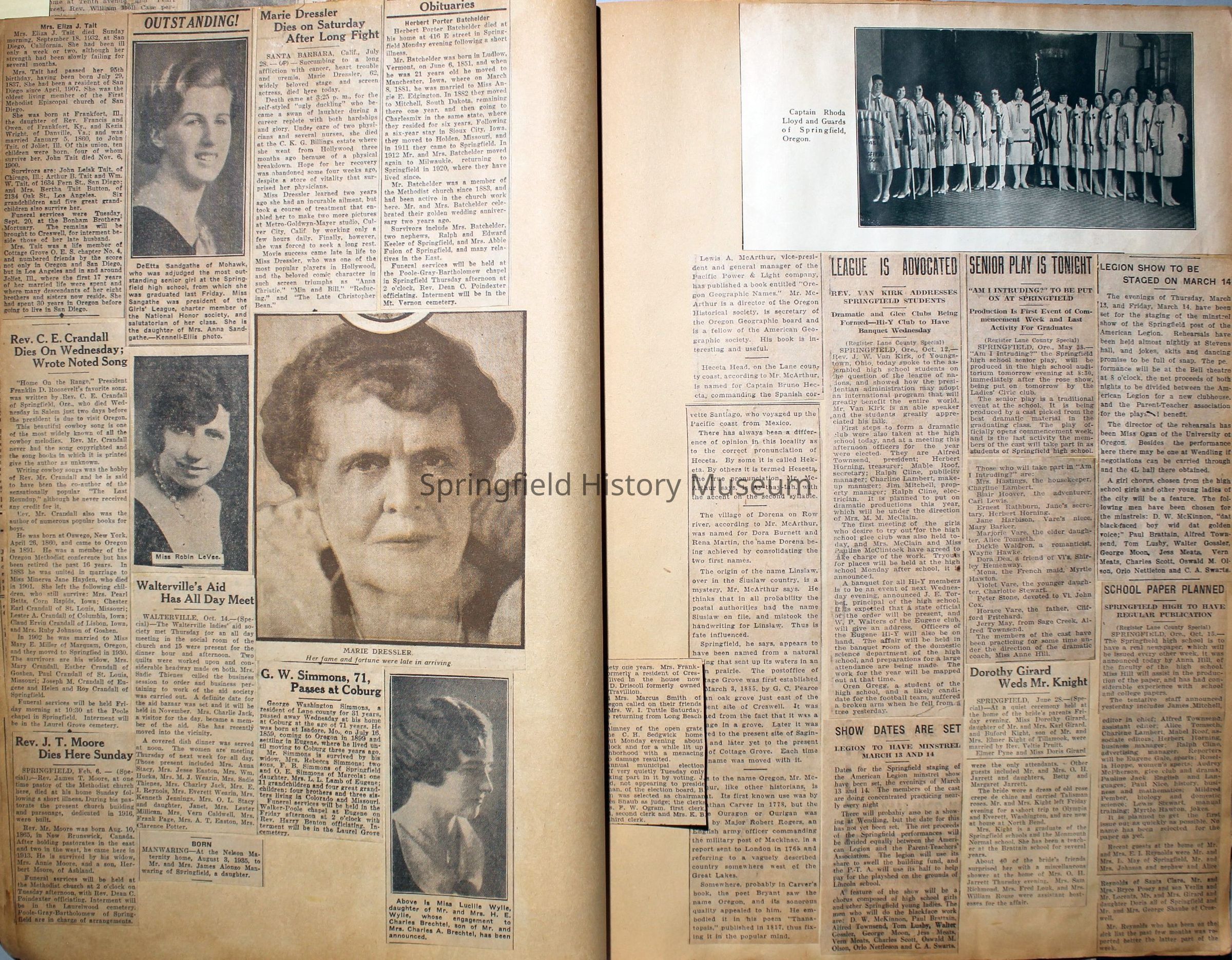 Cover reads: "Scrapbook for Pictures." Paperback scrapbook; newspaper clippings about local news, families and friends, advertisements, as well as letters and drawings from children and other relatives; dates from 1920 through 1940.Collection