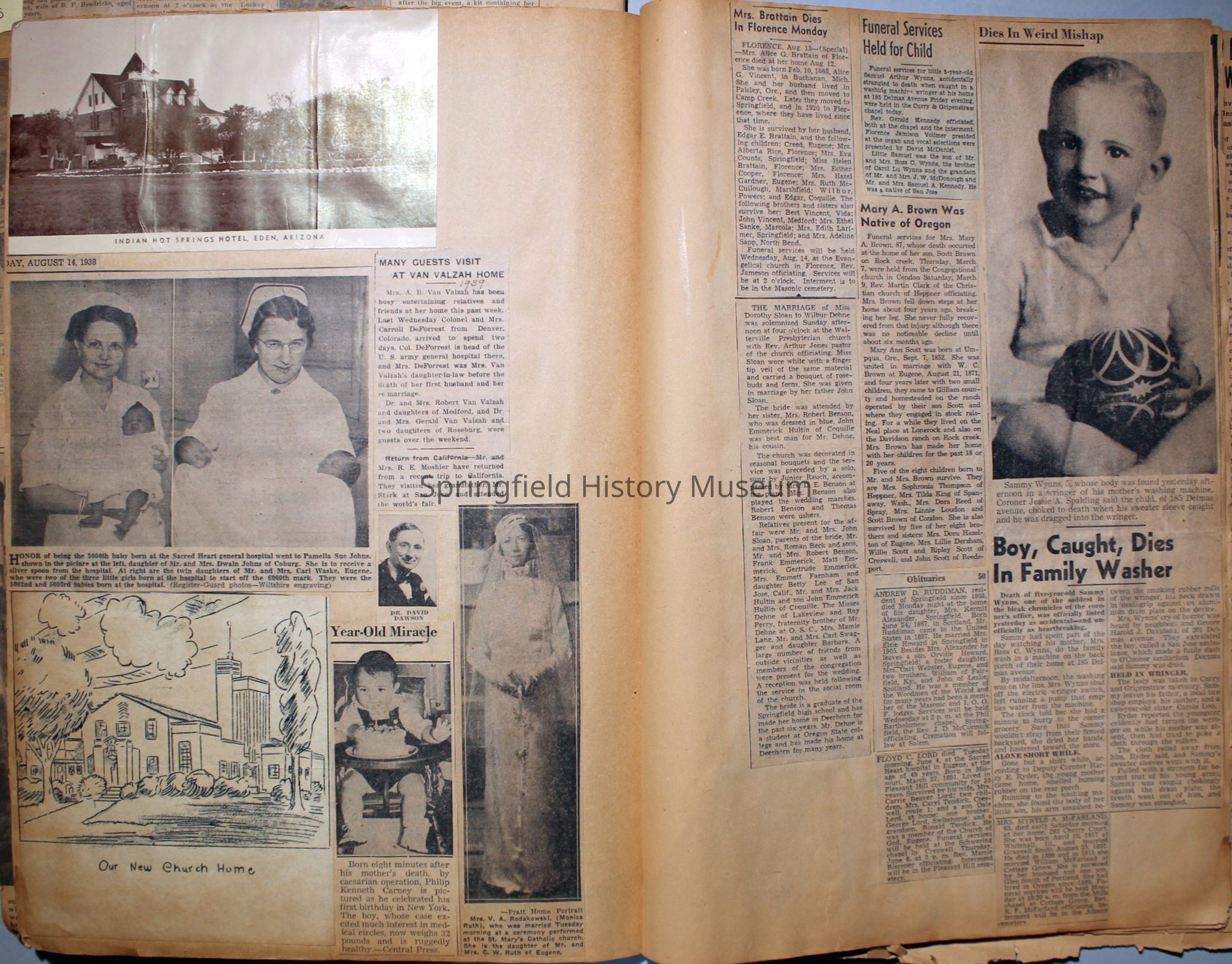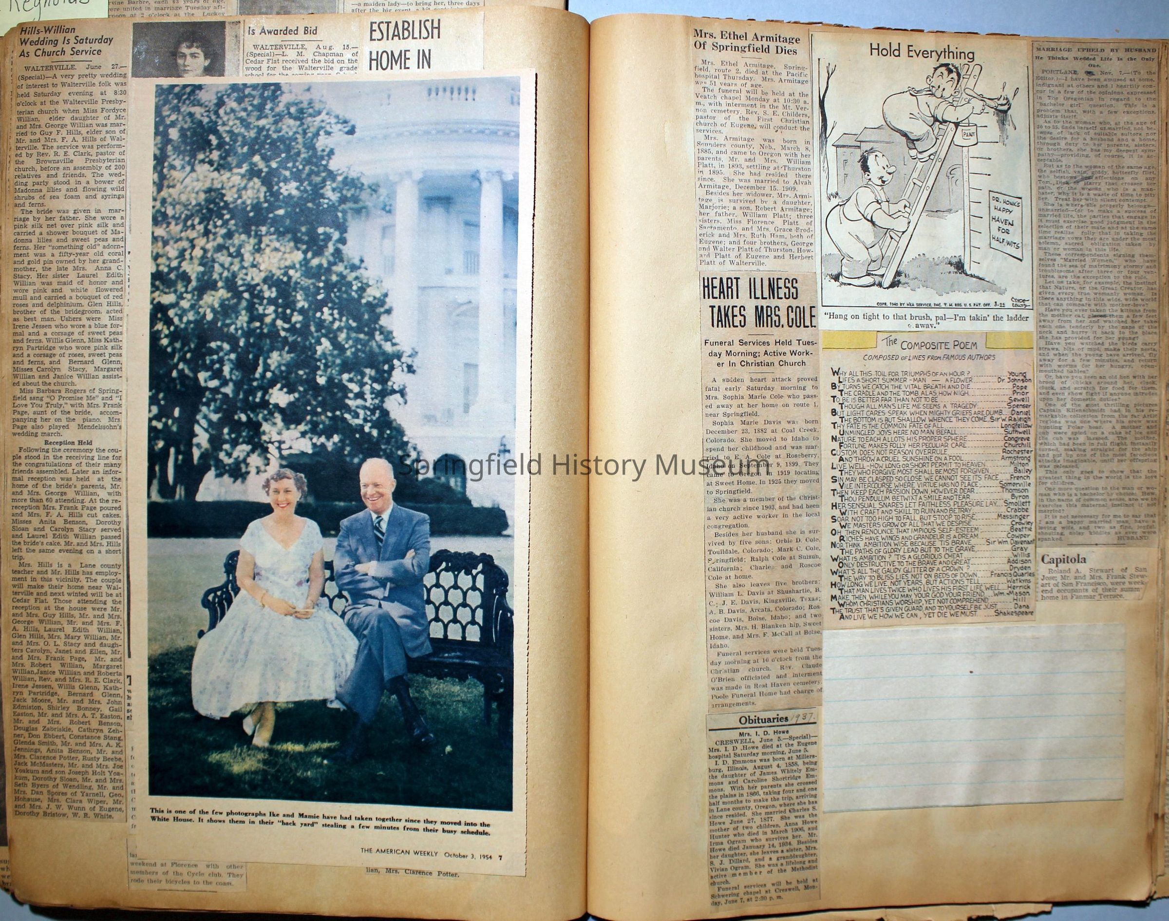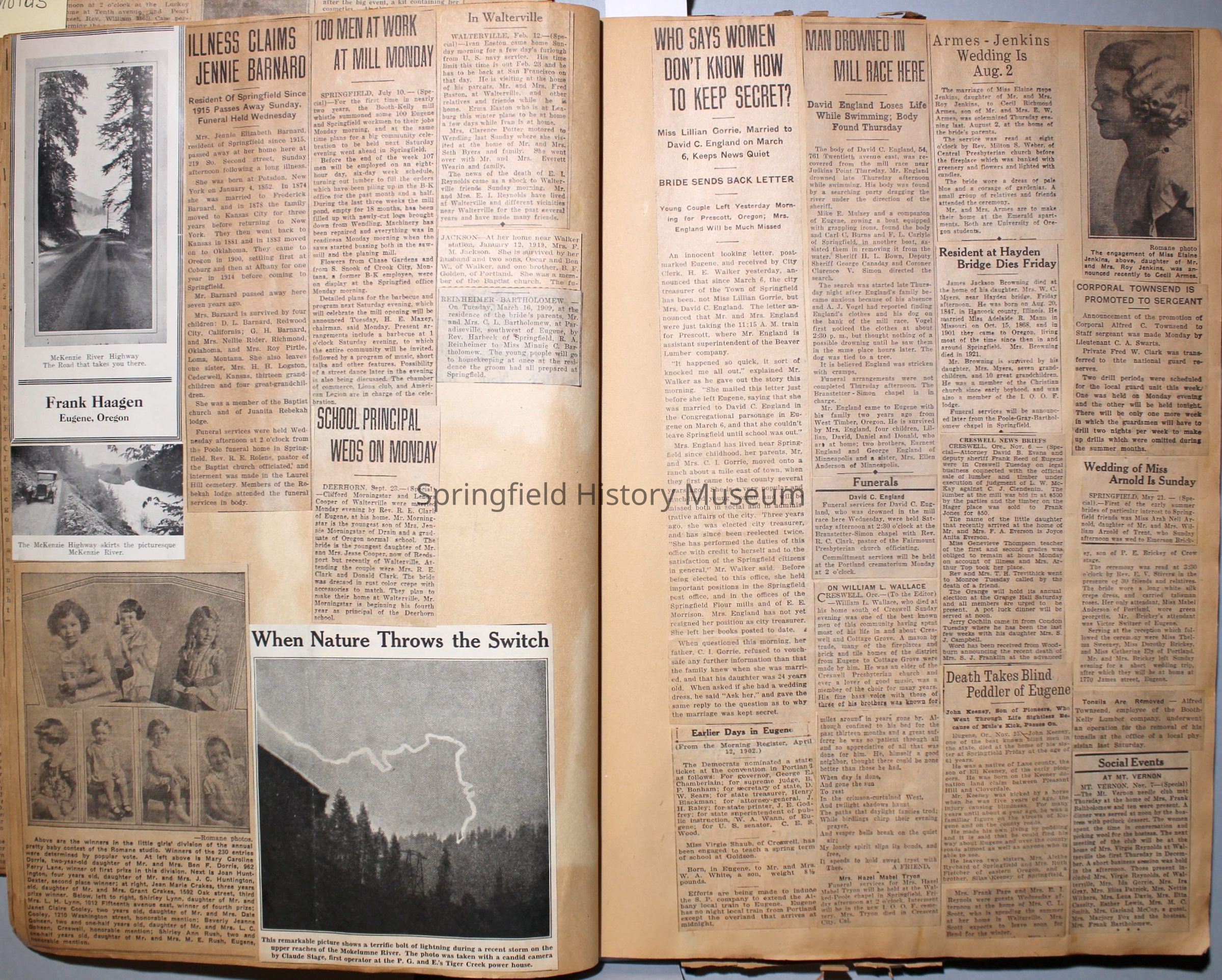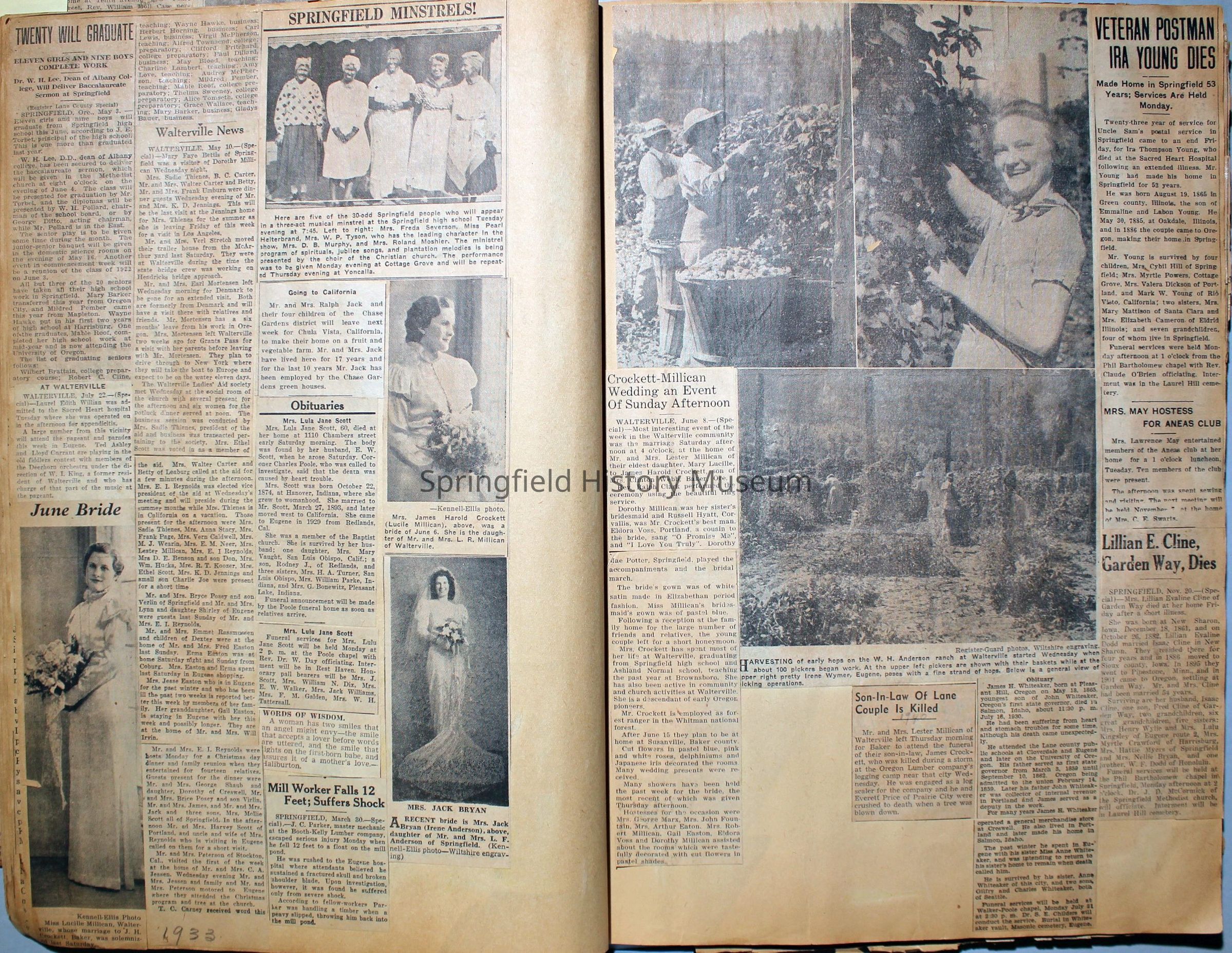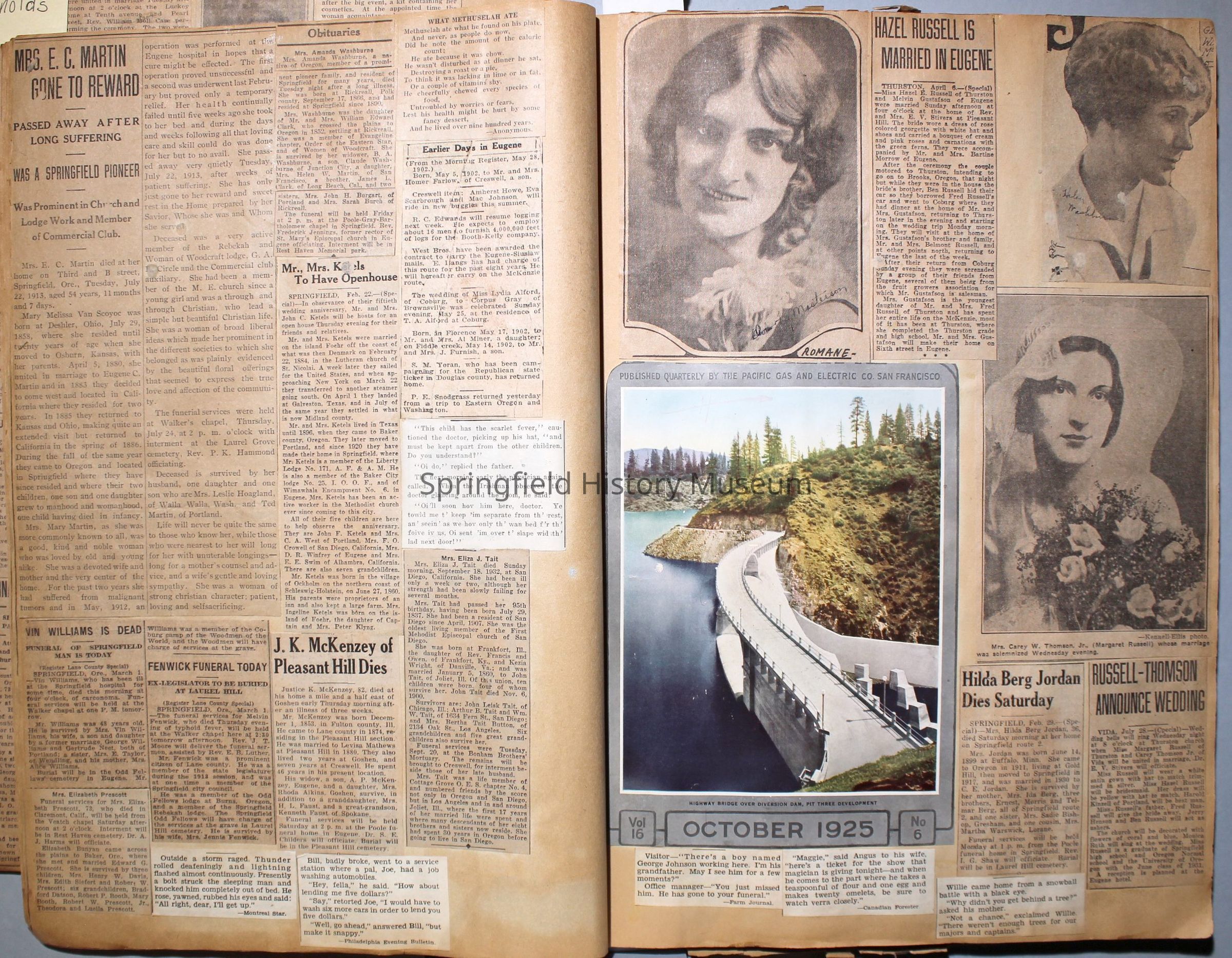 Cover reads: "Scrapbook for Pictures." Paperback scrapbook; newspaper clippings about local news, families and friends, advertisements, as well as letters and drawings from children and other relatives; dates from 1920 through 1940.Collection