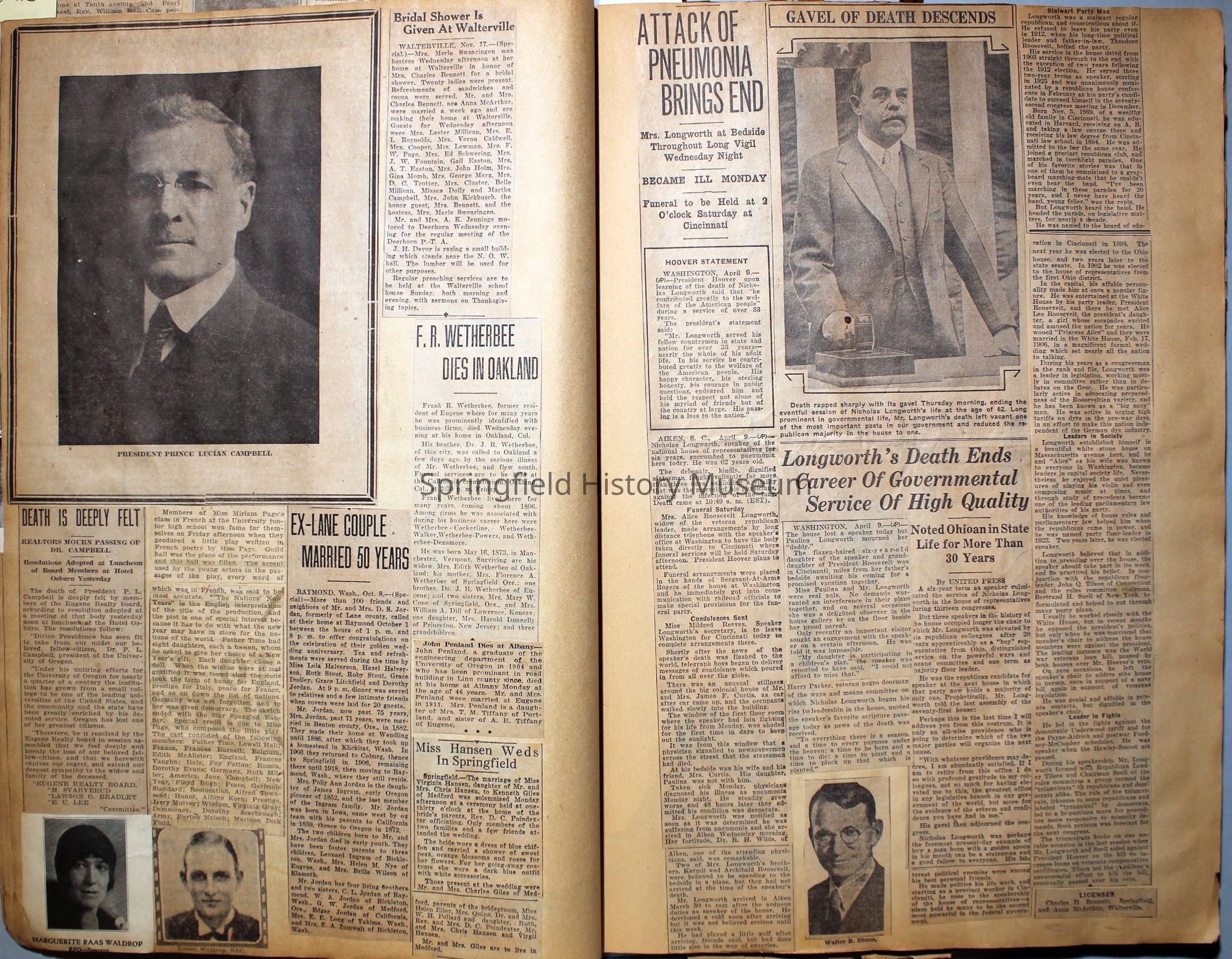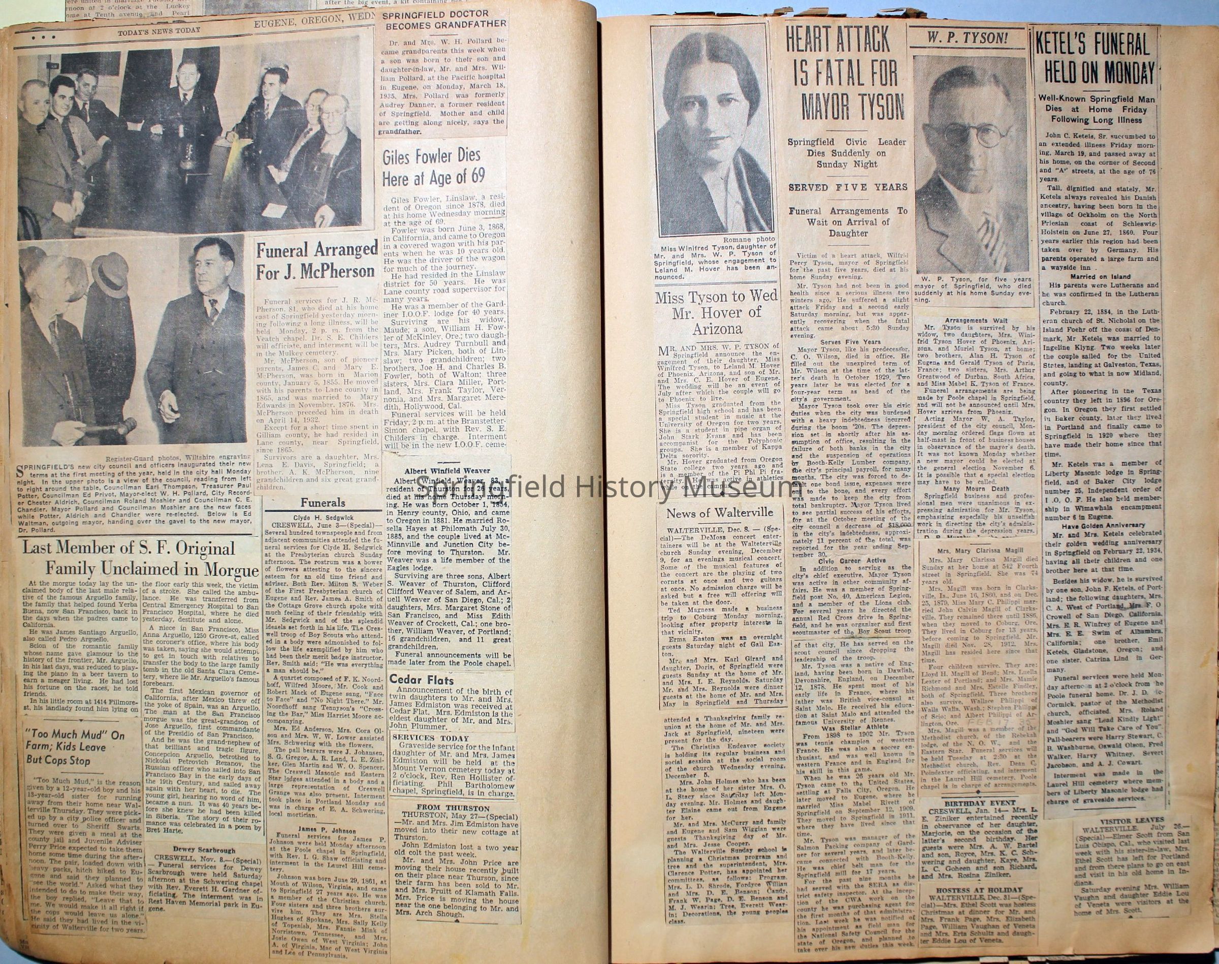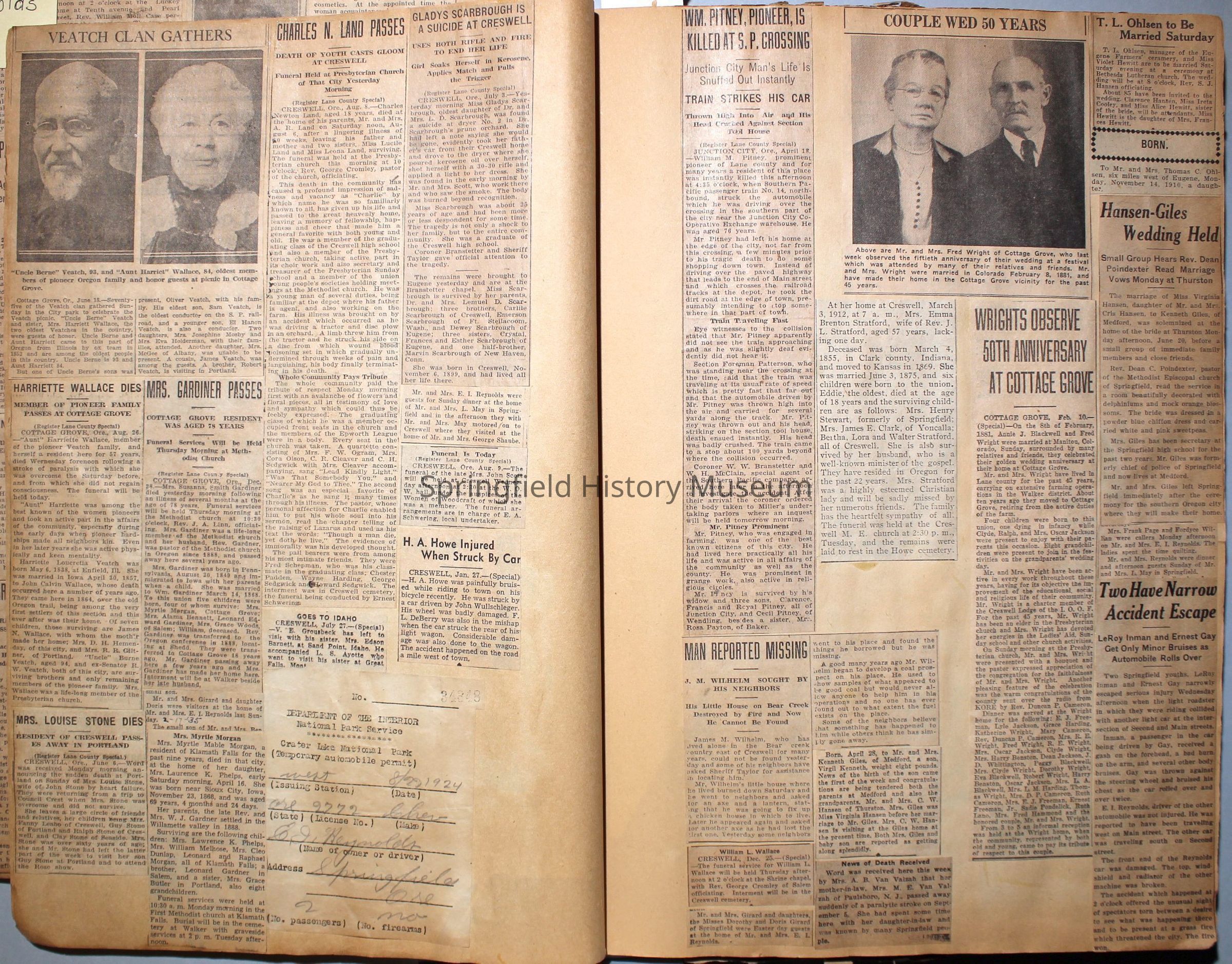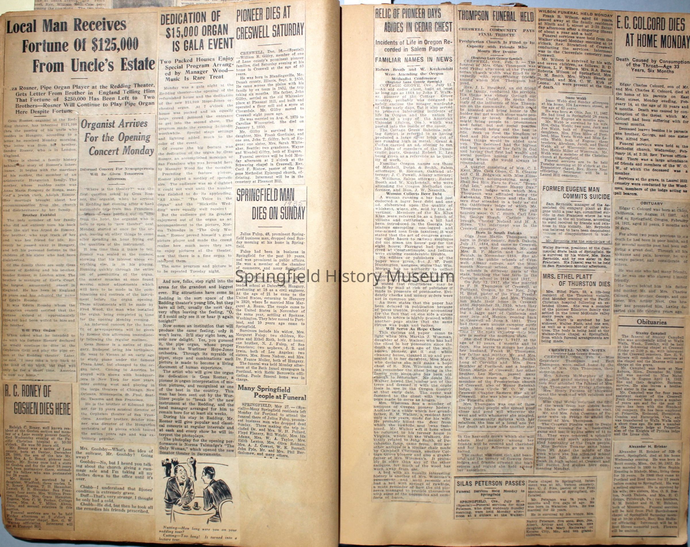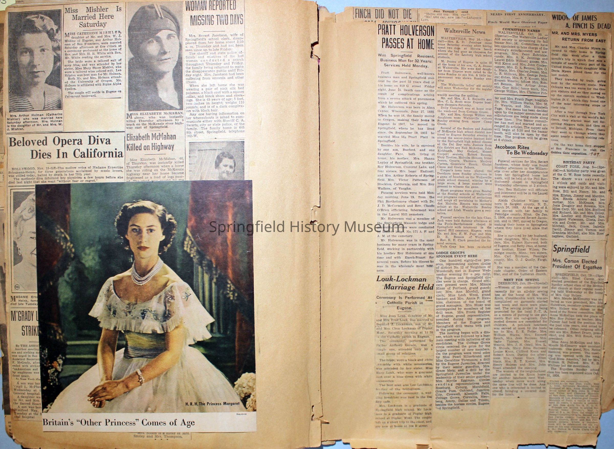 Cover reads: "Scrapbook for Pictures." Paperback scrapbook; newspaper clippings about local news, families and friends, advertisements, as well as letters and drawings from children and other relatives; dates from 1920 through 1940.Collection