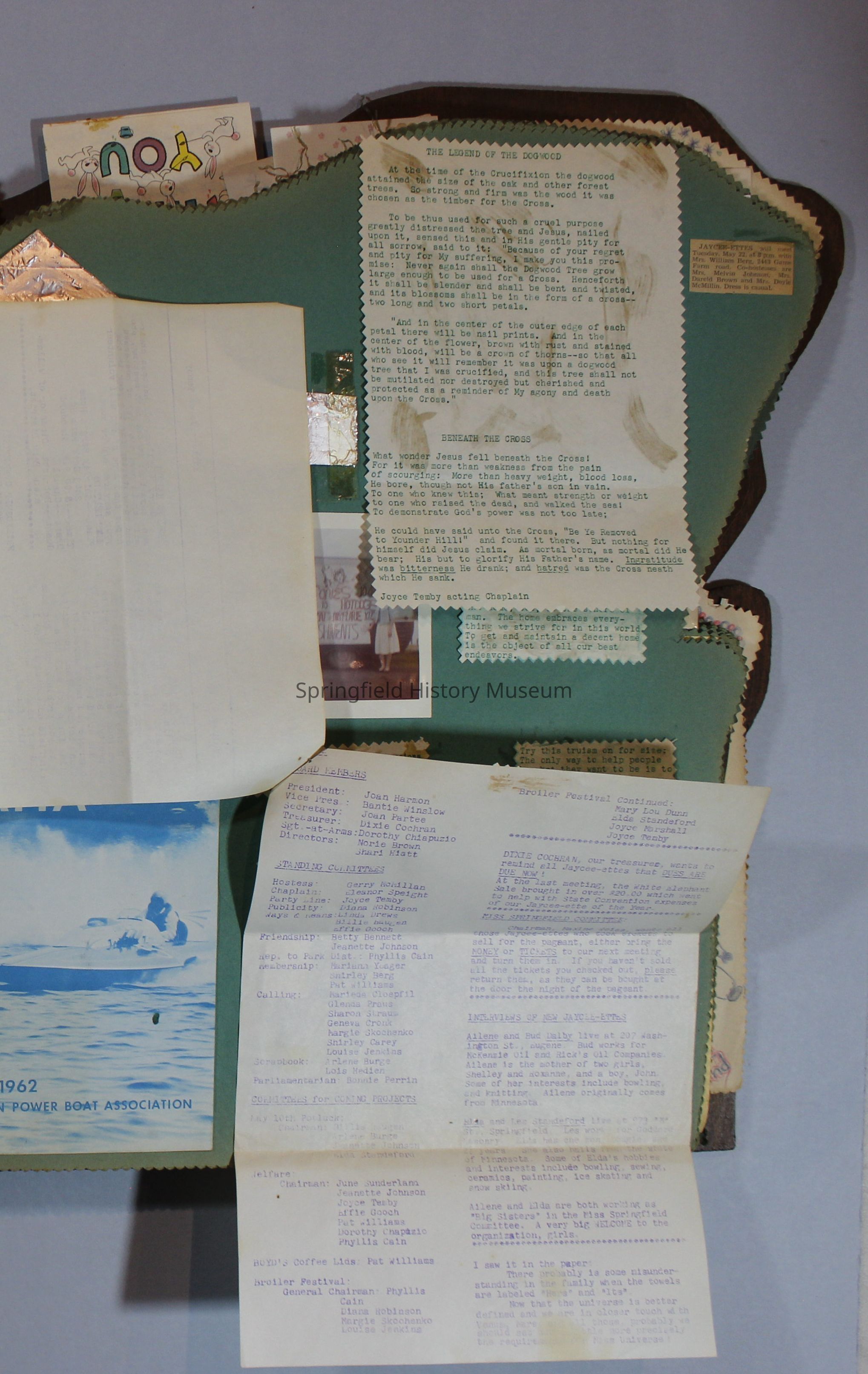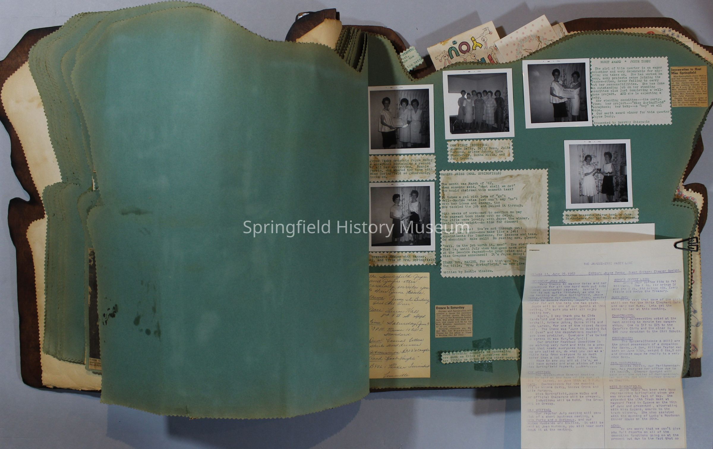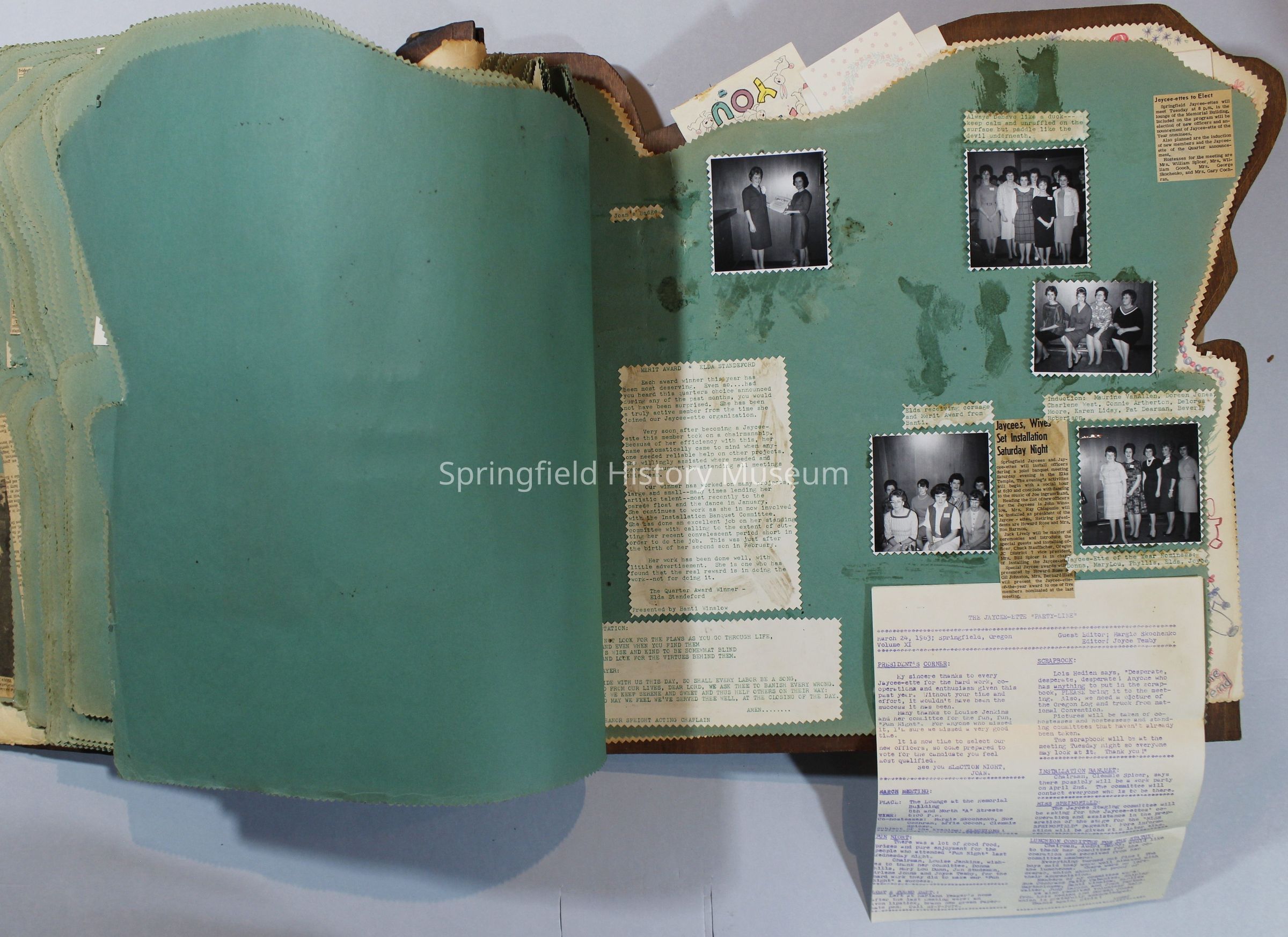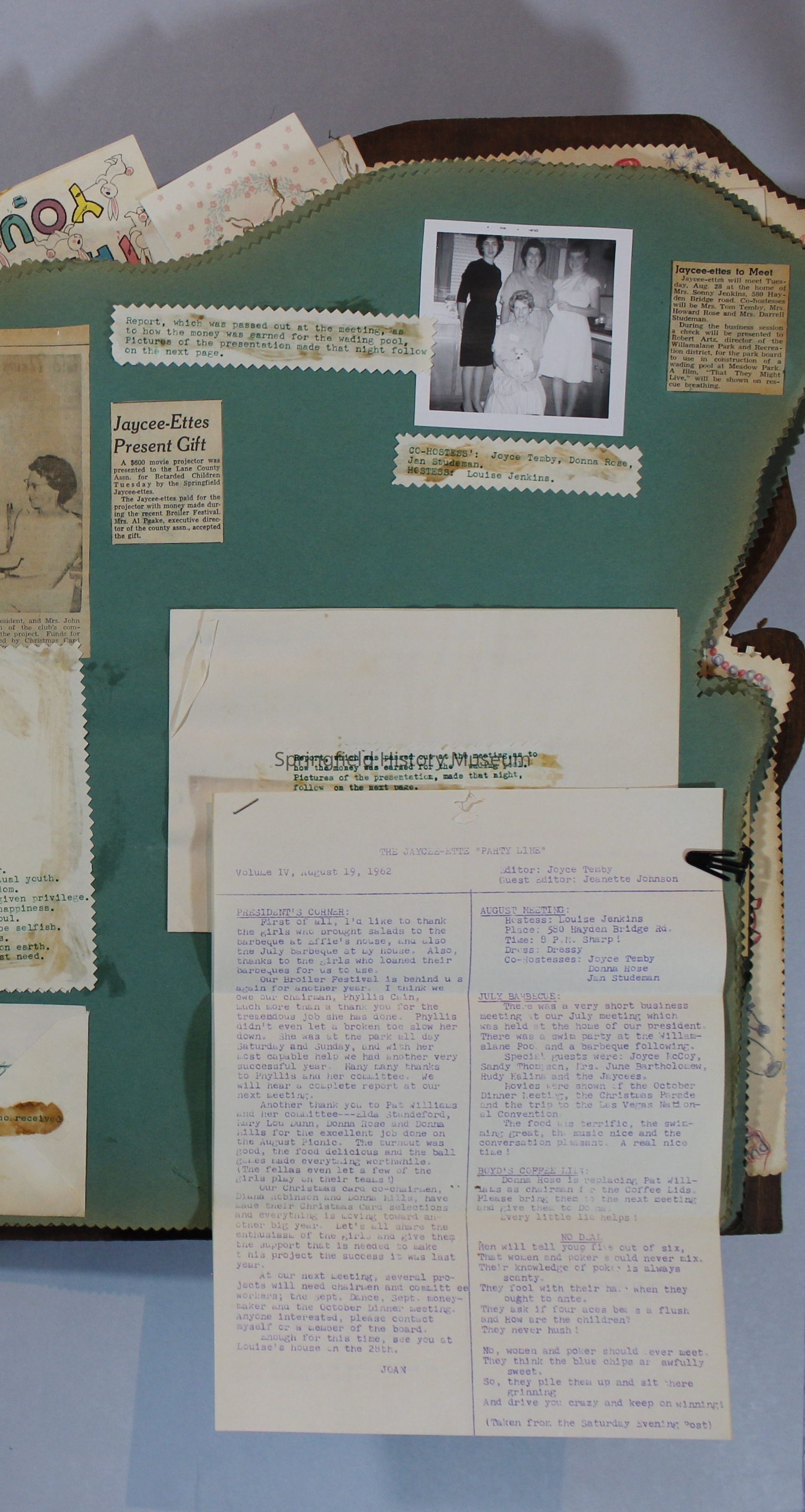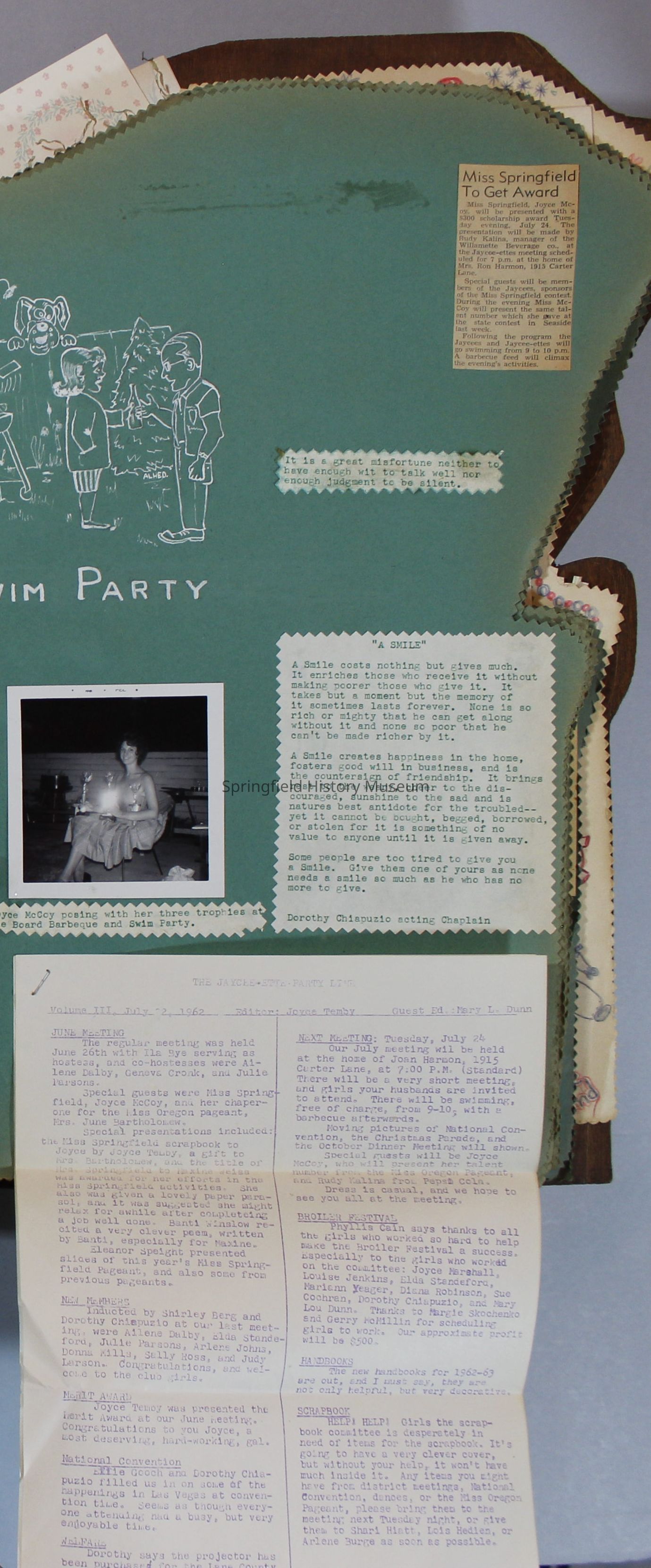 Scrapbook of Springfield, Oregon Jaycee-ettes, Joan Harman Possion, was President at the time of events.1962-1963, scrapbook cover is of wood with brass color hinges. The scrapbook contains newspaper articles, photo's, and cards.
