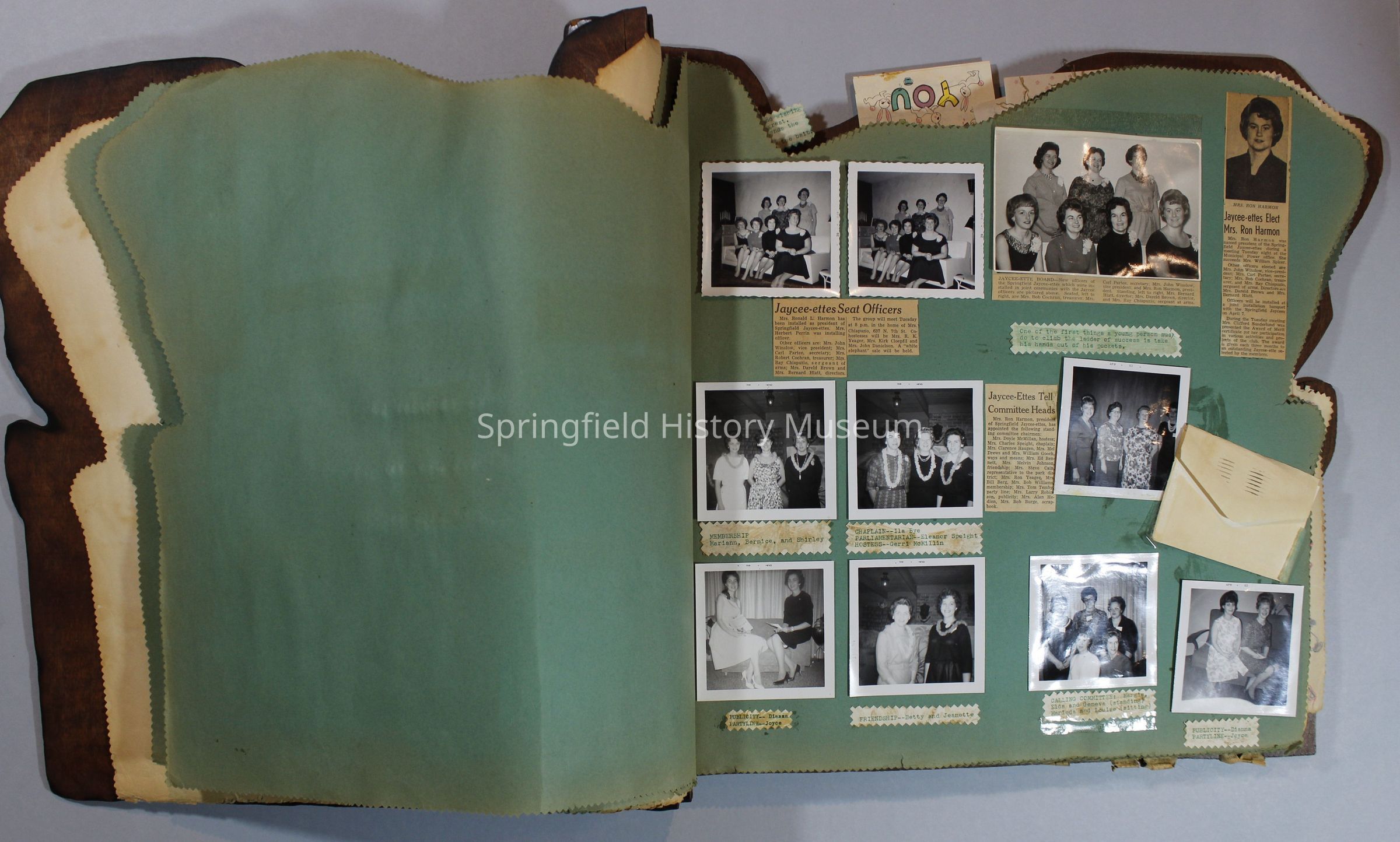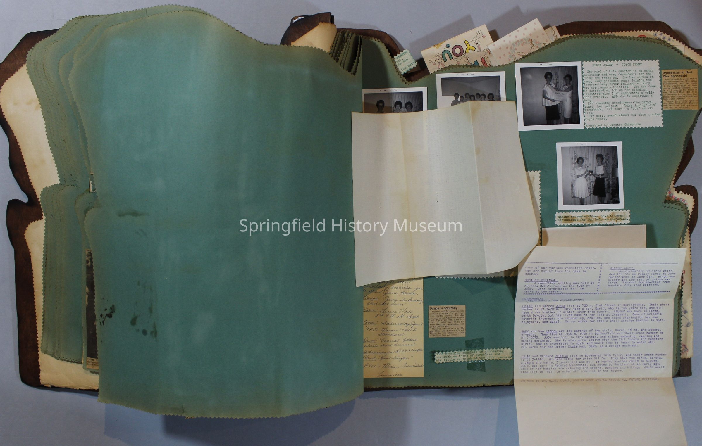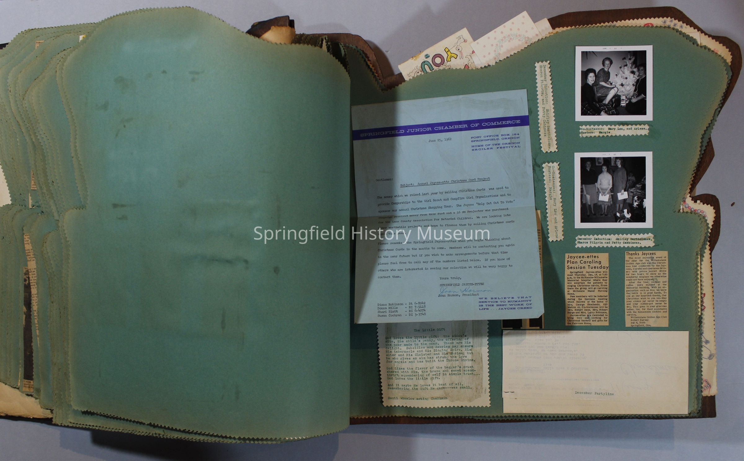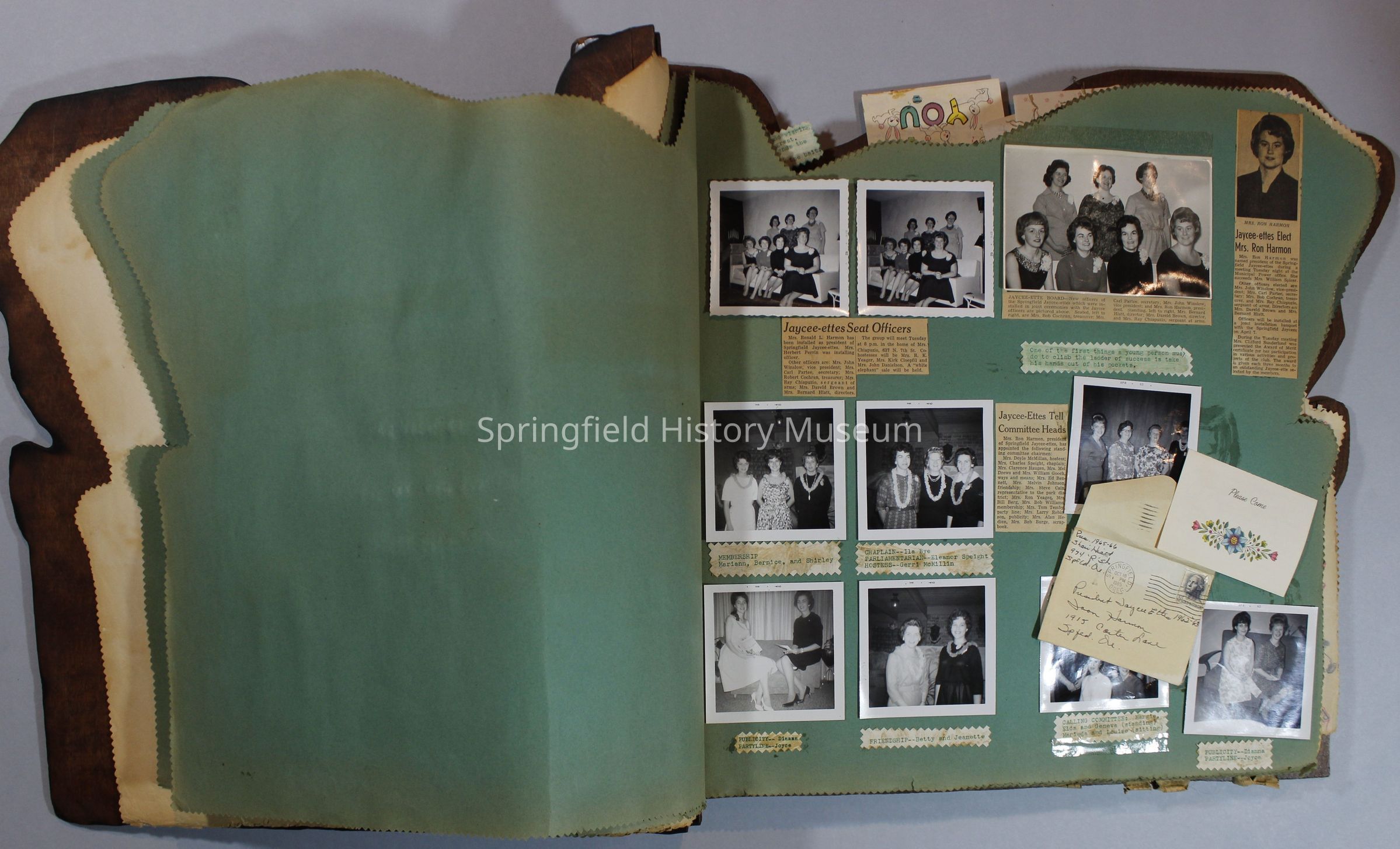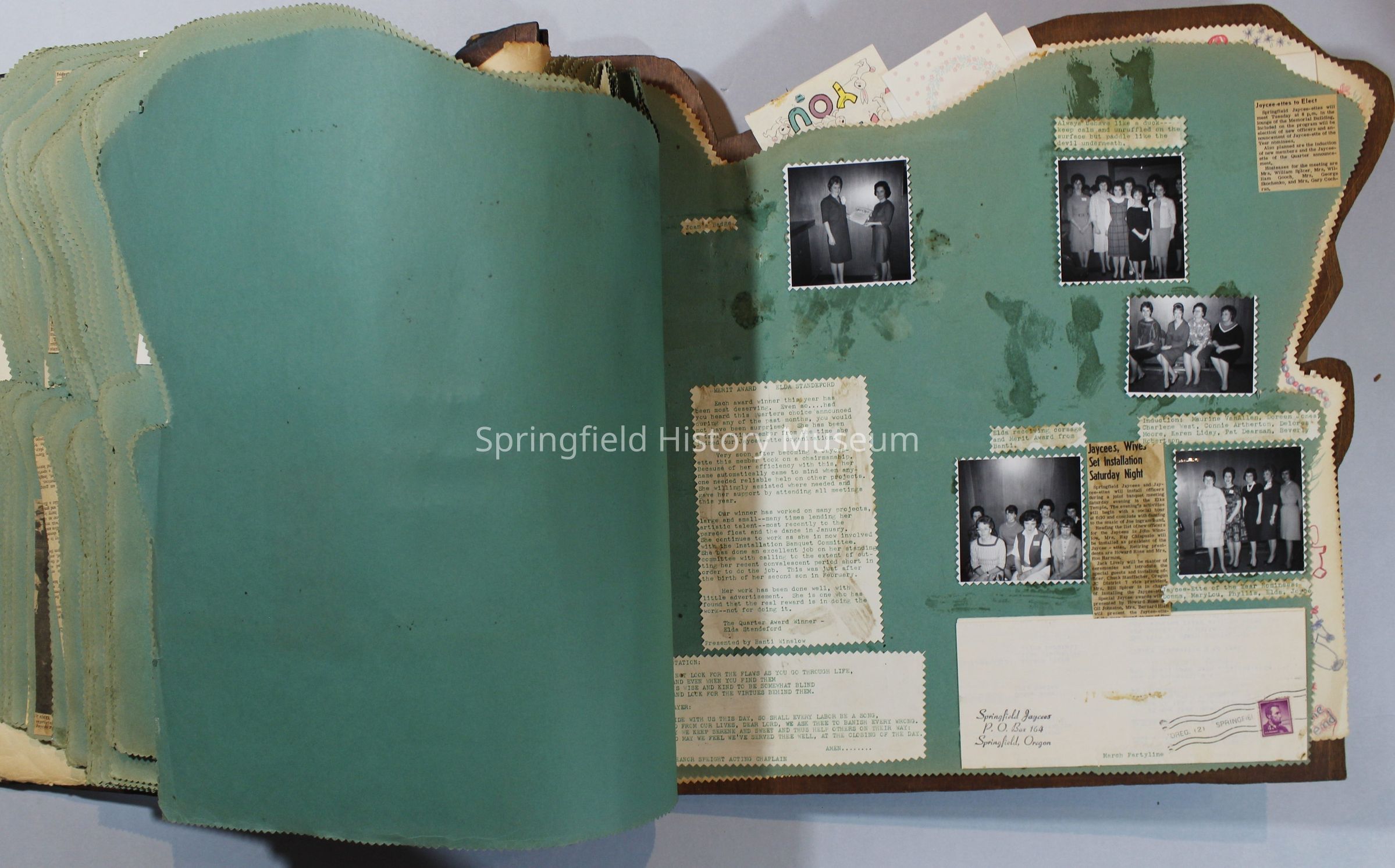 Scrapbook of Springfield, Oregon Jaycee-ettes, Joan Harman Possion, was President at the time of events.1962-1963, scrapbook cover is of wood with brass color hinges. The scrapbook contains newspaper articles, photo's, and cards.