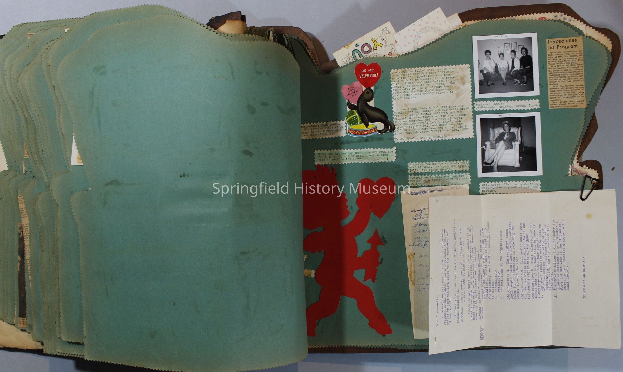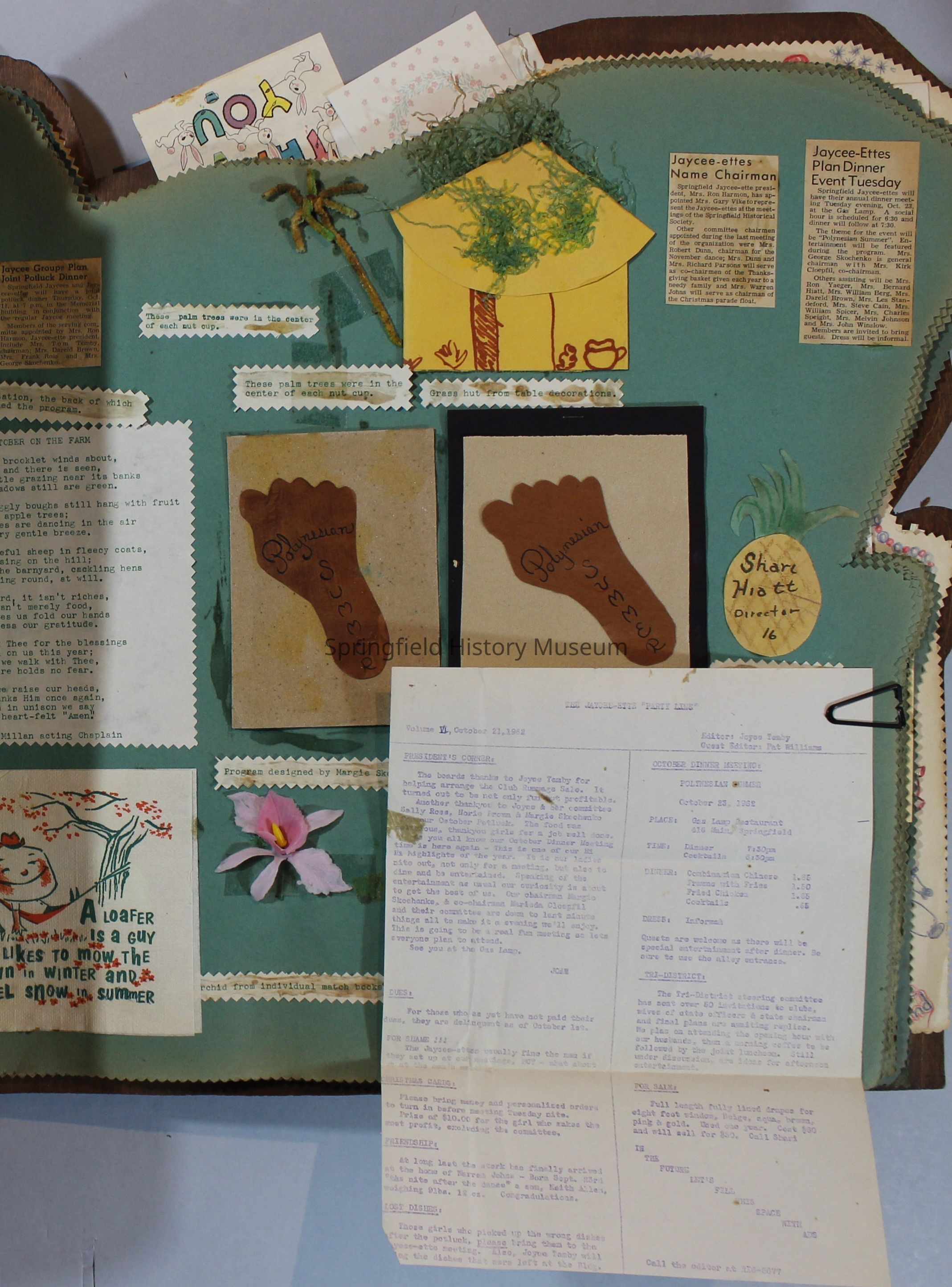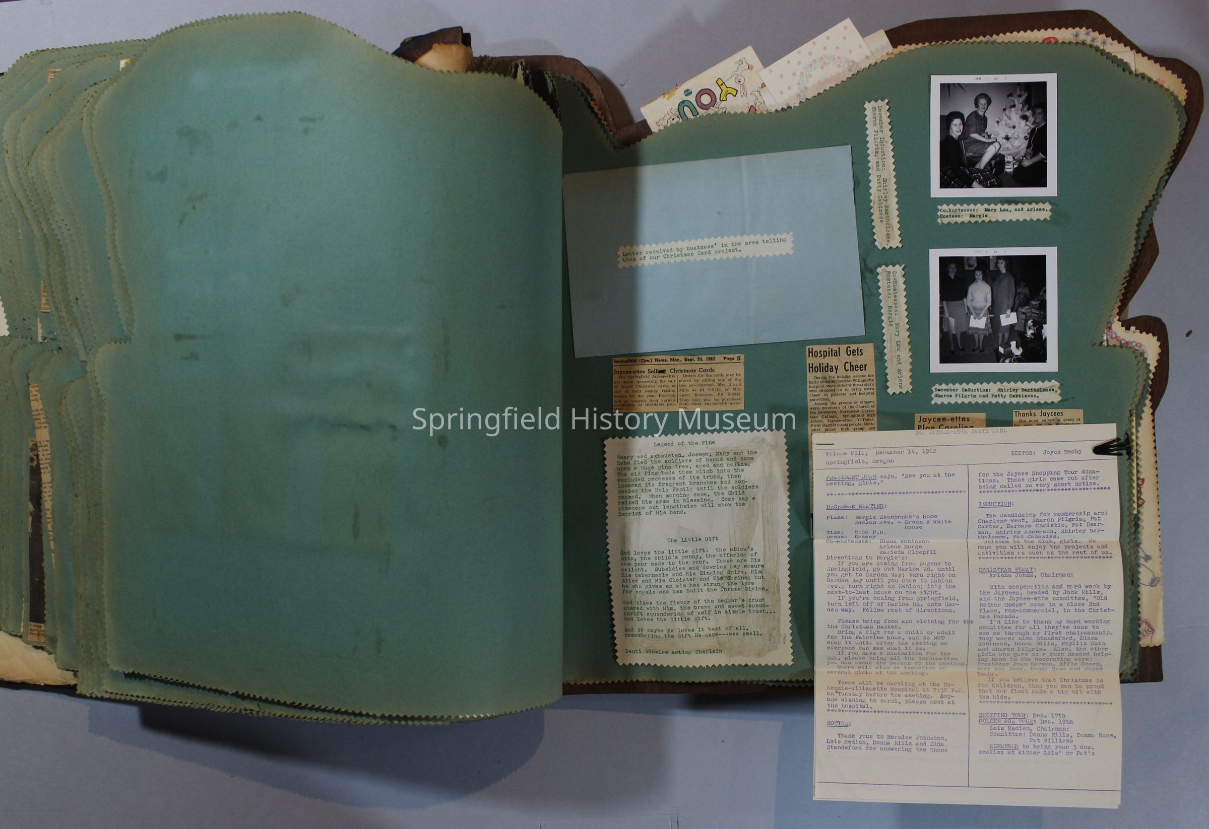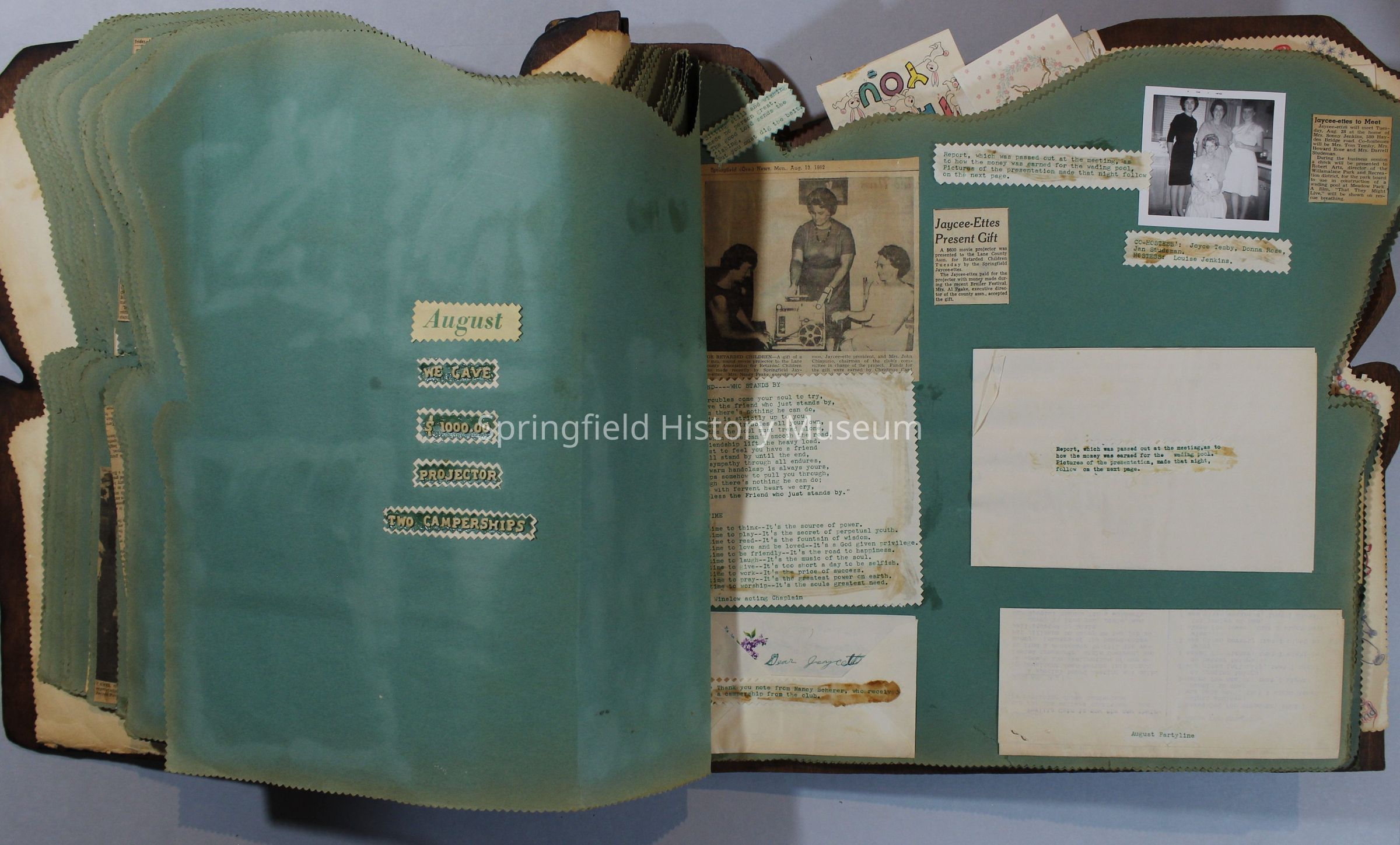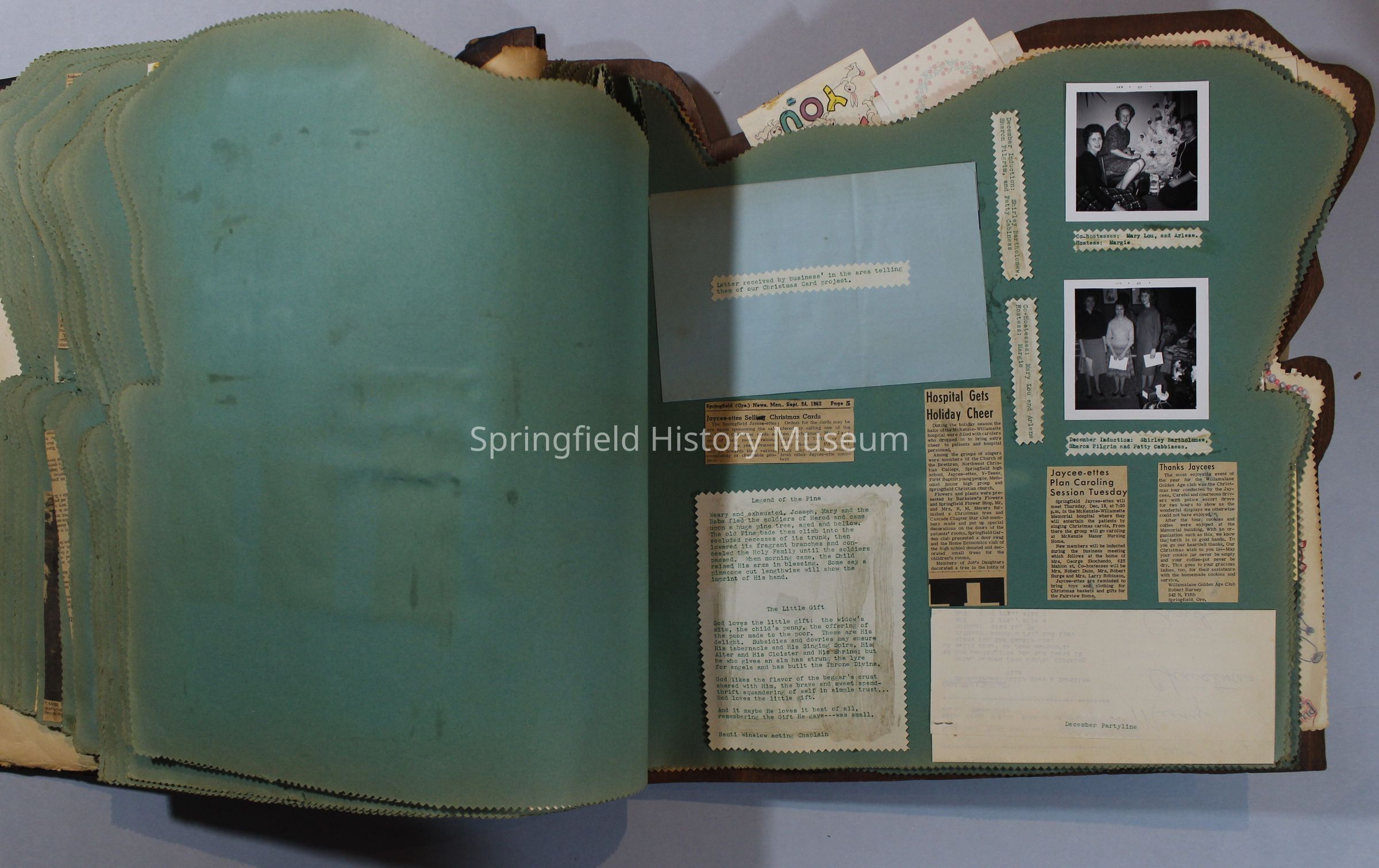 Scrapbook of Springfield, Oregon Jaycee-ettes, Joan Harman Possion, was President at the time of events.1962-1963, scrapbook cover is of wood with brass color hinges. The scrapbook contains newspaper articles, photo's, and cards.