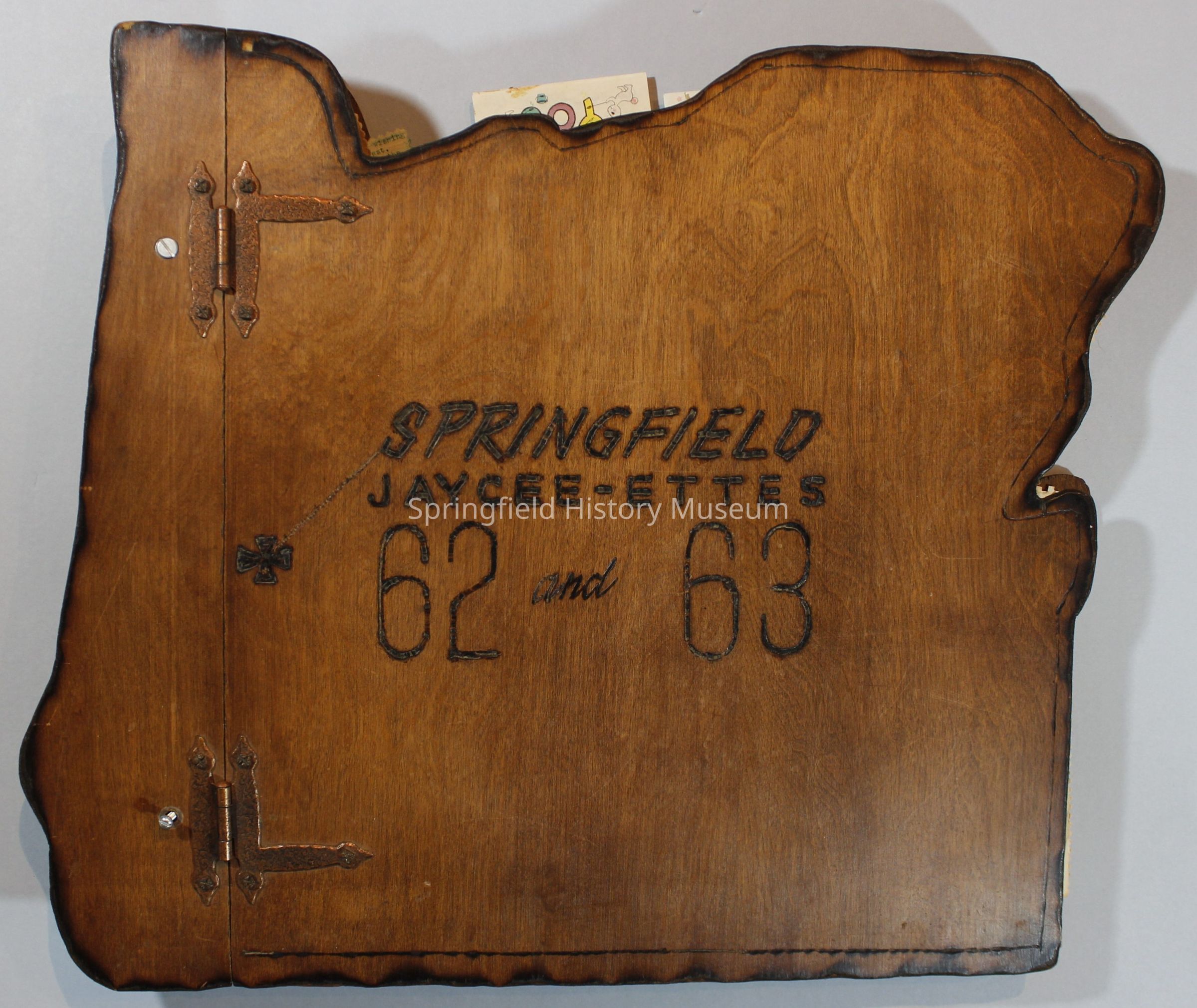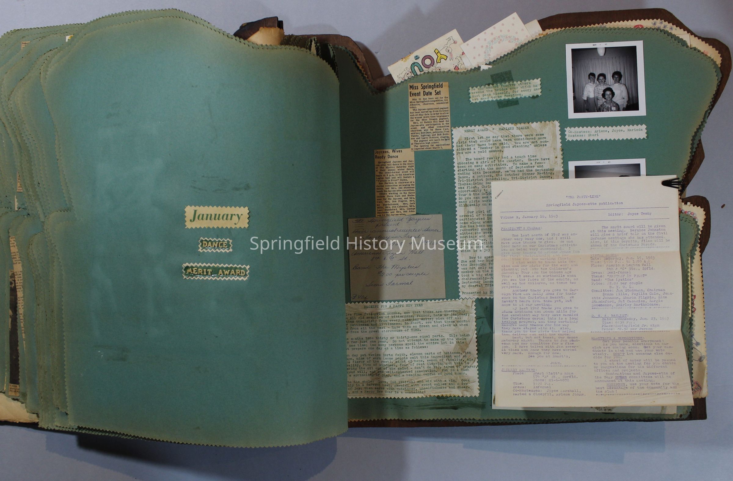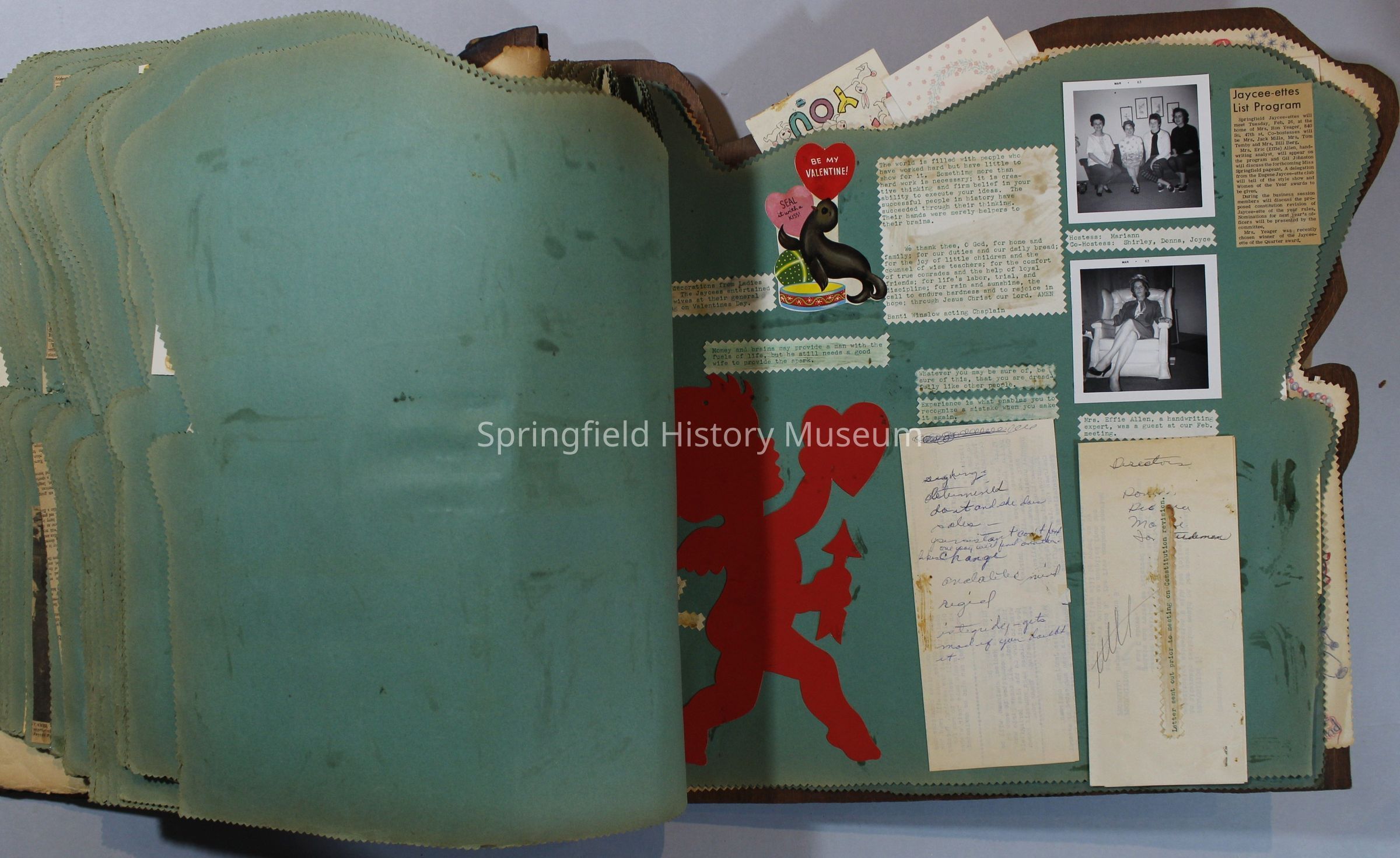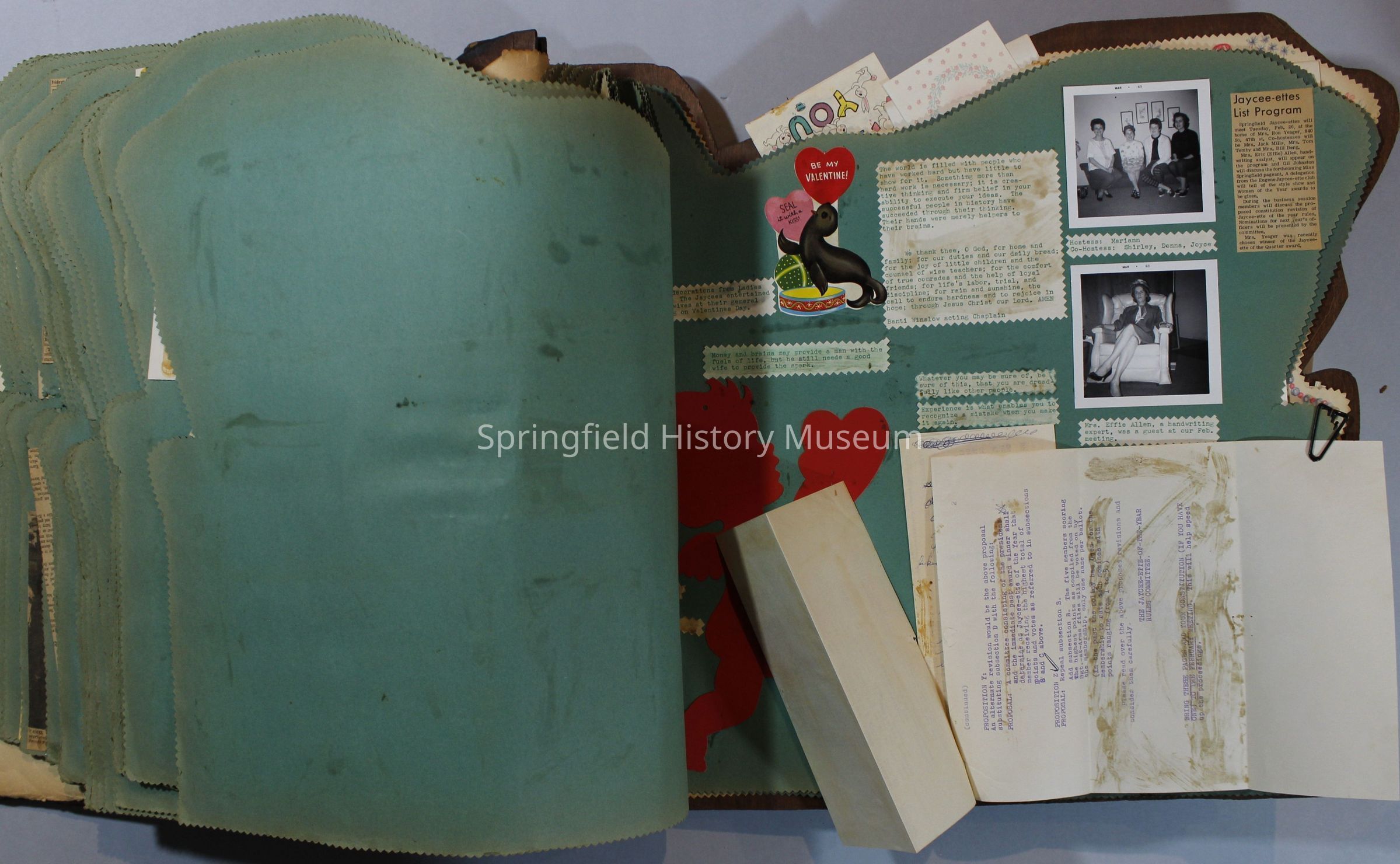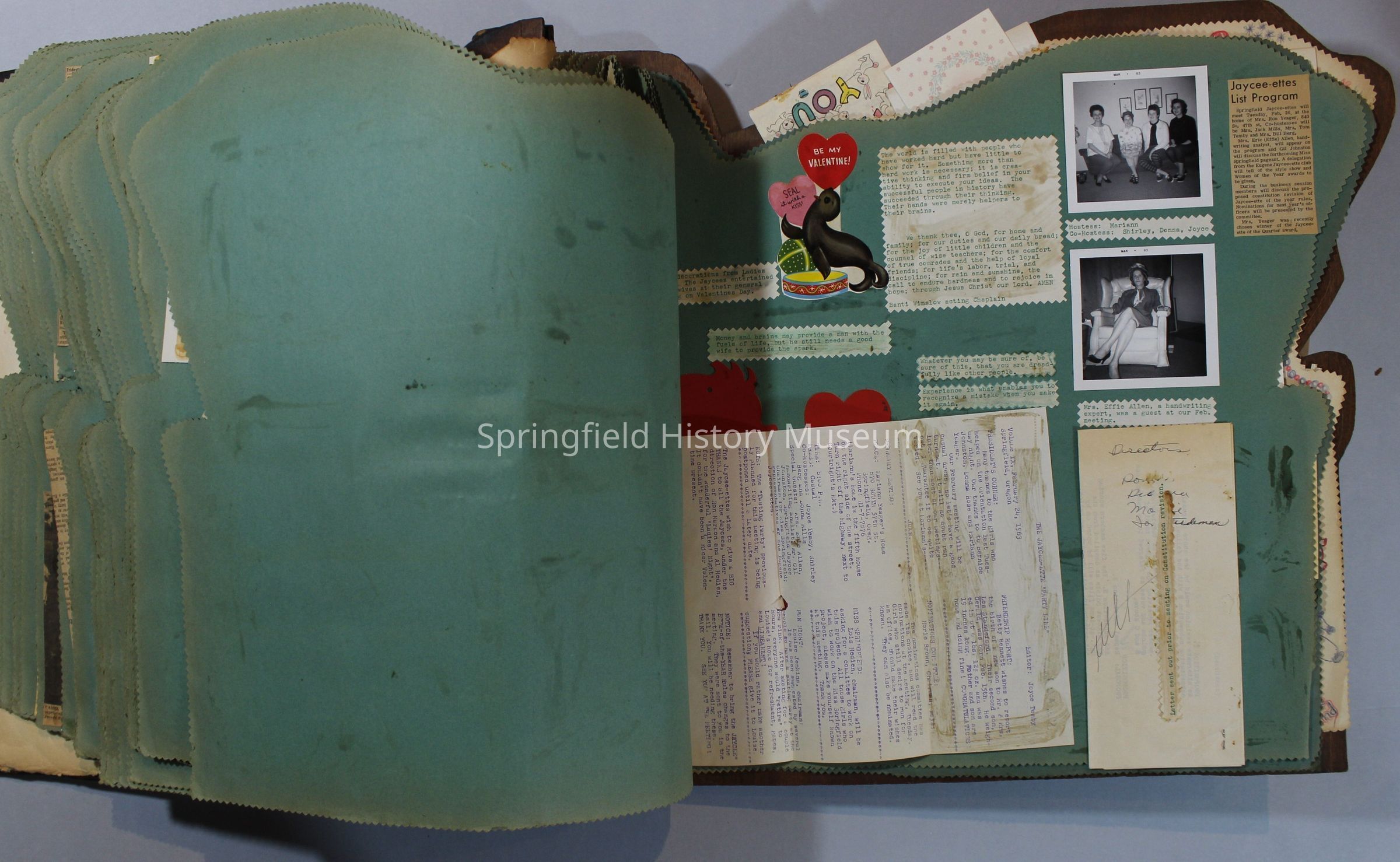 Scrapbook of Springfield, Oregon Jaycee-ettes, Joan Harman Possion, was President at the time of events.1962-1963, scrapbook cover is of wood with brass color hinges. The scrapbook contains newspaper articles, photo's, and cards.