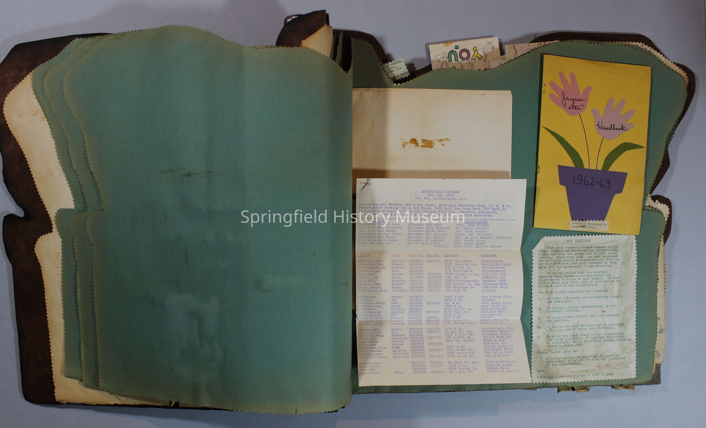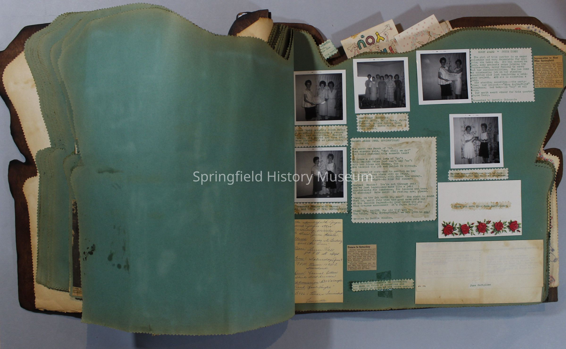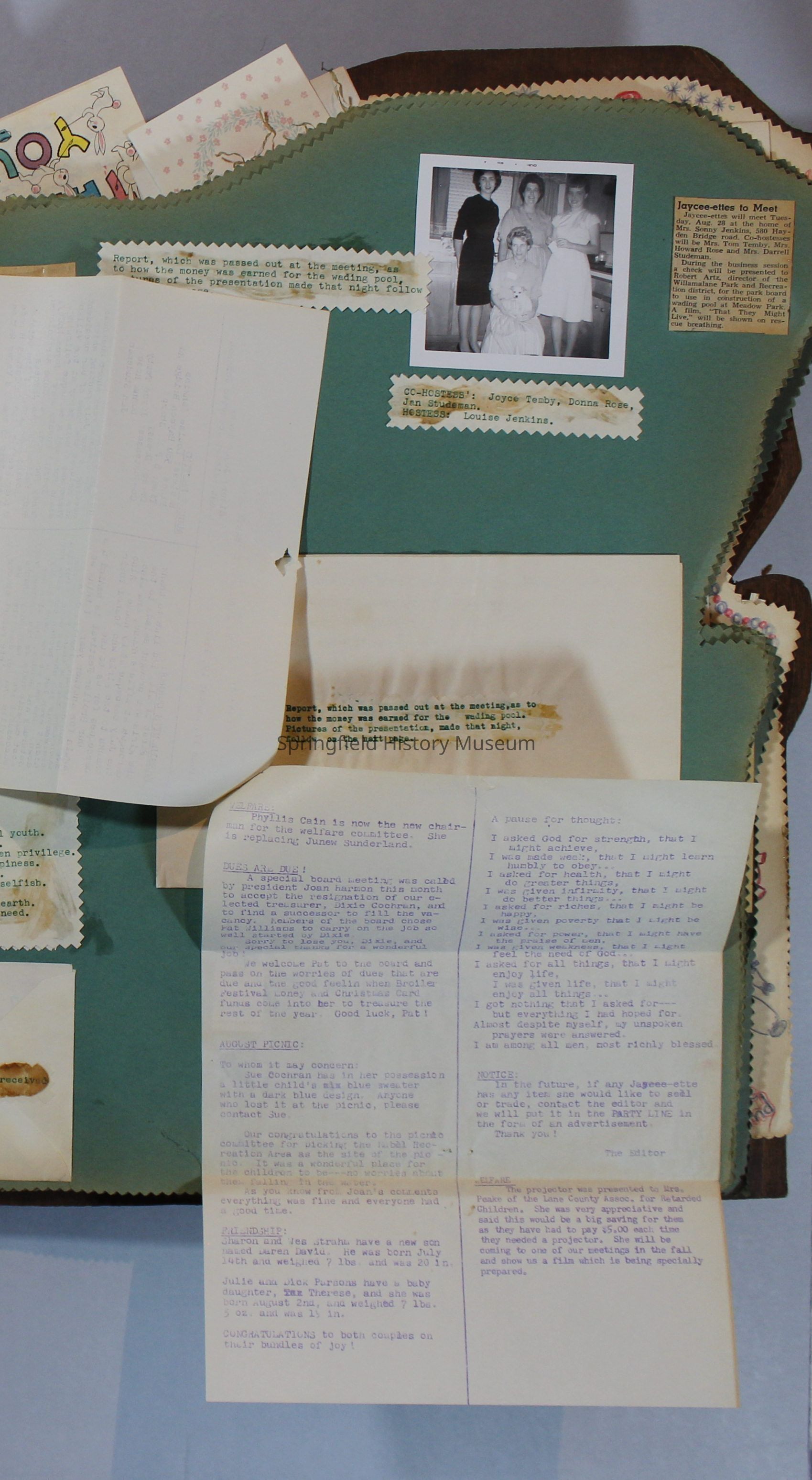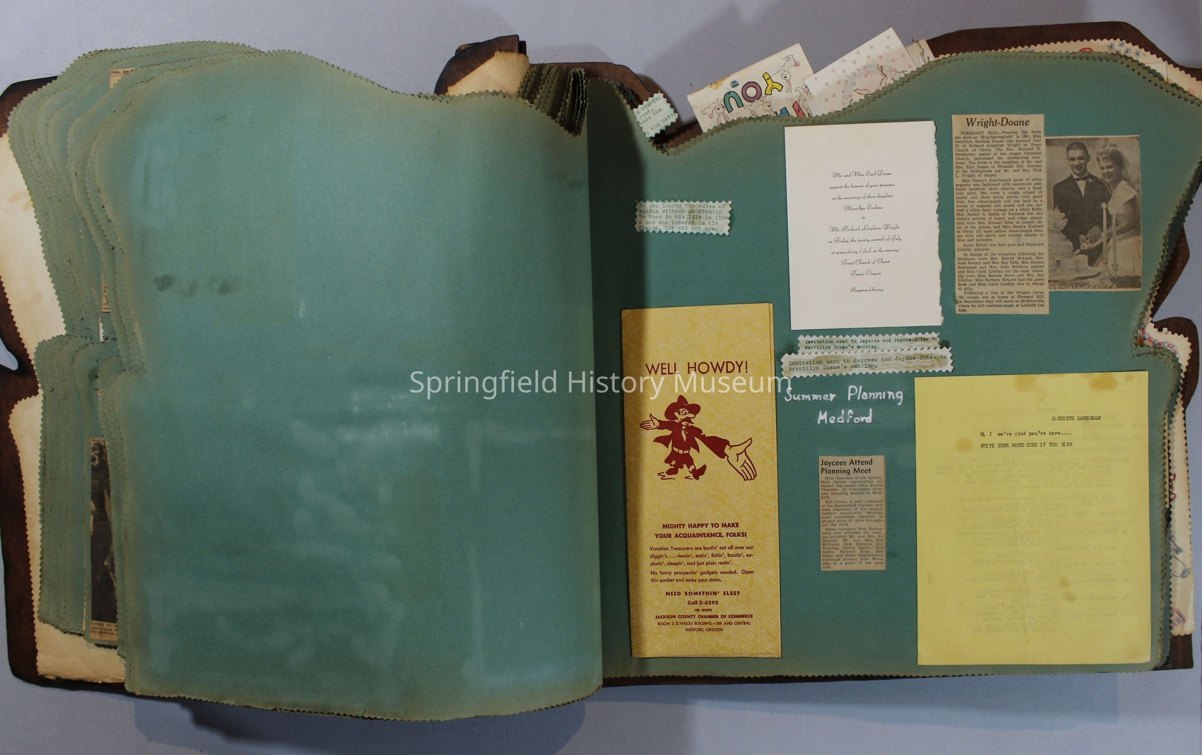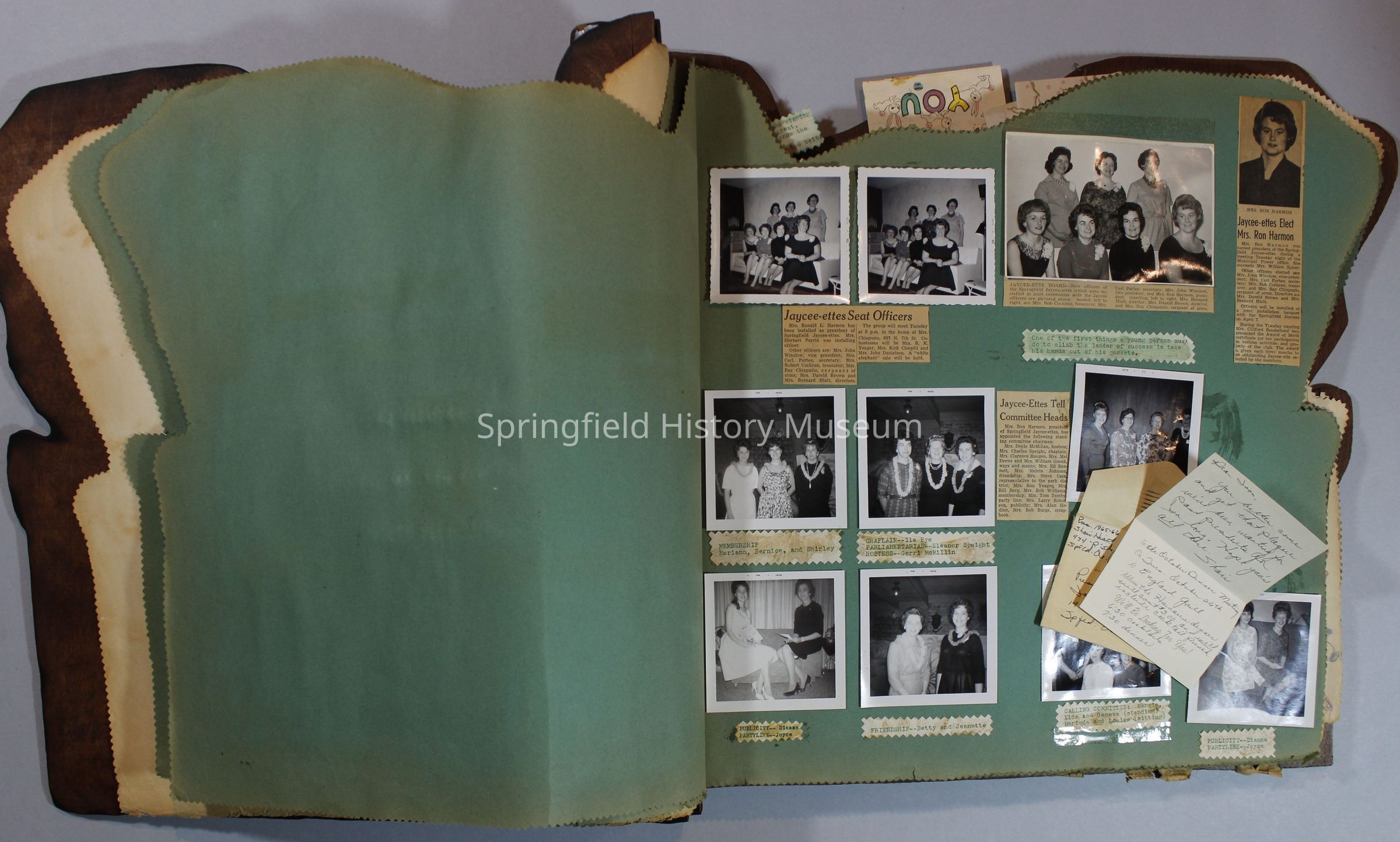 Scrapbook of Springfield, Oregon Jaycee-ettes, Joan Harman Possion, was President at the time of events.1962-1963, scrapbook cover is of wood with brass color hinges. The scrapbook contains newspaper articles, photo's, and cards.