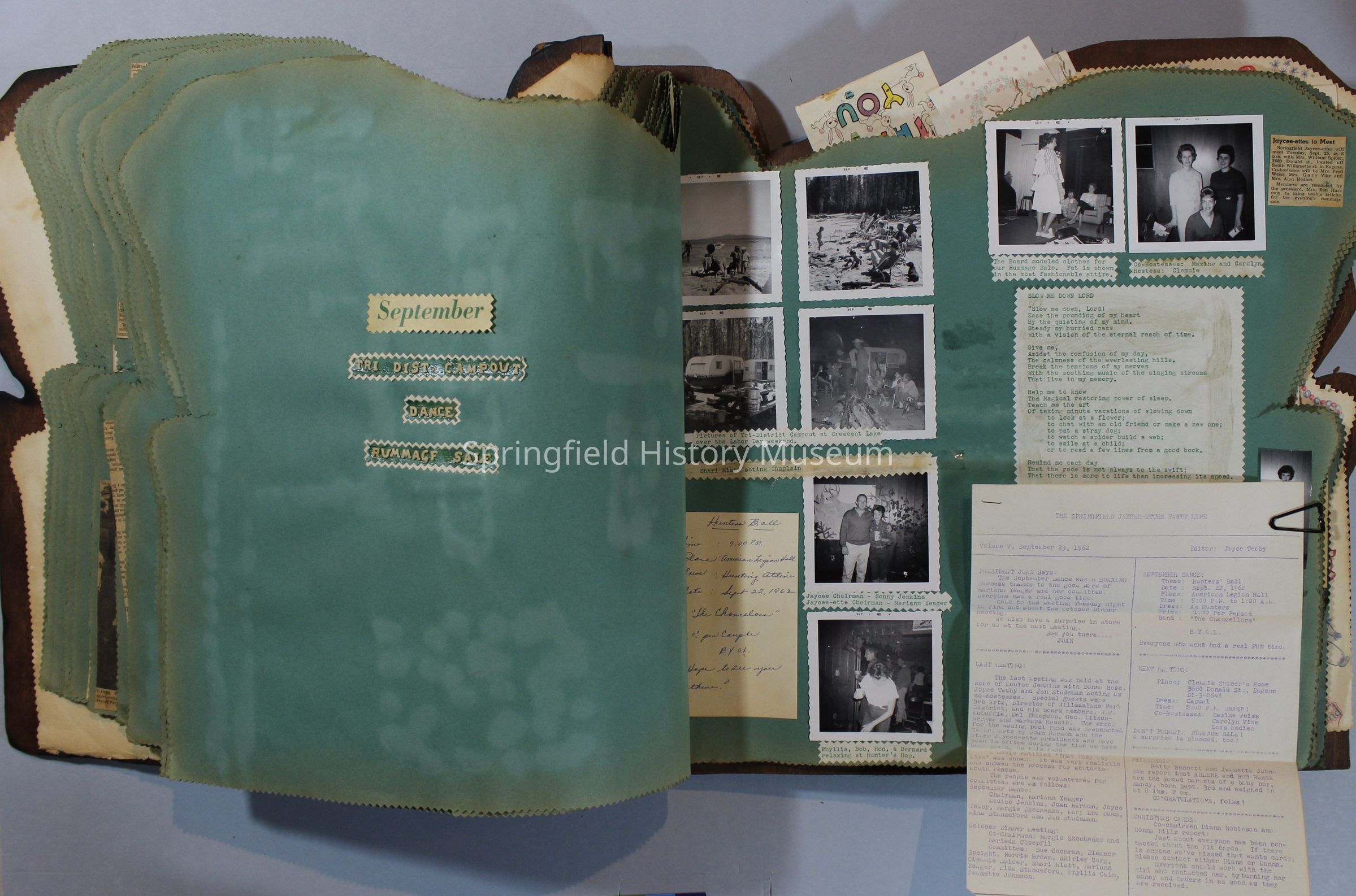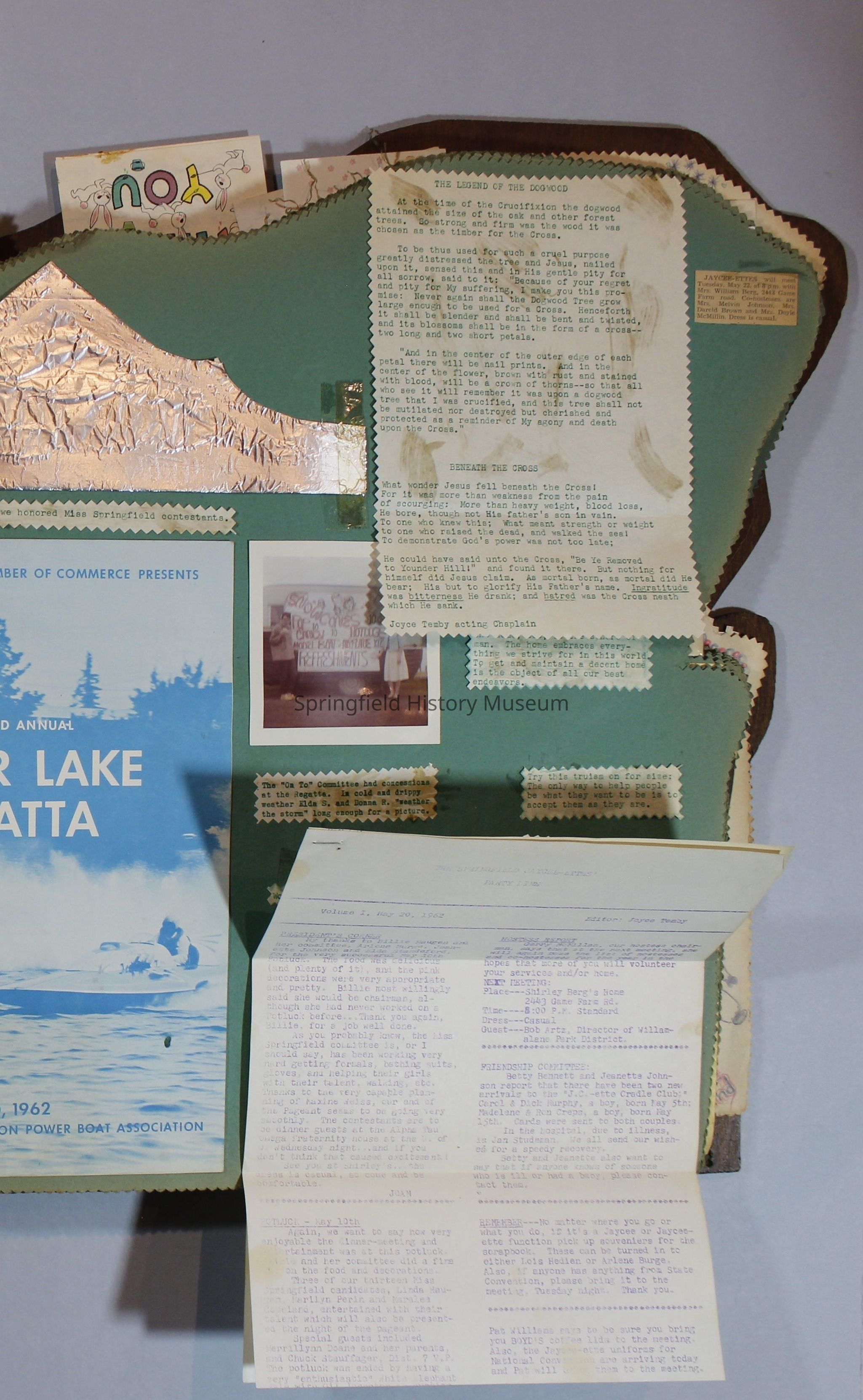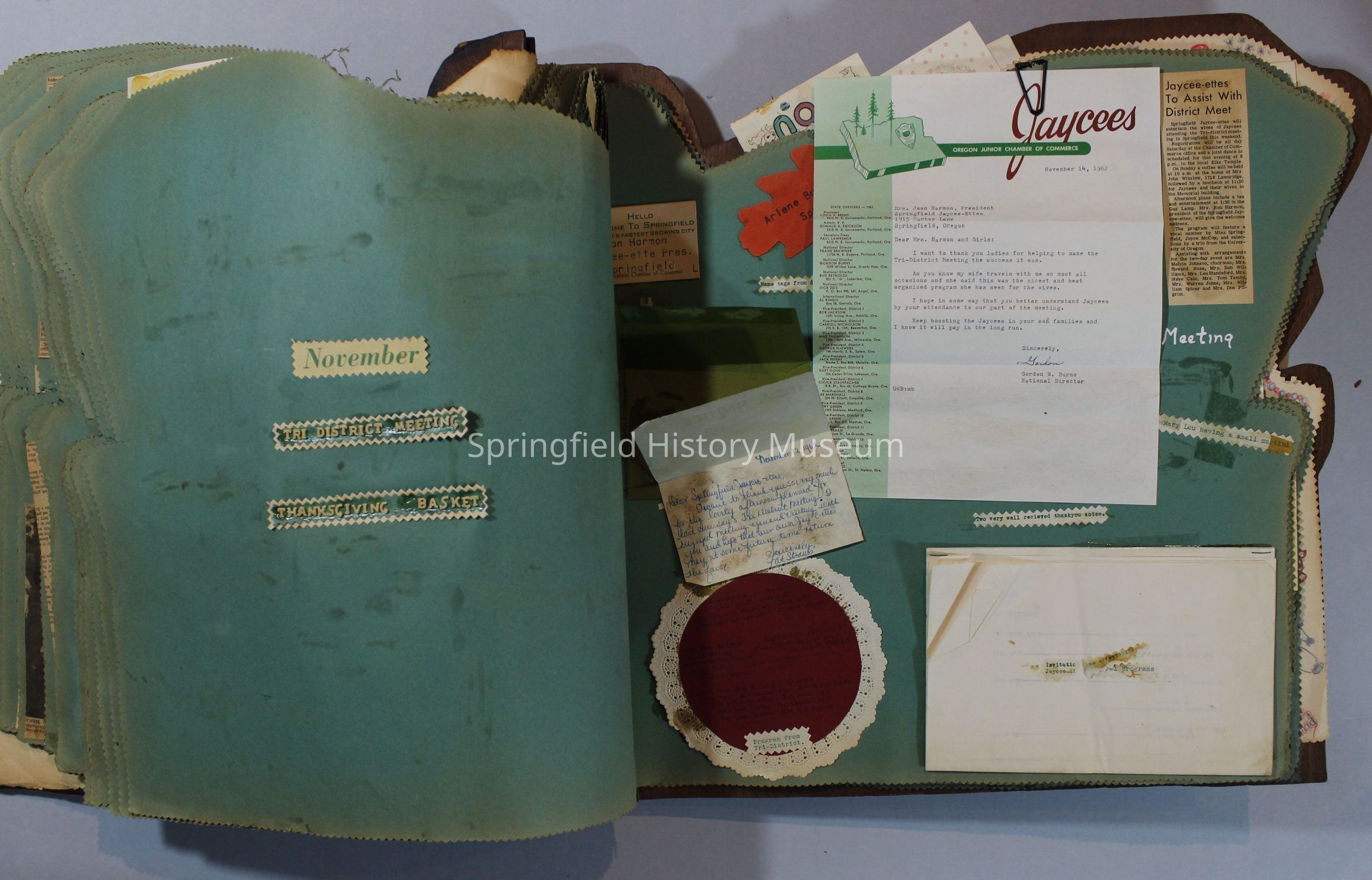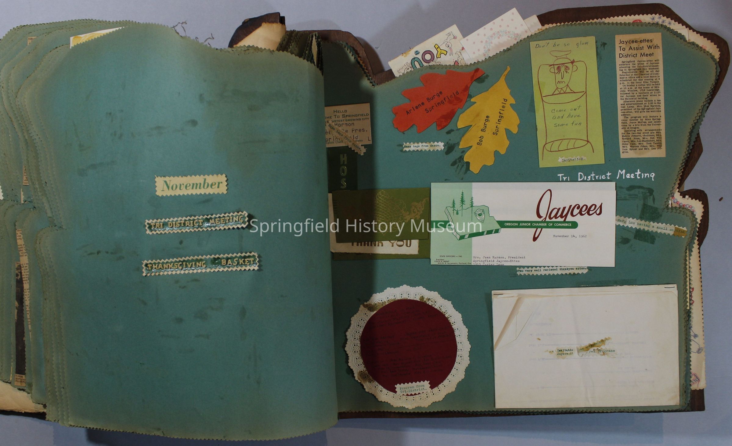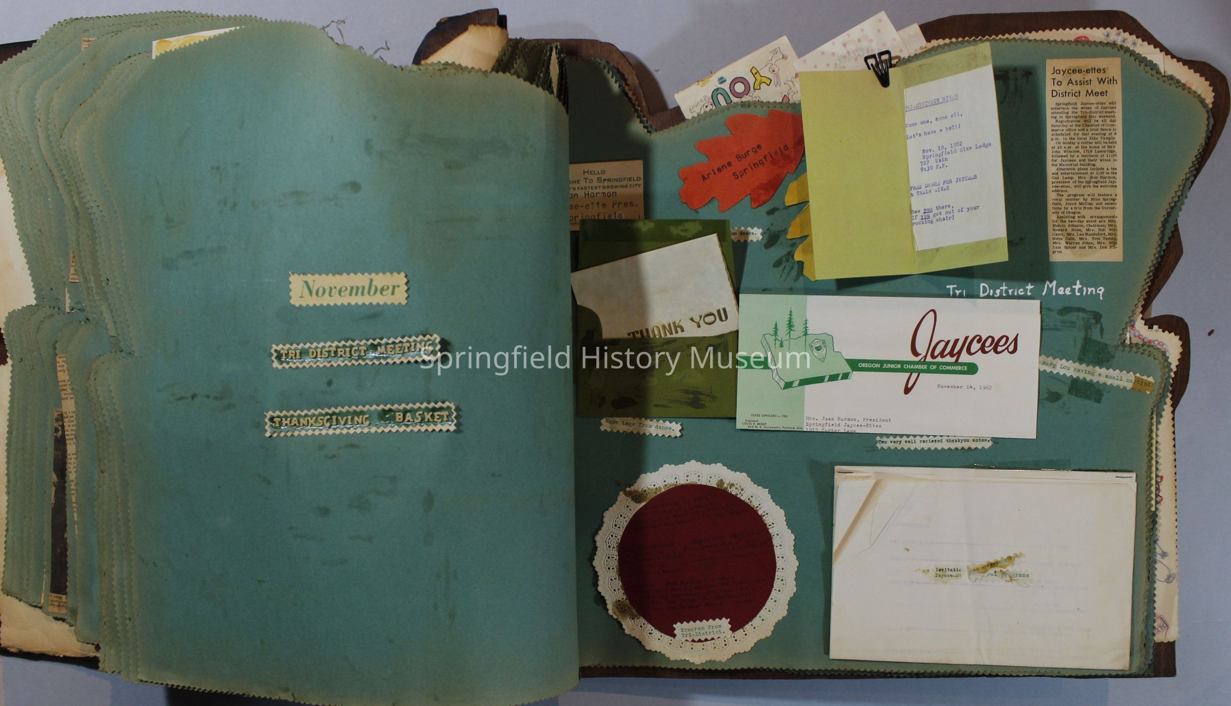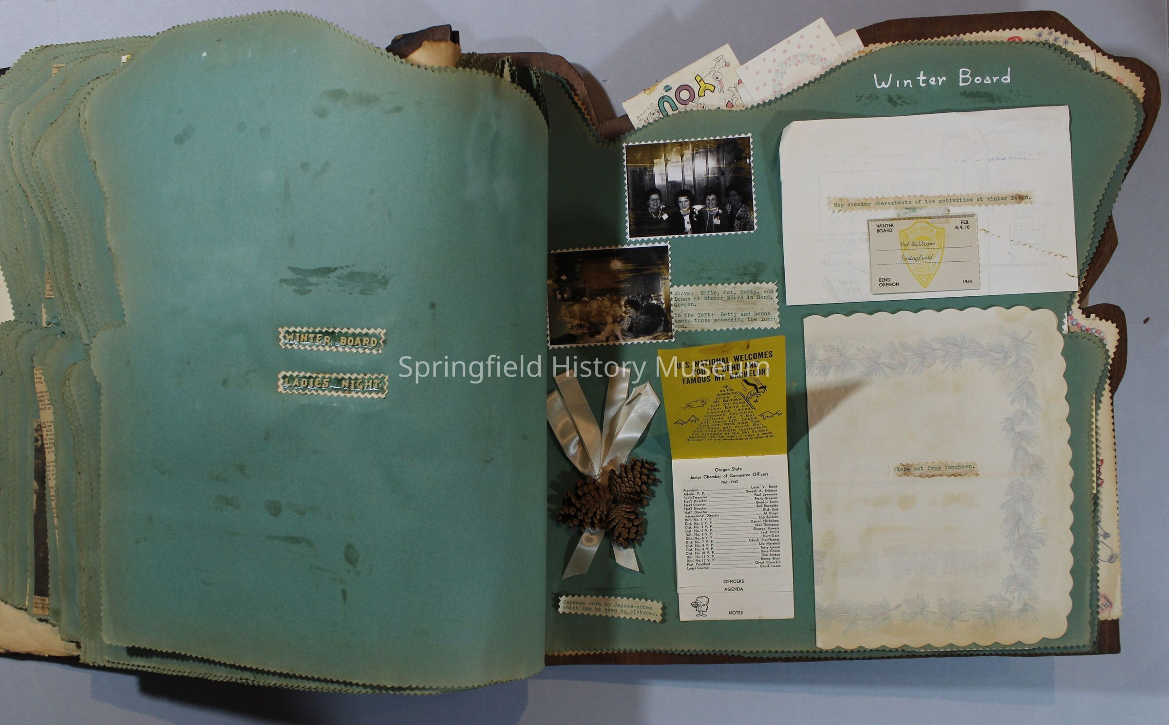 Scrapbook of Springfield, Oregon Jaycee-ettes, Joan Harman Possion, was President at the time of events.1962-1963, scrapbook cover is of wood with brass color hinges. The scrapbook contains newspaper articles, photo's, and cards.