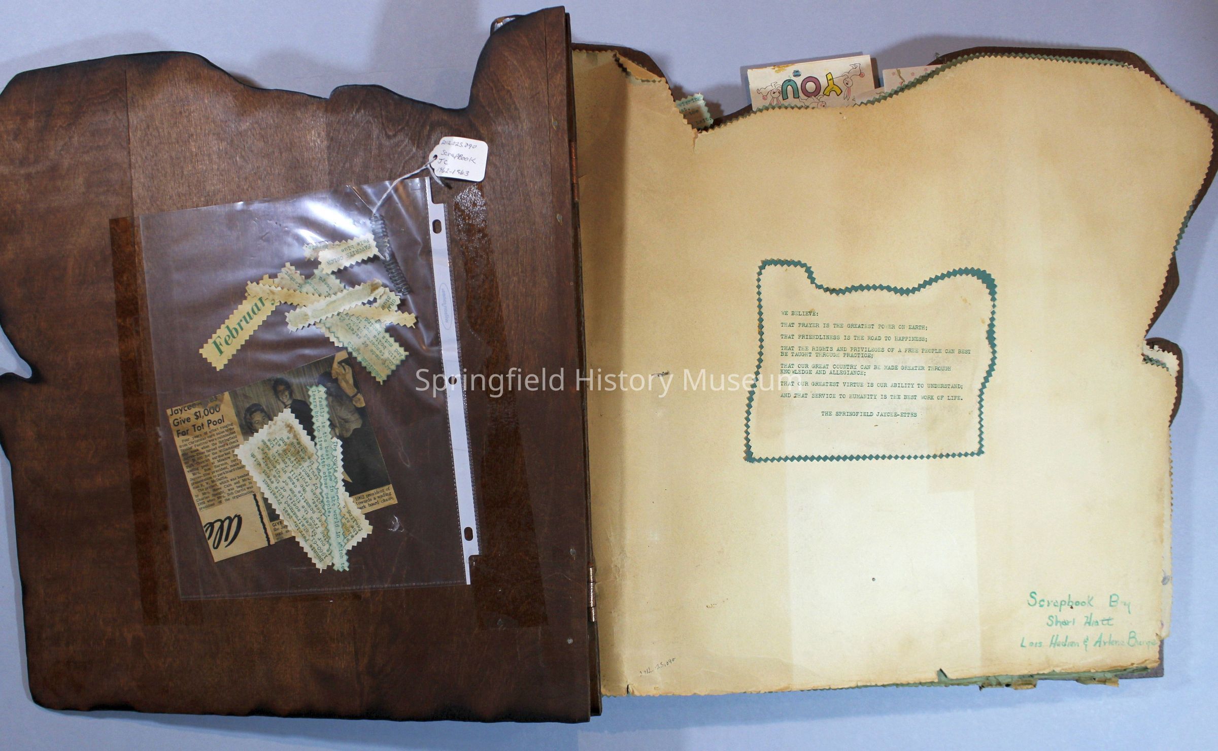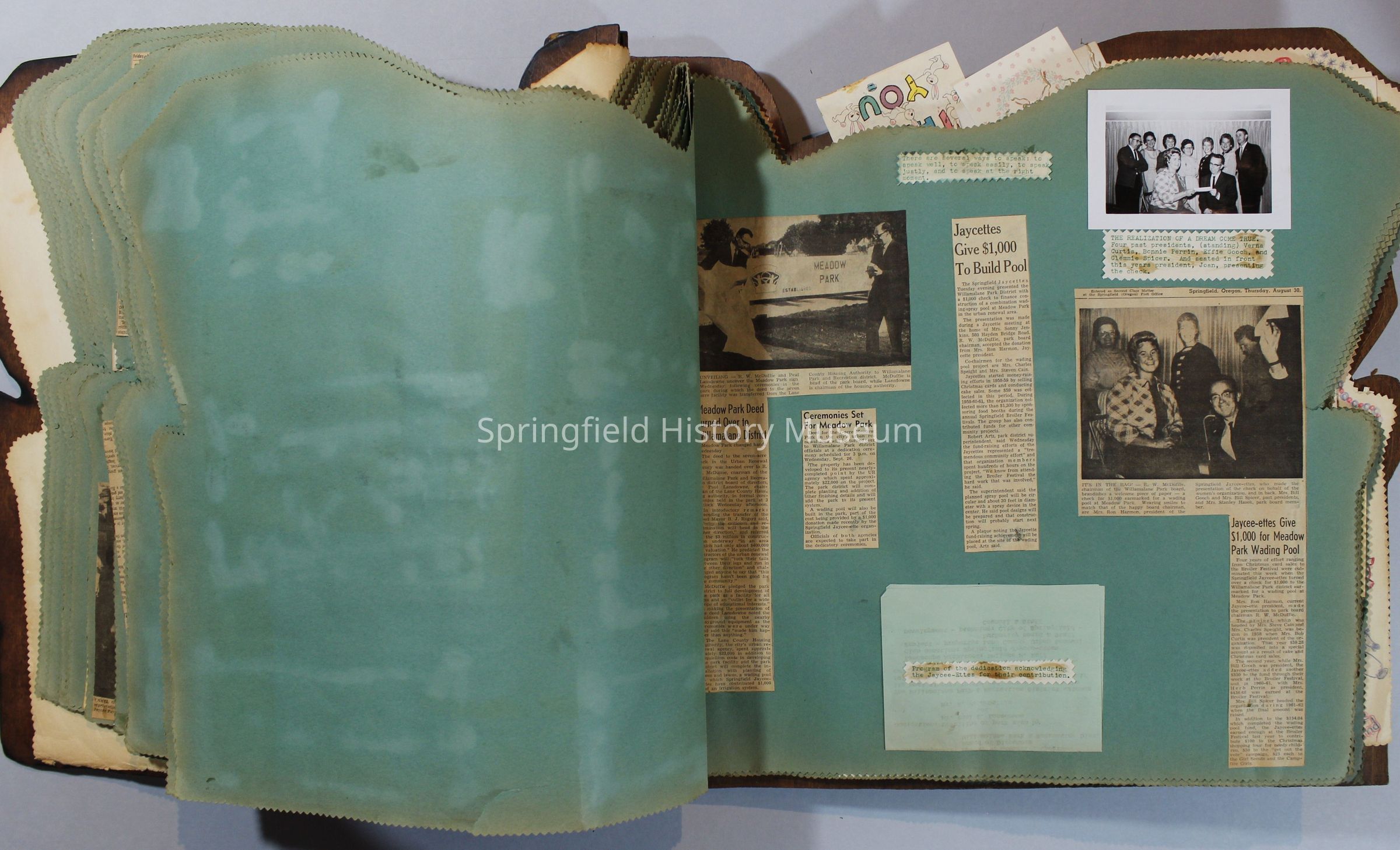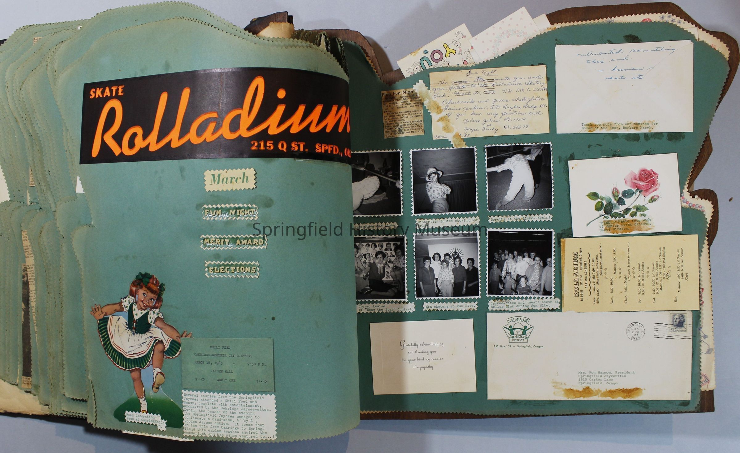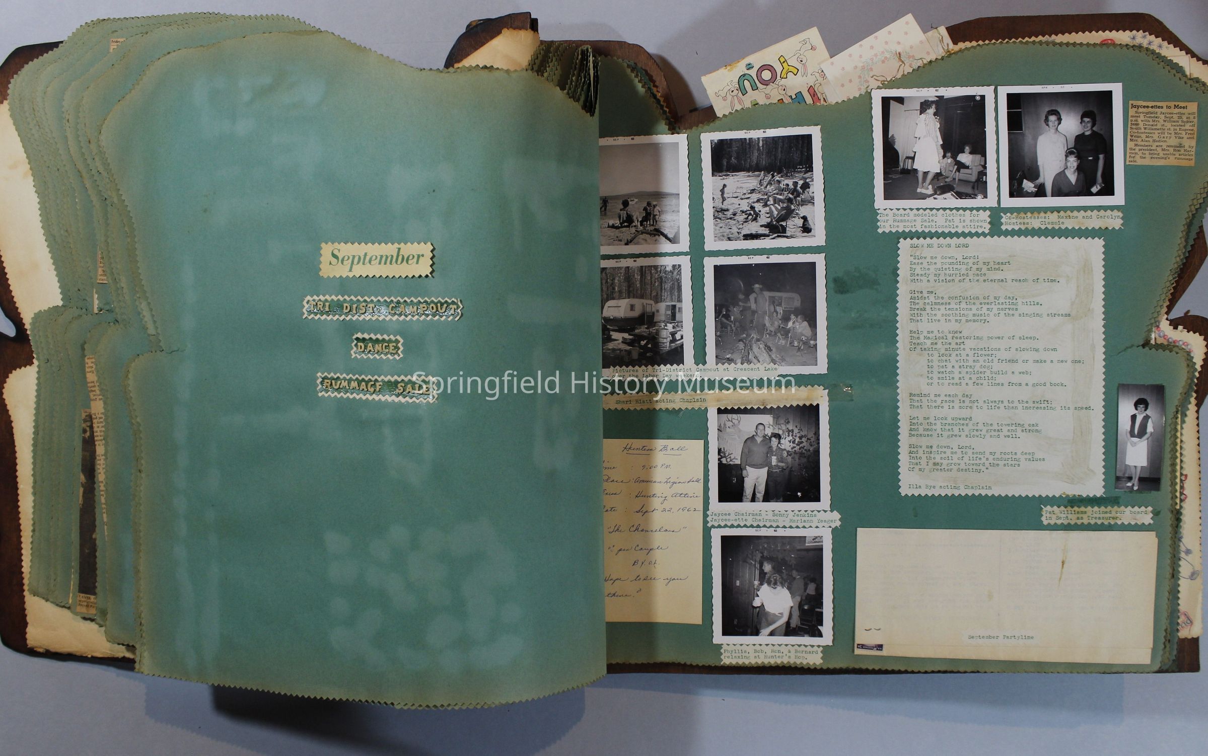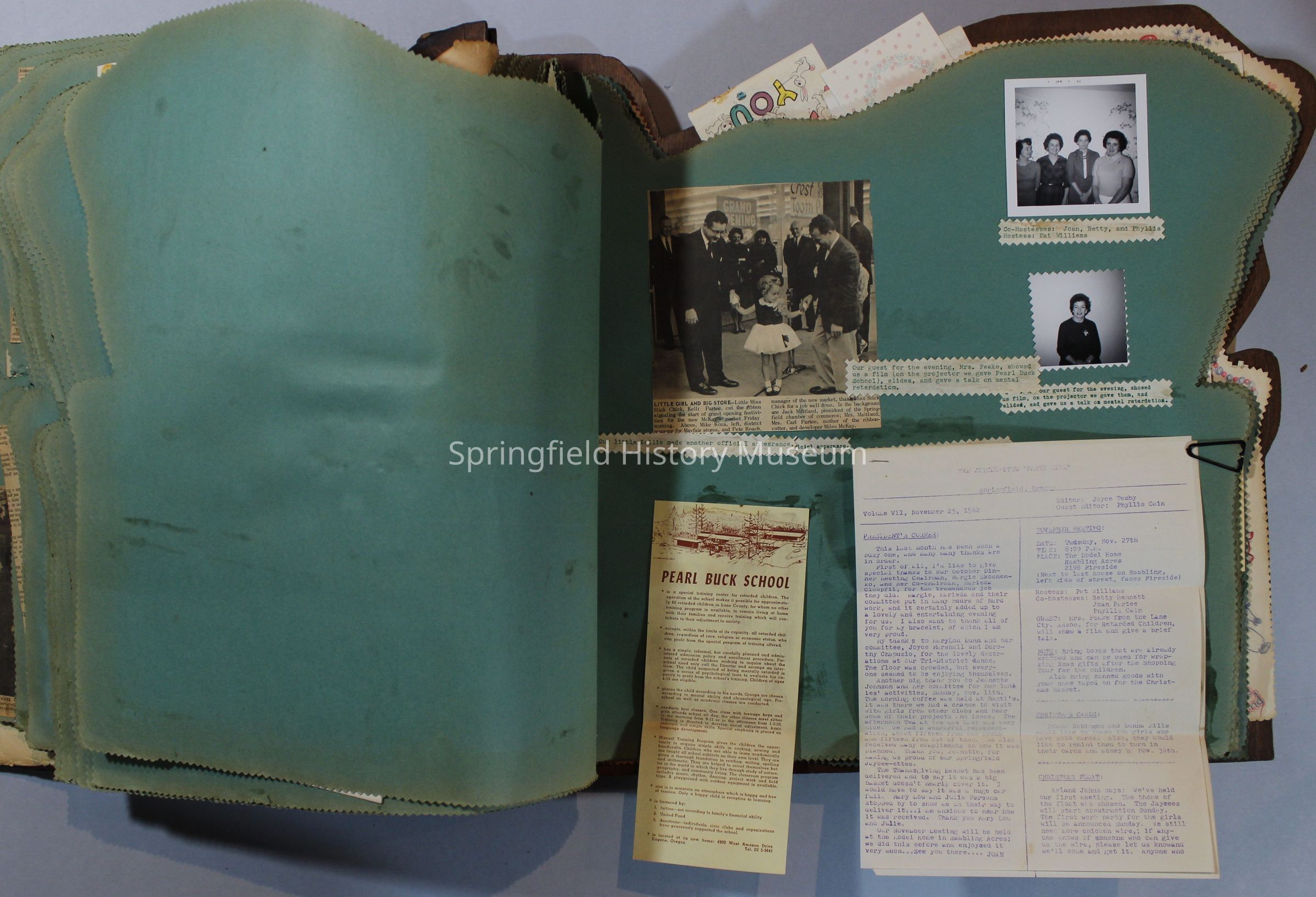Scrapbook of Springfield, Oregon Jaycee-ettes, Joan Harman Possion, was President at the time of events.1962-1963, scrapbook cover is of wood with brass color hinges. The scrapbook contains newspaper articles, photo's, and cards.
