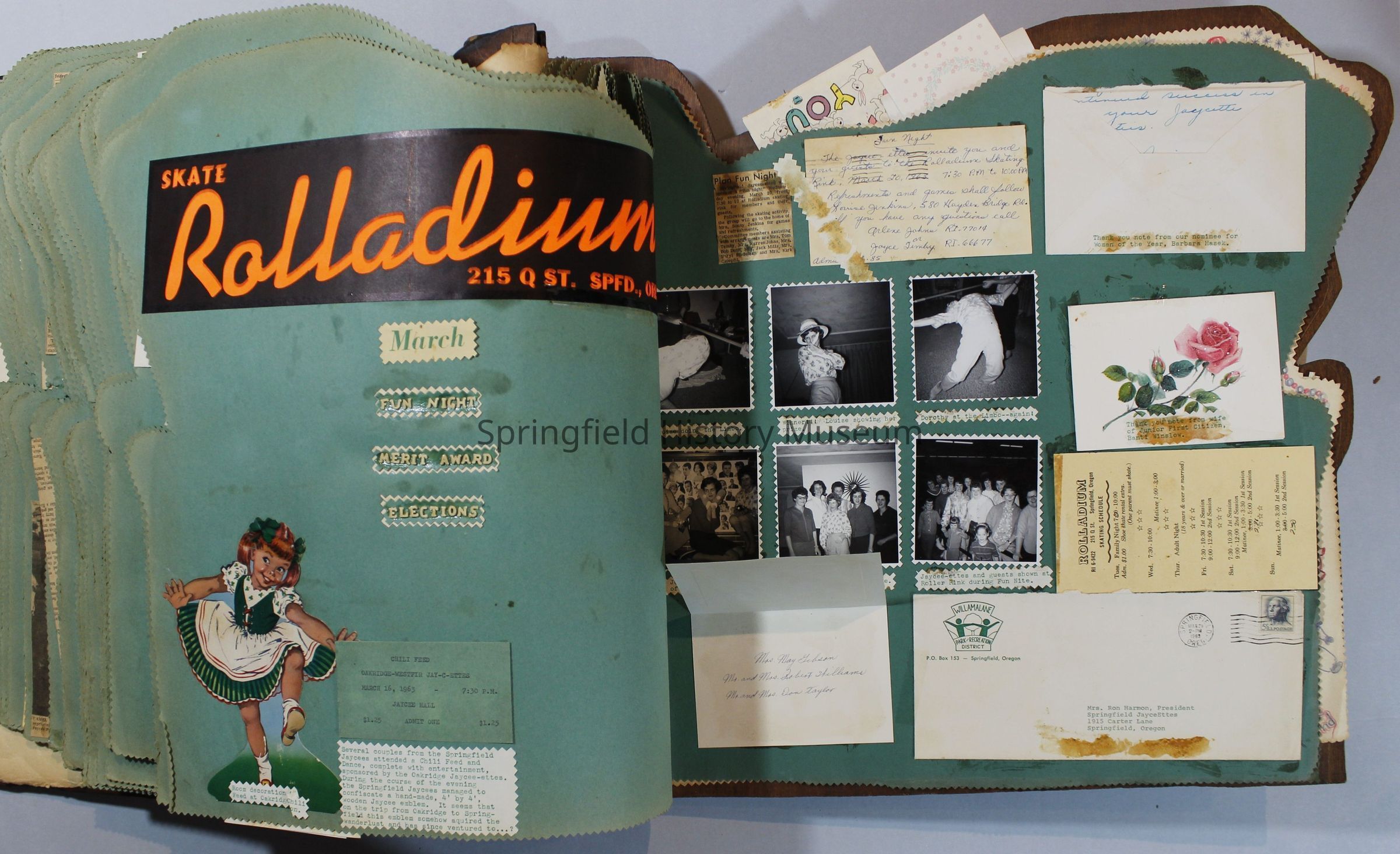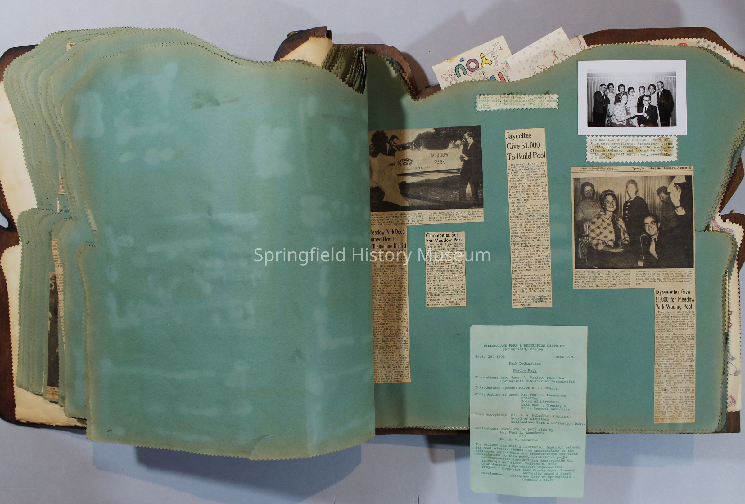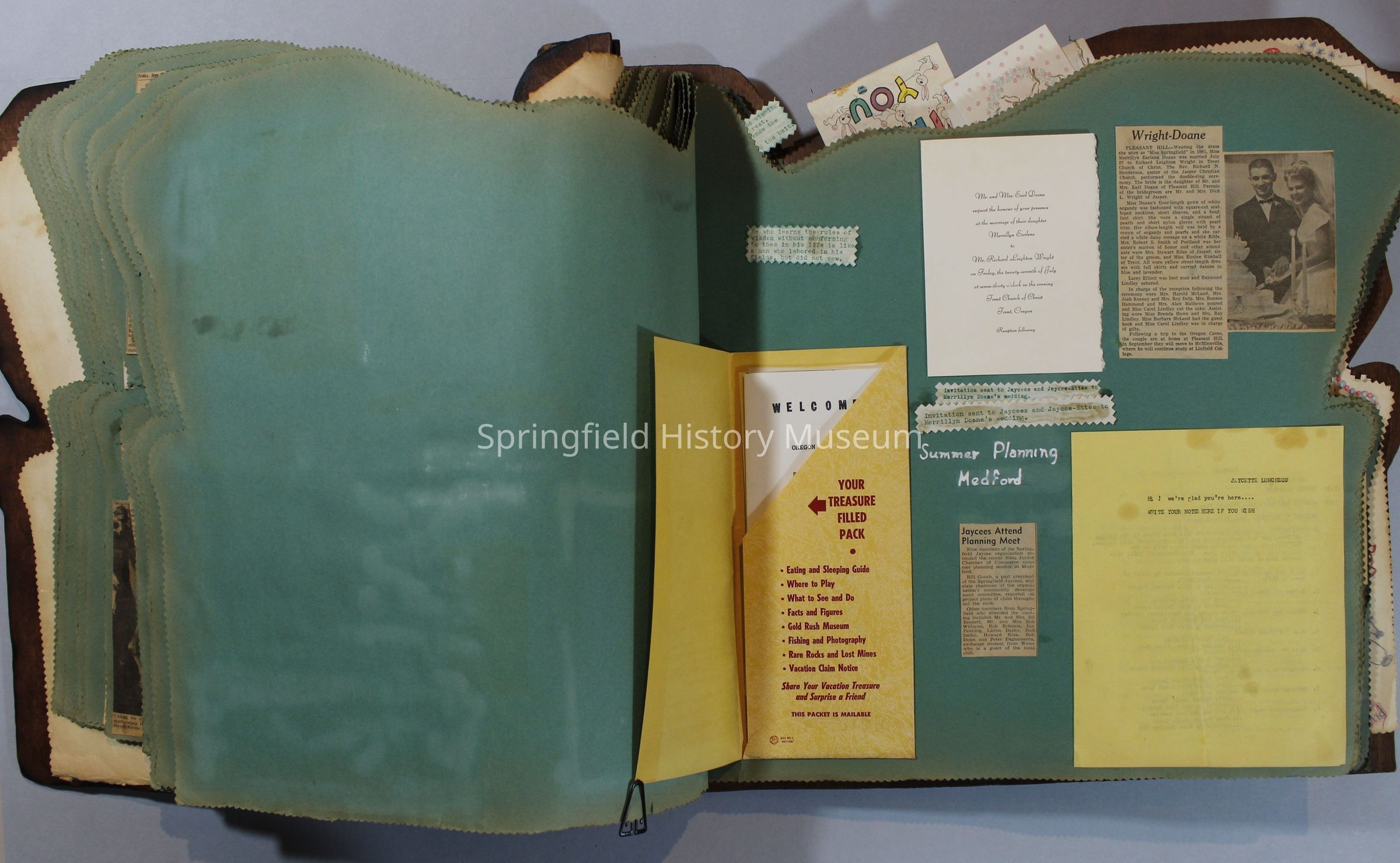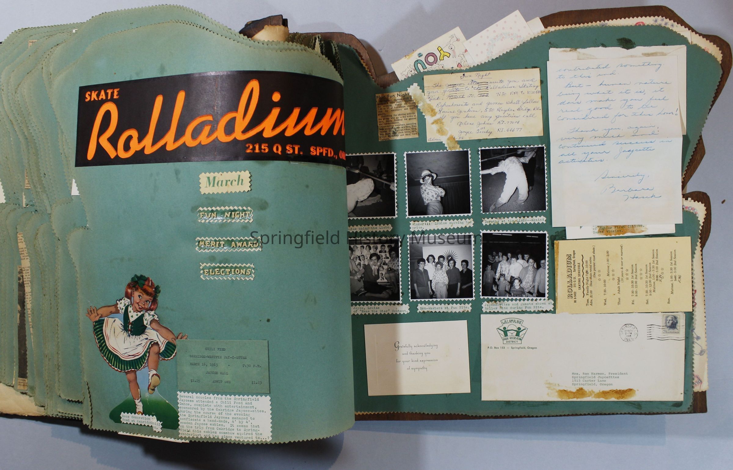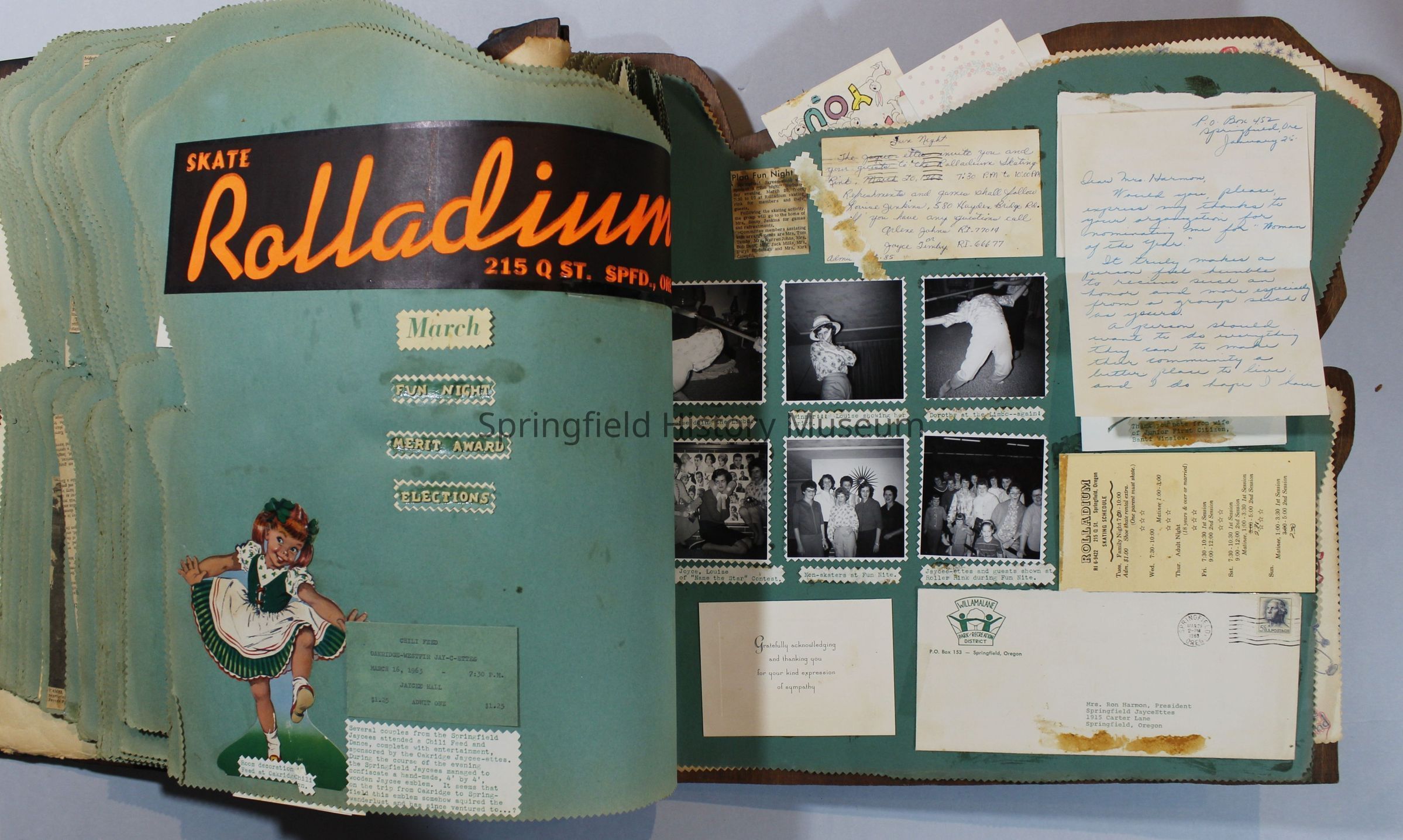 Scrapbook of Springfield, Oregon Jaycee-ettes, Joan Harman Possion, was President at the time of events.1962-1963, scrapbook cover is of wood with brass color hinges. The scrapbook contains newspaper articles, photo's, and cards.