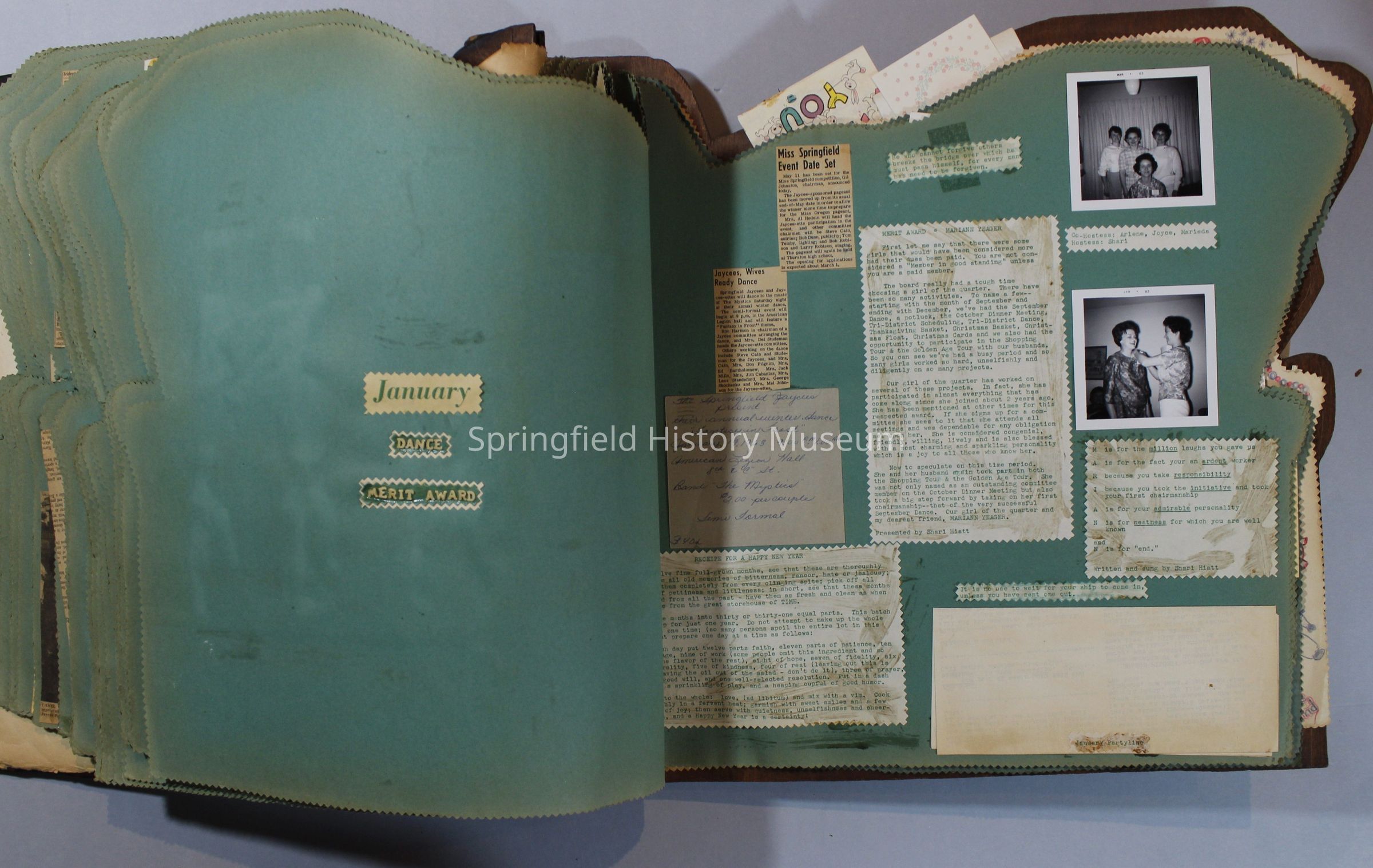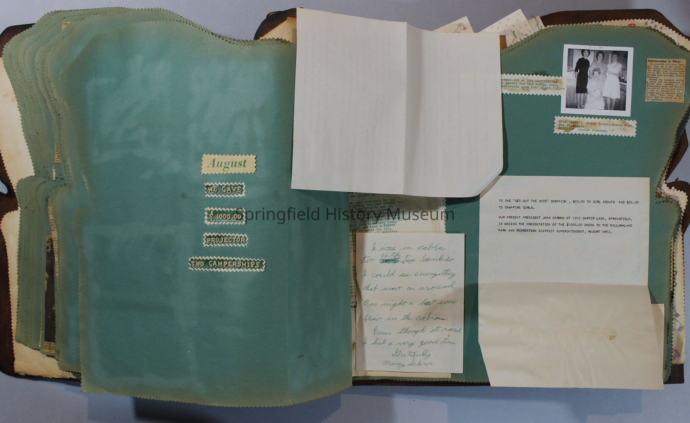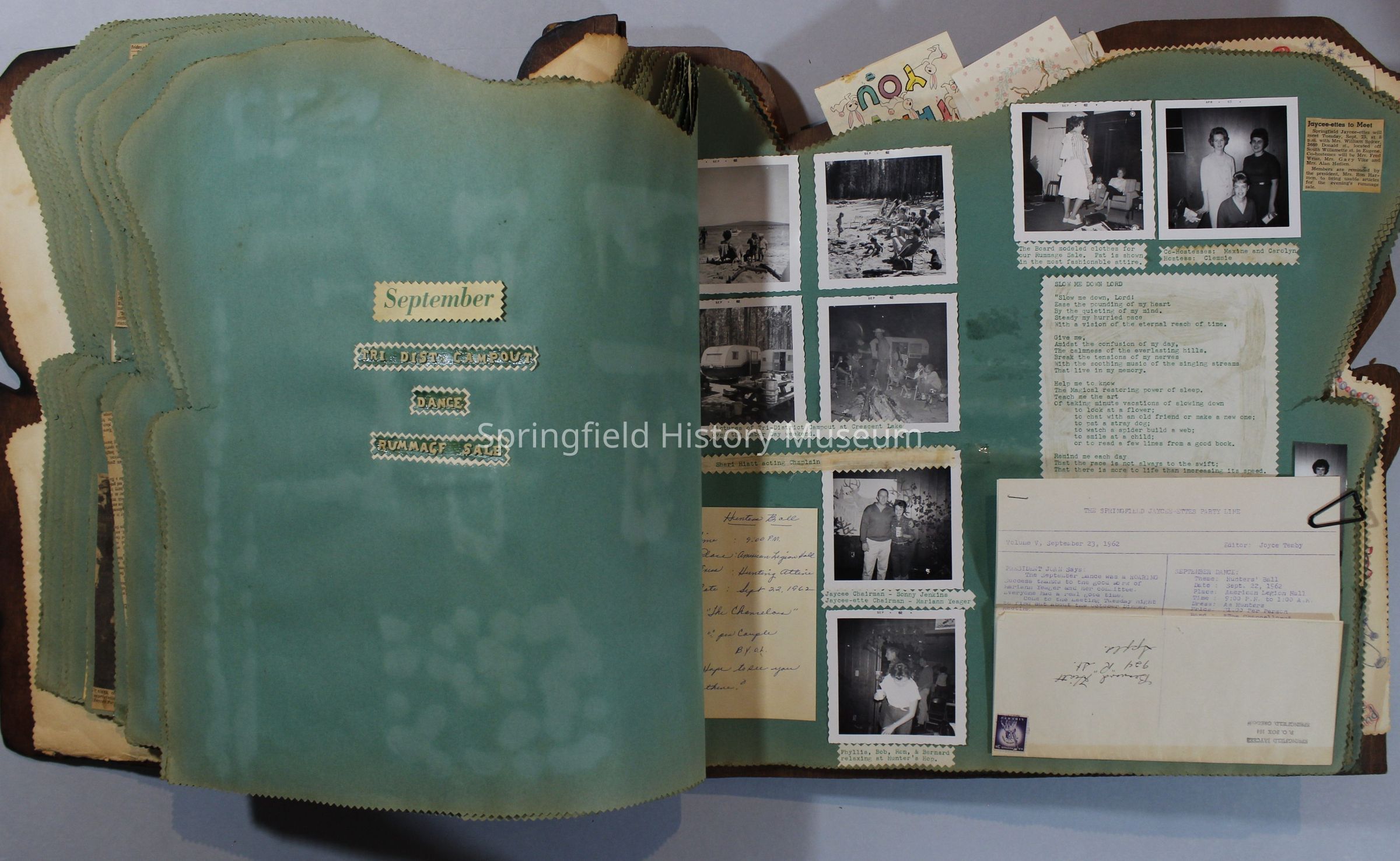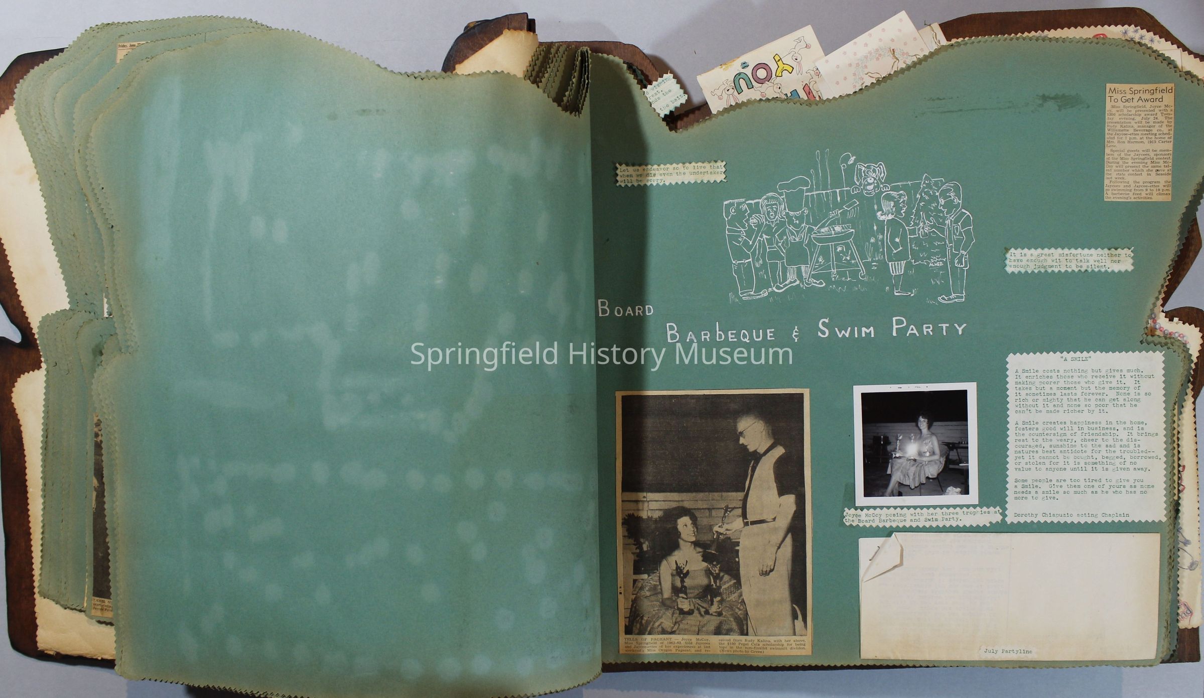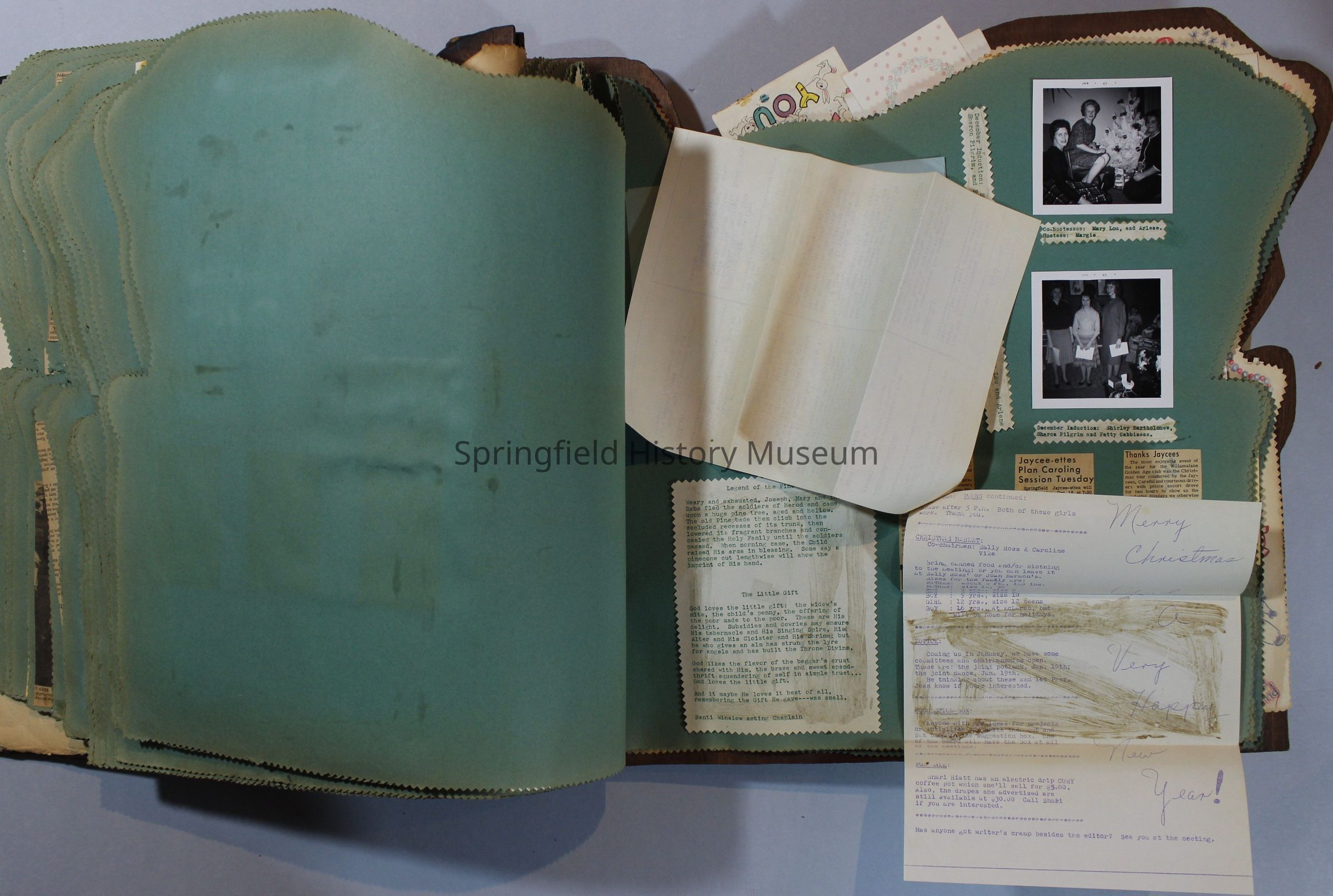 Scrapbook of Springfield, Oregon Jaycee-ettes, Joan Harman Possion, was President at the time of events.1962-1963, scrapbook cover is of wood with brass color hinges. The scrapbook contains newspaper articles, photo's, and cards.