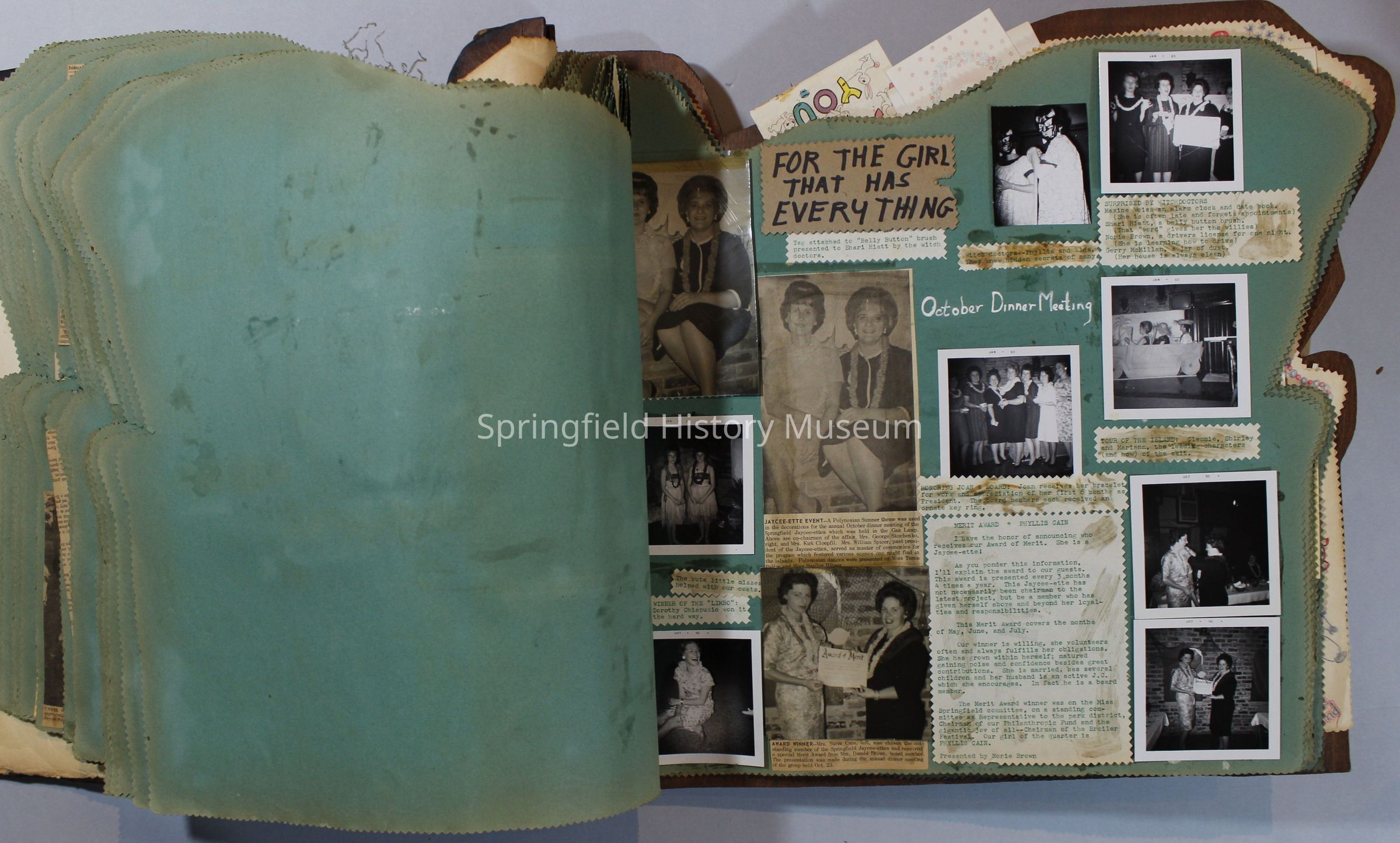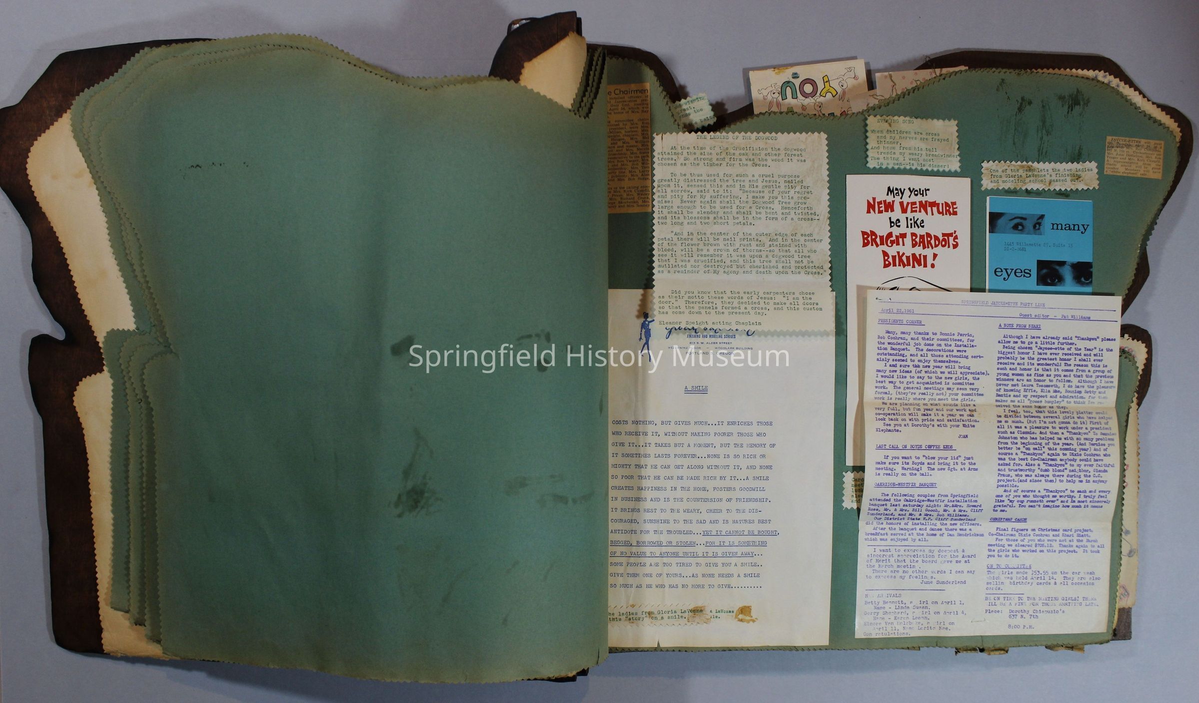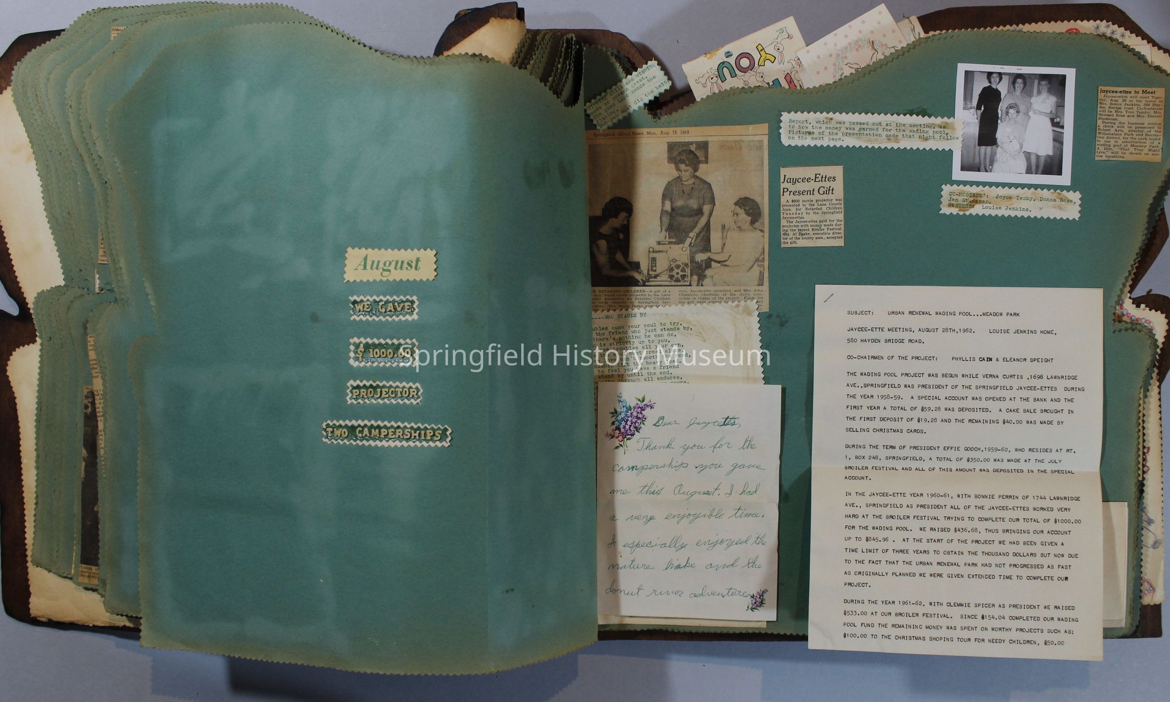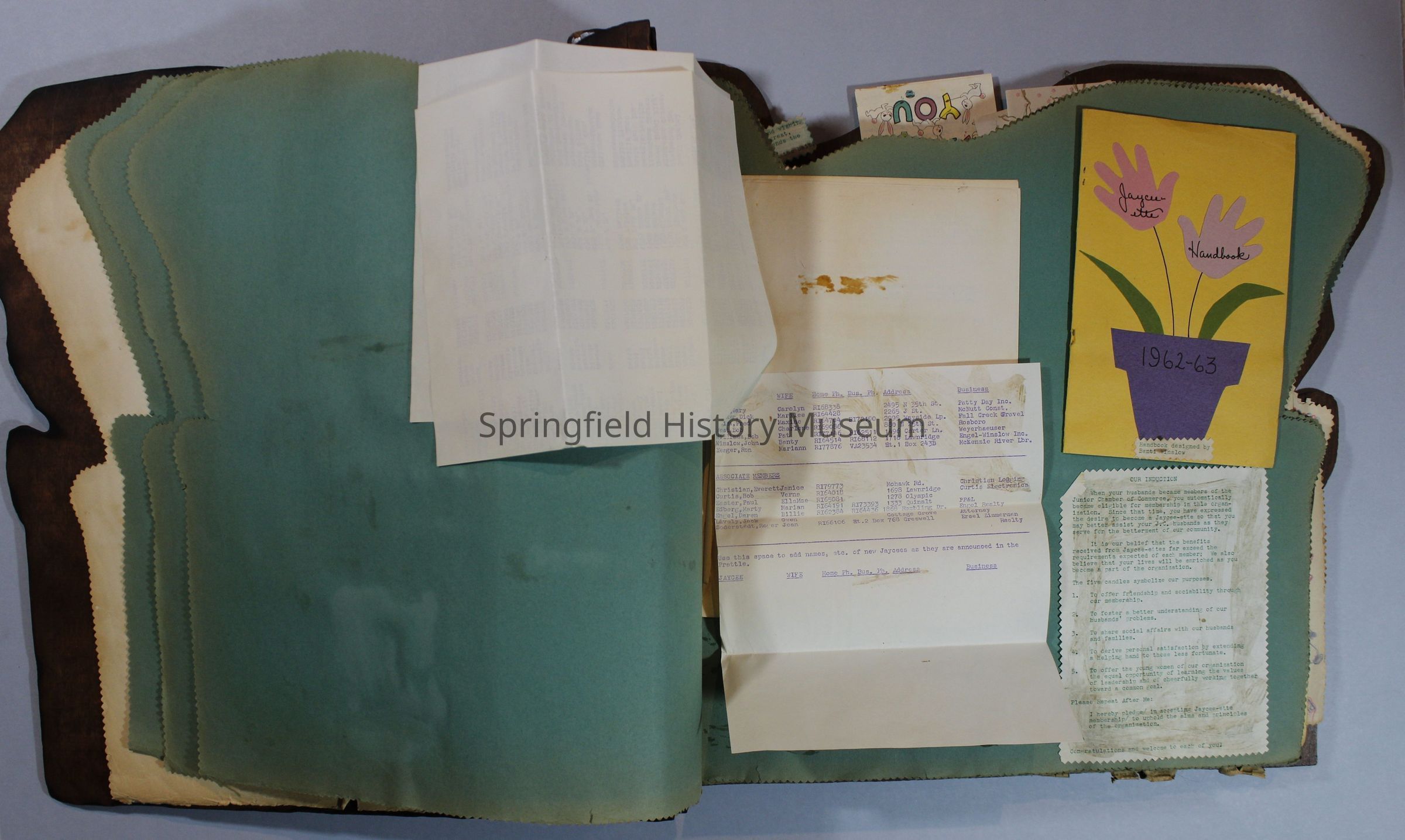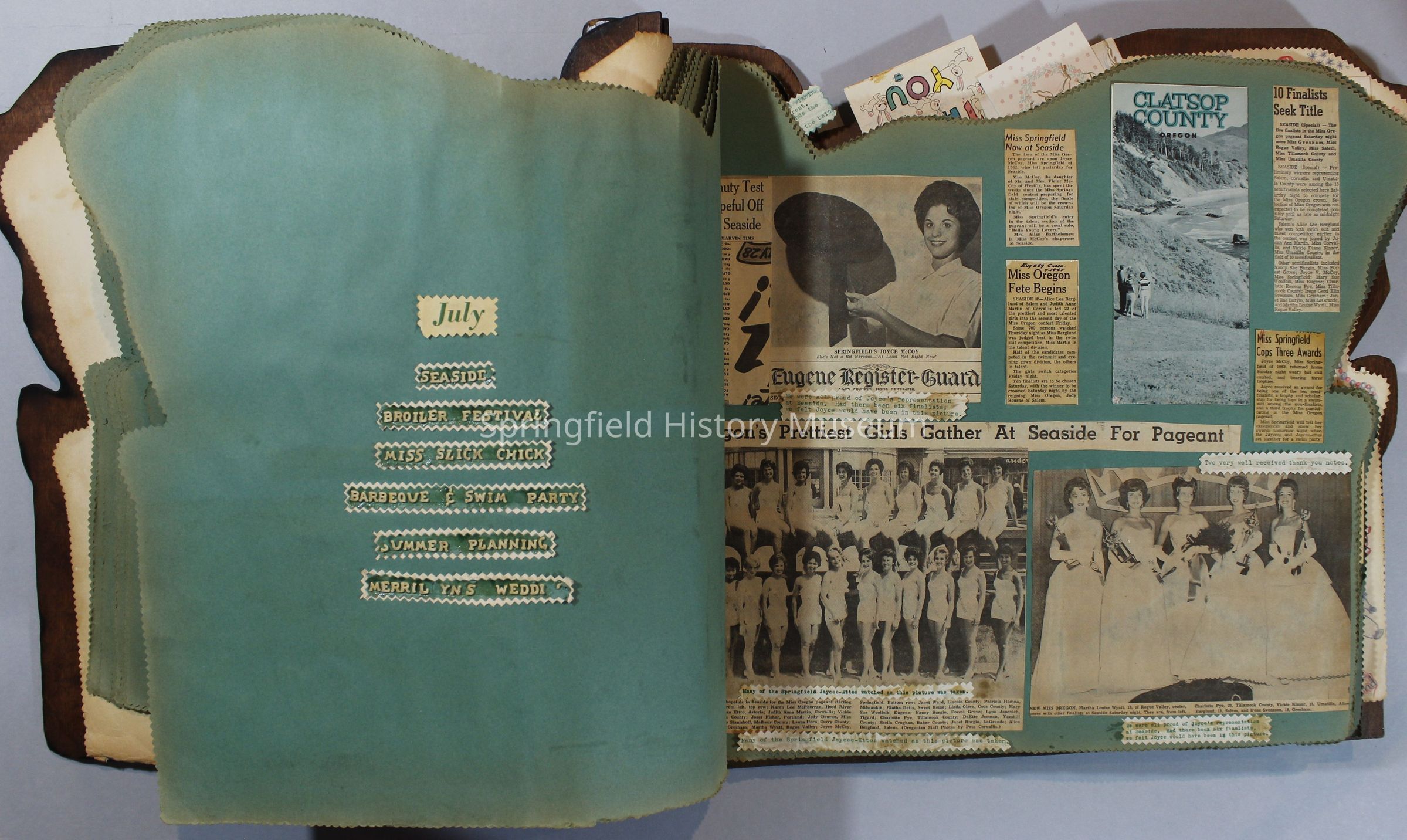 Scrapbook of Springfield, Oregon Jaycee-ettes, Joan Harman Possion, was President at the time of events.1962-1963, scrapbook cover is of wood with brass color hinges. The scrapbook contains newspaper articles, photo's, and cards.